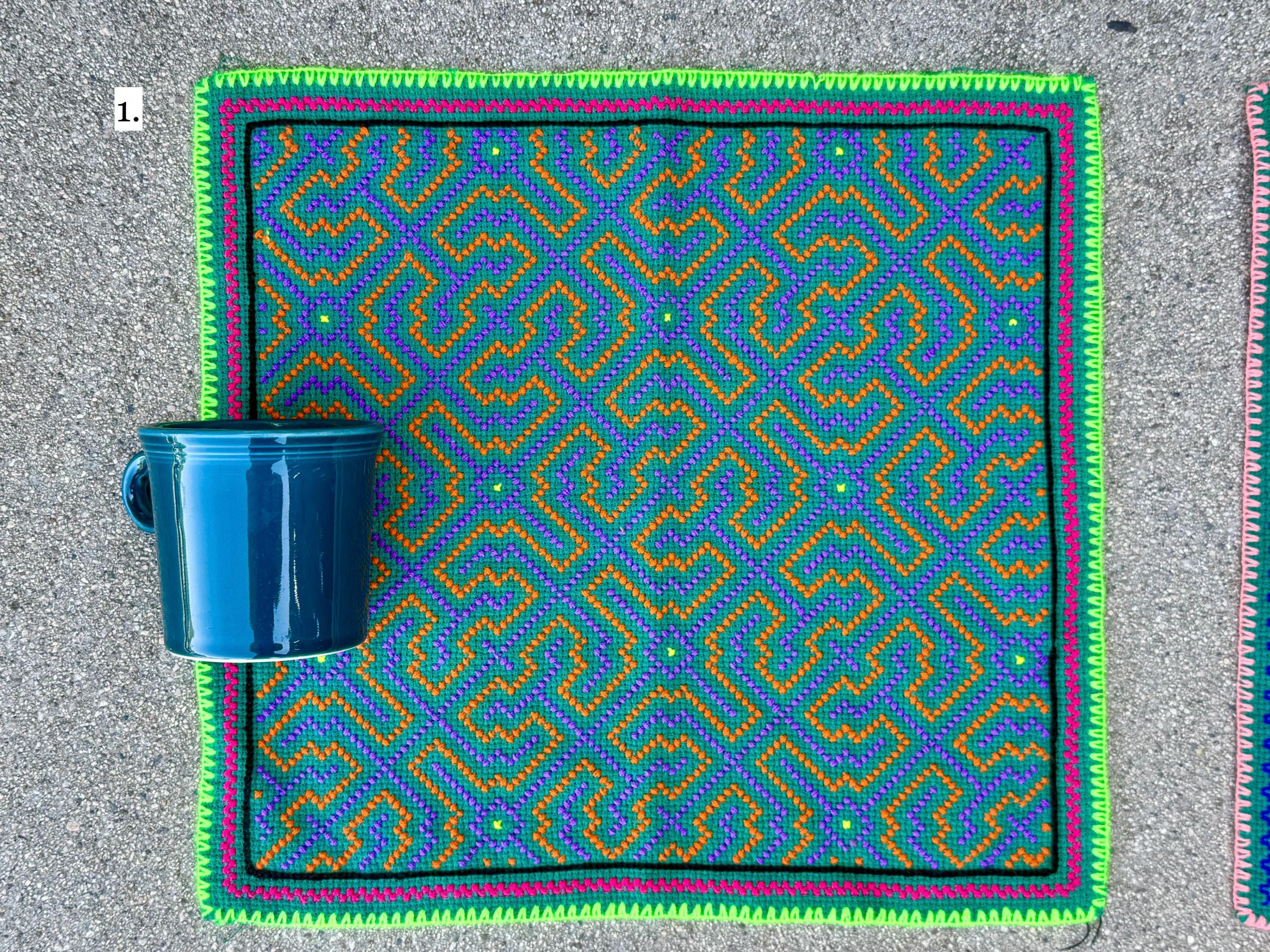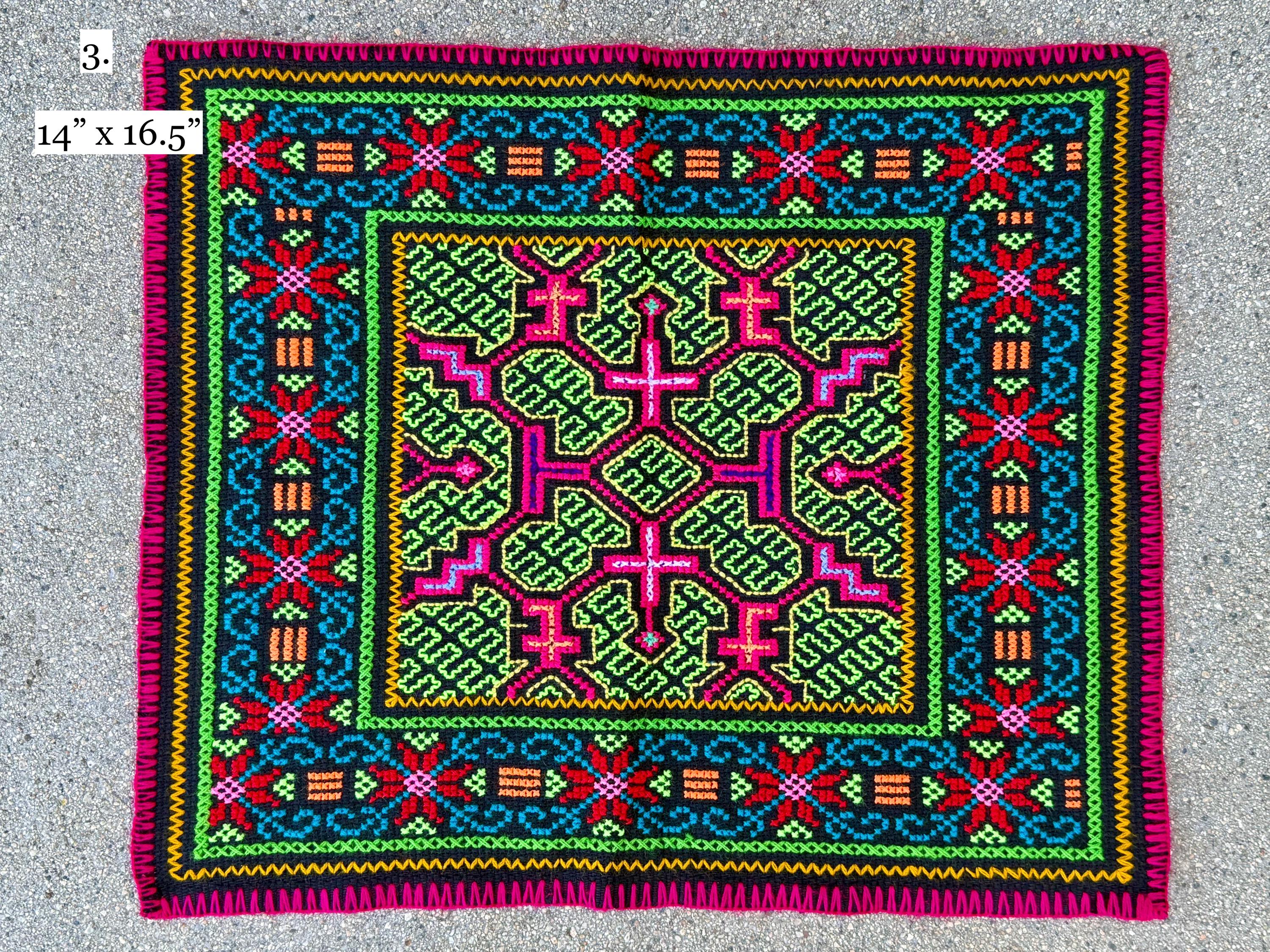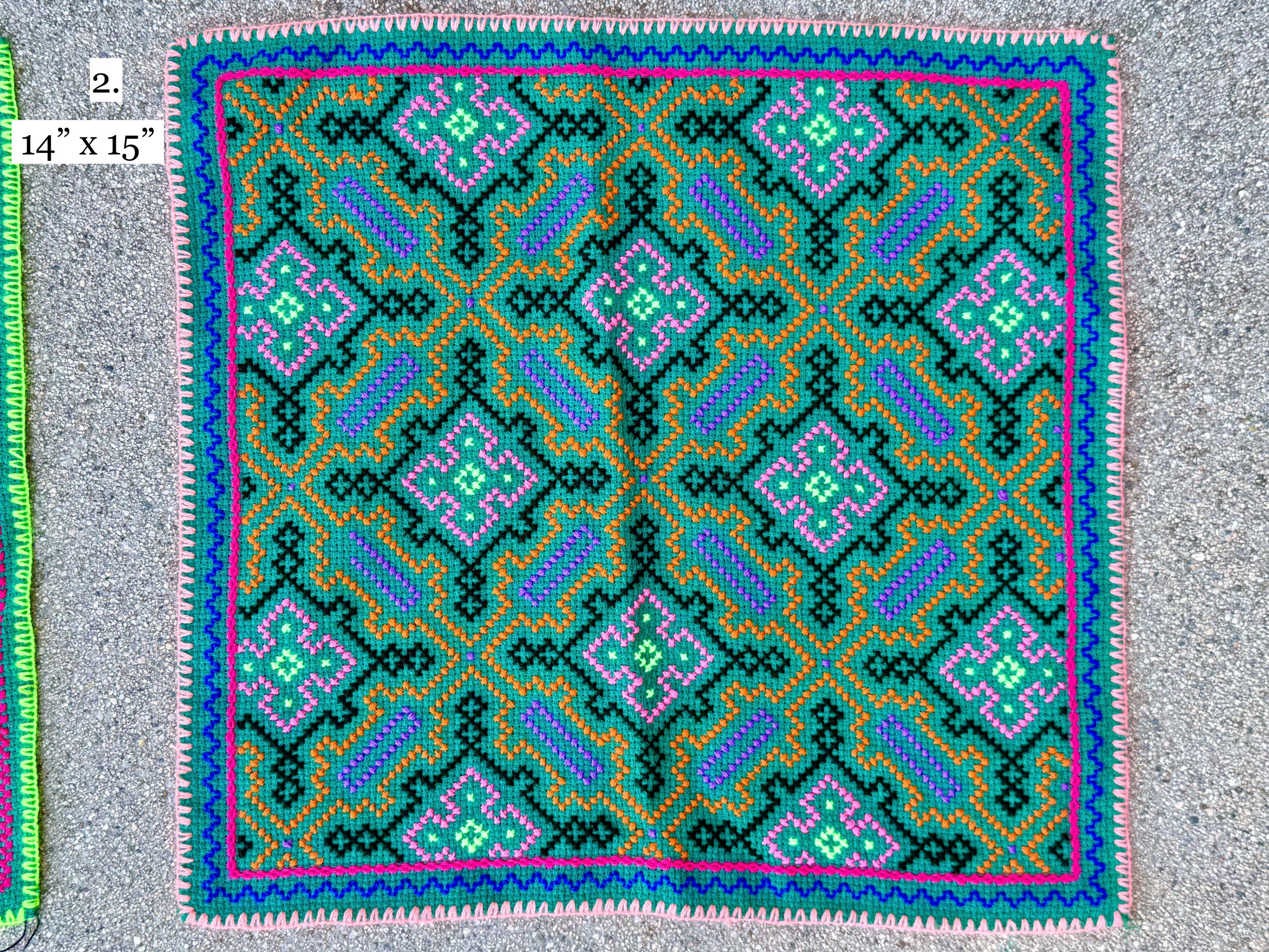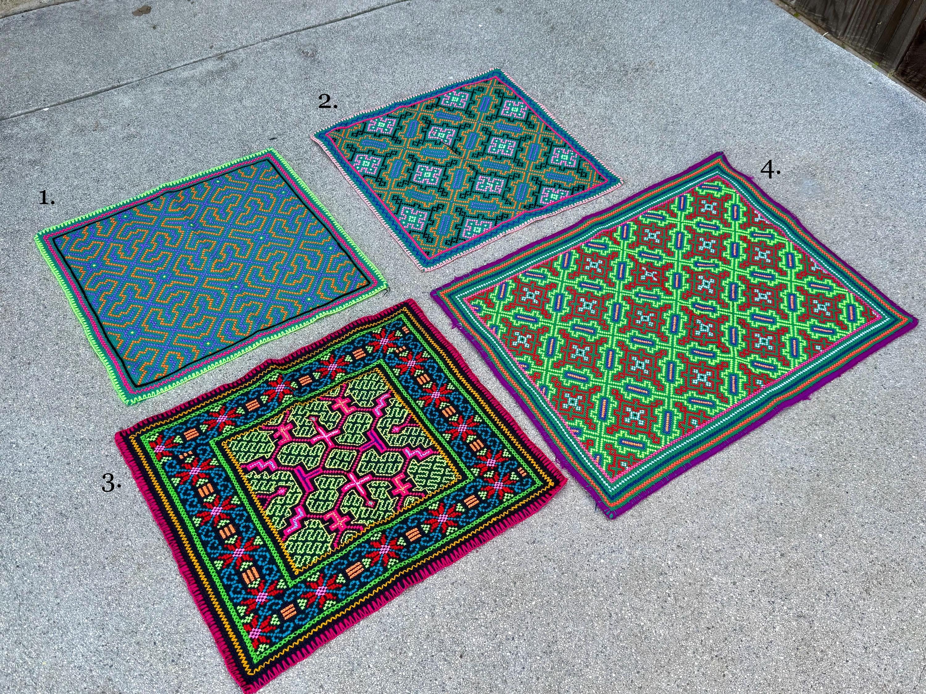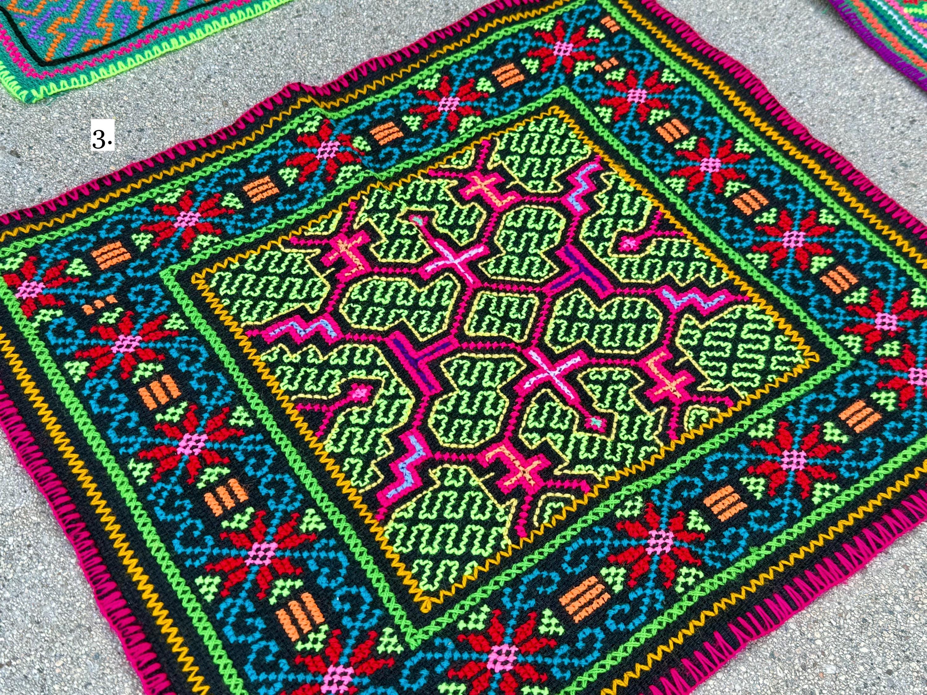 These vibrant Shipibo manta cloths were hand-embroidered by the wonderful Peruvian artisan Isabel Franquines in Pucallpa, Peru. Each selection is numbered, simply choose your preference from the dropdown menu.
