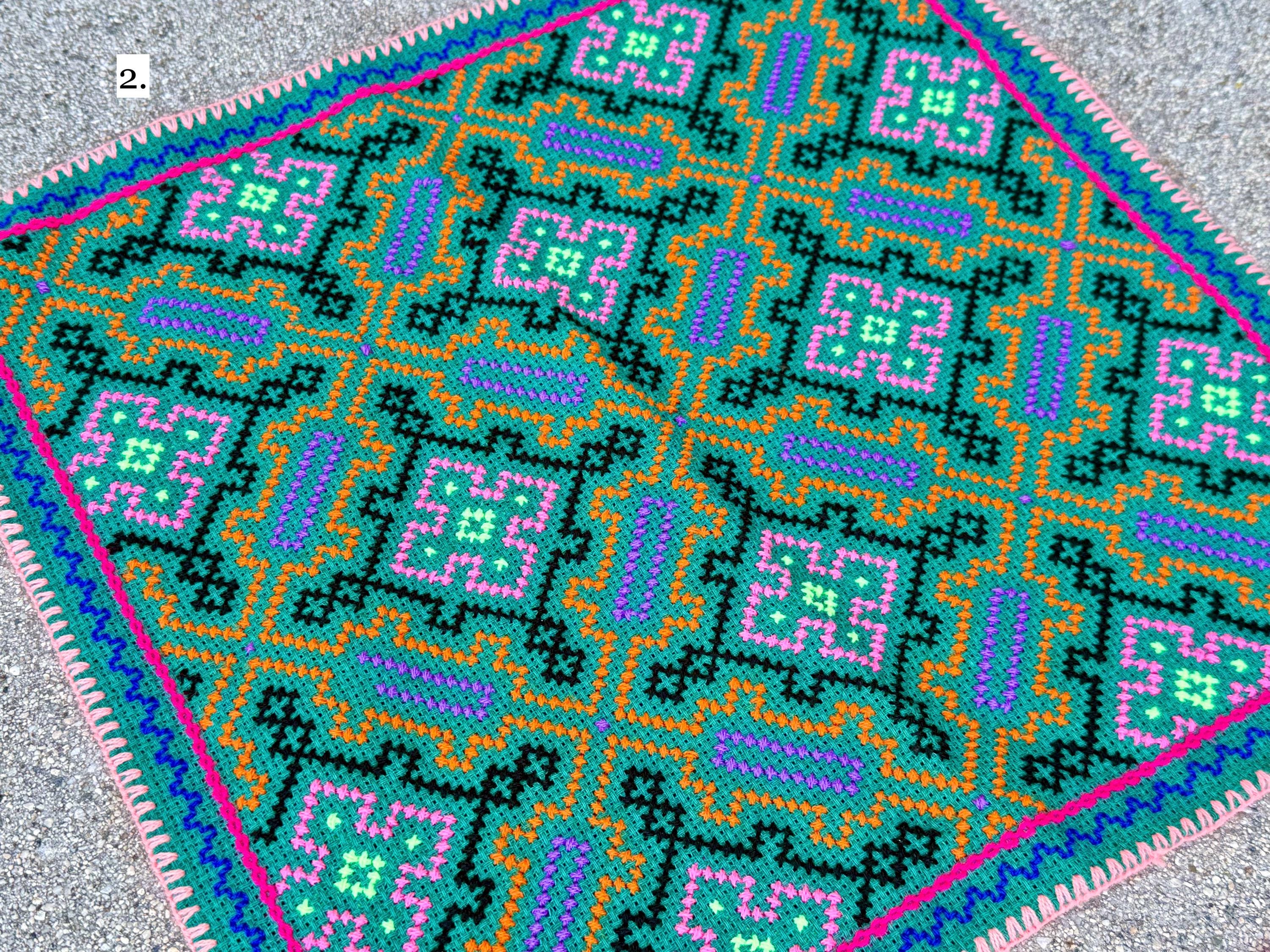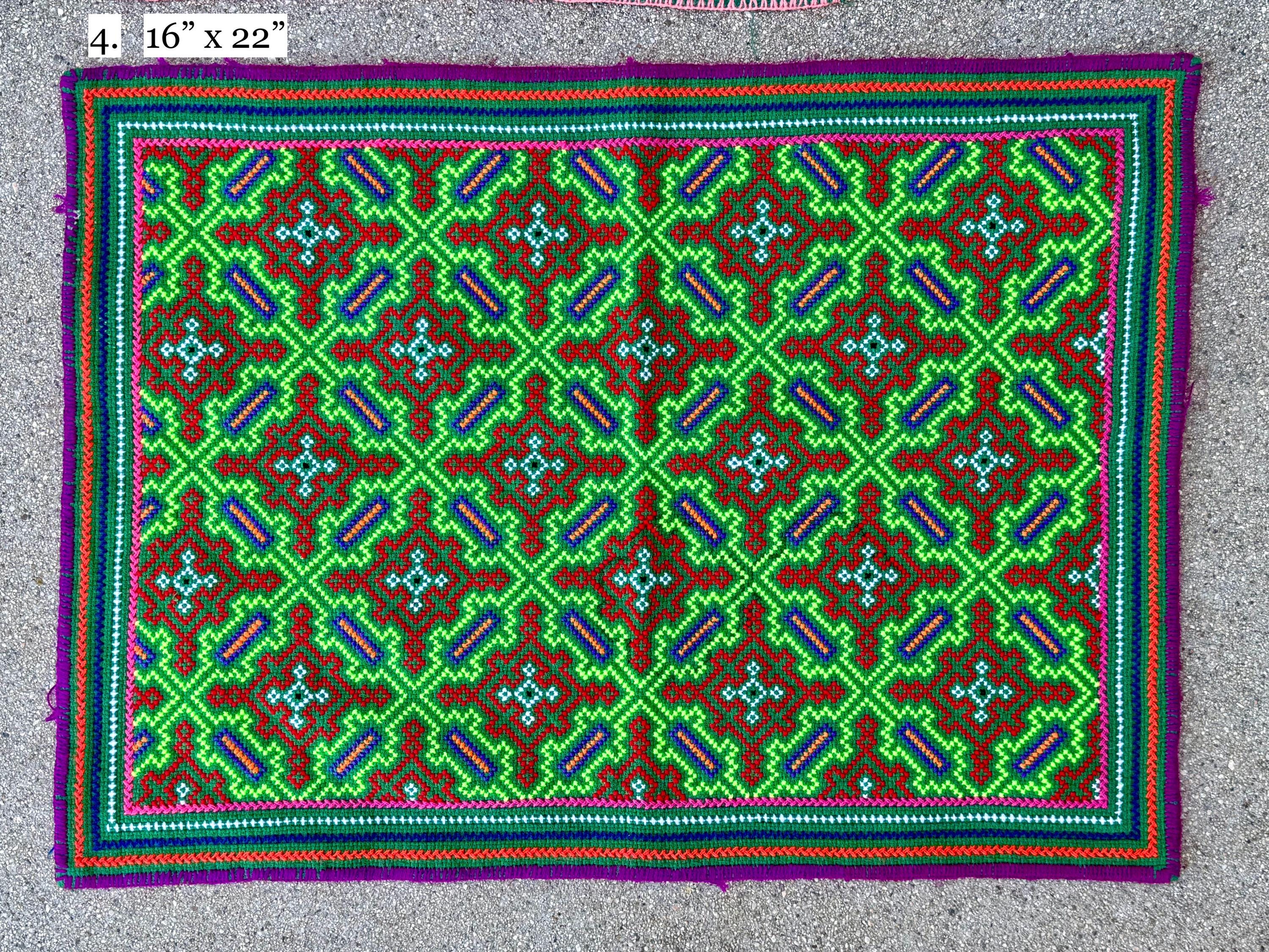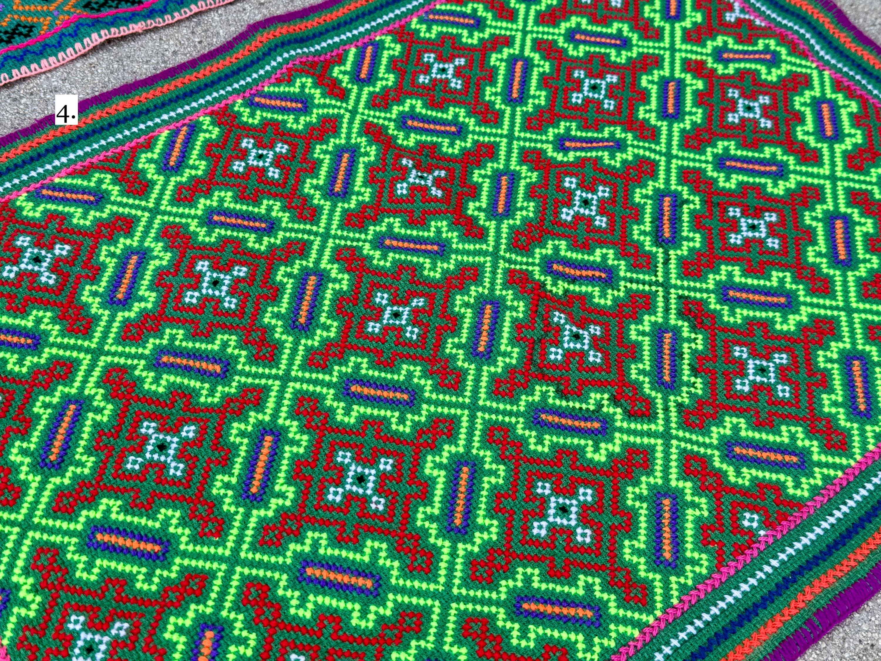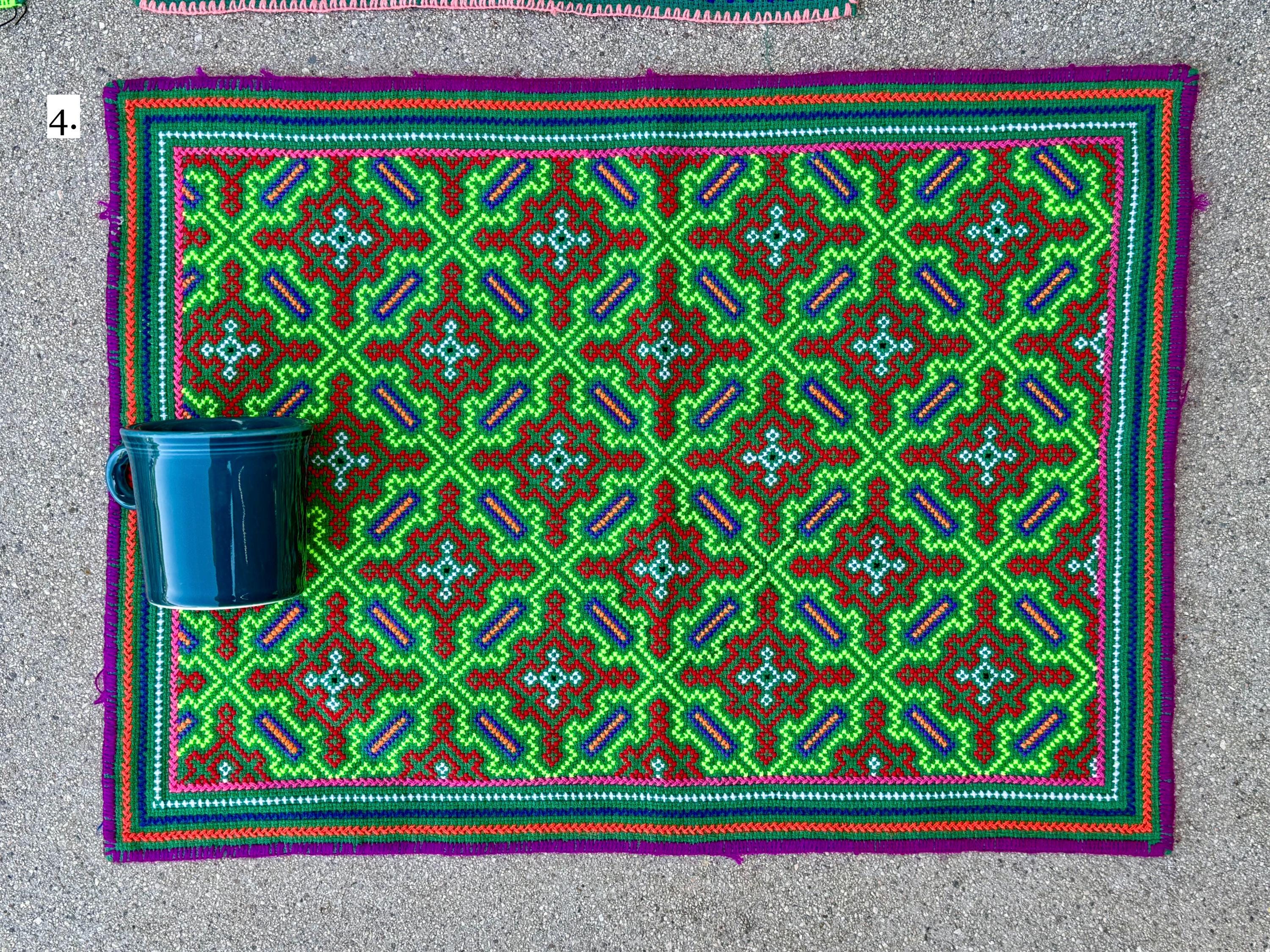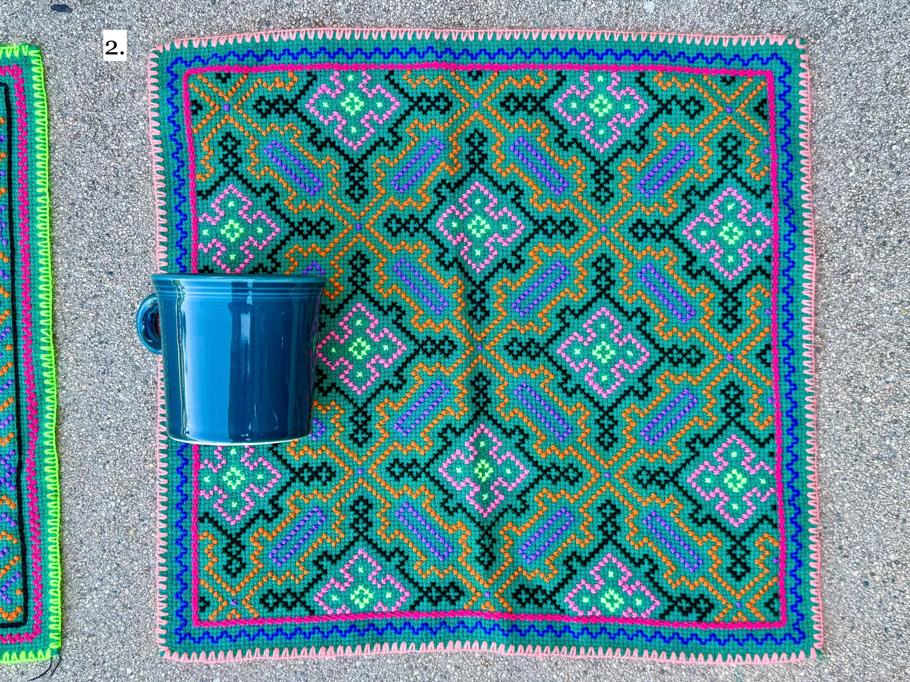 These vibrant Shipibo manta cloths were hand-embroidered by the wonderful Peruvian artisan Isabel Franquines in Pucallpa, Peru. Each selection is numbered, simply choose your preference from the dropdown menu.