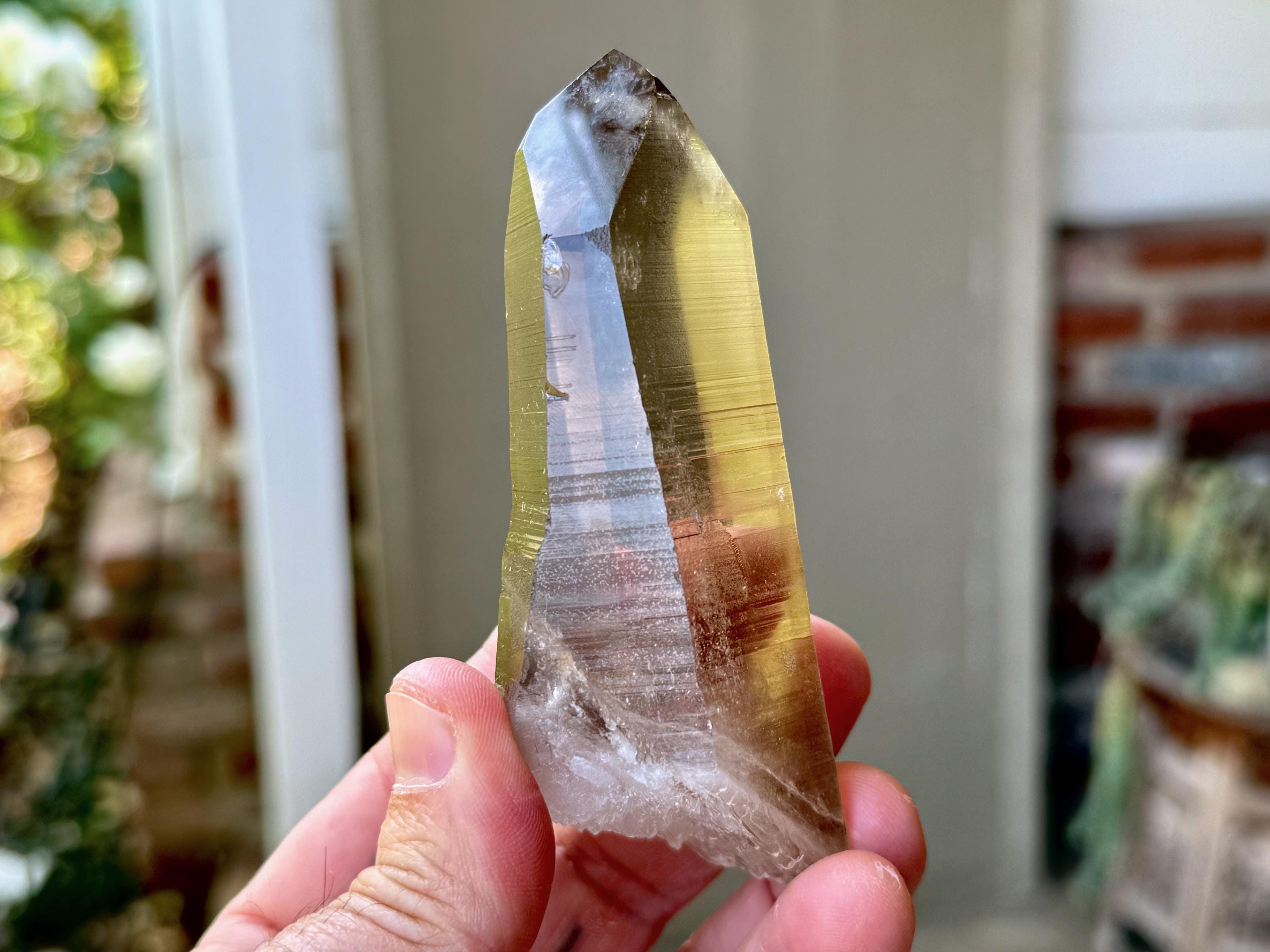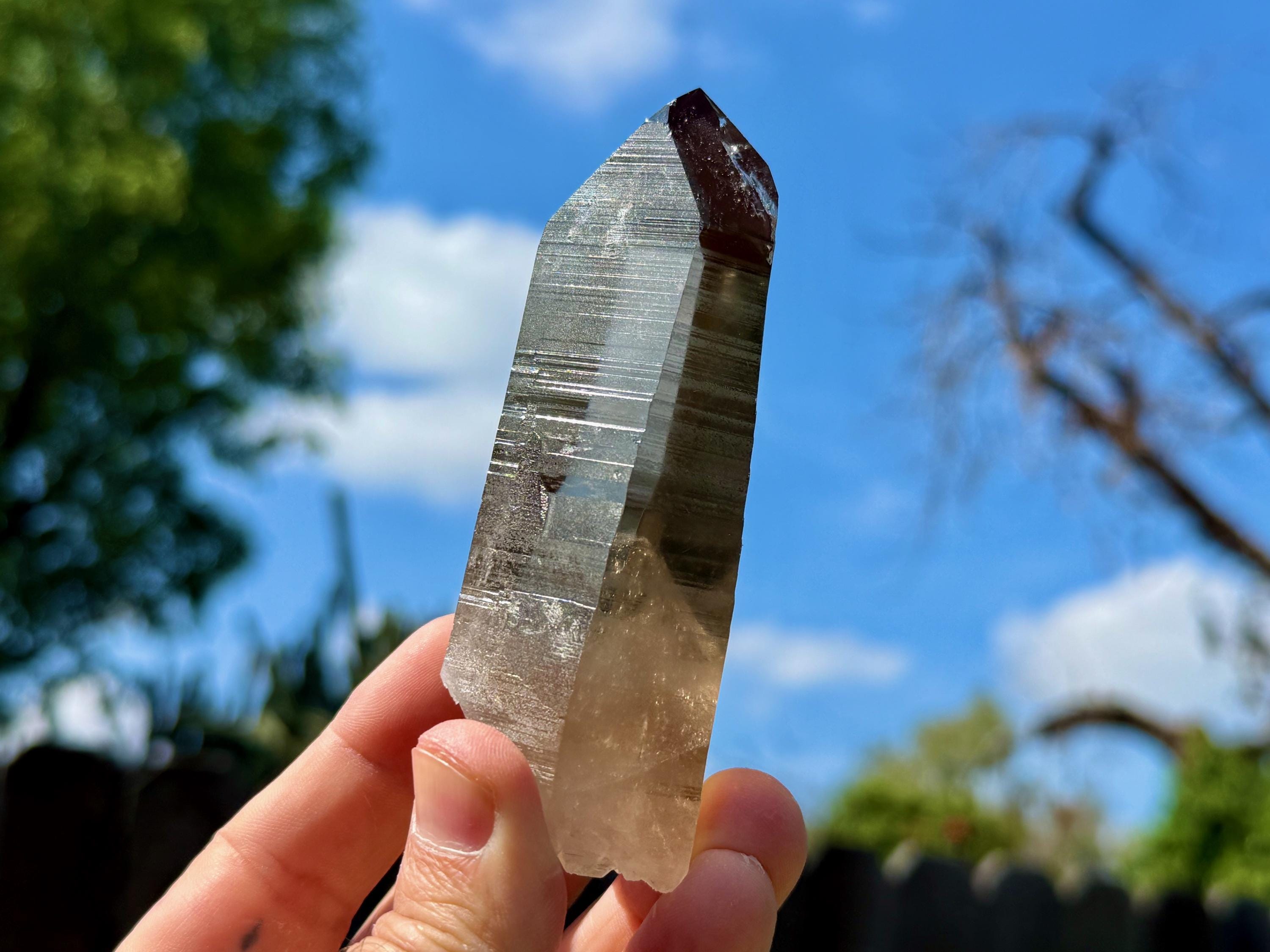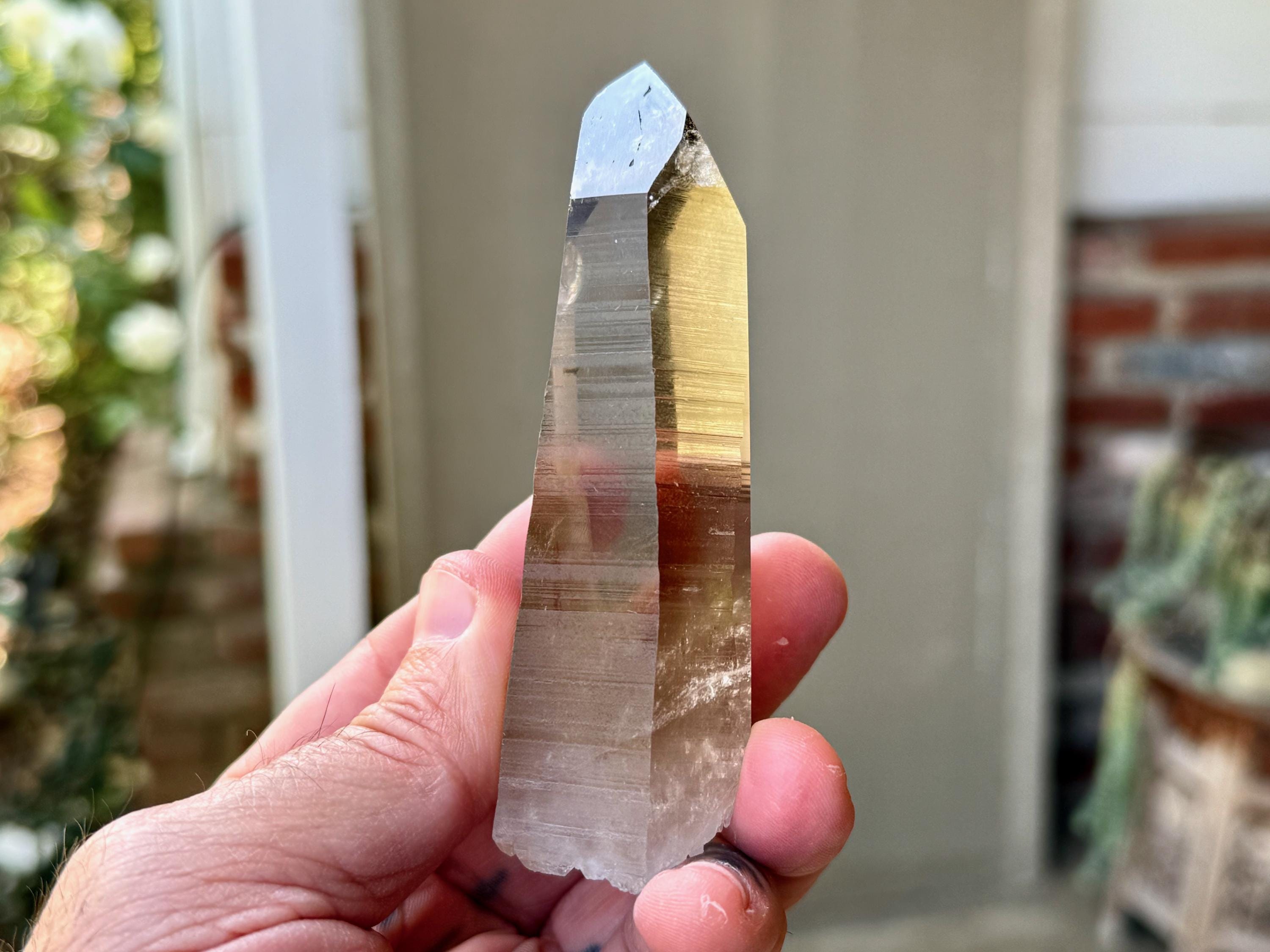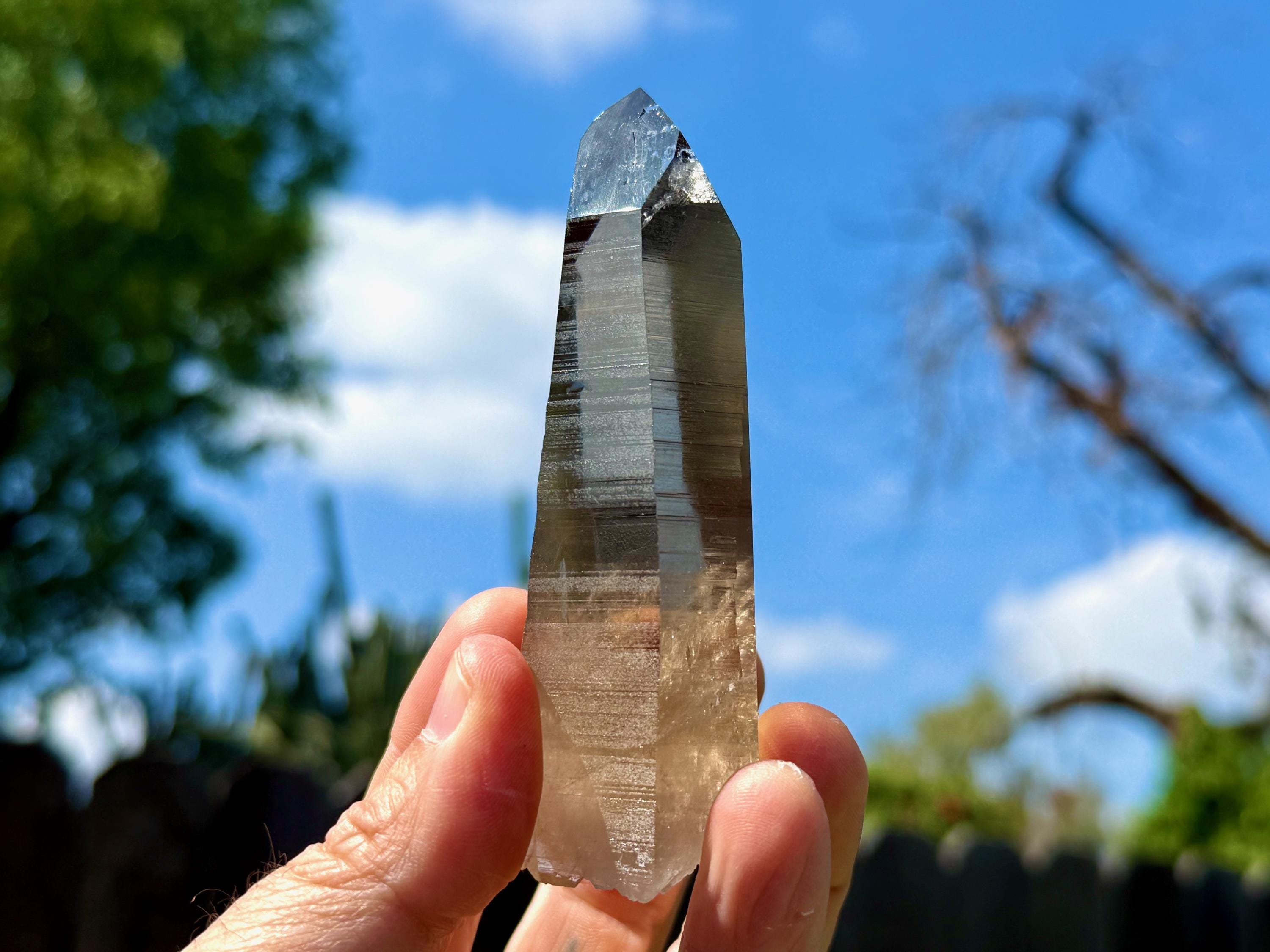 Water-clear clarity, brilliant luster and a mild smoky-golden color to this stunning Blue Needle Smoky Lemurian Quartz crystal! This crystal possesses an elegant tapered formation, with well-defined striations on its sides. The base is actually self-healed, making this a Double Terminated crystal (Photo 10).