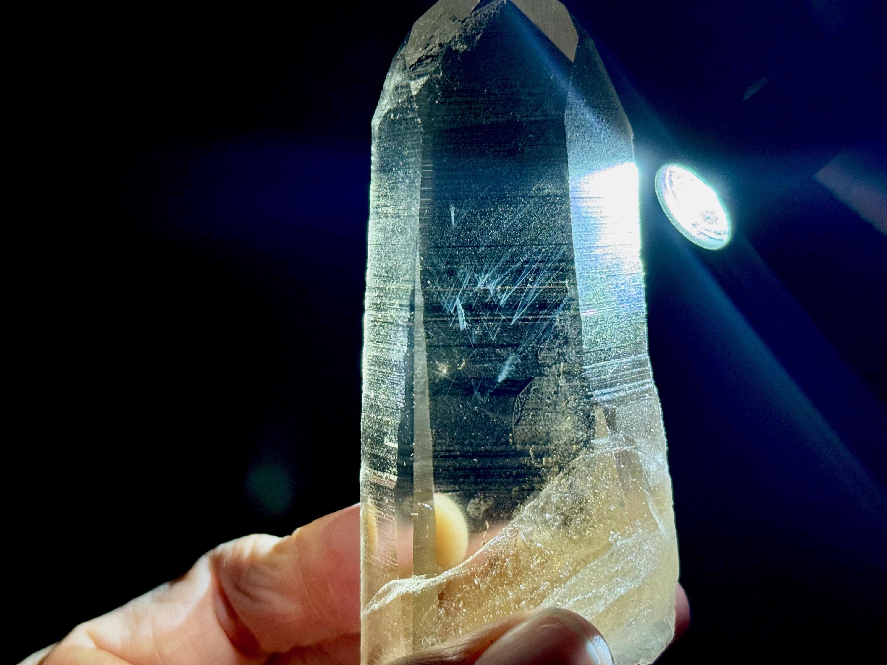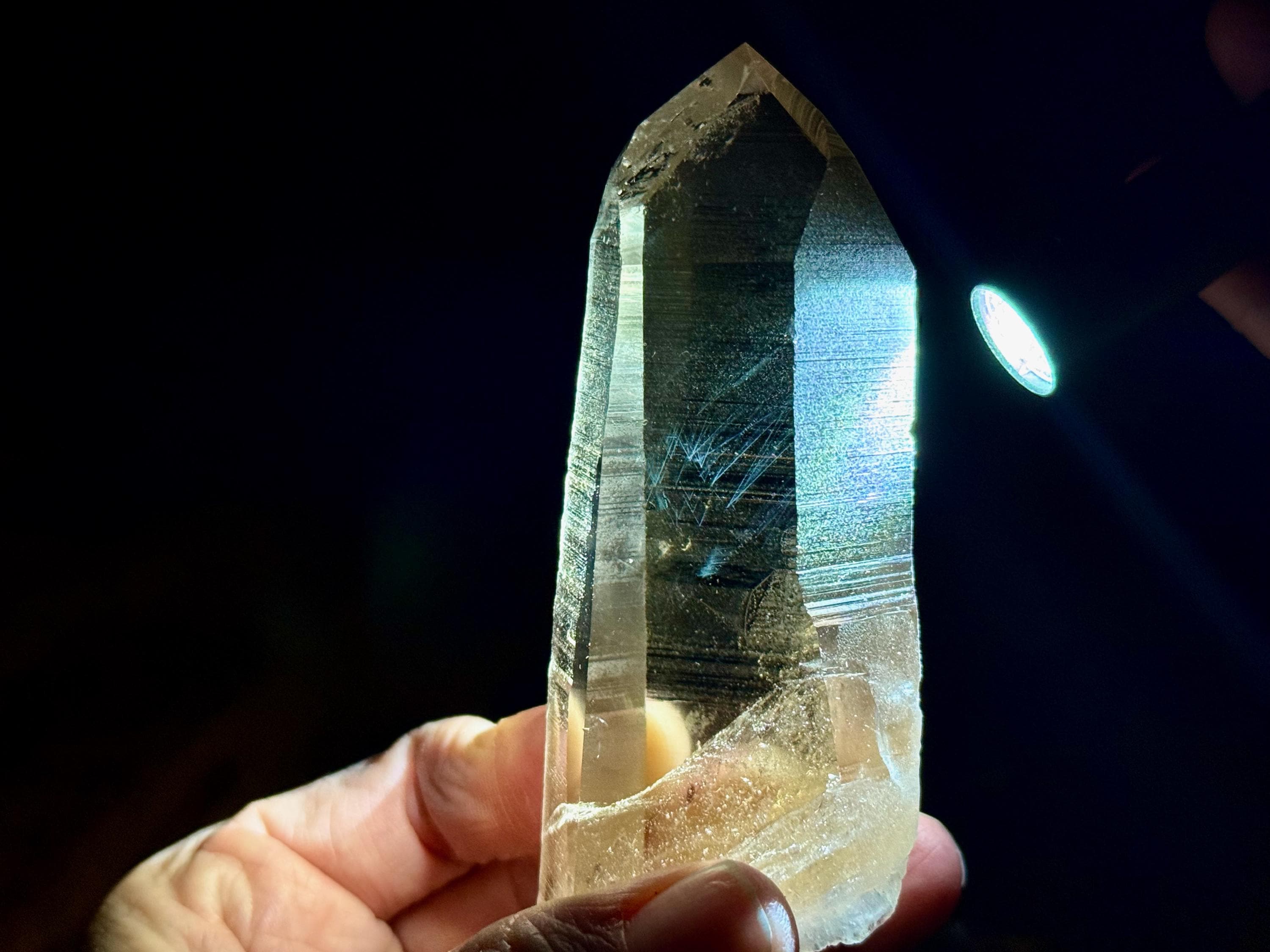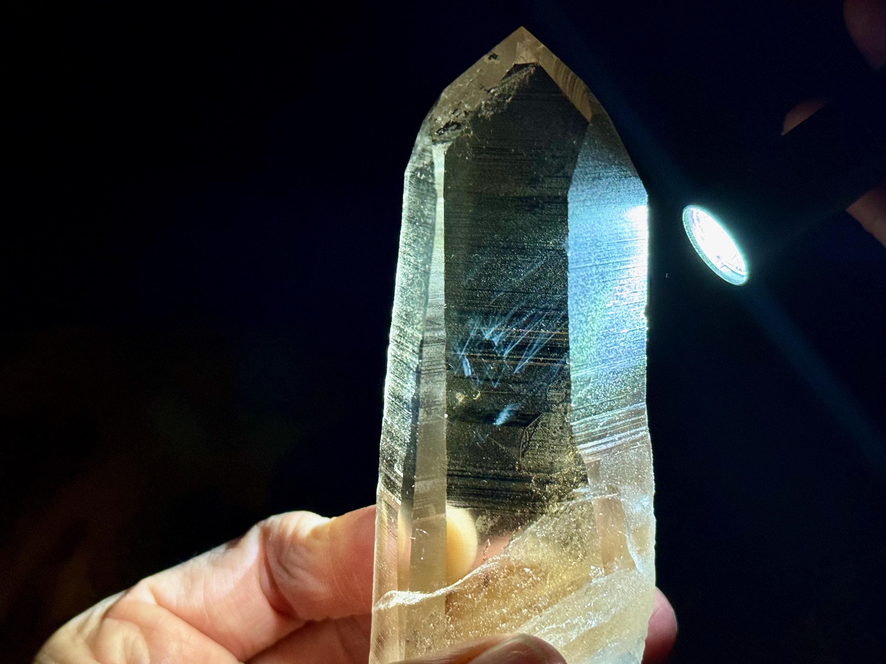 Blue Needle Lemurians exhibit a unique phenomenon that causes the appearance of blue needle-like inclusions within. In actuality, these are not physical inclusions, but instead thin tubes of gas suspended within, formed naturally inside the crystal over hundreds of millions of years during the crystal's formation. When light is shone on them from the exact right angle, they glow a ghostly blue color (some say due to the Tyndall Effect).