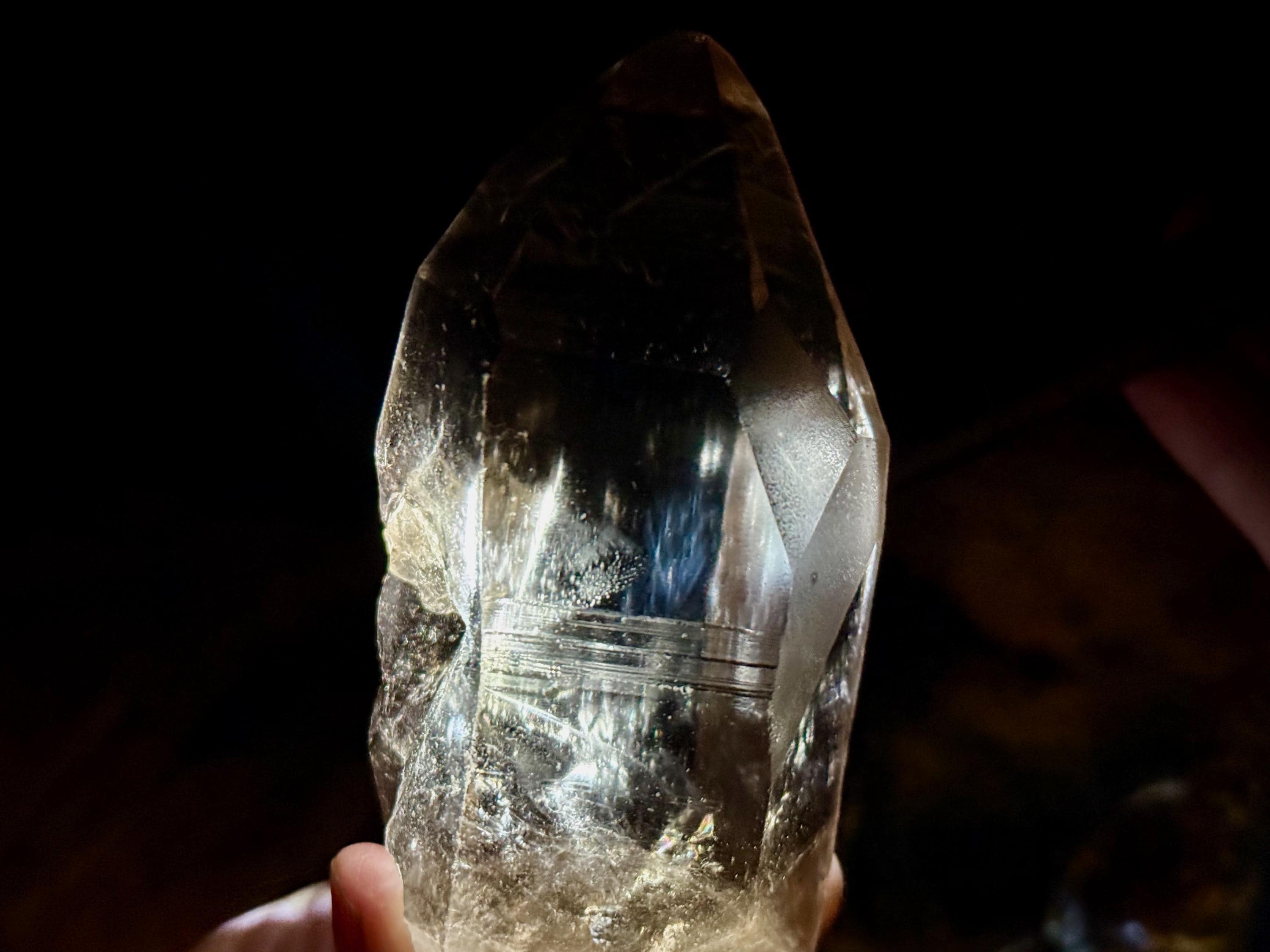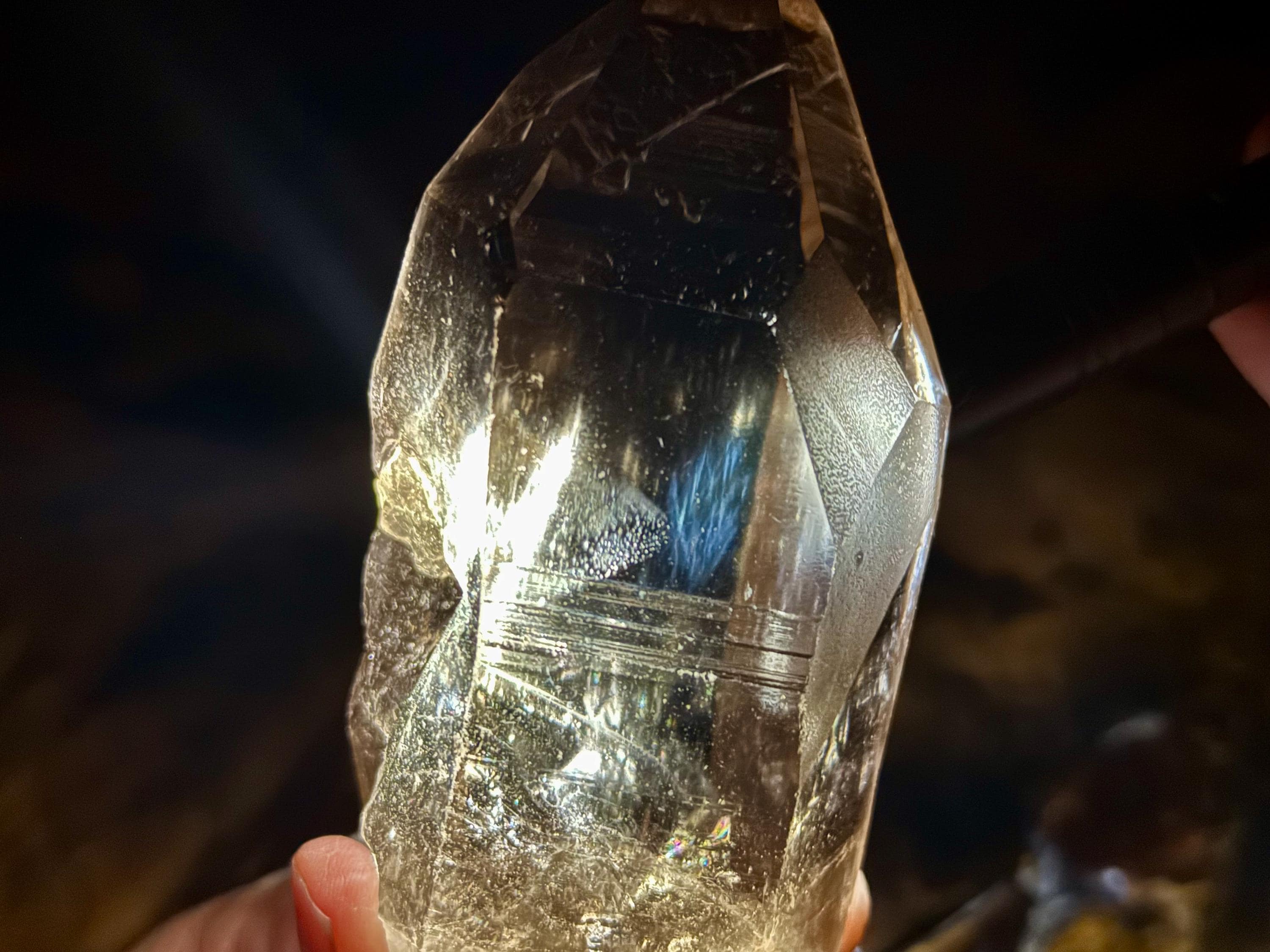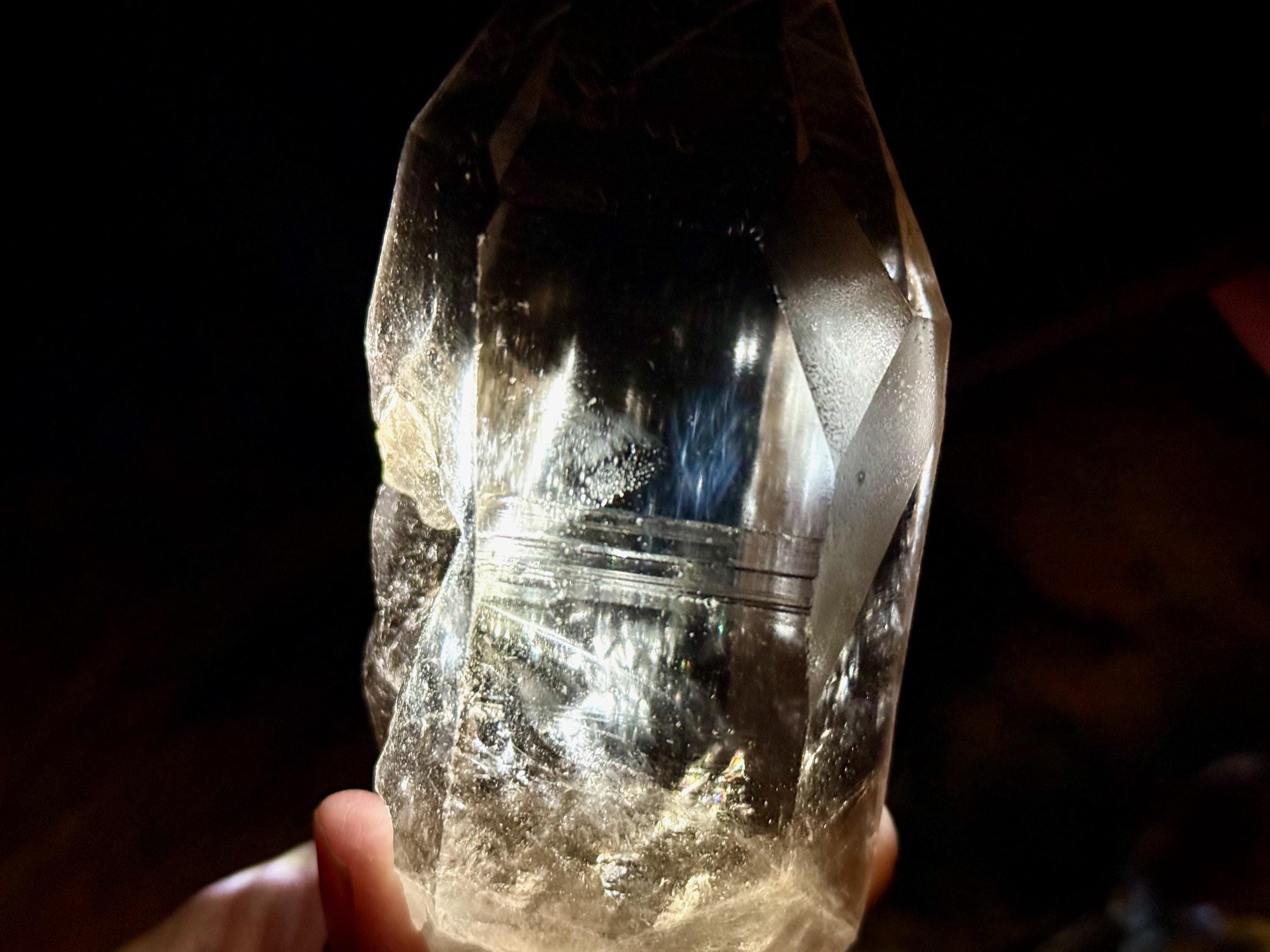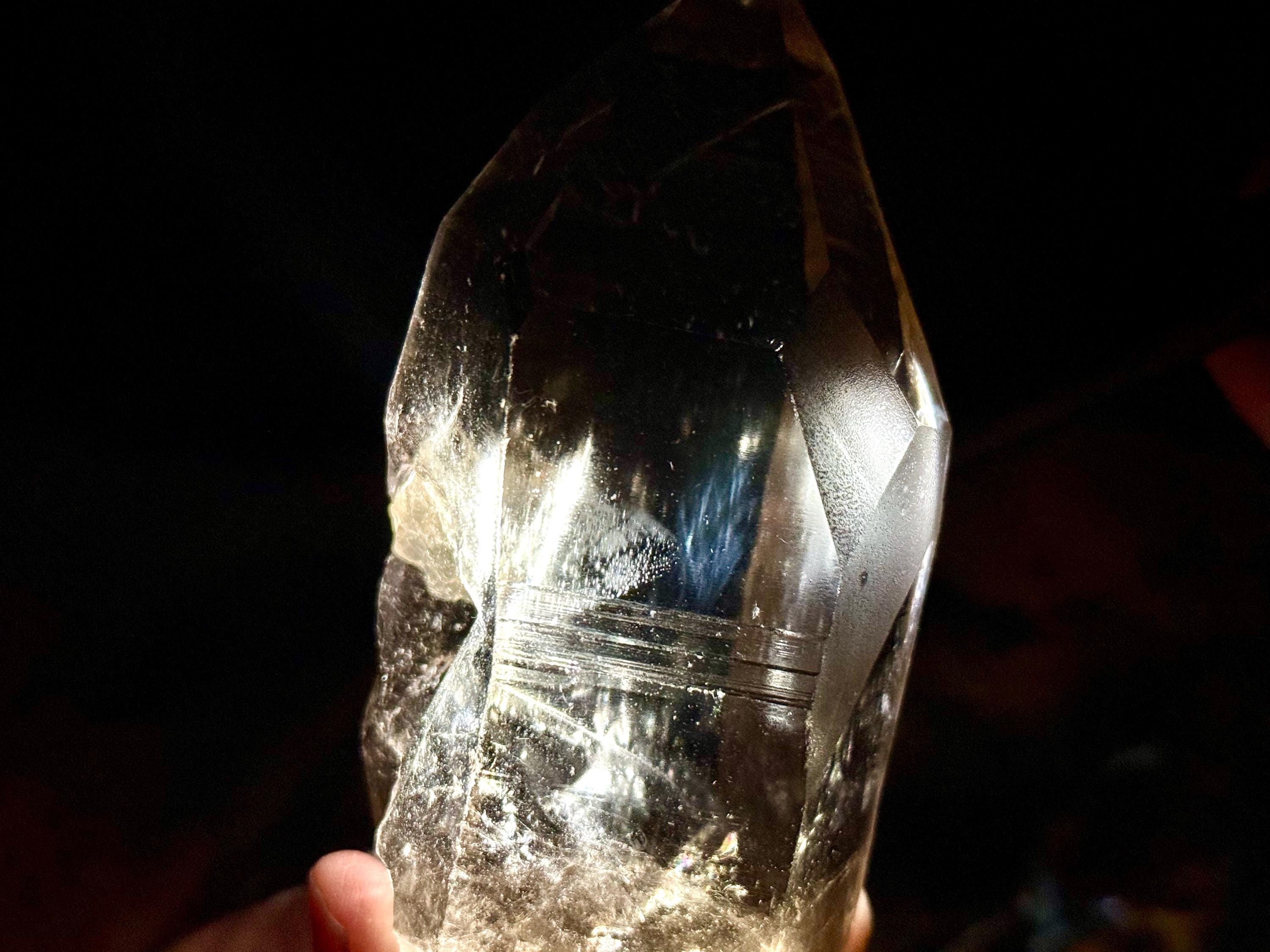 Blue Needle Lemurians exhibit a unique phenomenon that causes the appearance of blue needle-like inclusions within. In actuality, these are not physical inclusions, but instead thin tubes of gas suspended within, formed naturally inside the crystal over hundreds of millions of years during the crystal's formation. When light is shone on them from the exact right angle, they glow a ghostly blue color (some say due to the Tyndall Effect).