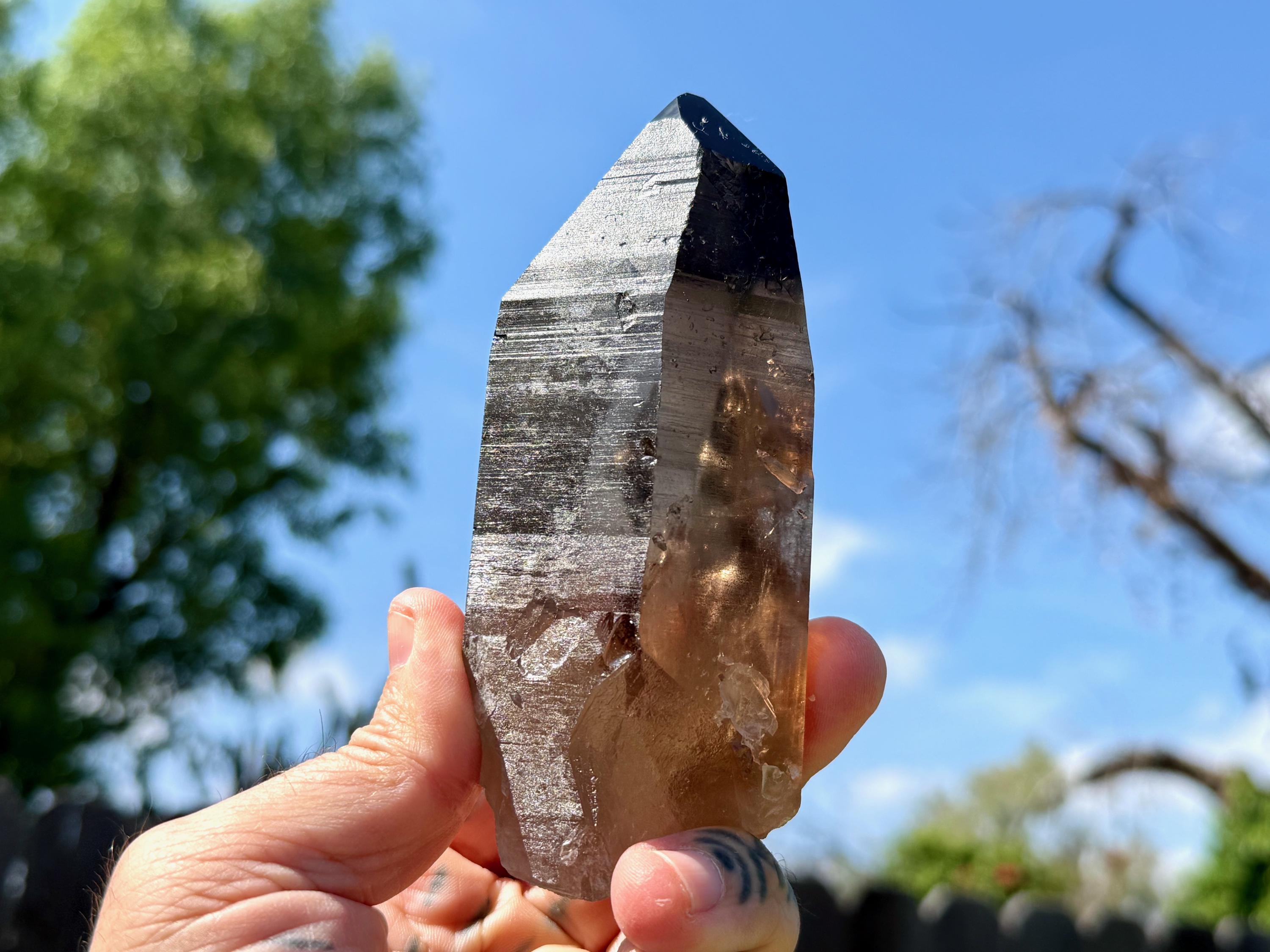 A broad, powerful formation to this deeply smoky and highly lustrous Blue Needle Lemurian Quartz crystal! This crystal exhibits superb clarity and nicely defined striations on its sides.