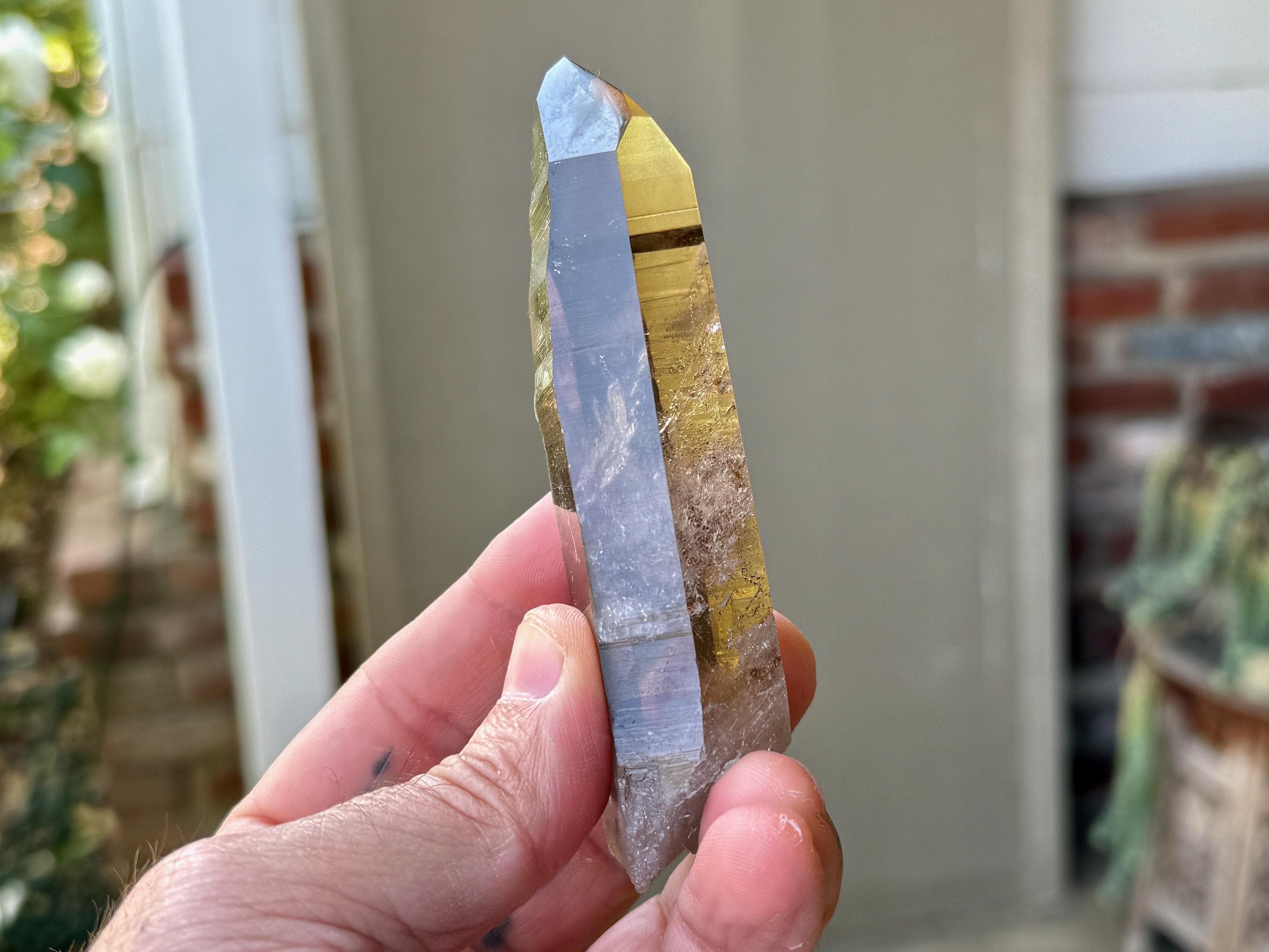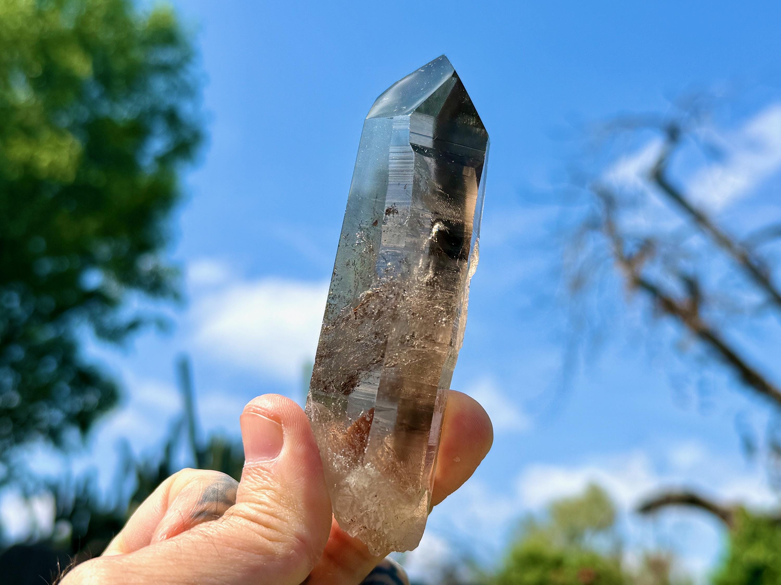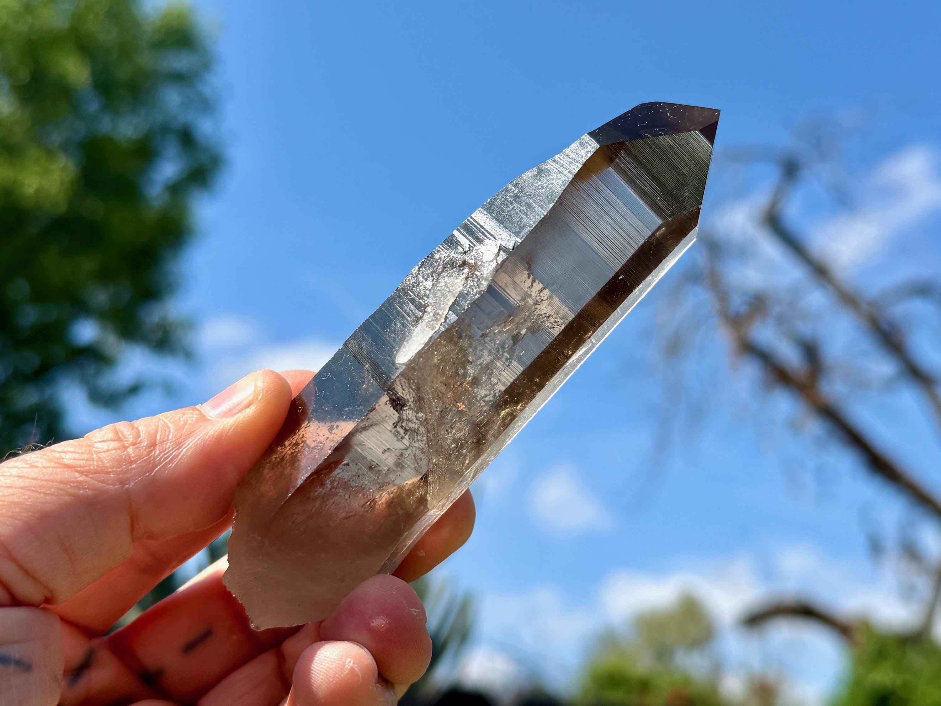 Perhaps the best piece from this collection so far, this Blue Needle Smoky Lemurian possesses a handsome, elongated formation, with superb clarity, brilliant luster and nicely defined striations on its sides. The base is actually self-healed, making this a Double Terminated crystal (Photo 9).