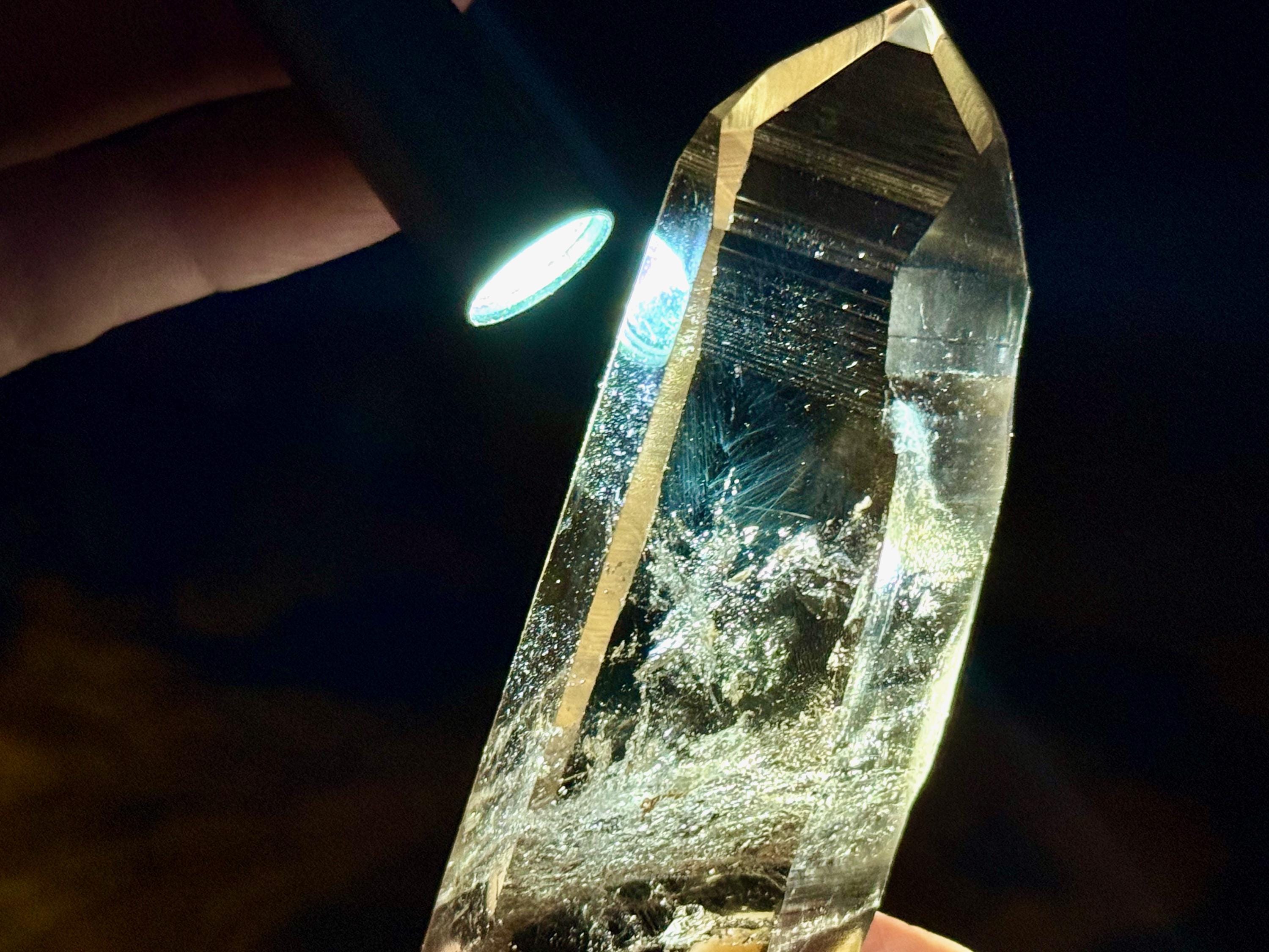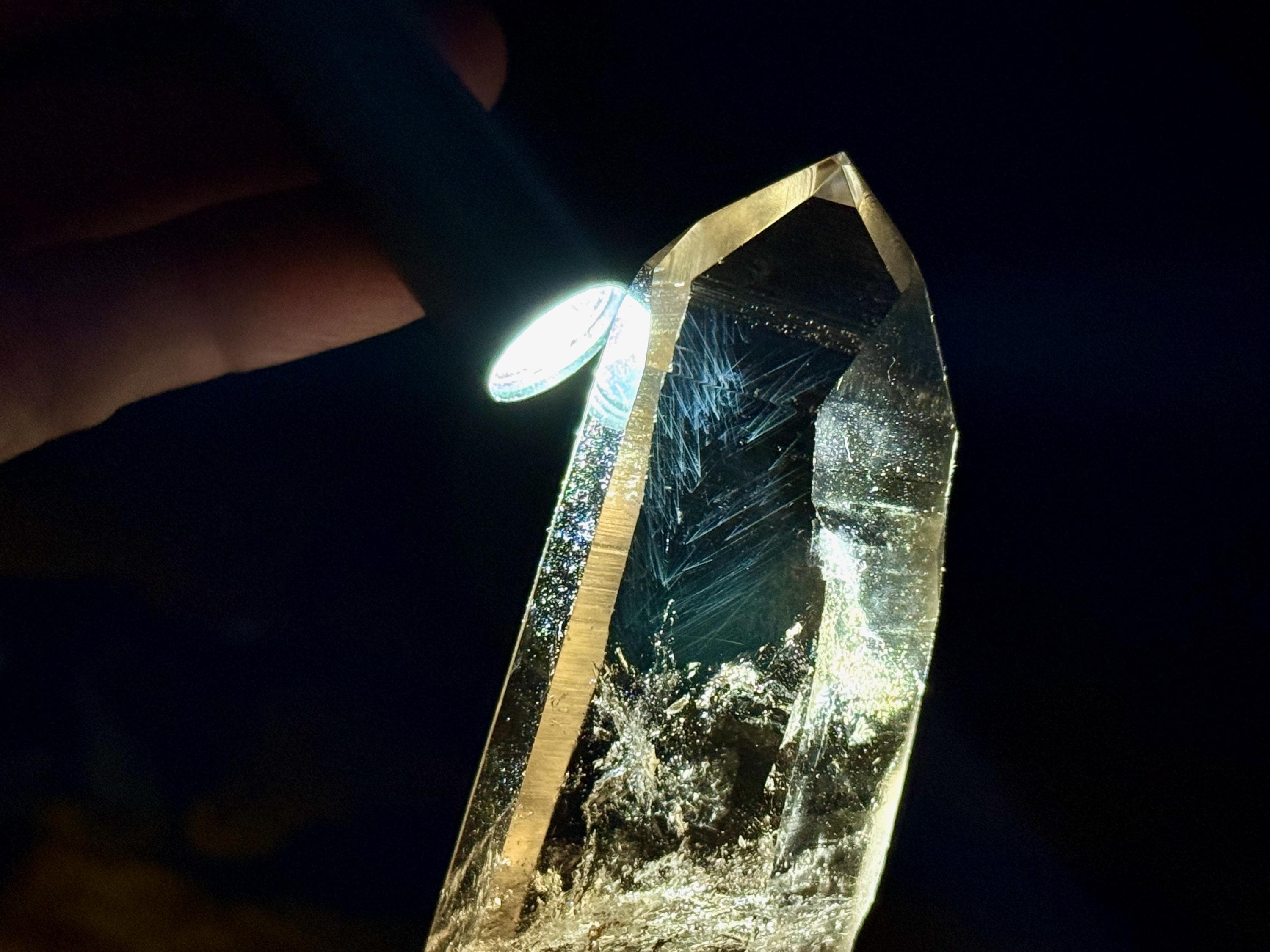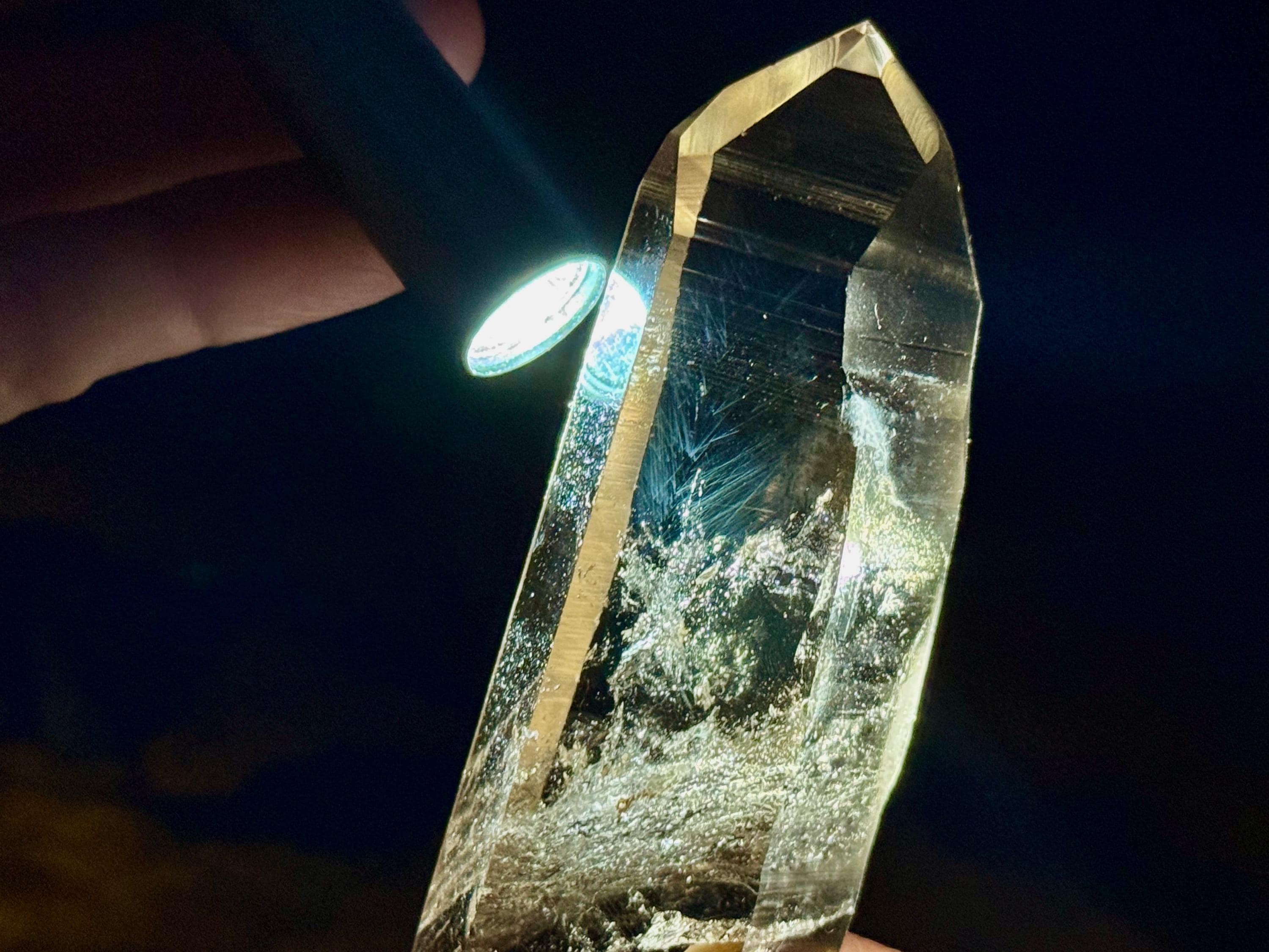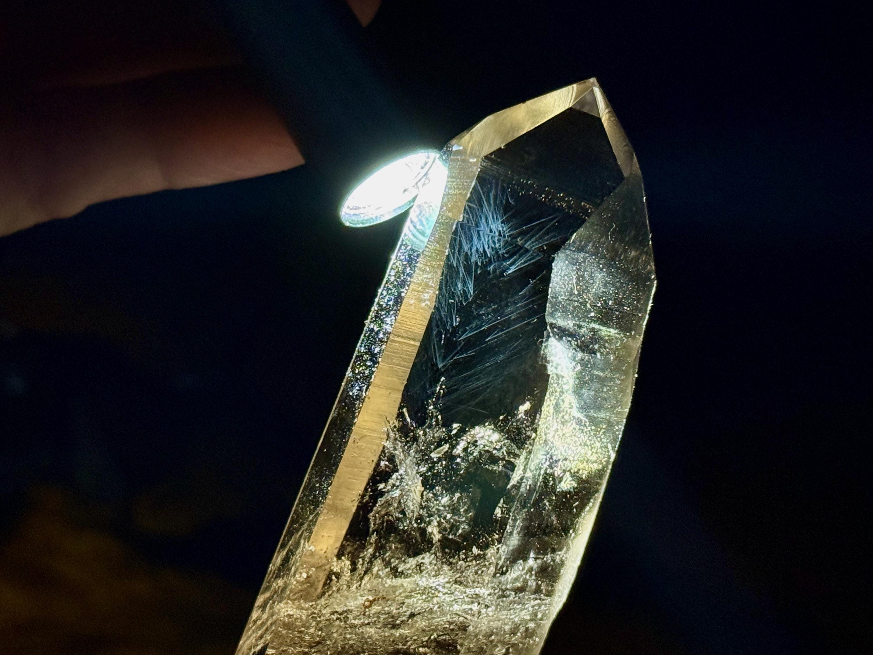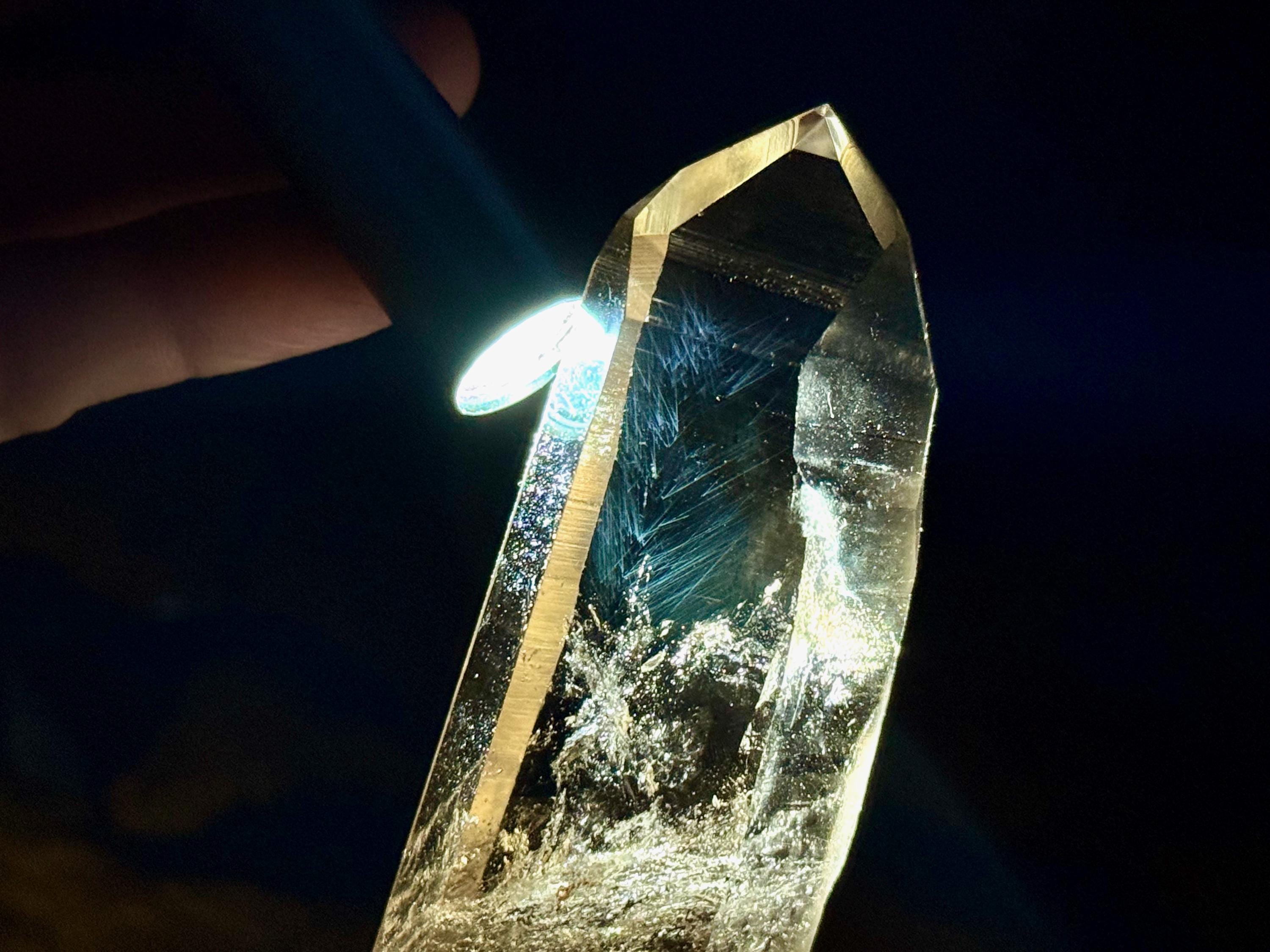 Blue Needle Lemurians exhibit a unique phenomenon that causes the appearance of blue needle-like inclusions within. In actuality, these are not physical inclusions, but instead thin tubes of gas suspended within, formed naturally inside the crystal over hundreds of millions of years during the crystal's formation. When light is shone on them from the exact right angle, they glow a ghostly blue color (some say due to the Tyndall Effect).
