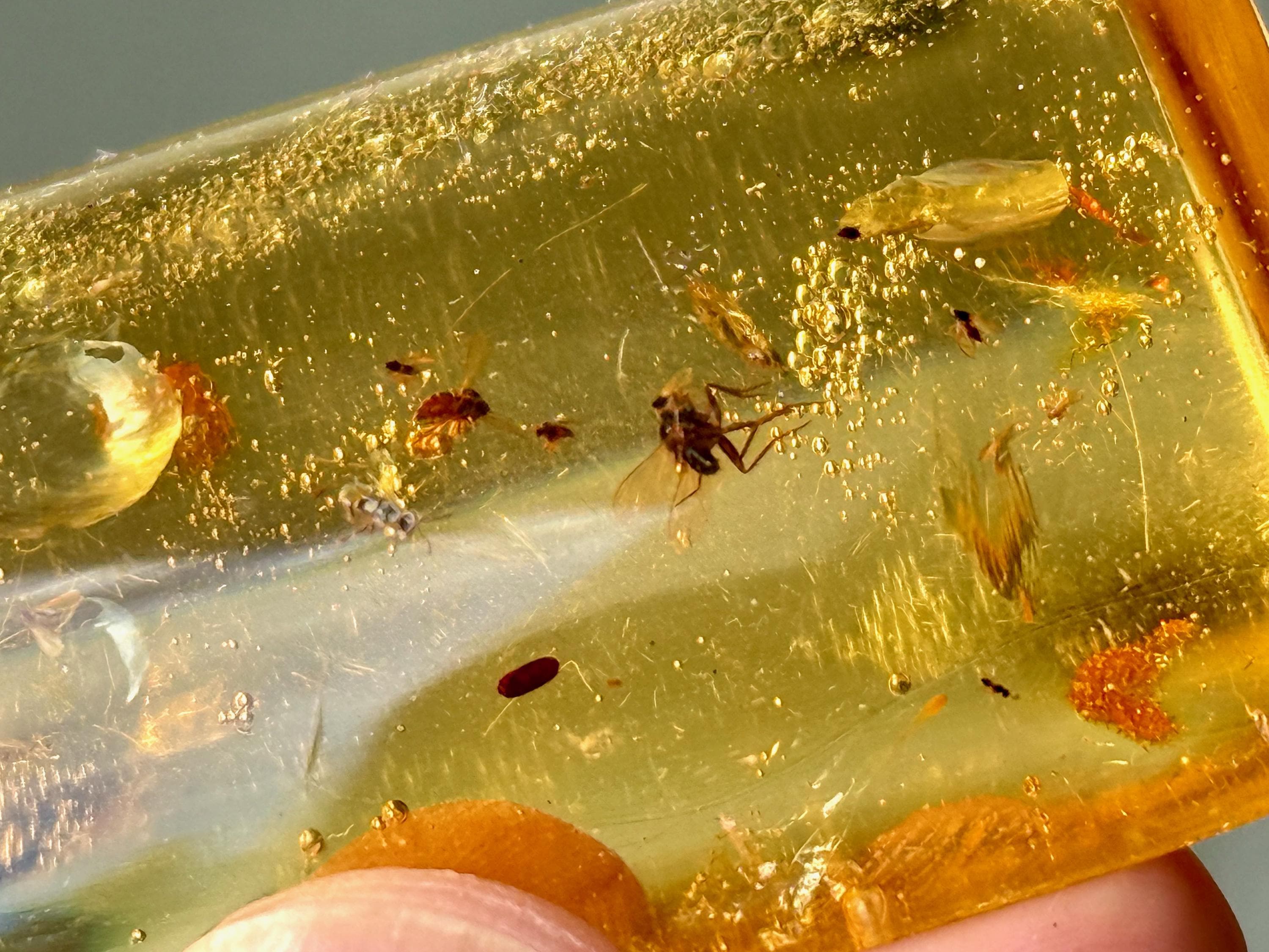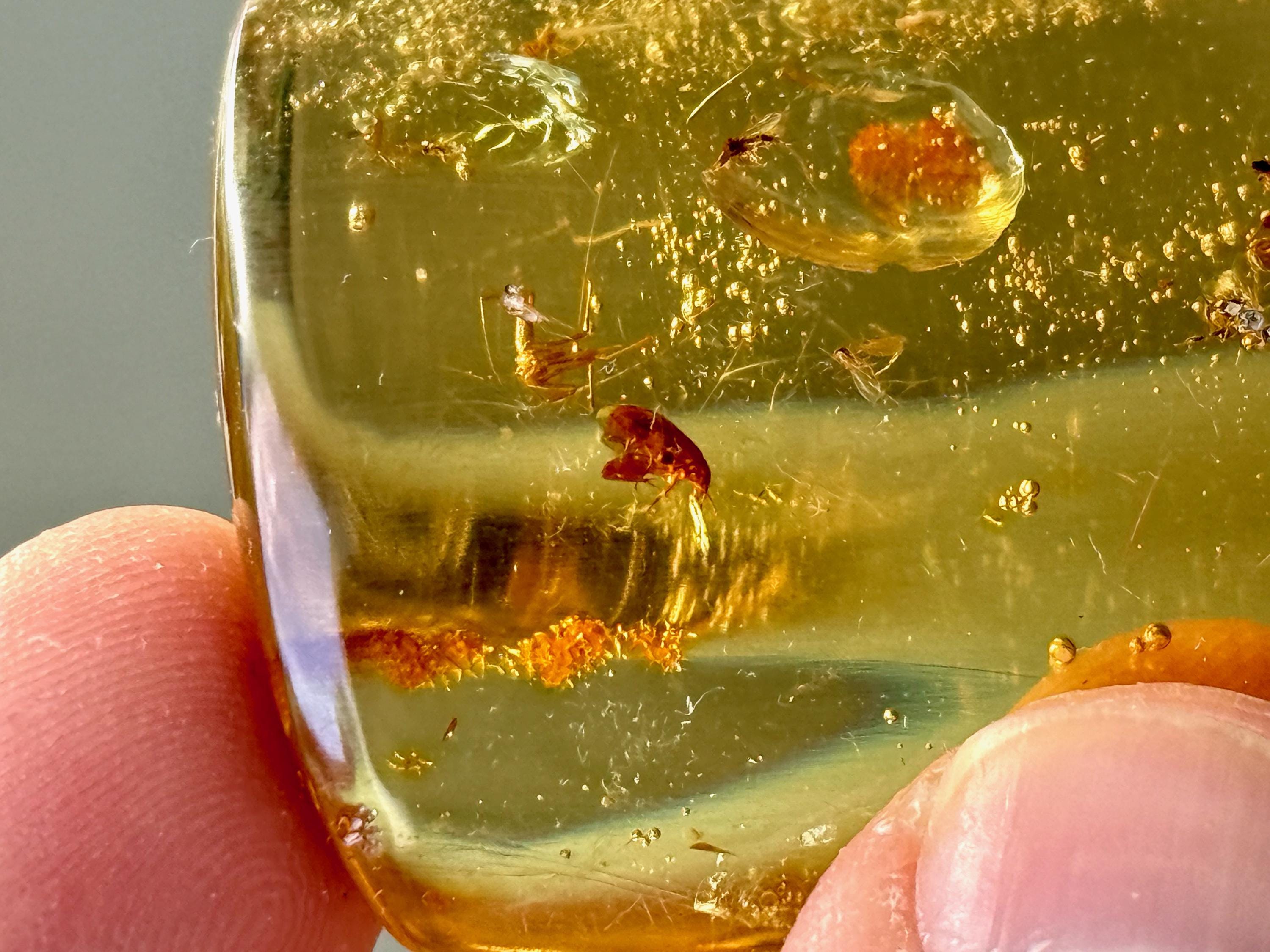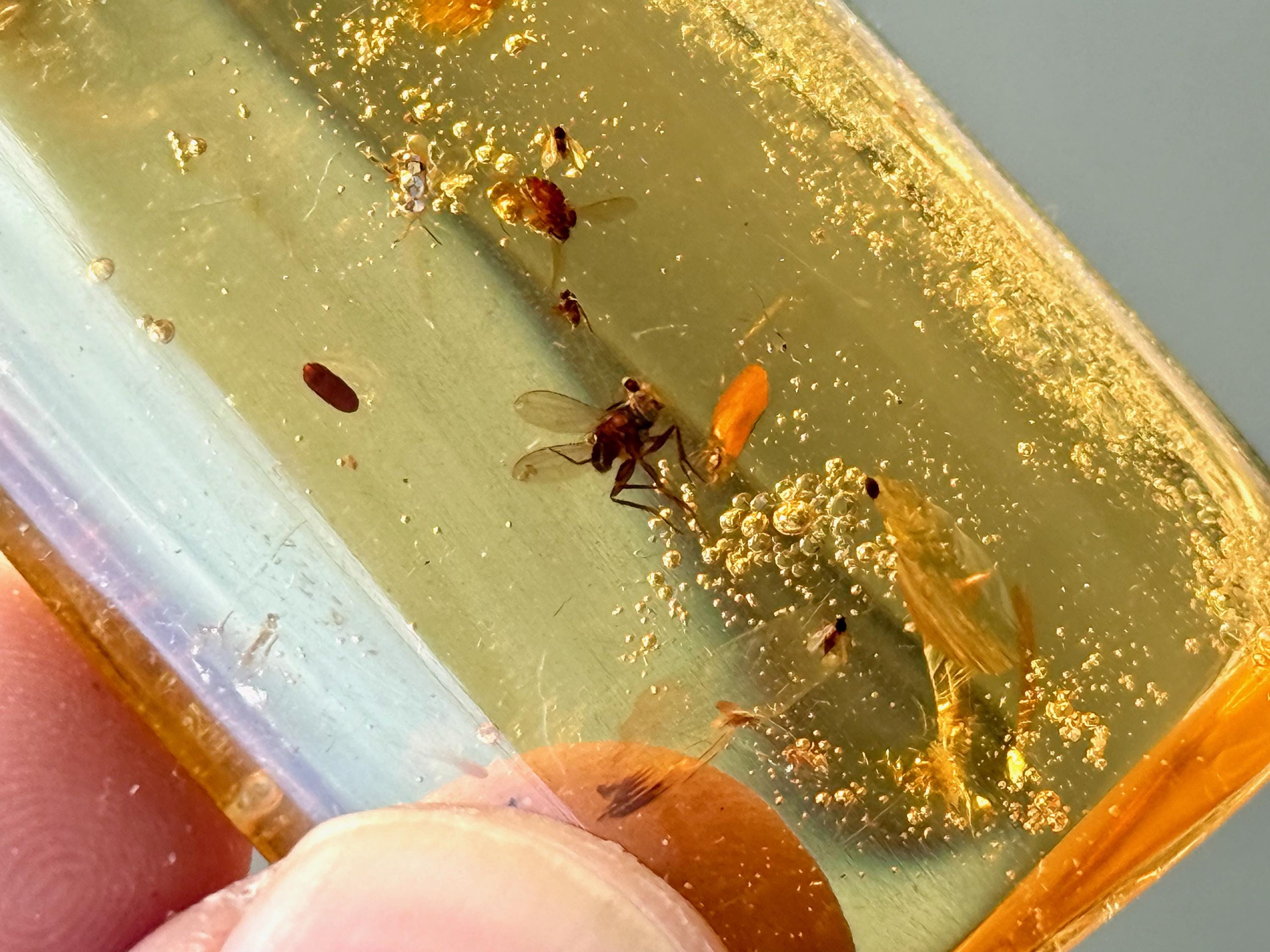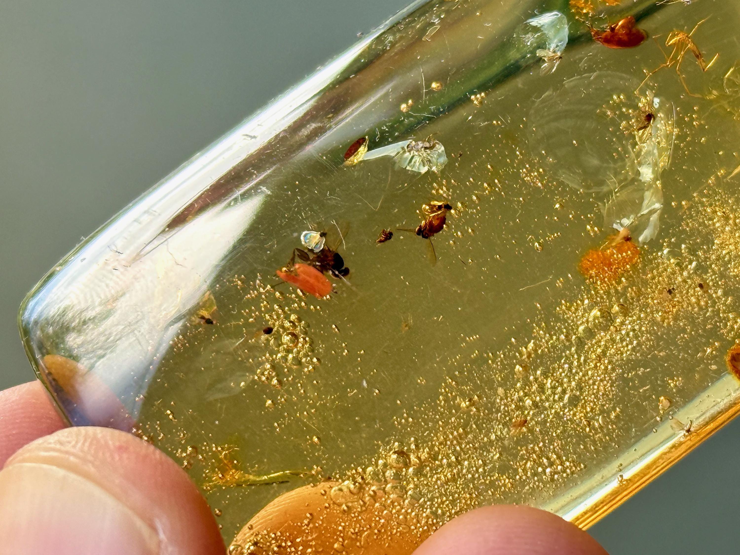 What's most special about this piece is that it contains several fully formed winged insects, fossilized within (see Photos 1, 3-6). We took these close ups with a macros lens to show off the detail, and while they can certainly be seen with the naked eye, the detail will be enjoyed more with a jeweler's loupe or magnifying glass.