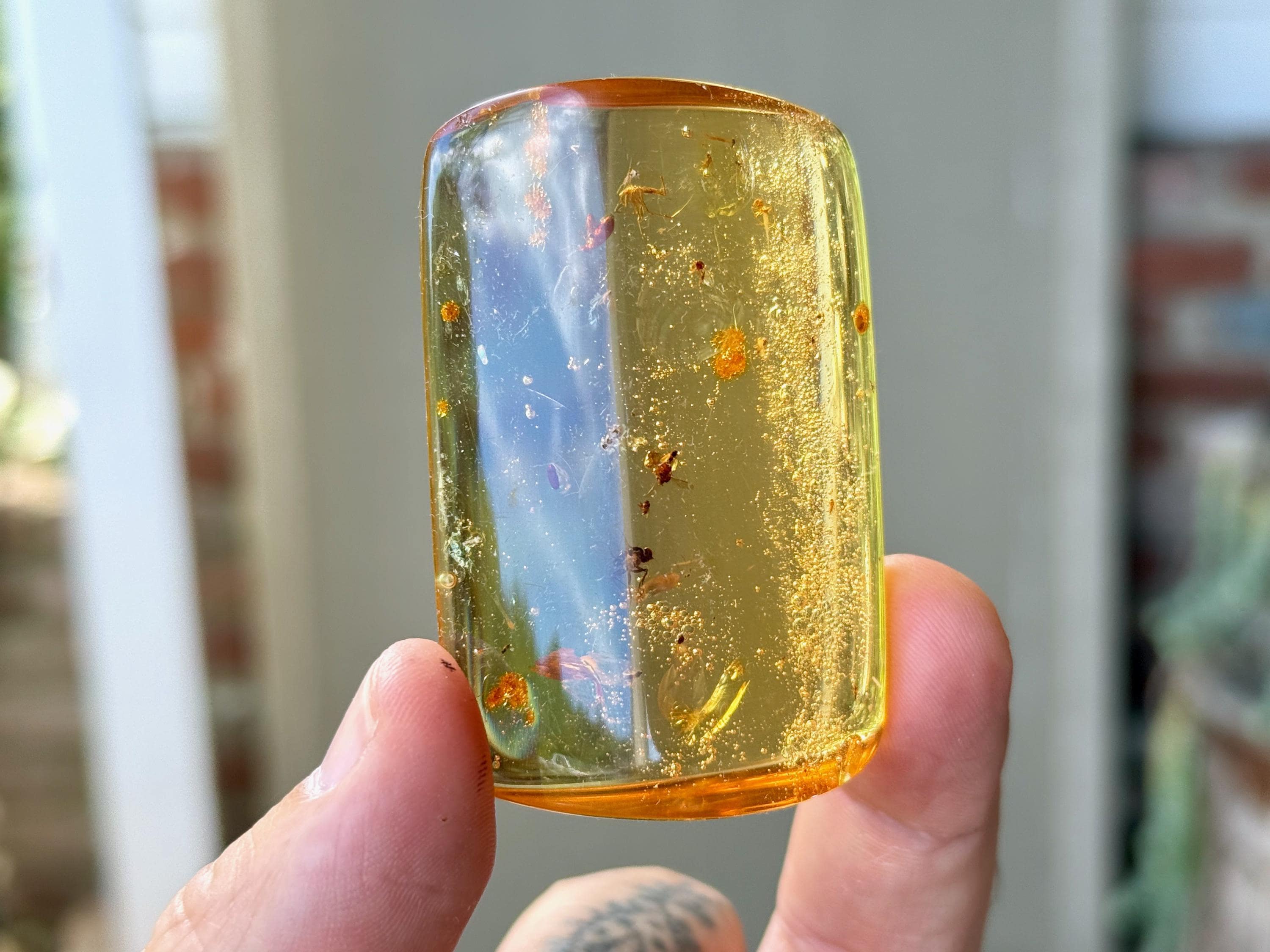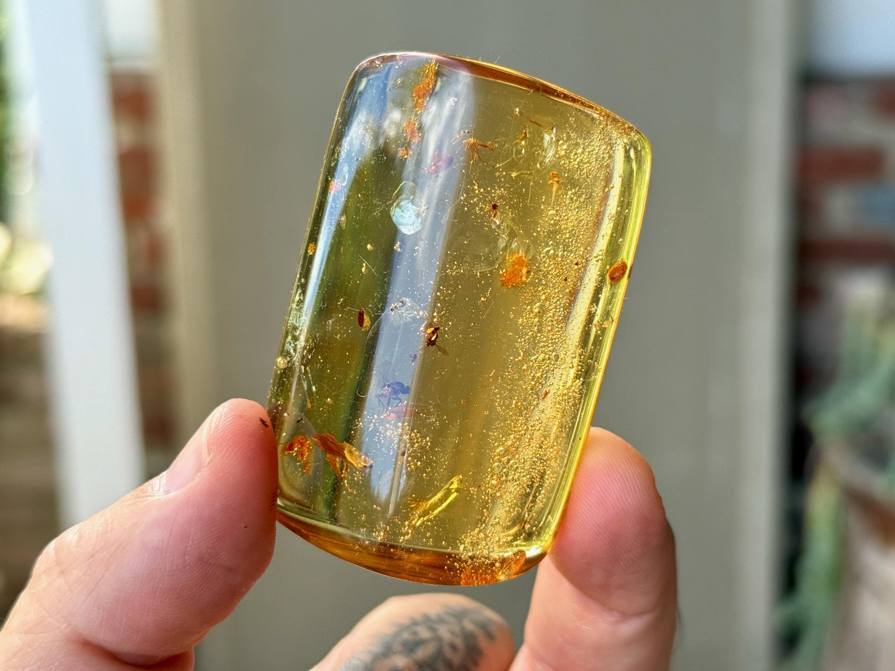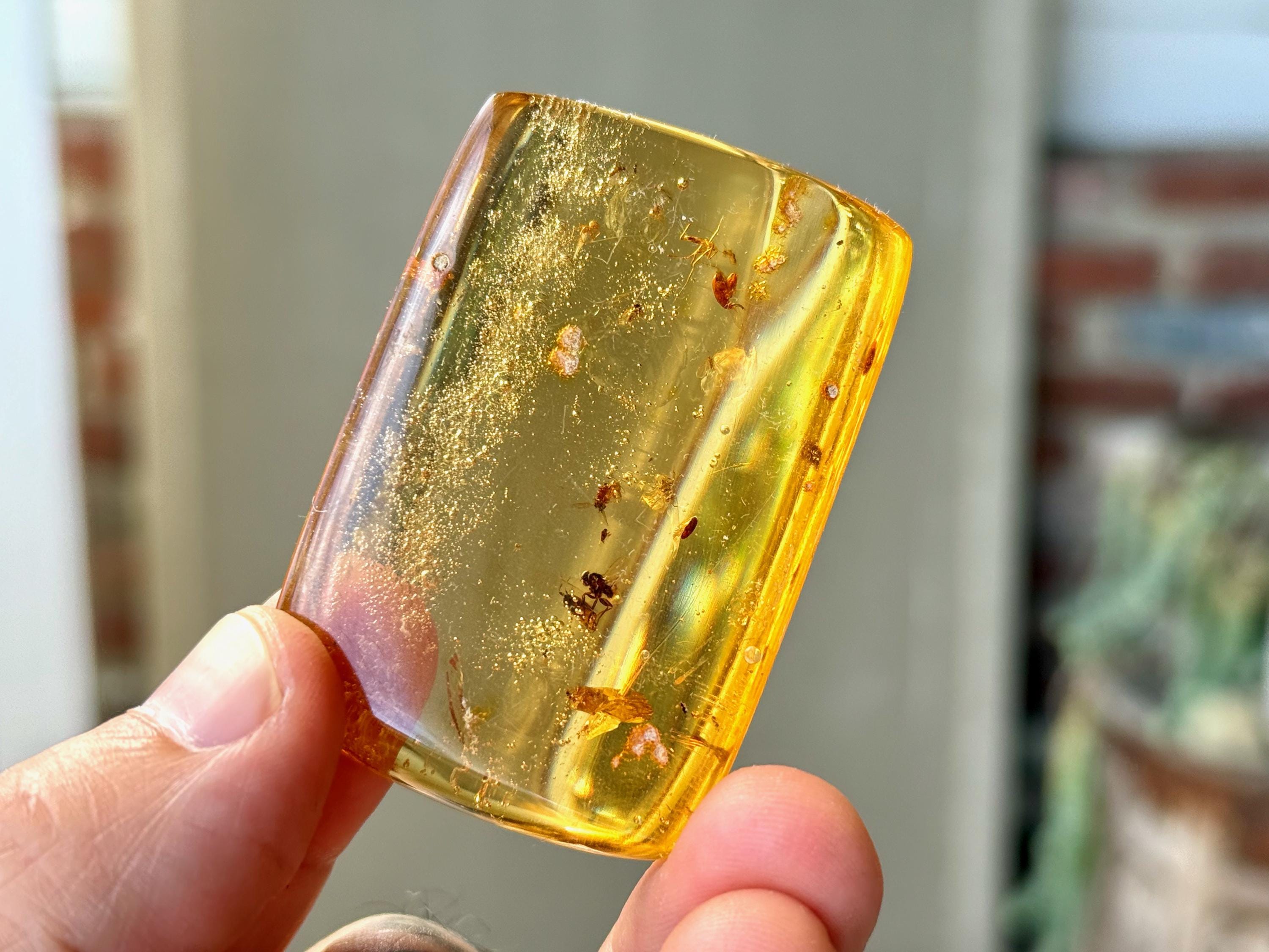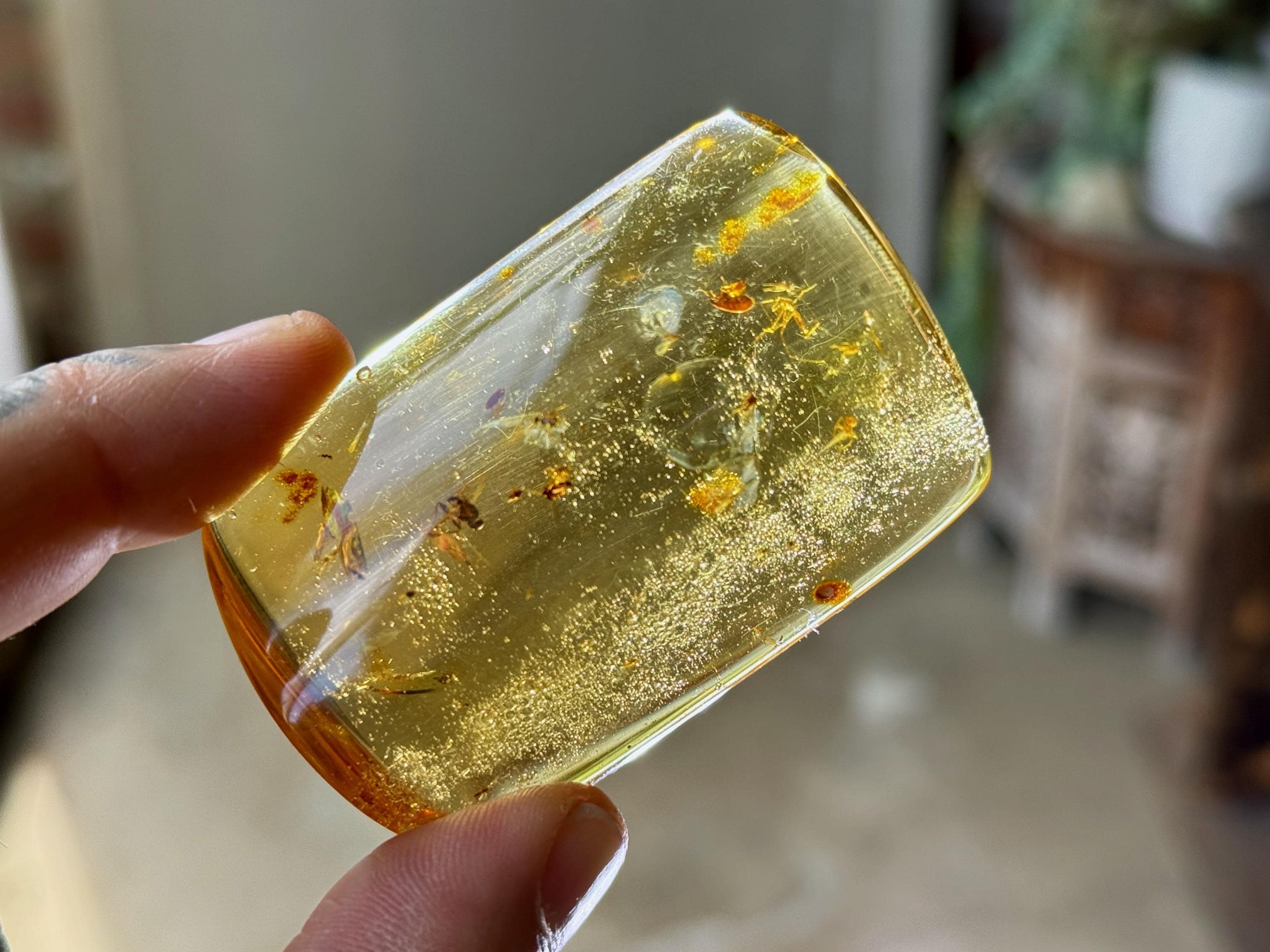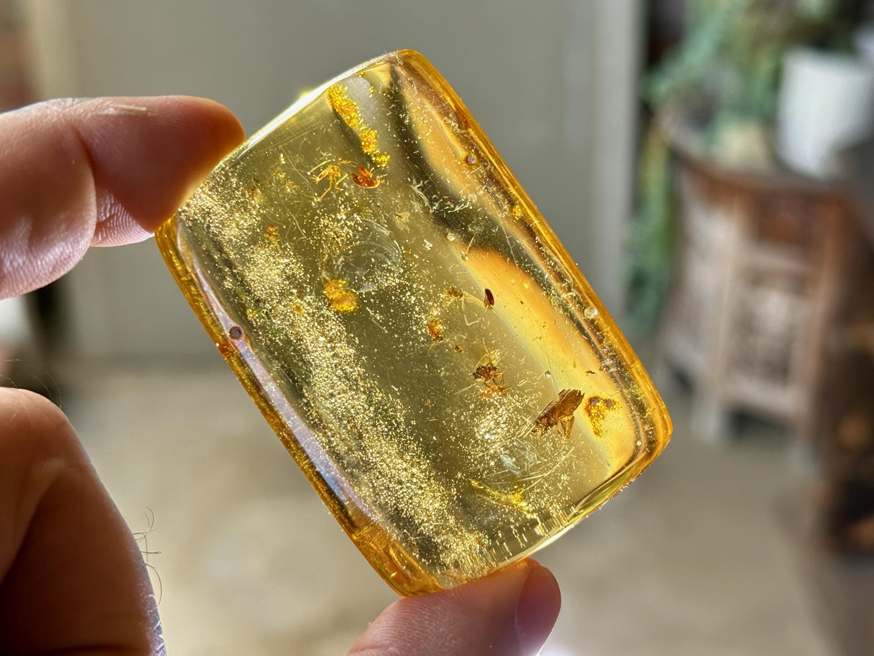 What's most special about this piece is that it contains several fully formed winged insects, fossilized within (see Photos 1, 3-6). We took these close ups with a macros lens to show off the detail, and while they can certainly be seen with the naked eye, the detail will be enjoyed more with a jeweler's loupe or magnifying glass.