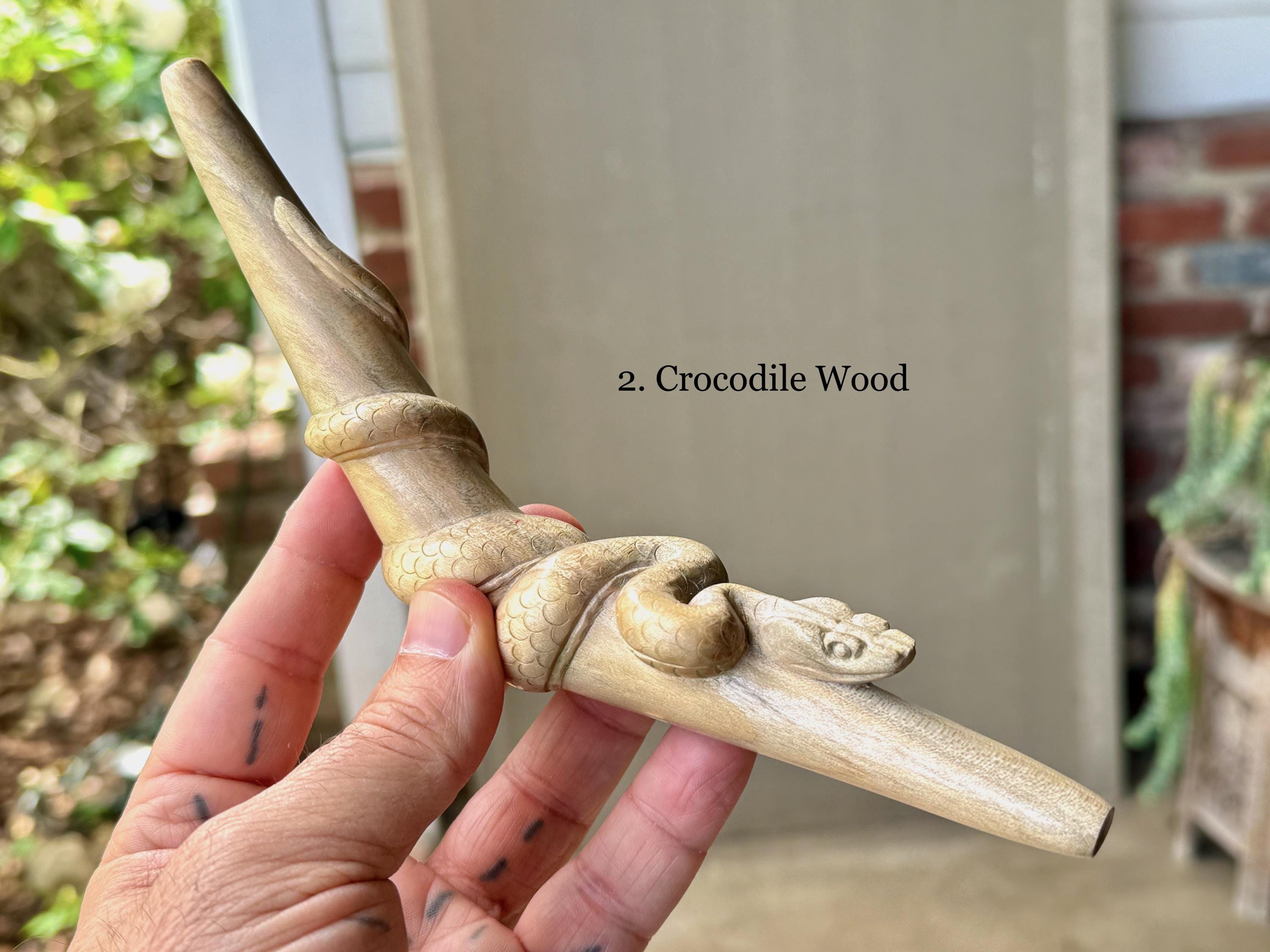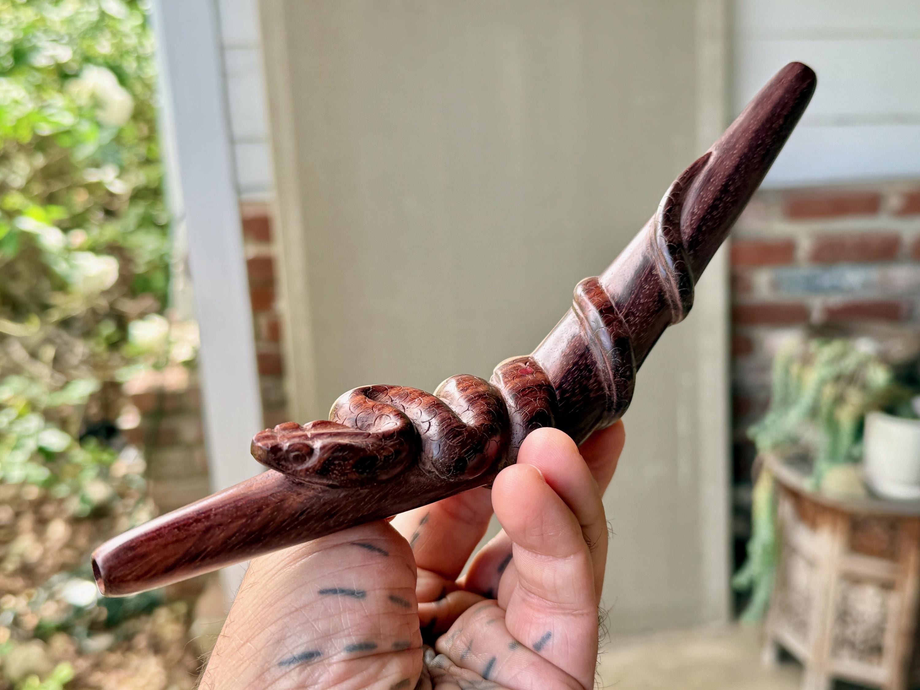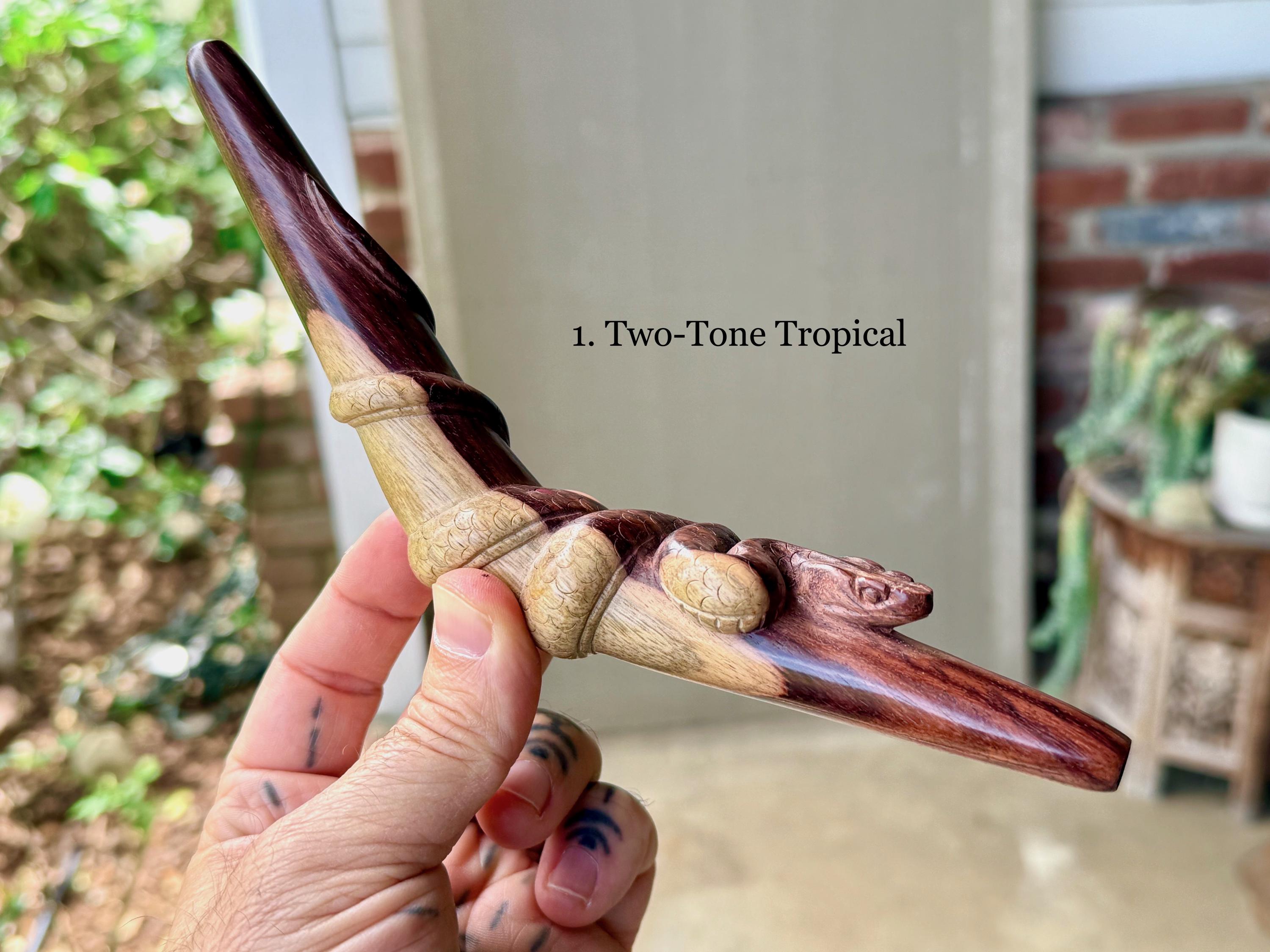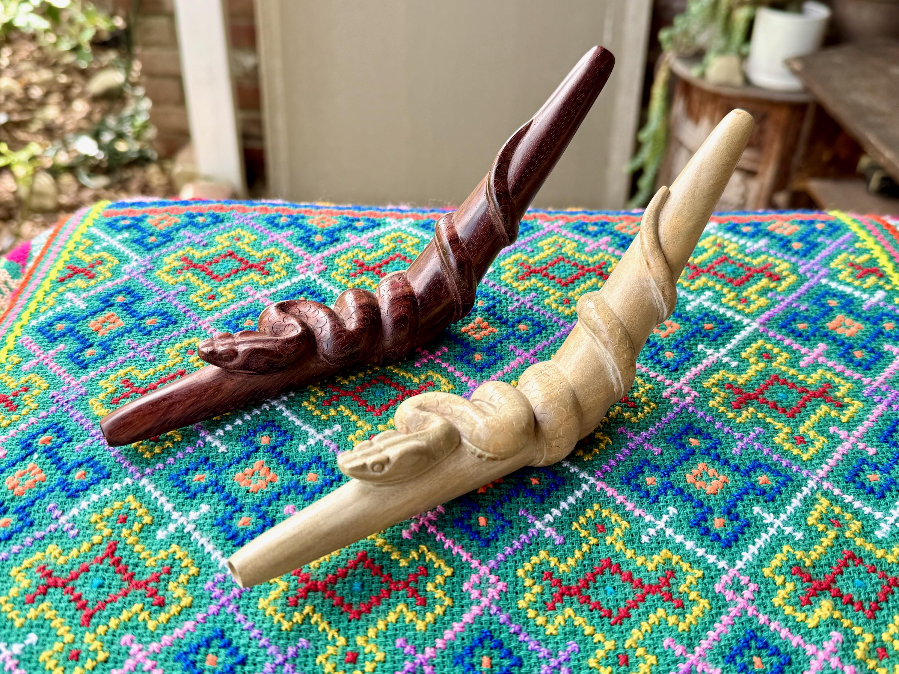 These Snake Tepi Pipes are hand-carved from solid, indigenous hardwoods in two different options: Crocodile Wood or Two-Tone Tropical. Simply choose your preference from the dropdown menu.