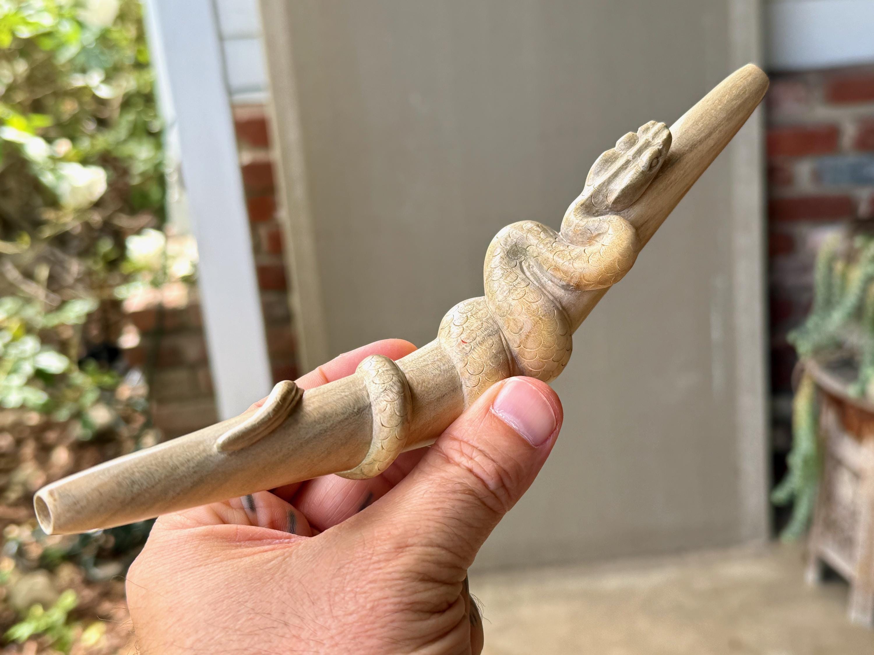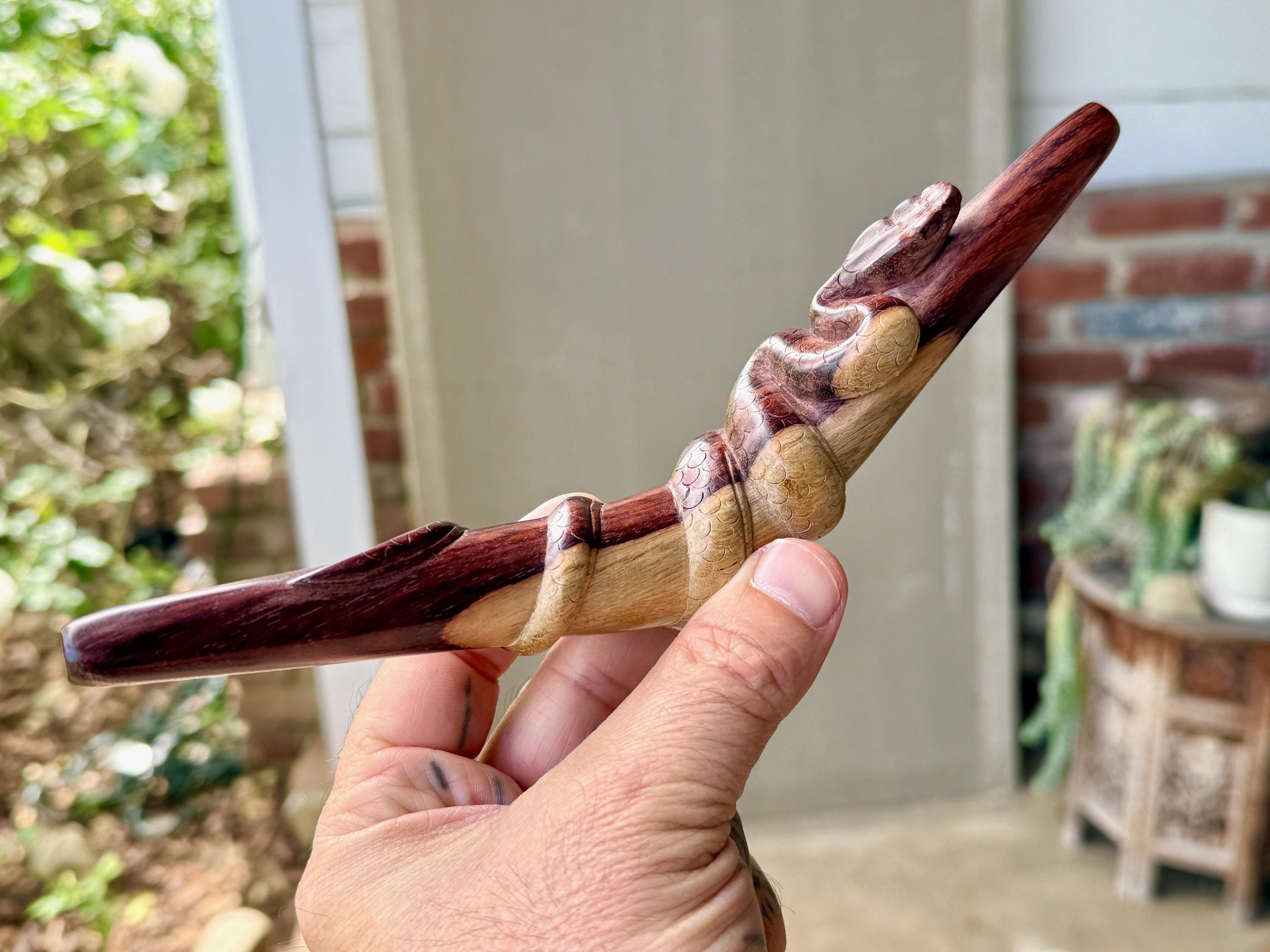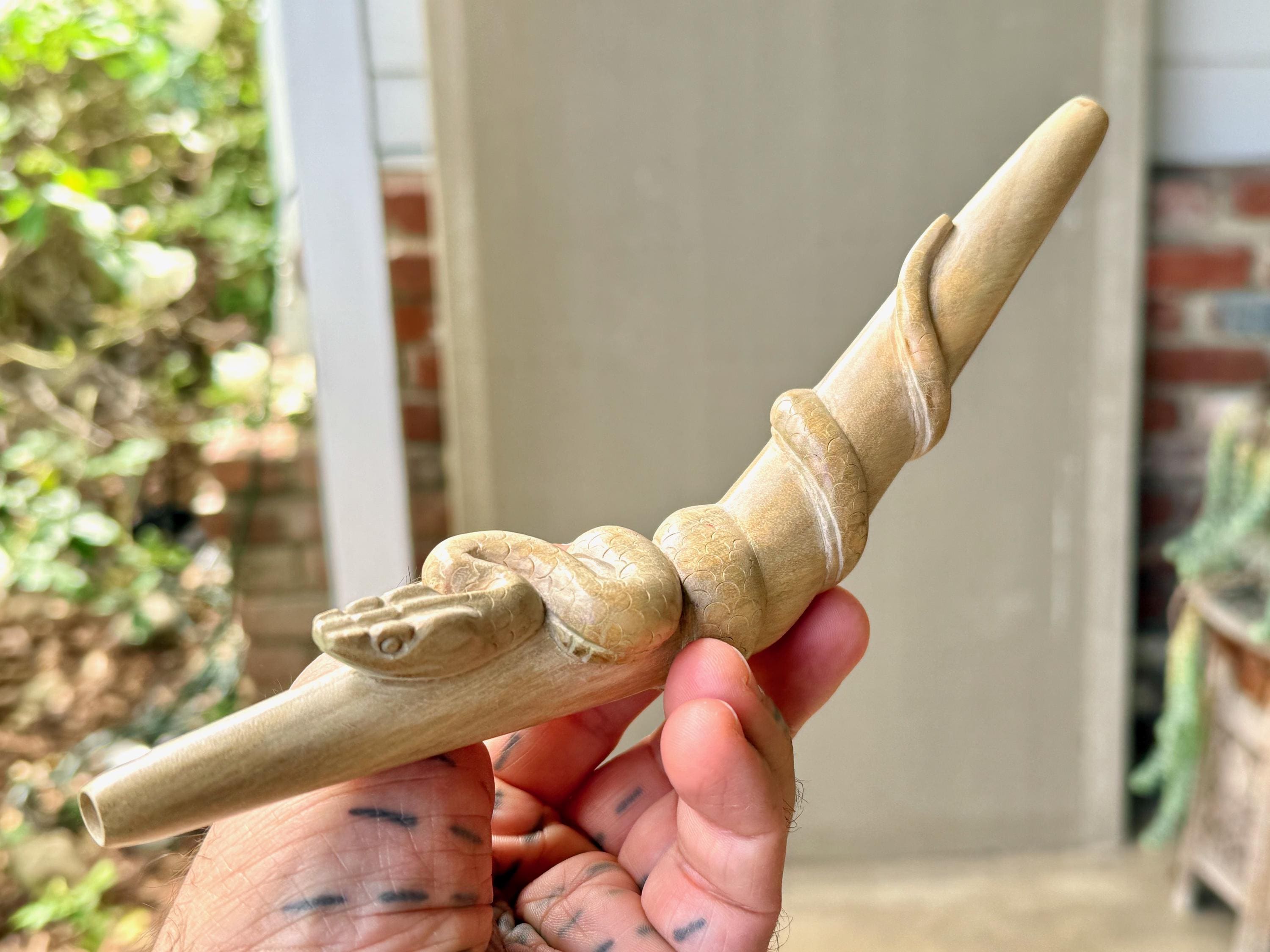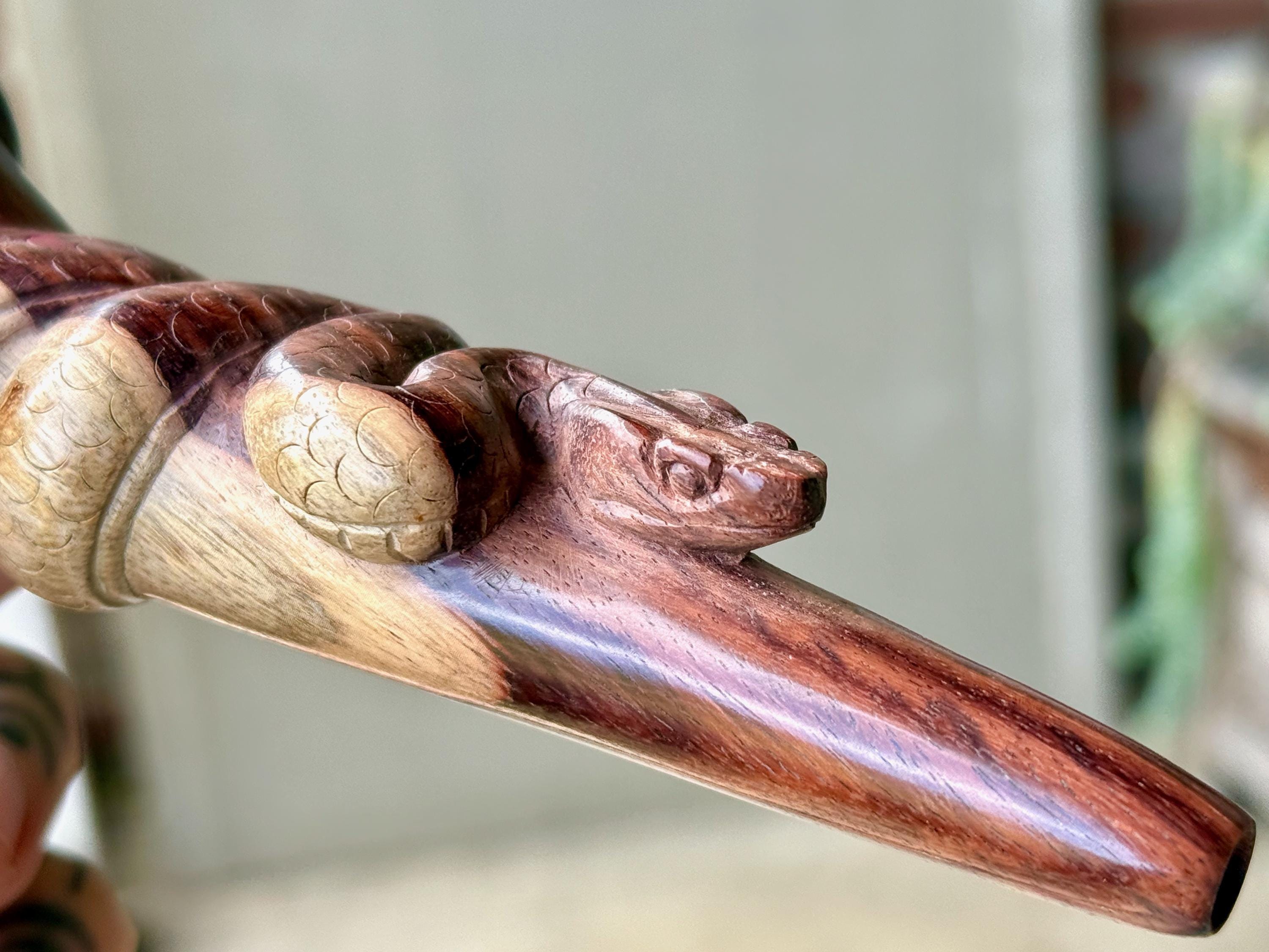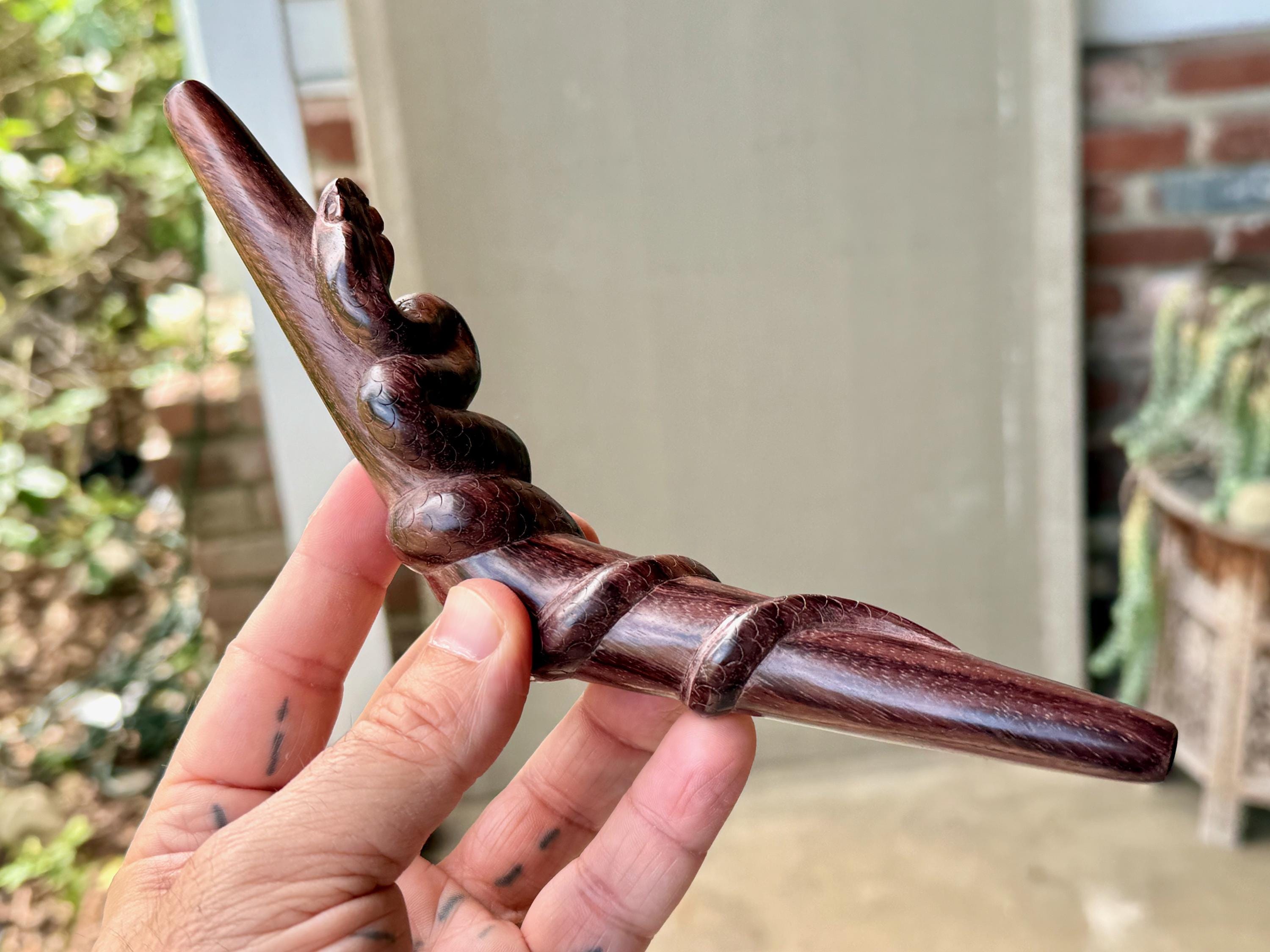 These Snake Tepi Pipes are hand-carved from solid, indigenous hardwoods in two different options: Crocodile Wood or Two-Tone Tropical. Simply choose your preference from the dropdown menu.