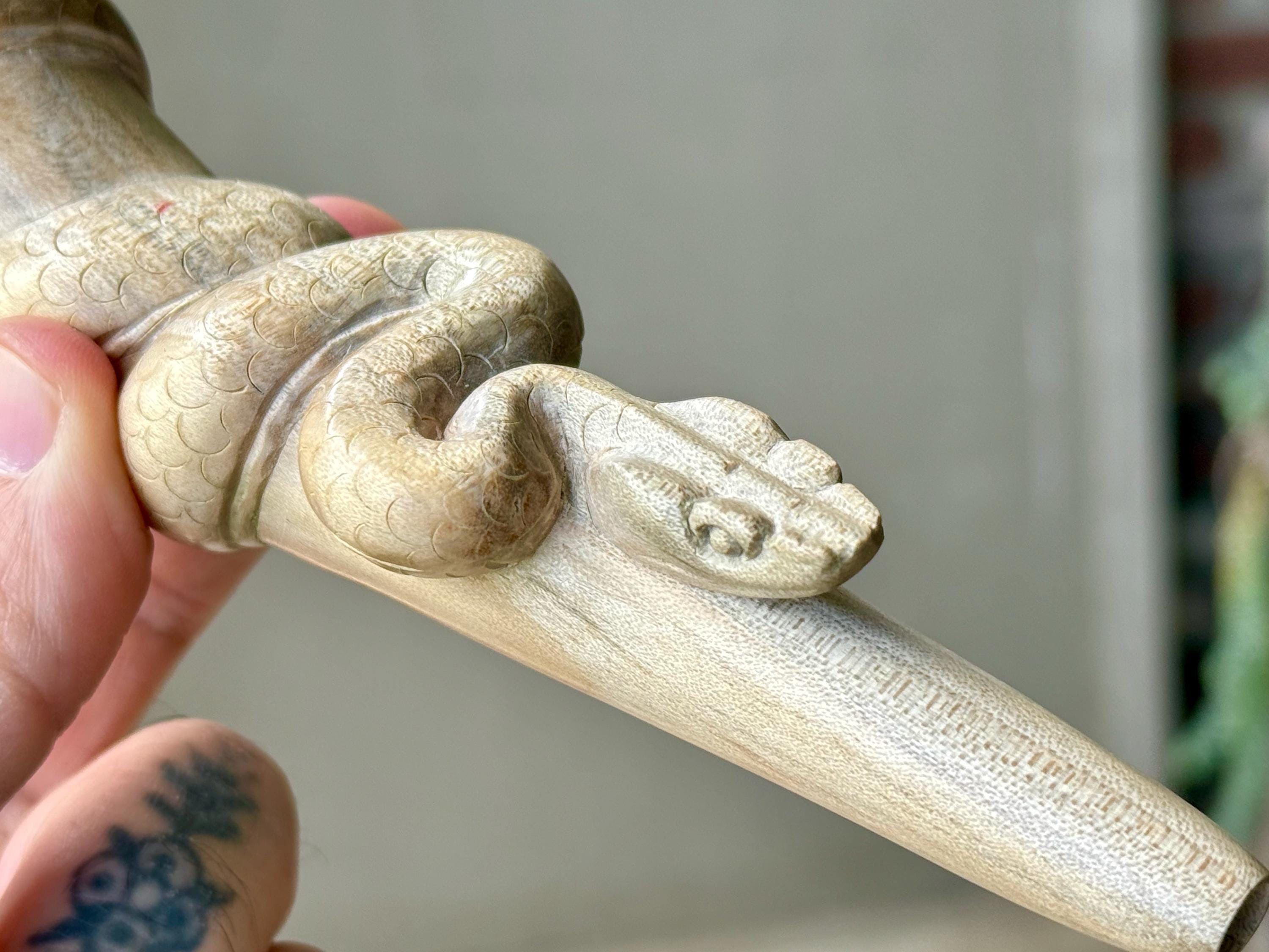 One of our favorite tepi designs because of its simple elegance, and also because it features the Serpent! Beautiful lines and lovely detail to these powerful medicine tools carved from solid, native hardwoods.