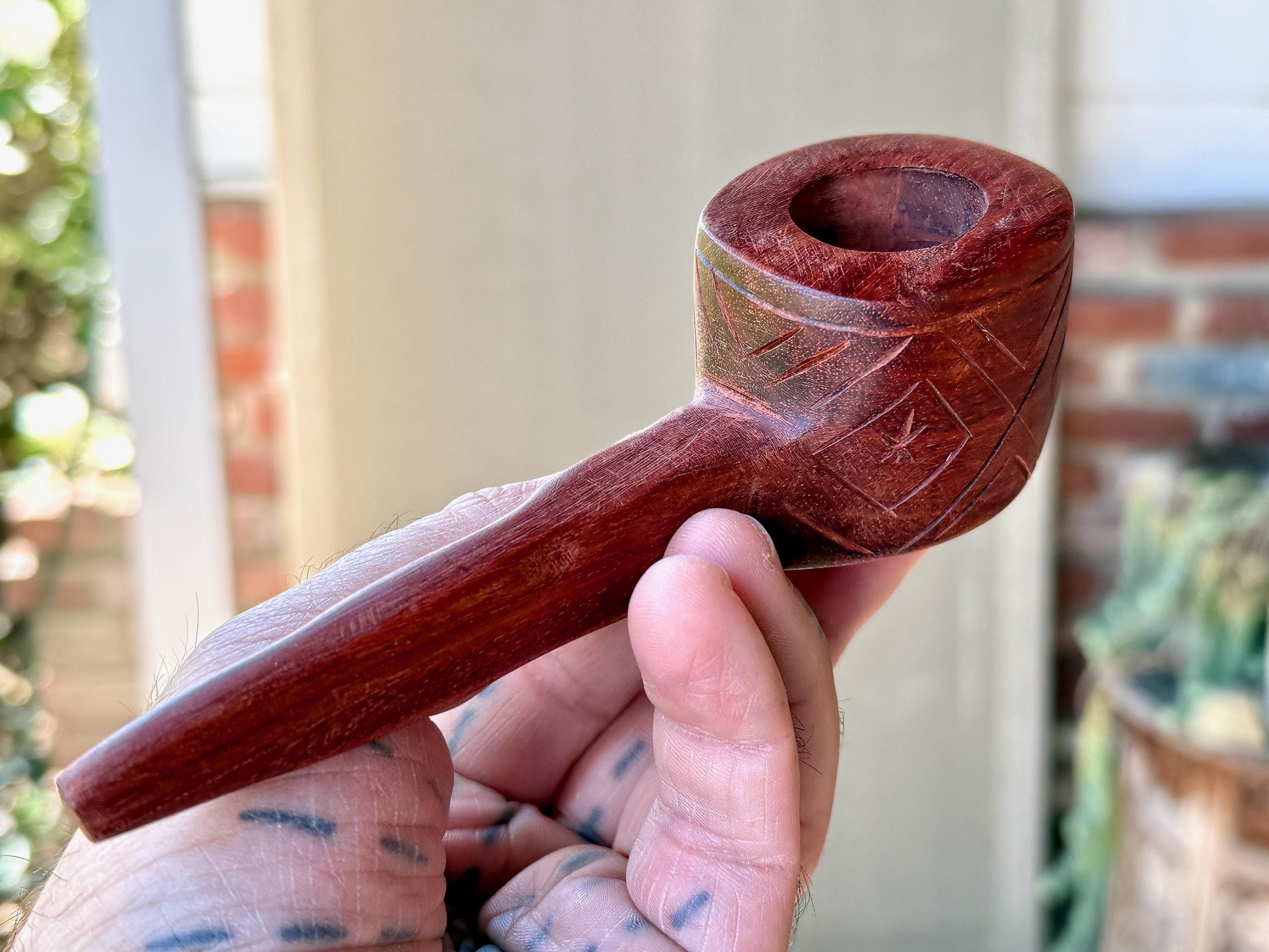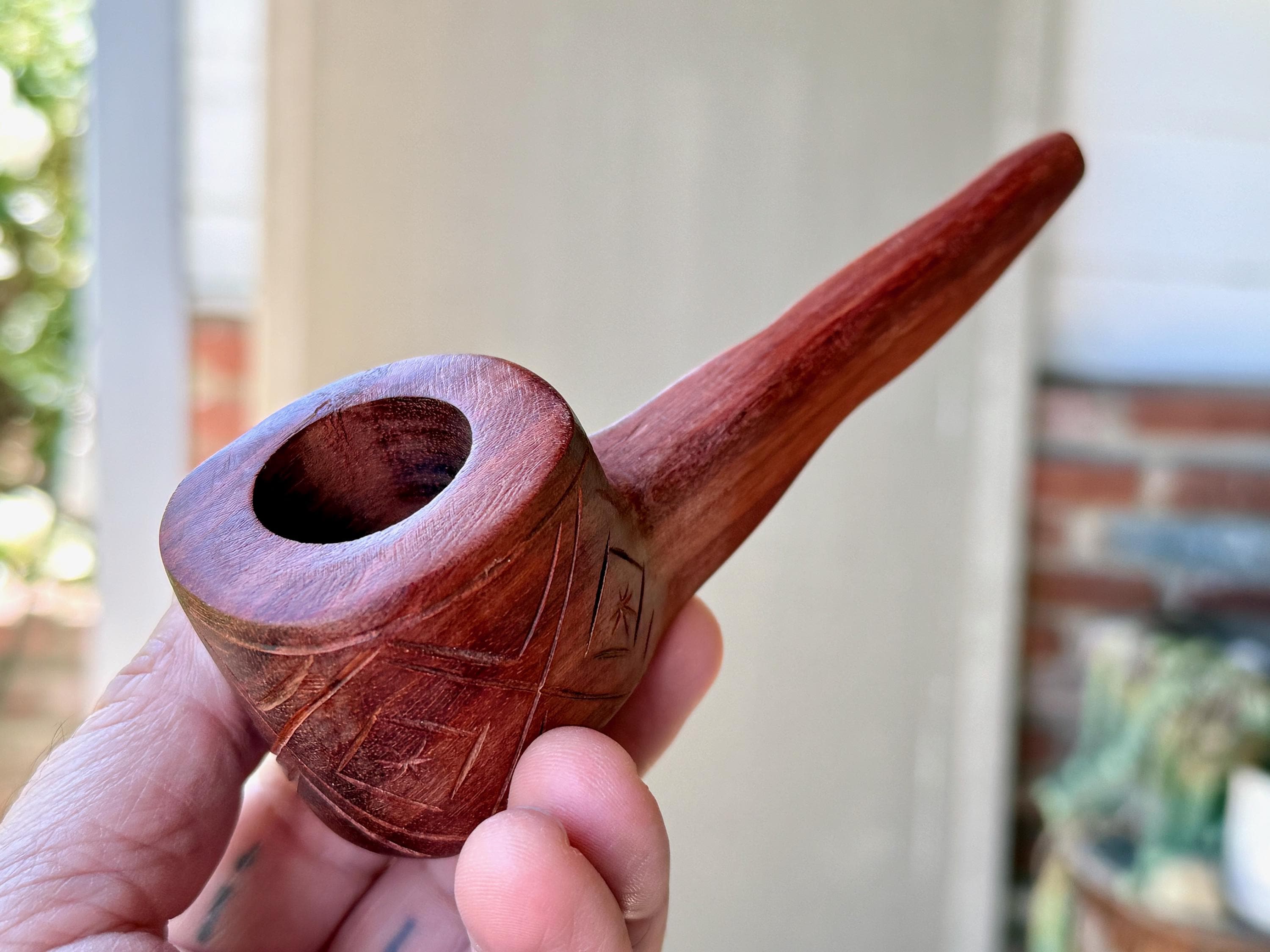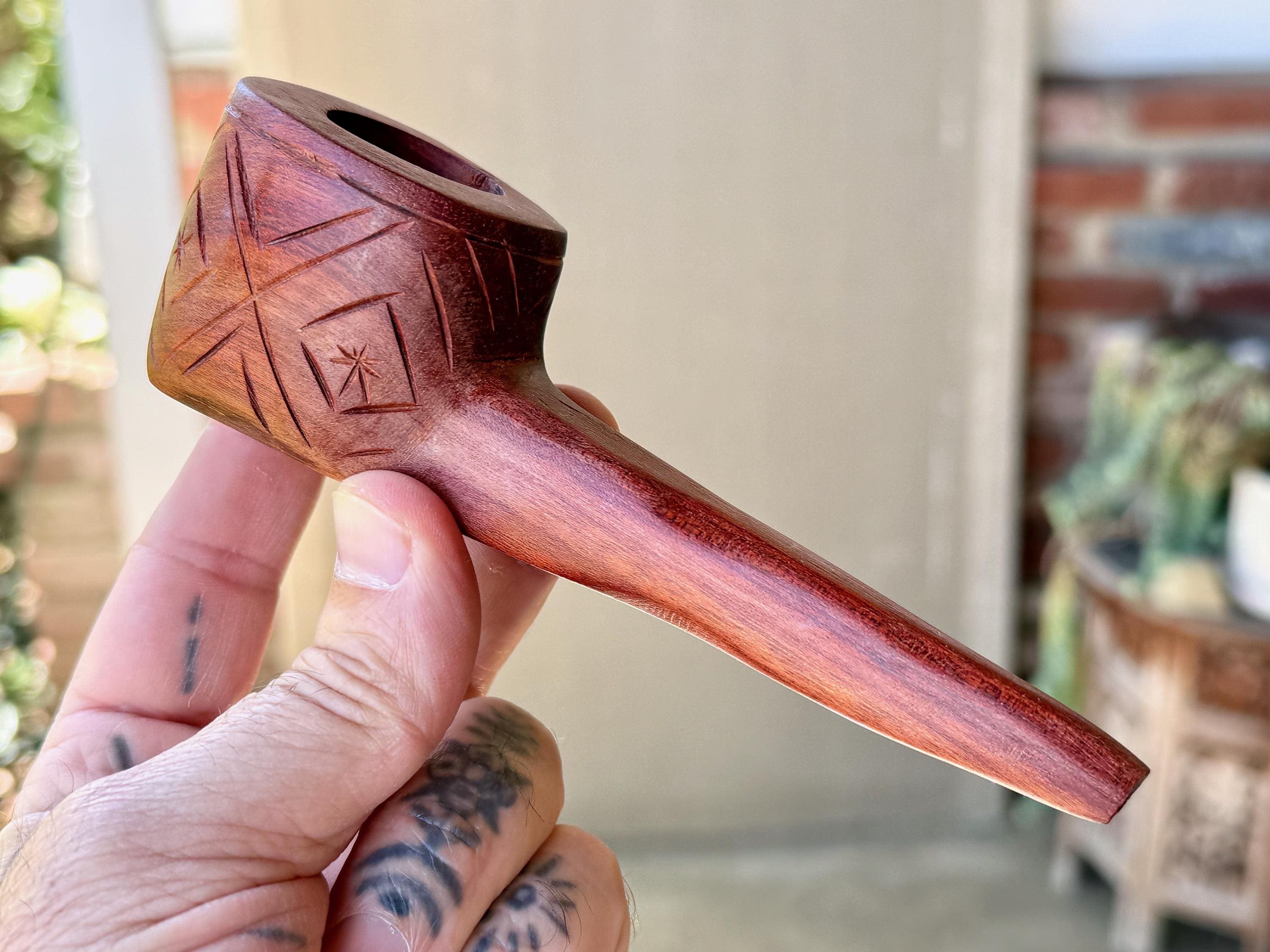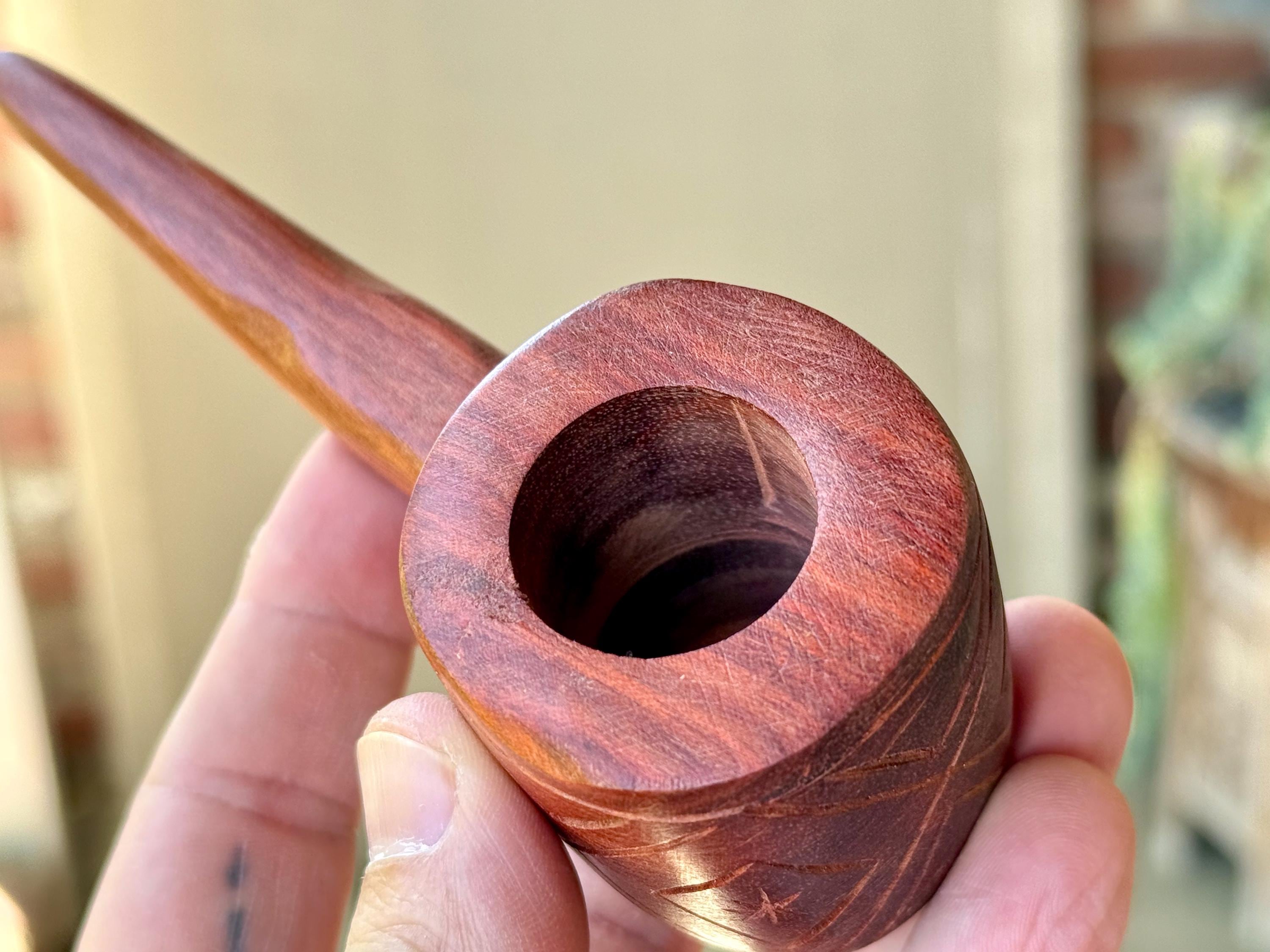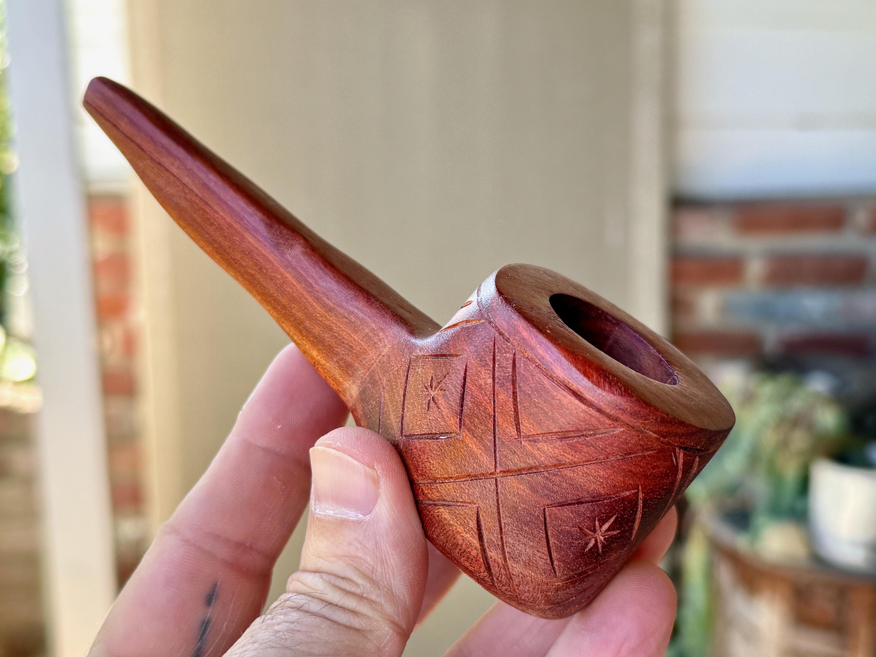 Here the artist uses Palo Sangre ("Blood Wood") for his creation, a strong hardwood with a rich reddish-brown hue, indigenous to the Amazon and areas of Central and South America. This pipe is carved from a single piece of this wood and is weighty and well-crafted. A powerful and beautiful medicine tool for ceremony.