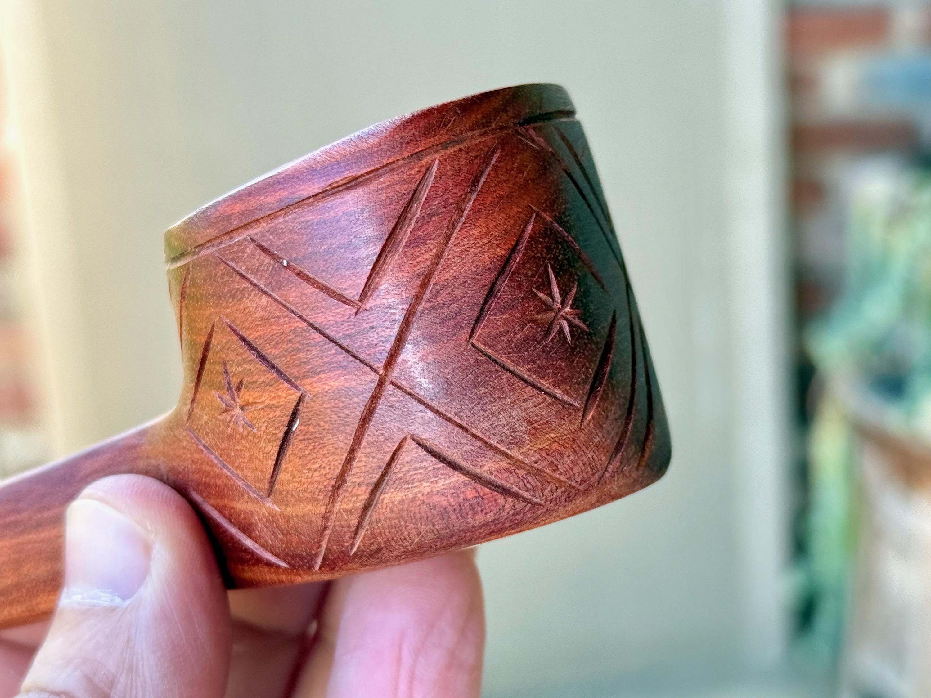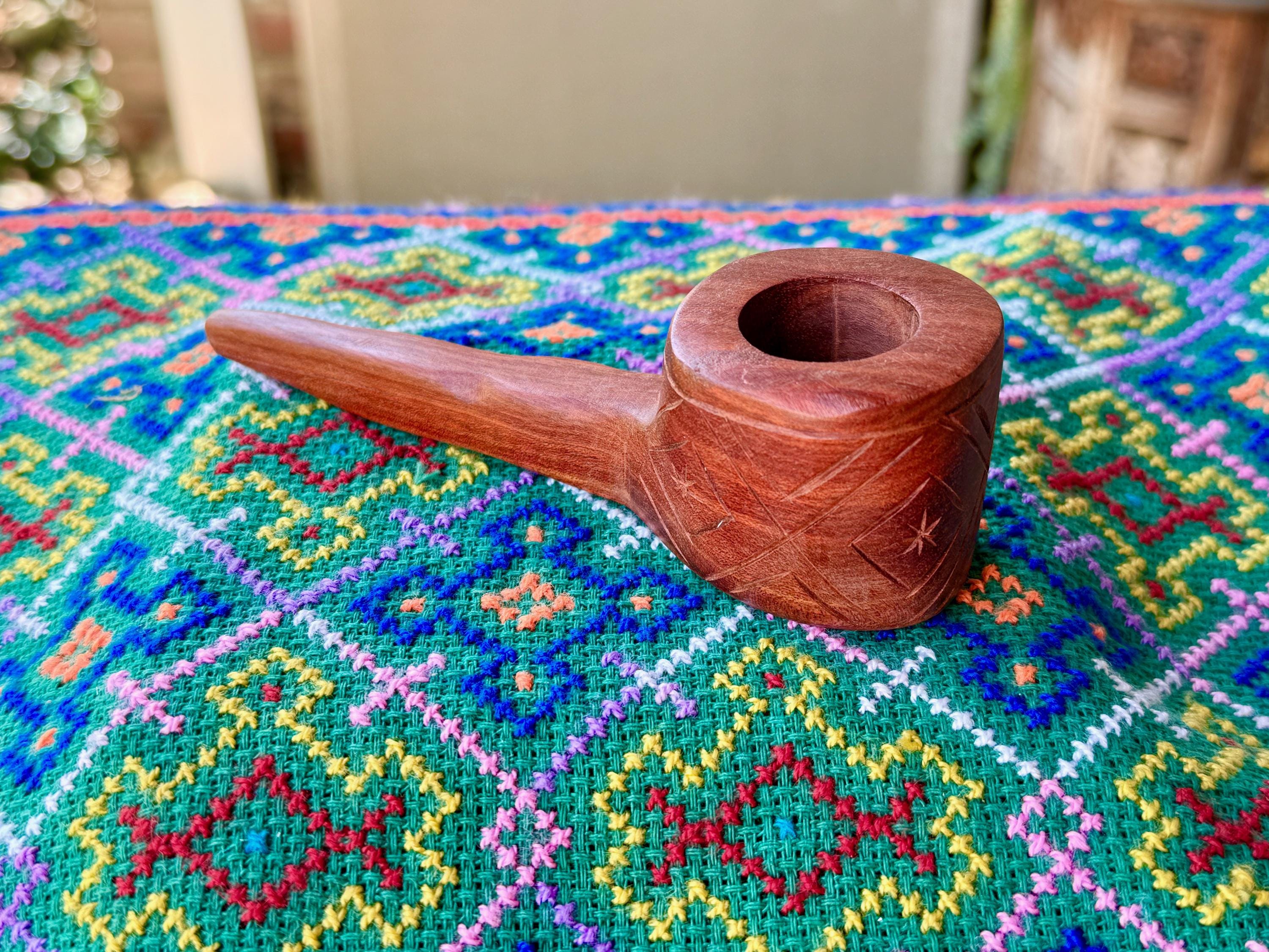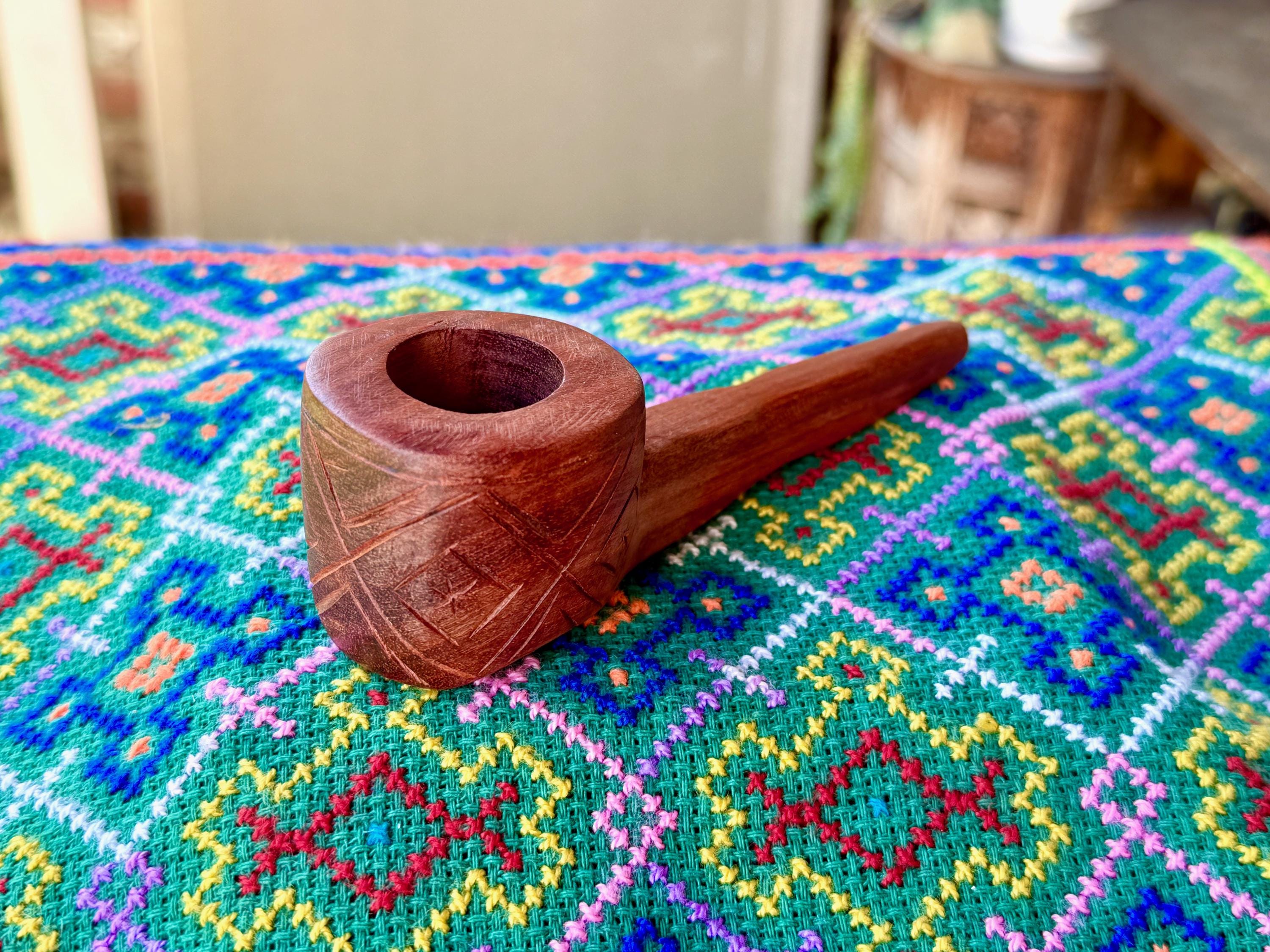 His pipes range from basic and traditional, to those depicting wondrous animals and unique characters, with such attention to detail. Each pipe is hand-carved from indigenous Amazonian wood and intended for use in shamanic ceremony.