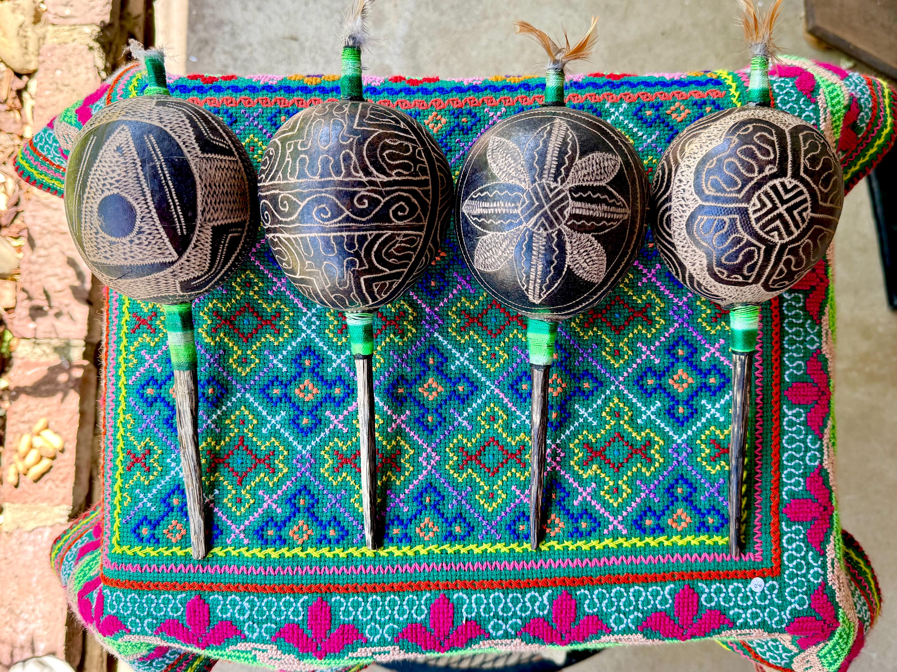 These traditional Shipibo Rattles come from our artisans in Pucallpa, in the Peruvian Amazon. These rattles are a key element in both core shamanism as well as in Peruvian Shamanism and in plant medicine ceremonies.