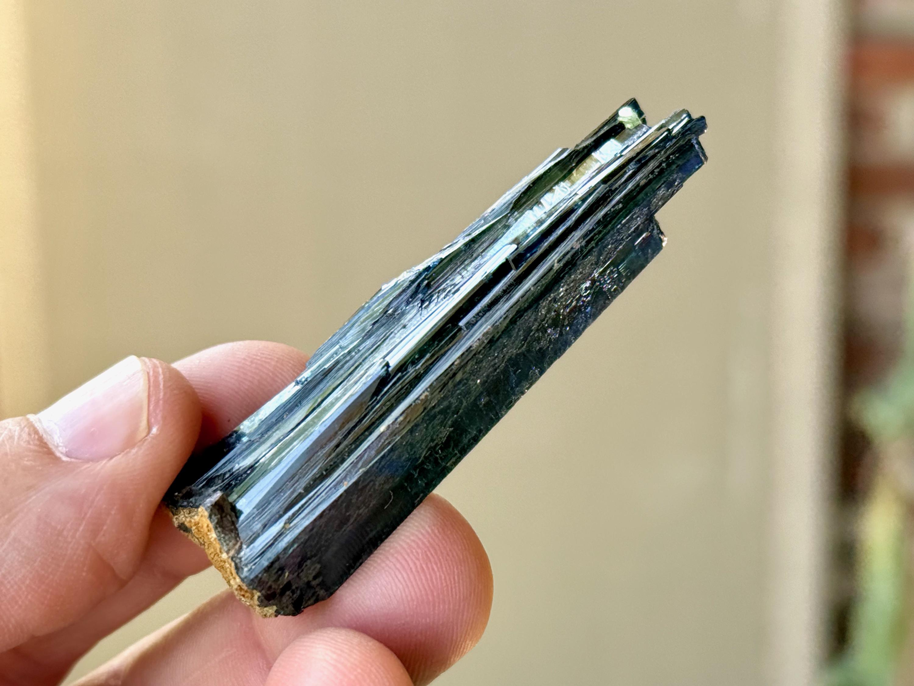 A darkly lustrous complexion to this Vivianite crystal in a natural, elongated "fan" formation. This crystal is entirely Vivianite with just a small amount of matrix on the very bottom.