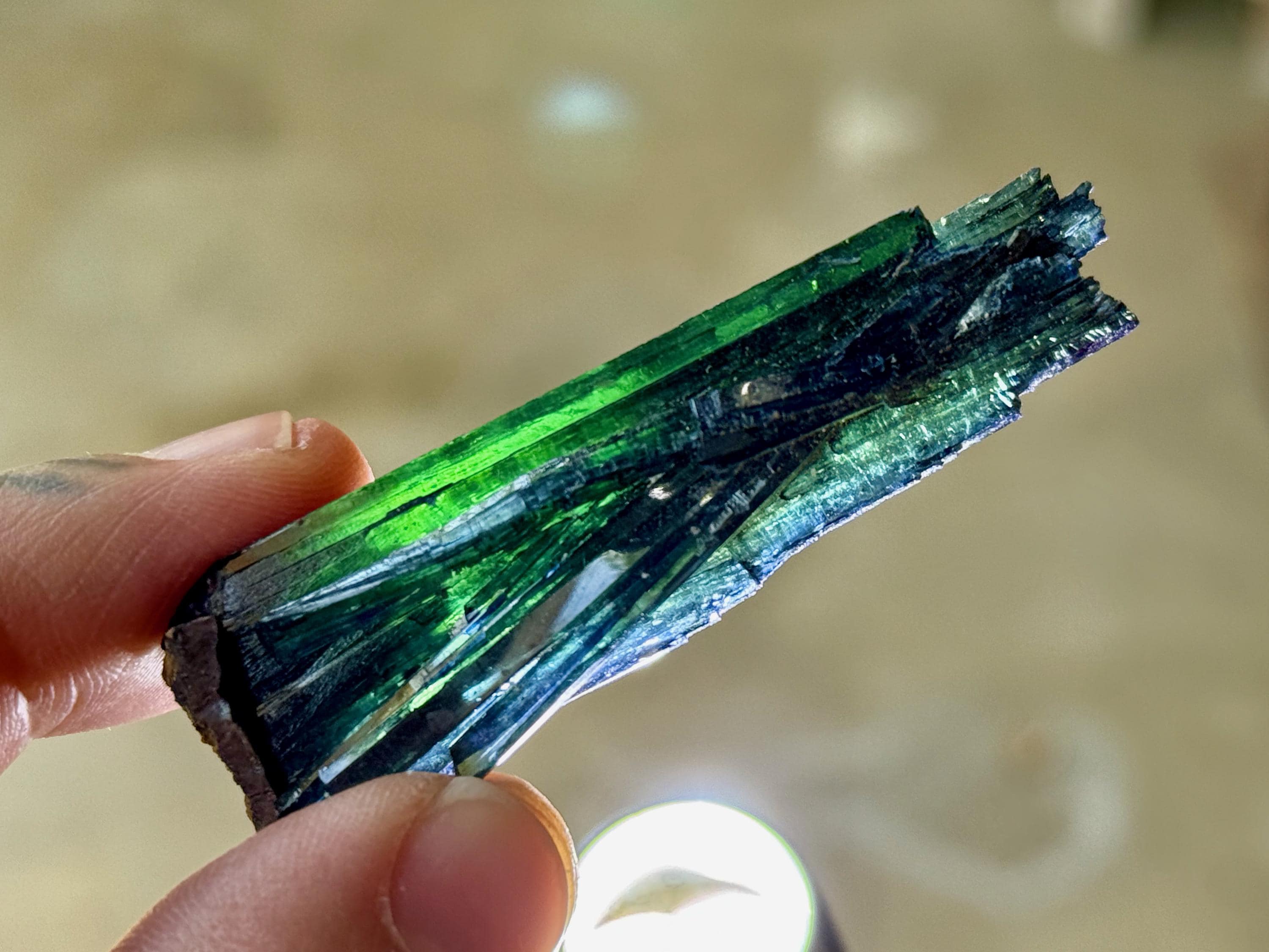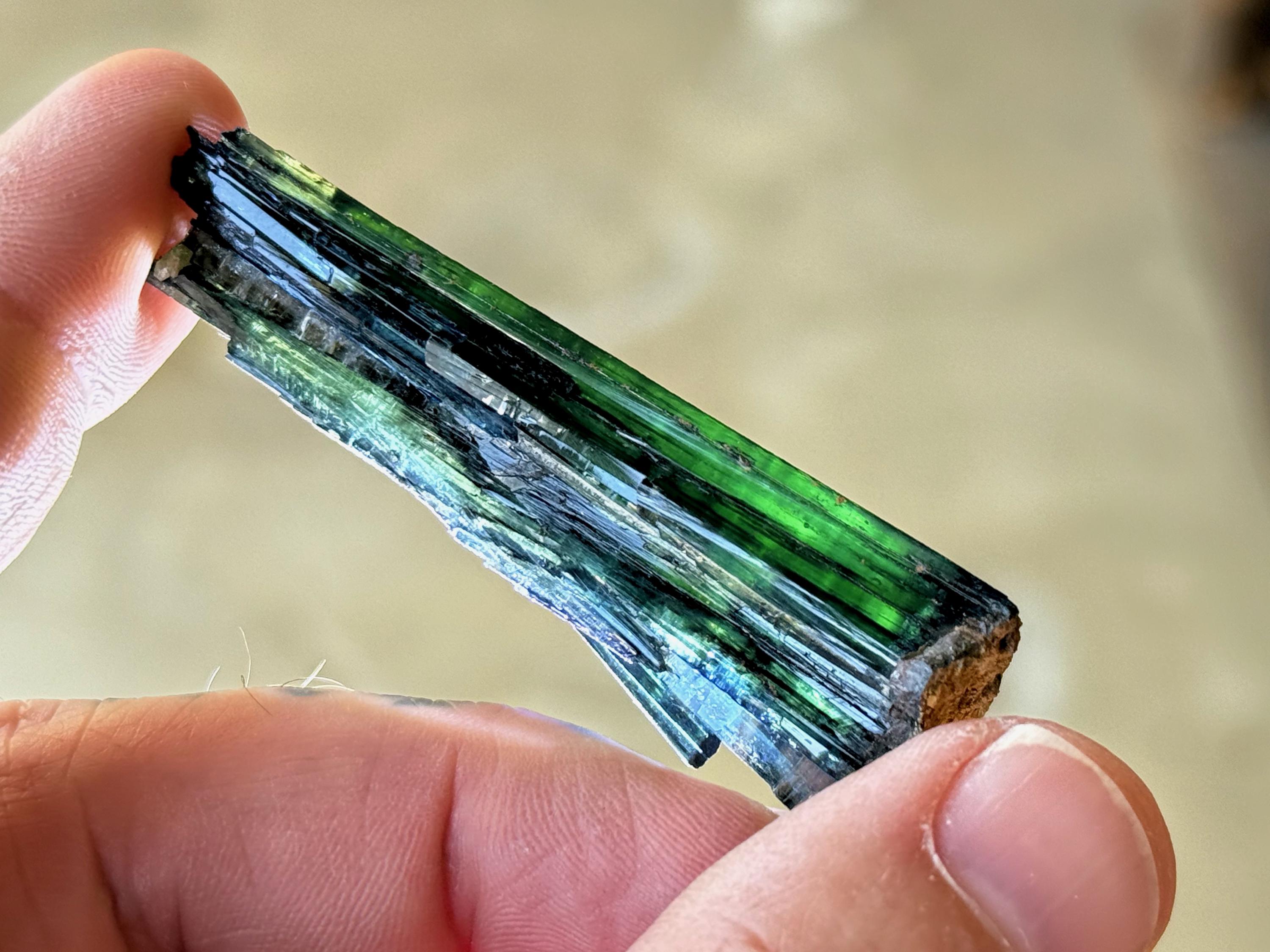 This crystal has outstanding translucency, and when backlit, we can see it light up with brilliant green colors and tinges of blue around the edges (Photos 1, 3-6). Exquisite!