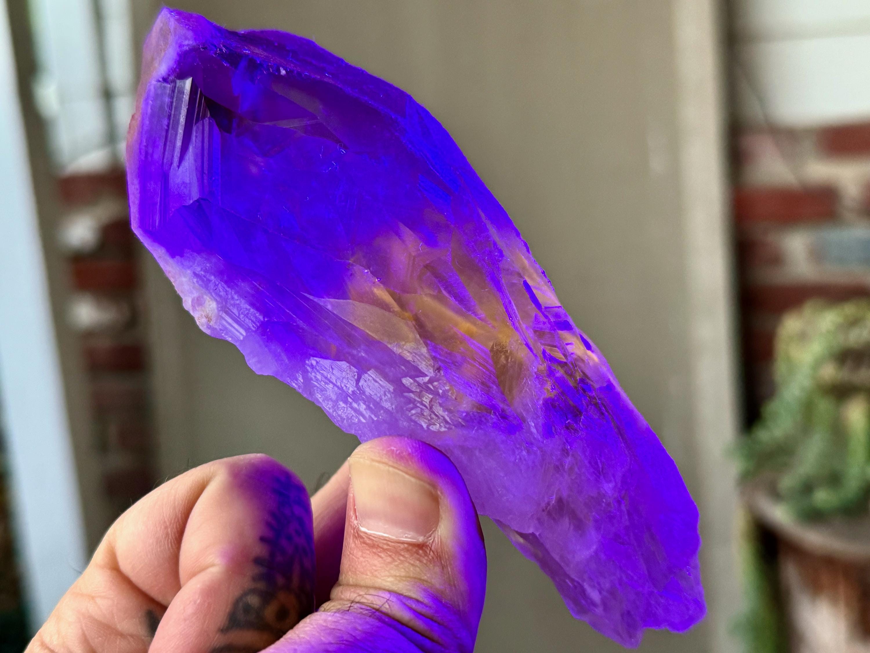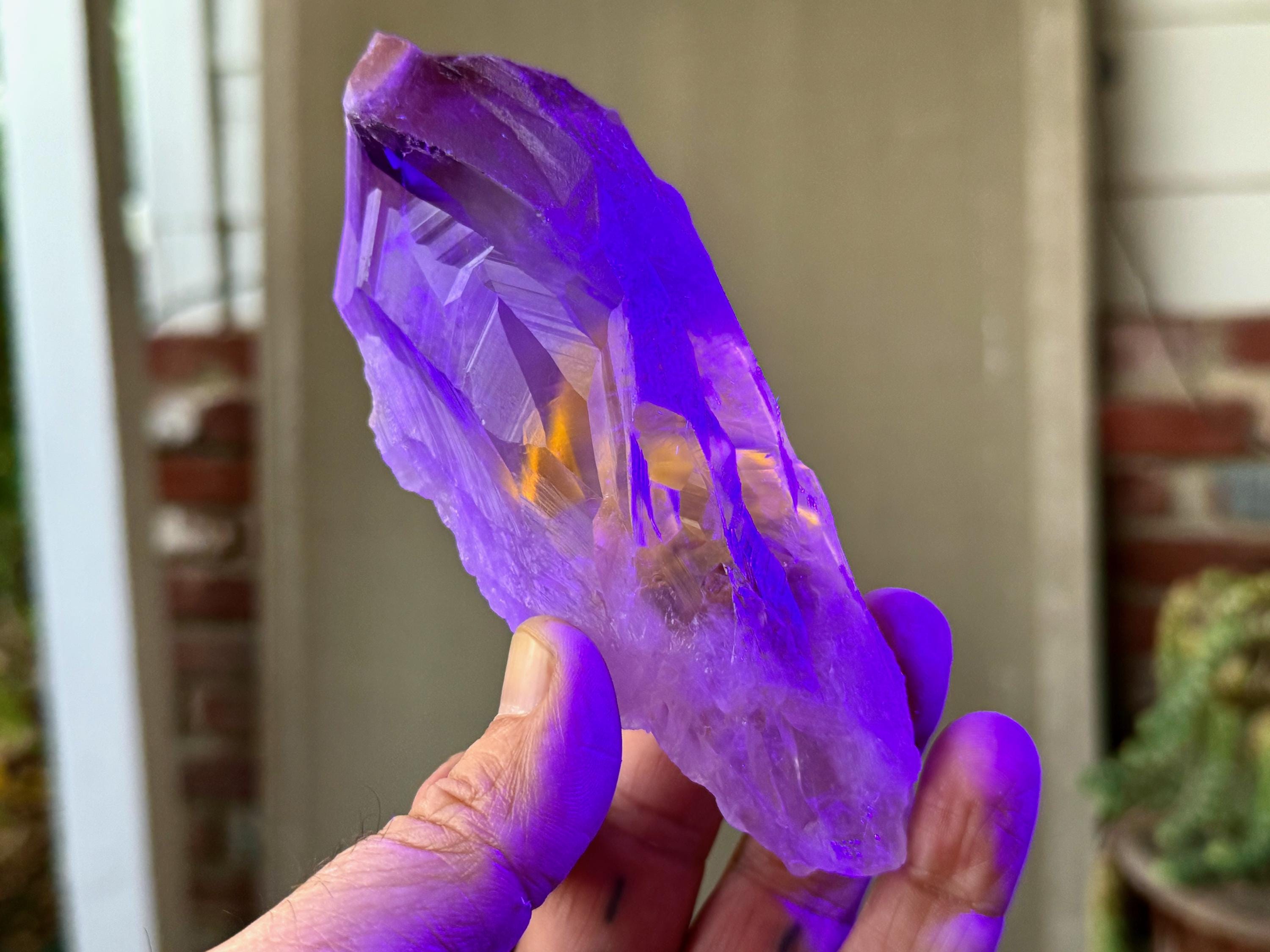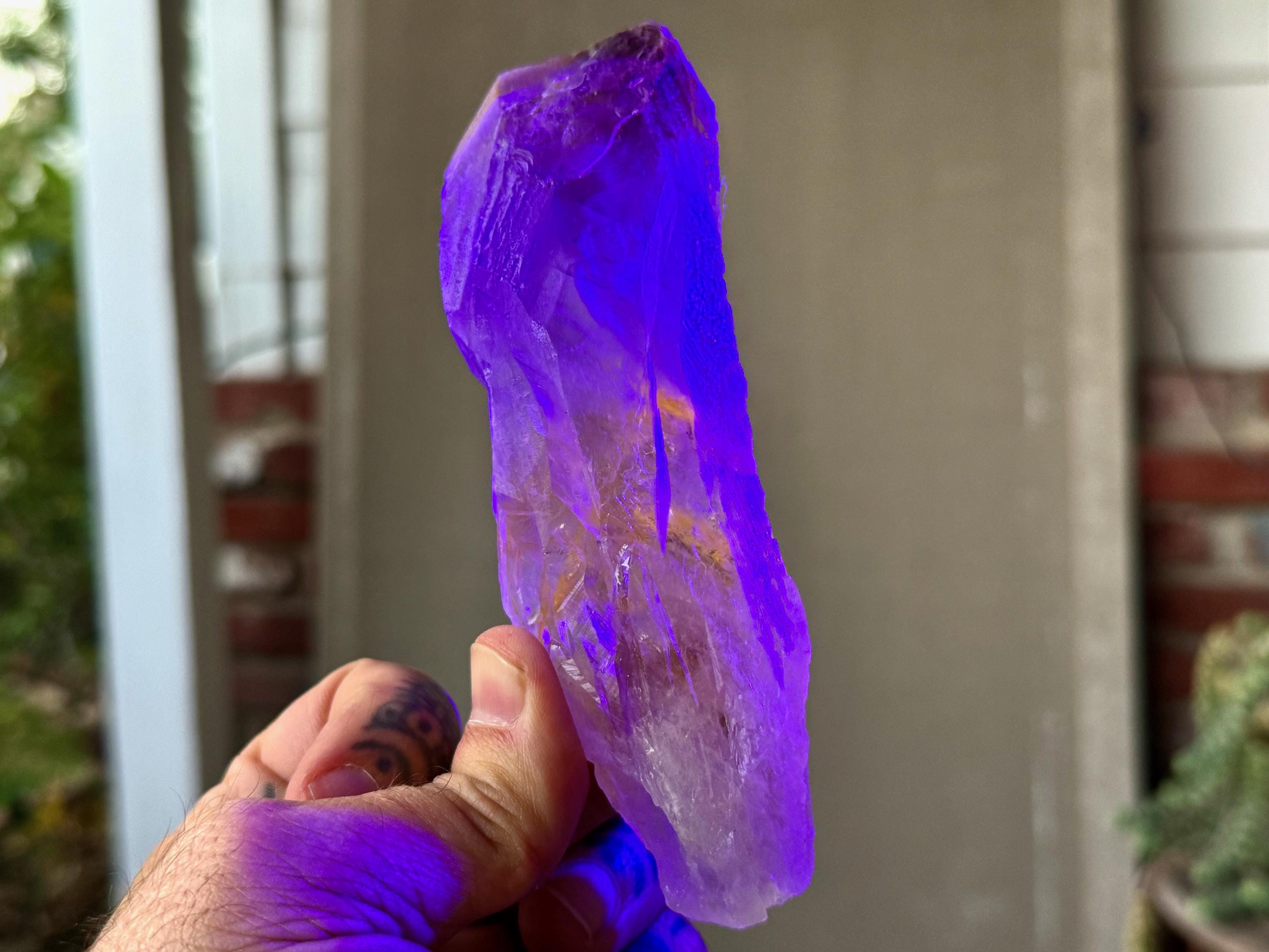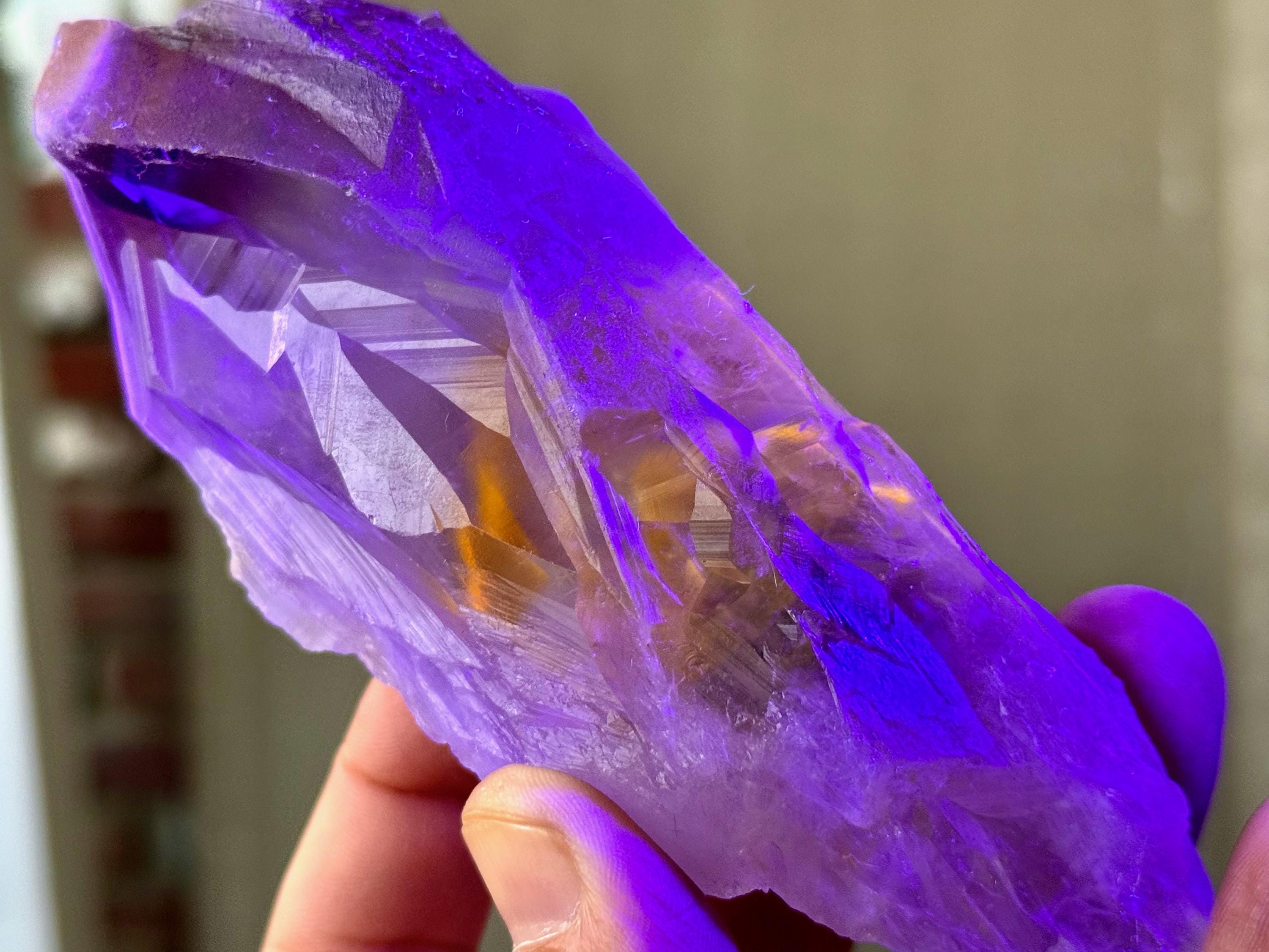 **Please note, the inclusions in this crystal are all natural/untreated. A UV light is necessary to see the phantoms glow, and they can be found affordably at Amazon or any other online outlet. Also, please note that the dark purple hues in the UV-lit photos are a result of the UV light itself and not the color of the crystal. The natural color is shown in the natural-light photos included in this listing.