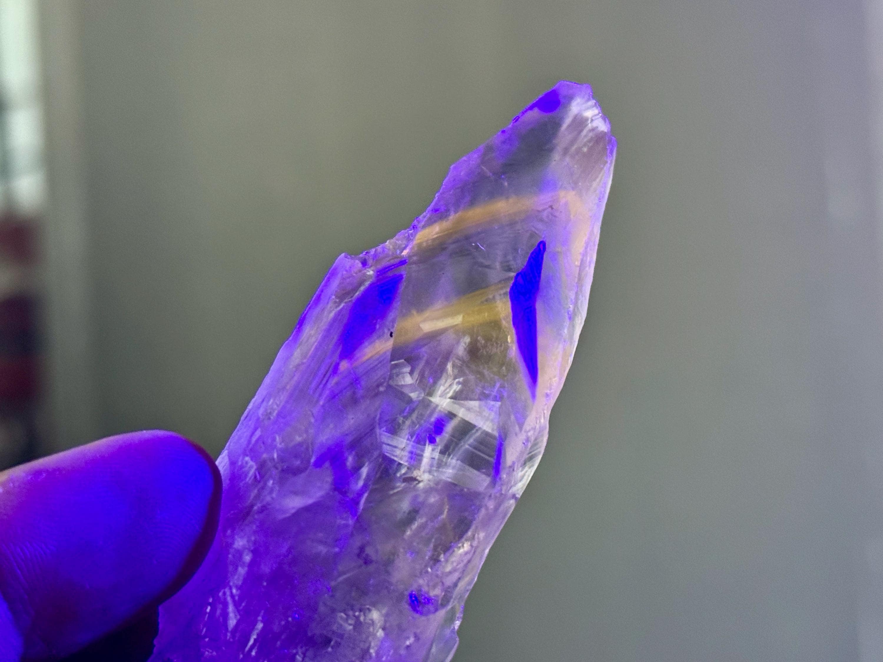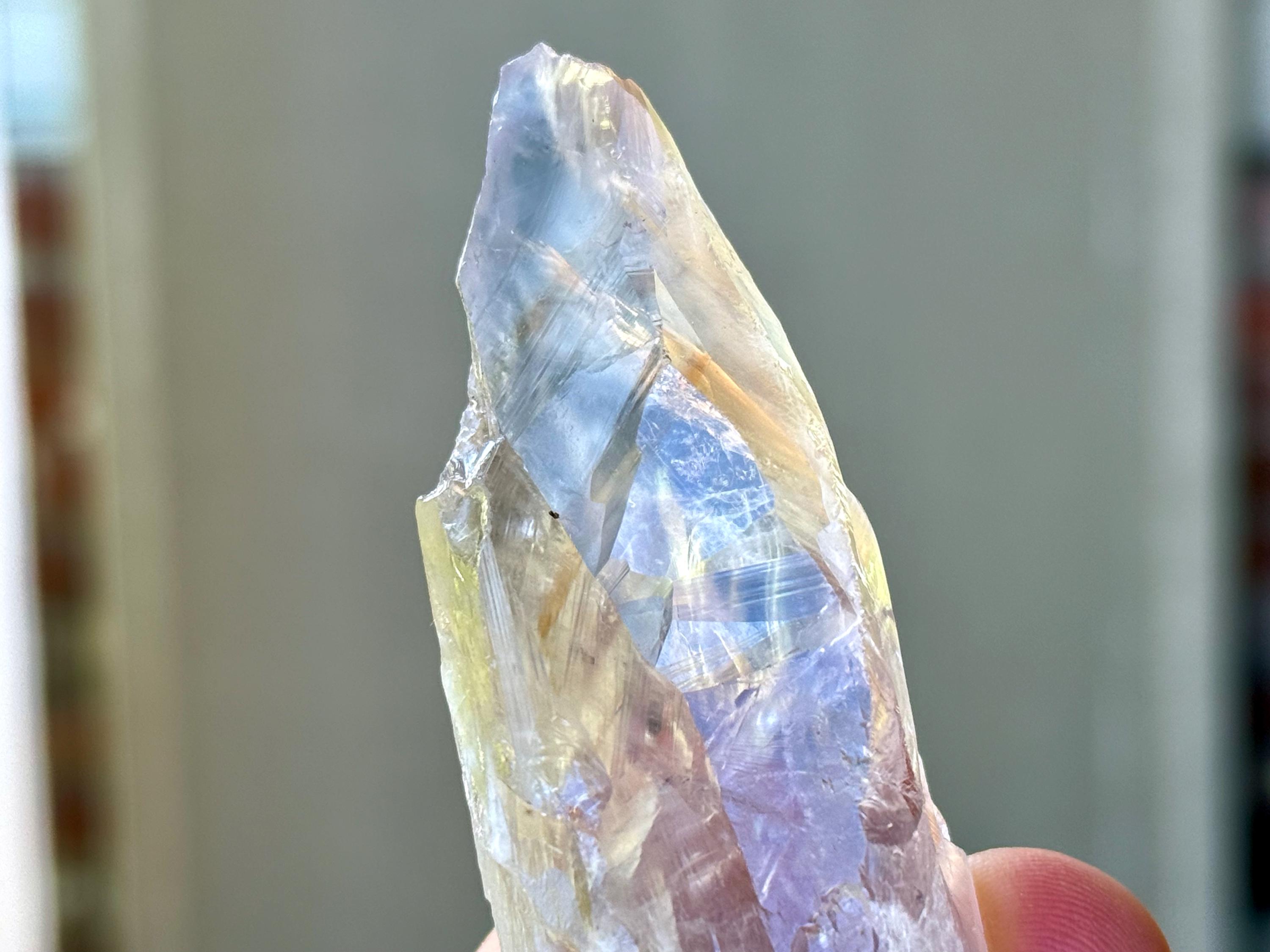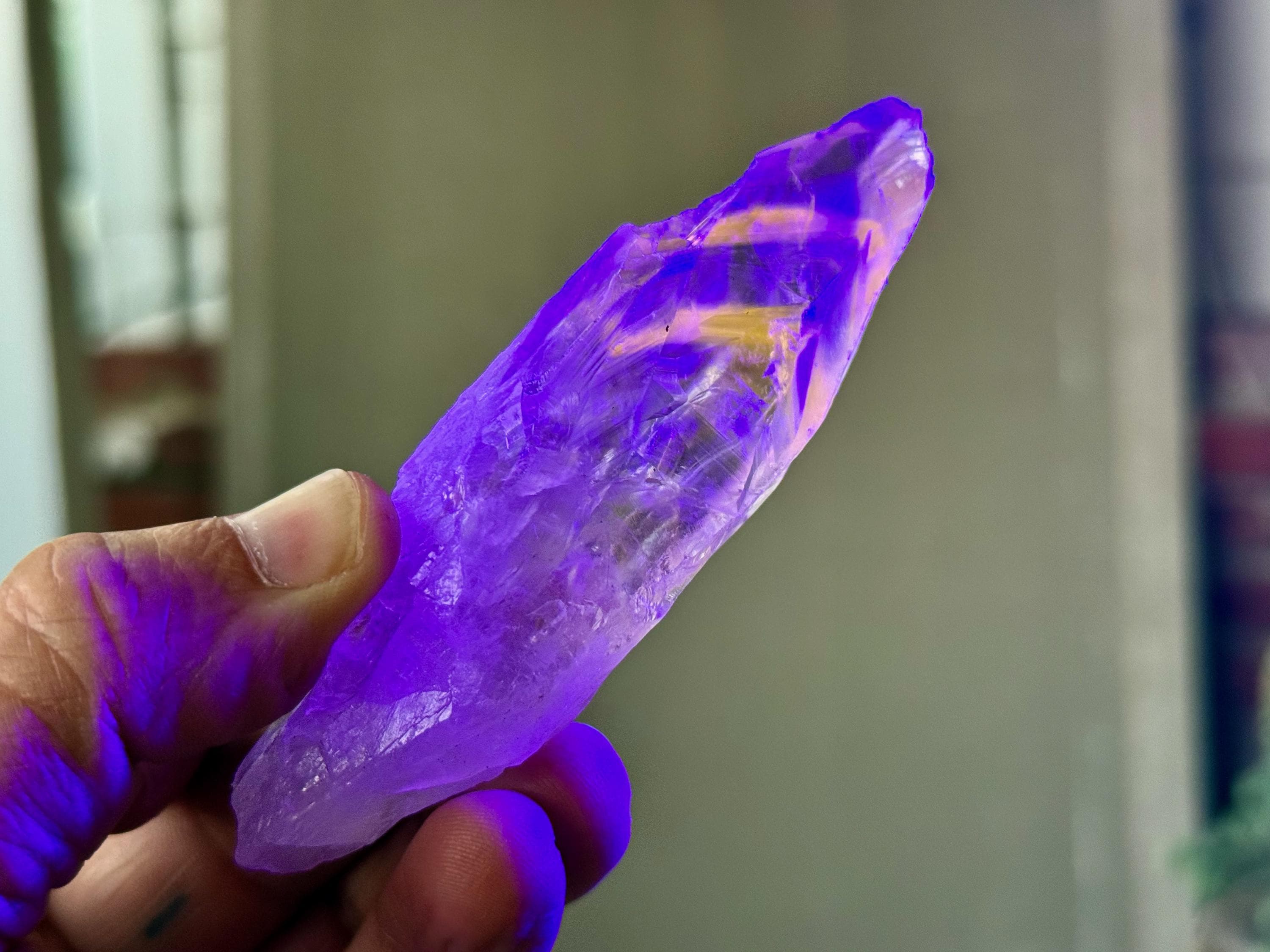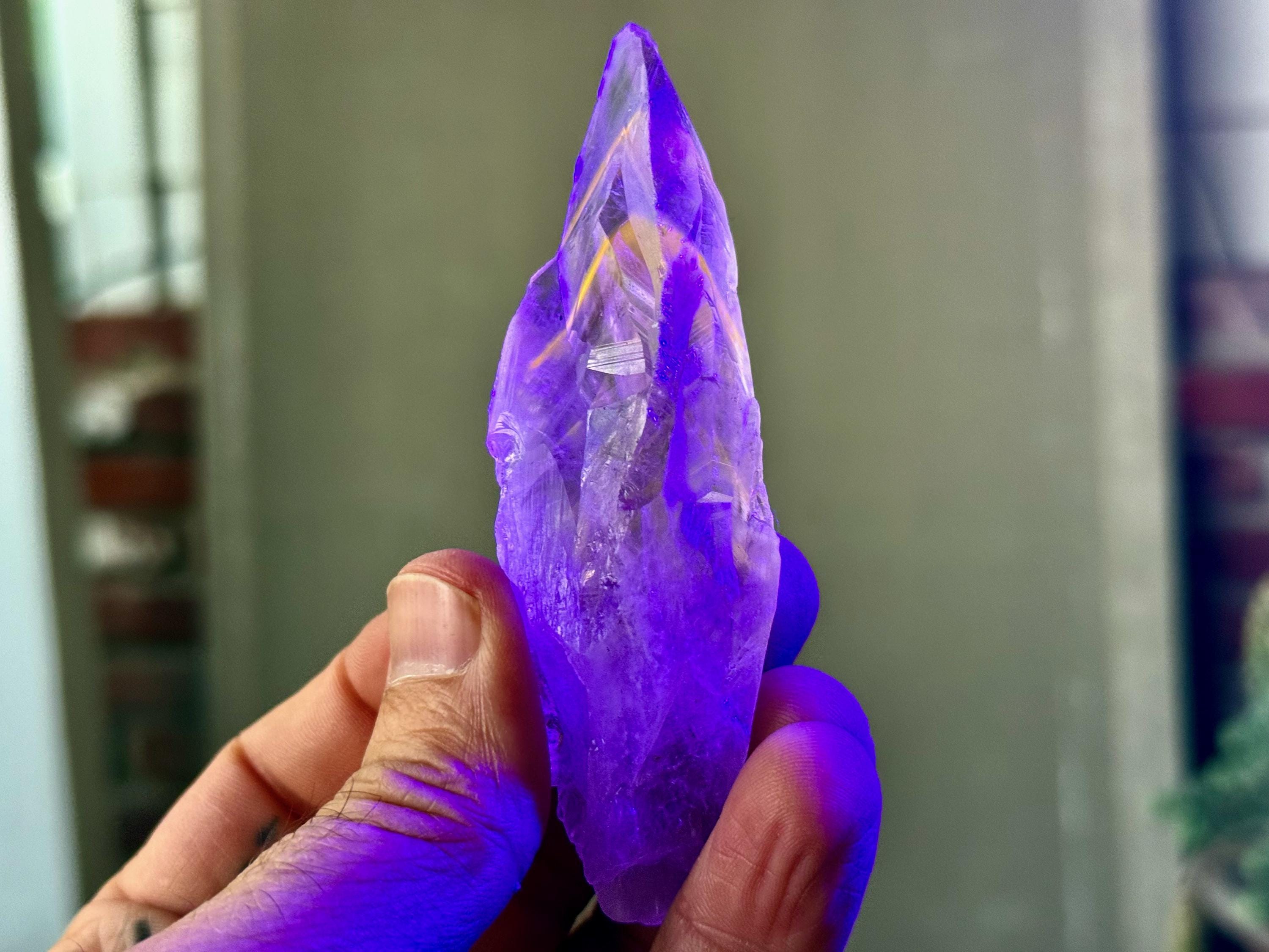 **Please note, the inclusions in this crystal are all natural/untreated. A UV light is necessary to see the phantoms glow, and they can be found affordably at Amazon or any other online outlet. Also, please note that the dark purple hues in the UV-lit photos are a result of the UV light itself and not the color of the crystal. The natural color is shown in the natural-light photos included in this listing.