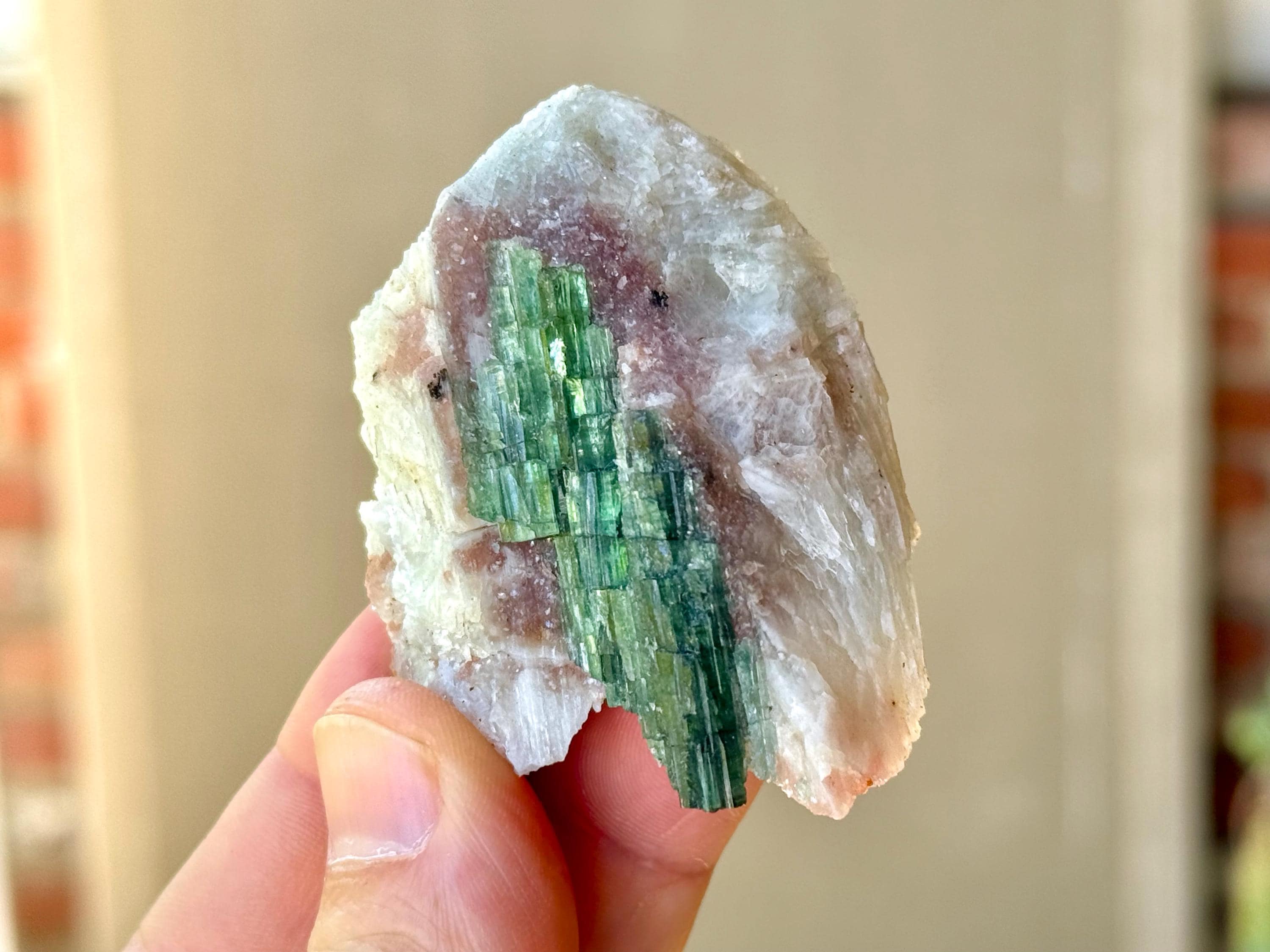 The crystals from this find include unique combinations of Quartz, Lepidolite, Albite, Cleavelandite and Feldspar, with vividly colored Tourmalines in lovely hues of green, pink, purple and blue. Crystals with combinations of these minerals are sometimes referred to as "Unicorn Stones."