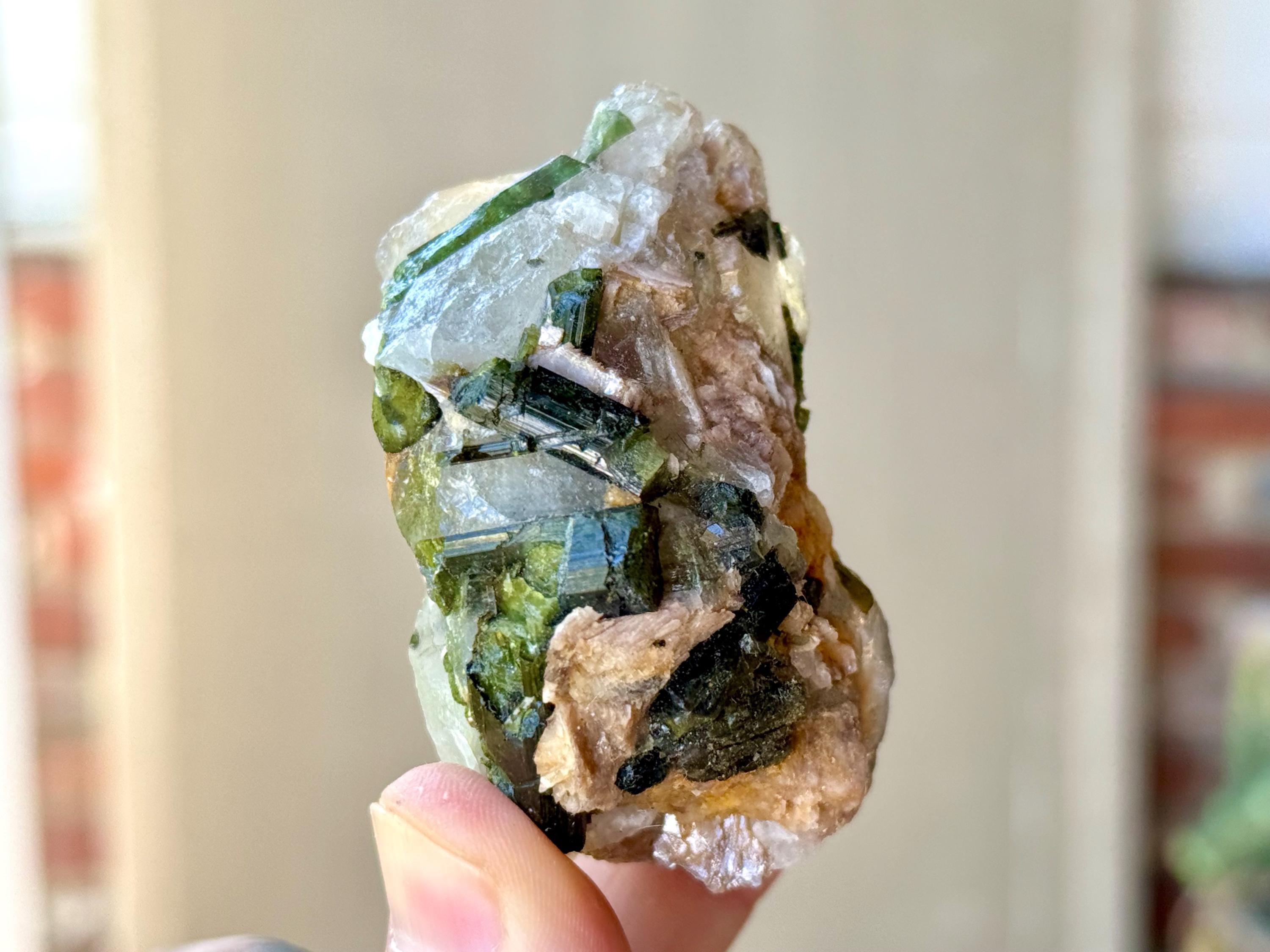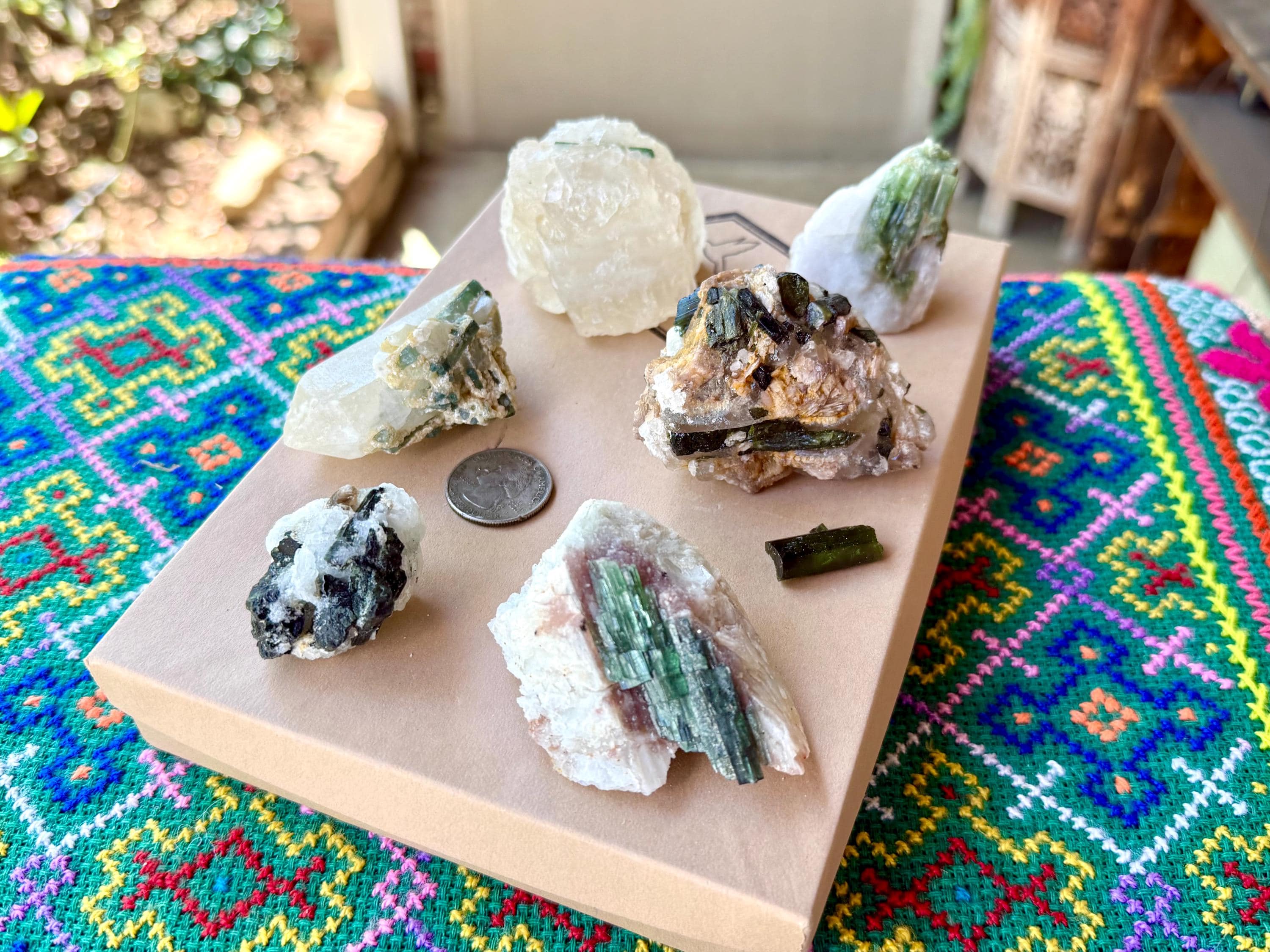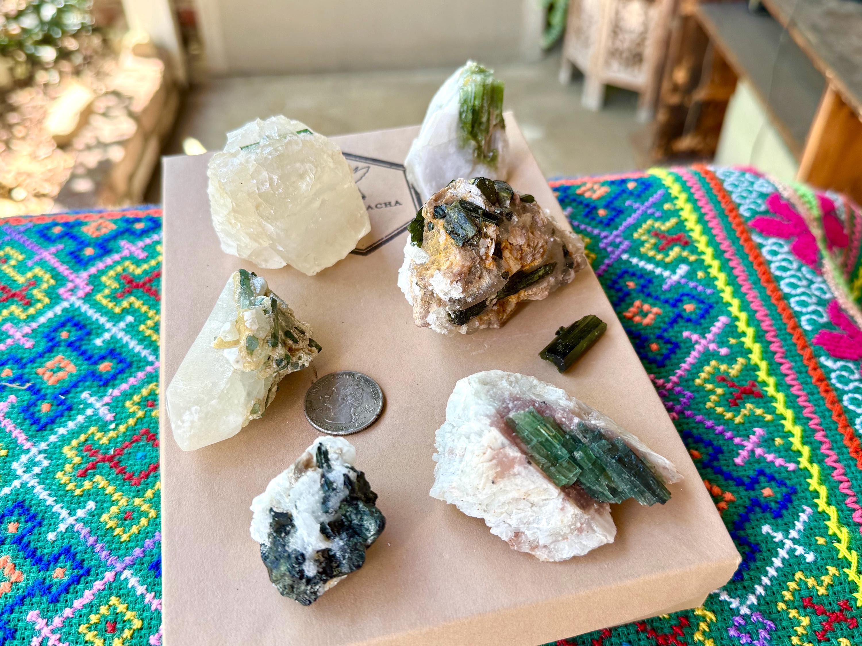A vibrant lot of Unicorn Stone Quartz crystals with Green and even Blue Tourmaline! Some of these crystals also feature Citrine, Albite and hints of Pink Tourmaline.