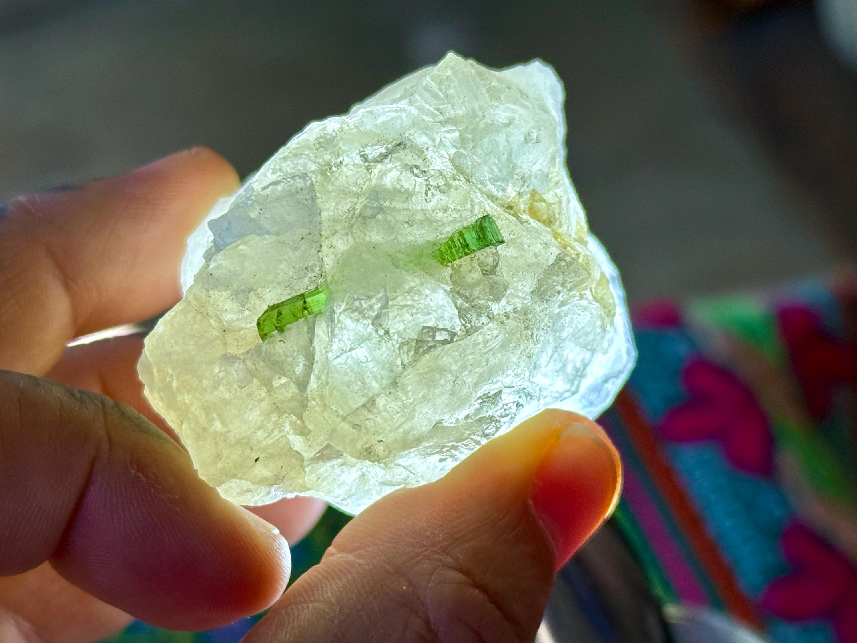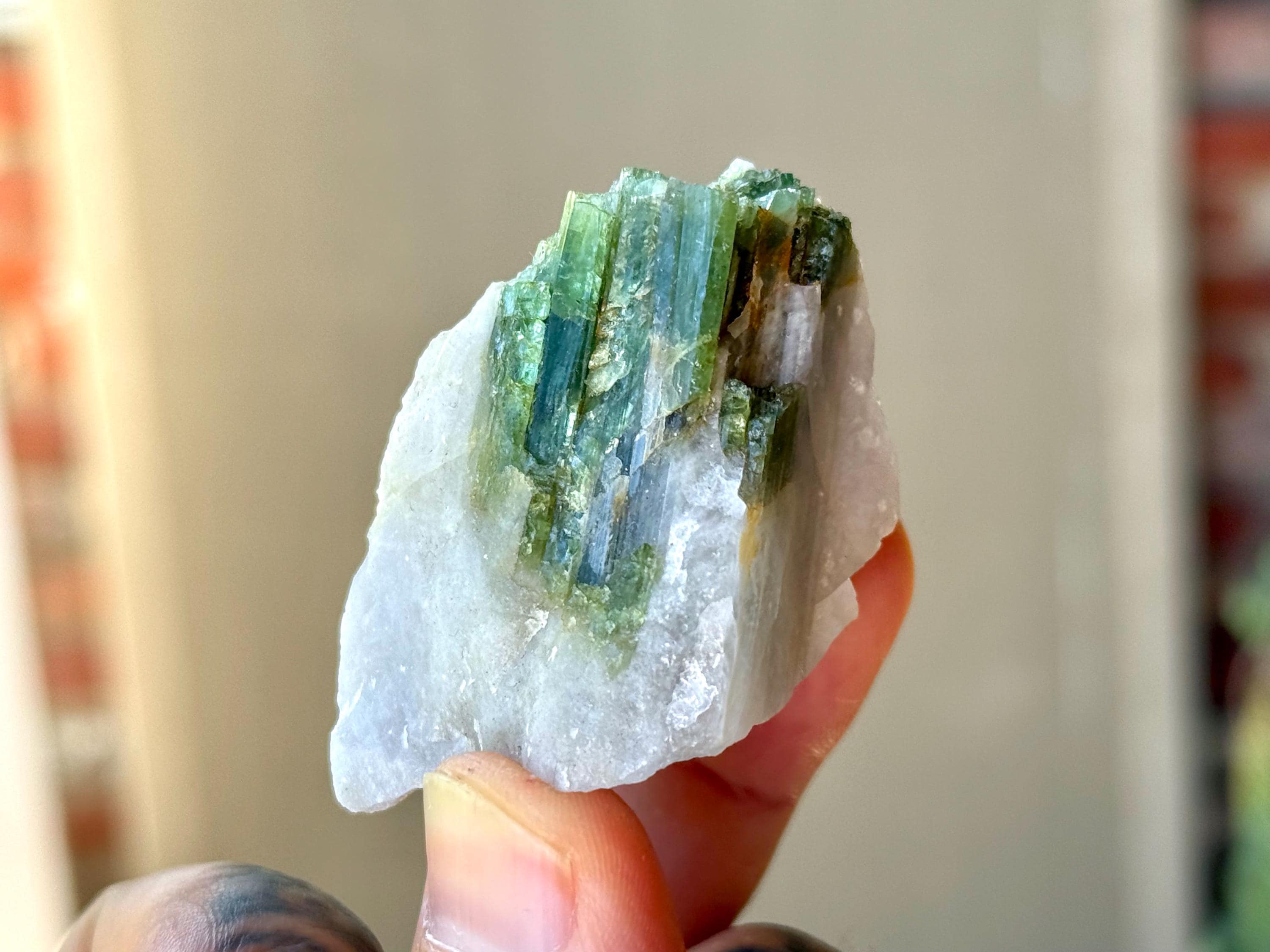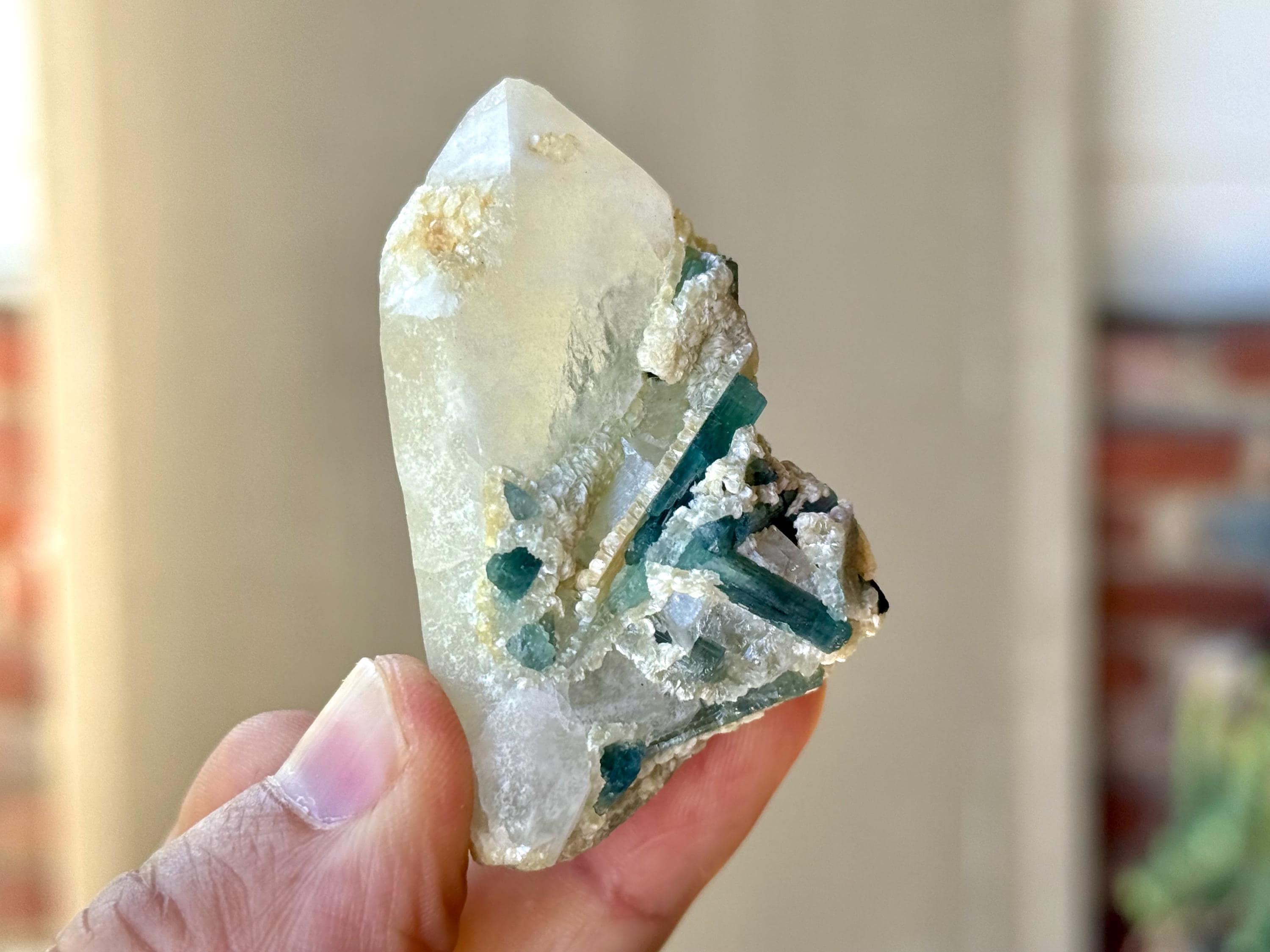 These Unicorn Stone Quartz crystals with Green & Blue Tourmaline come from a recent find in Coronel Murta, Minas Gerais, Brazil.