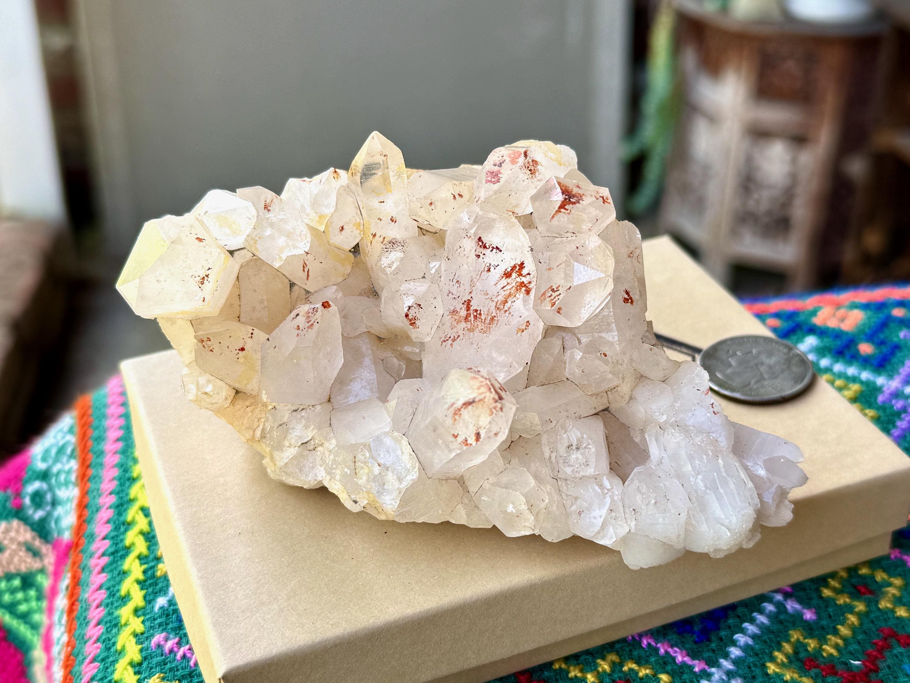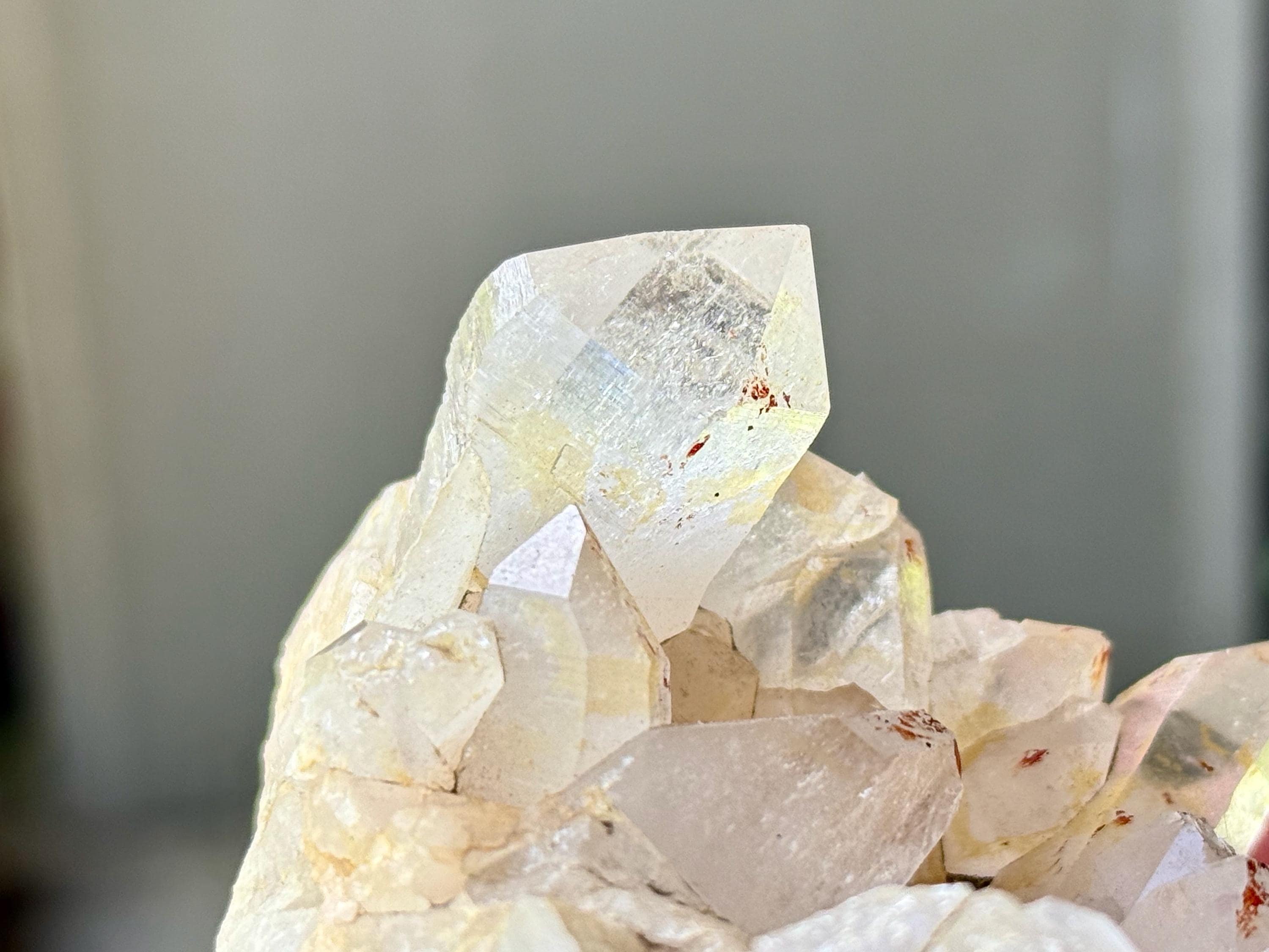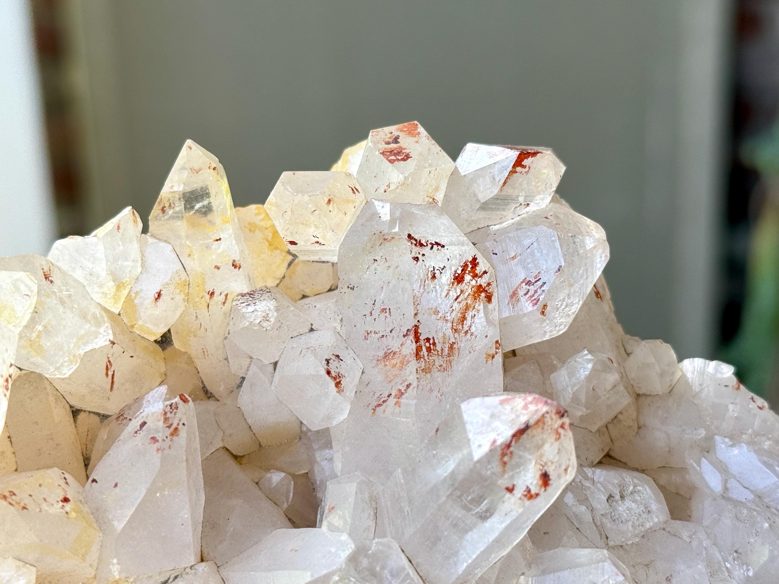 Superb luster to this gorgeous Golden Healer Himalayan Quartz crystal cluster with a mild tinge of golden color from Hematite inclusion. In this piece, the Hematite inclusion also presents in vibrant red "frost" on some of the crystals.