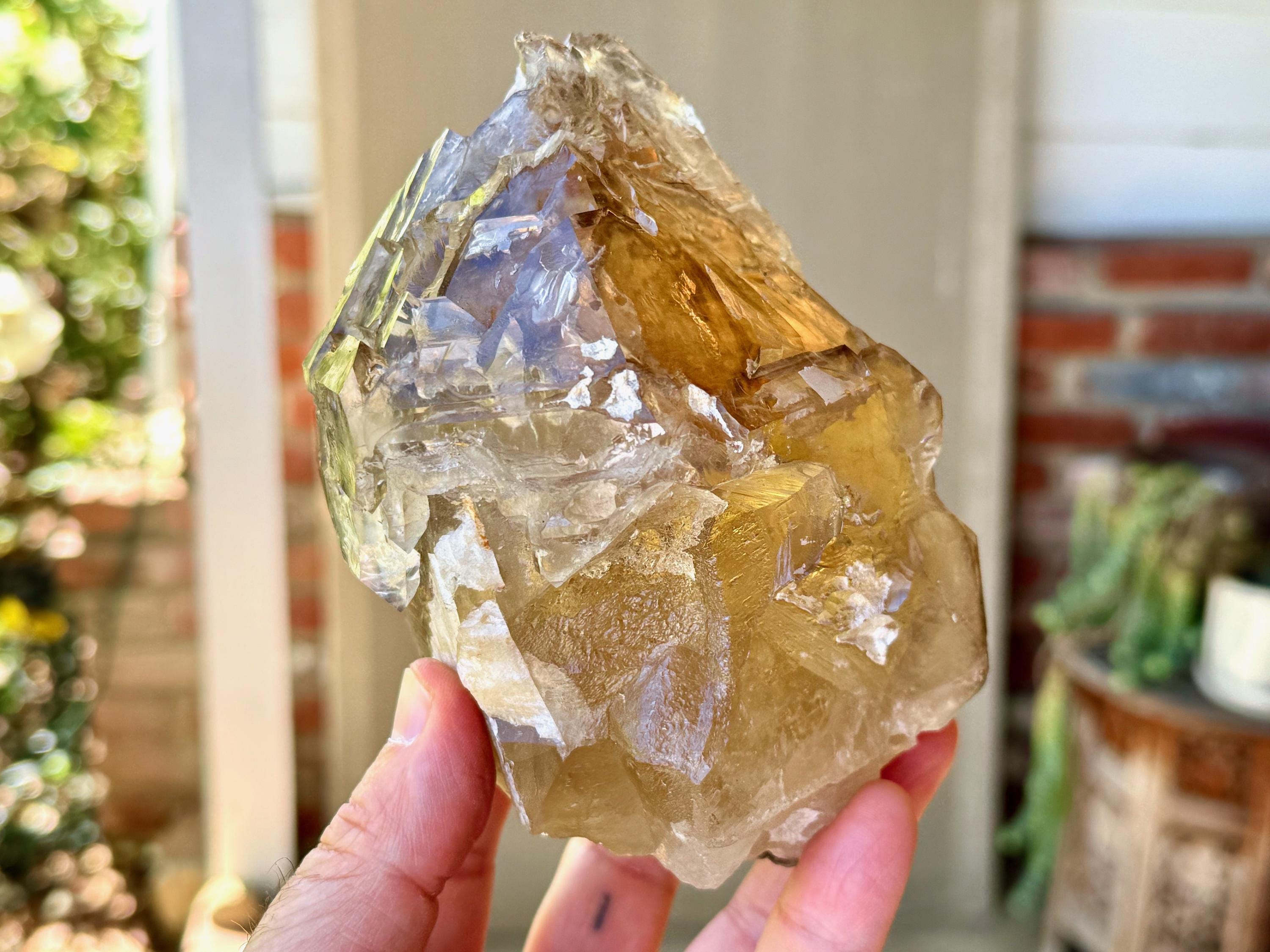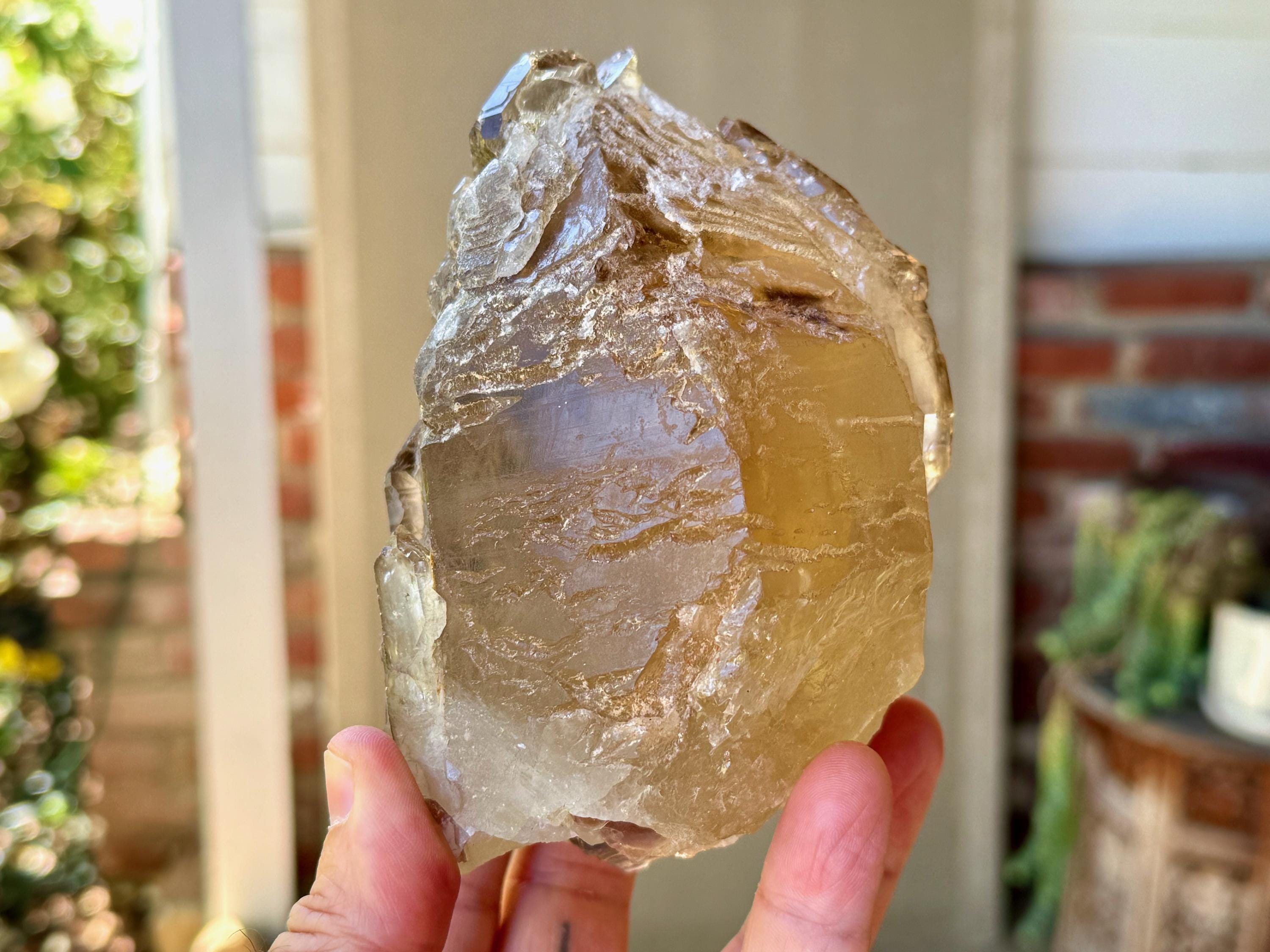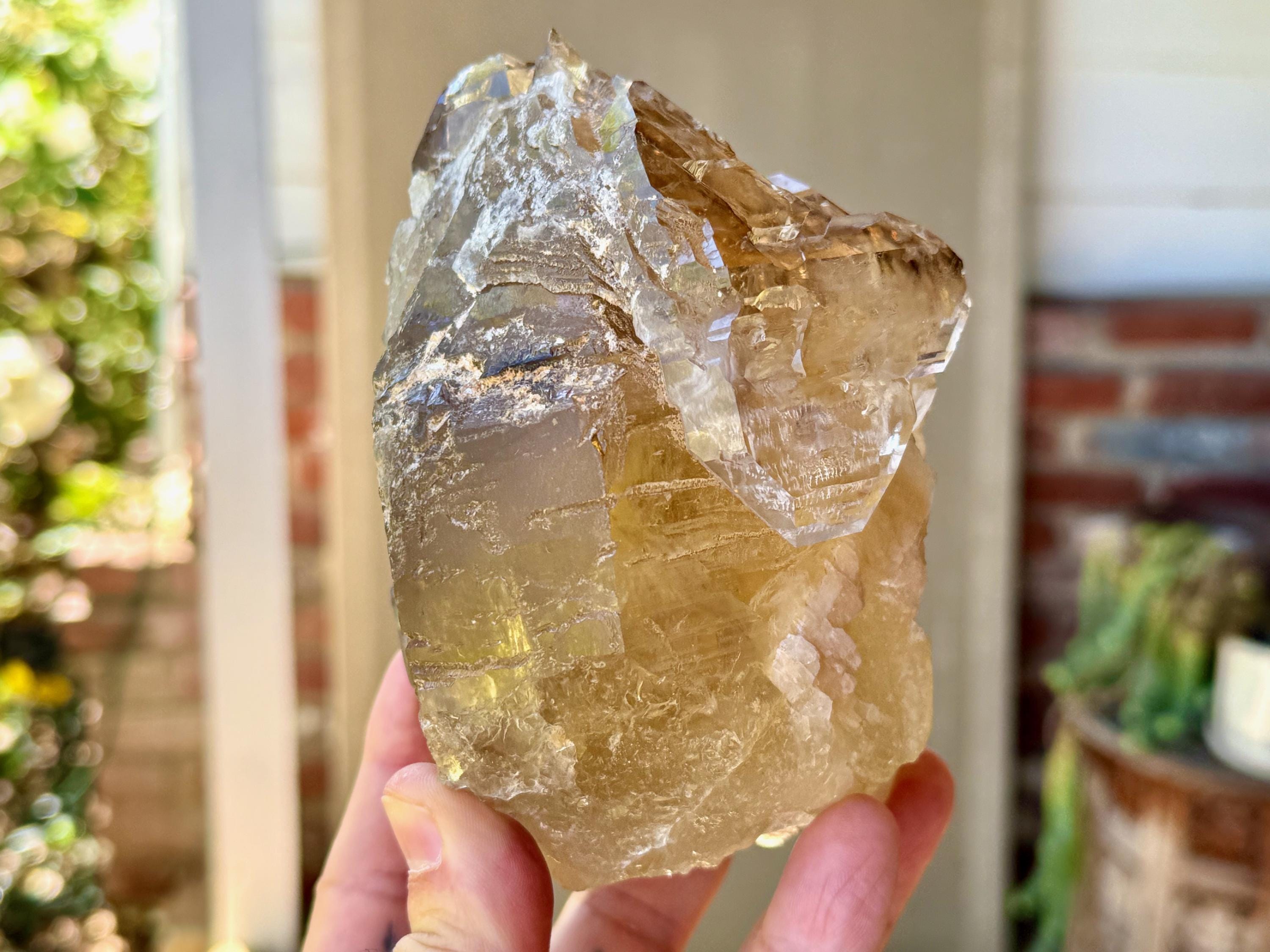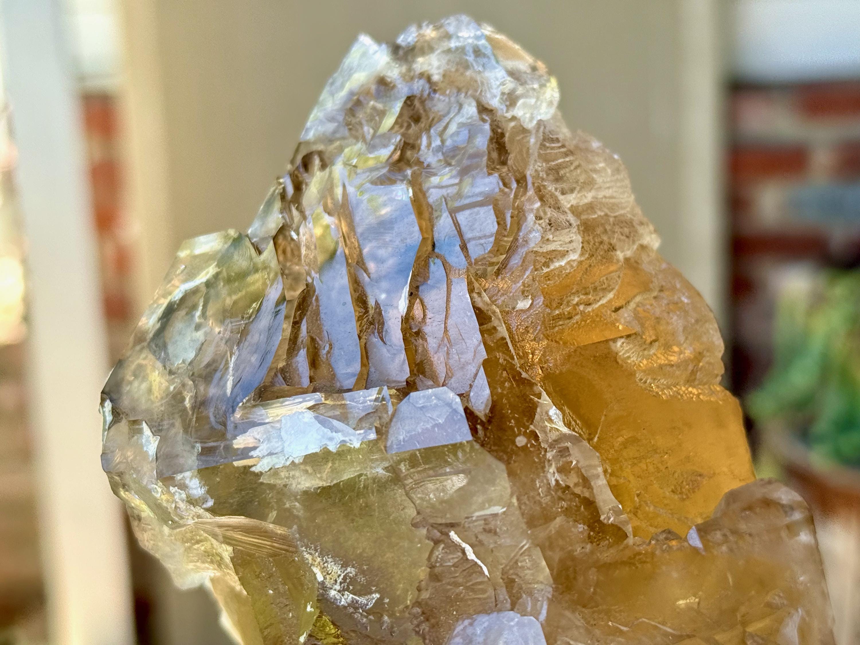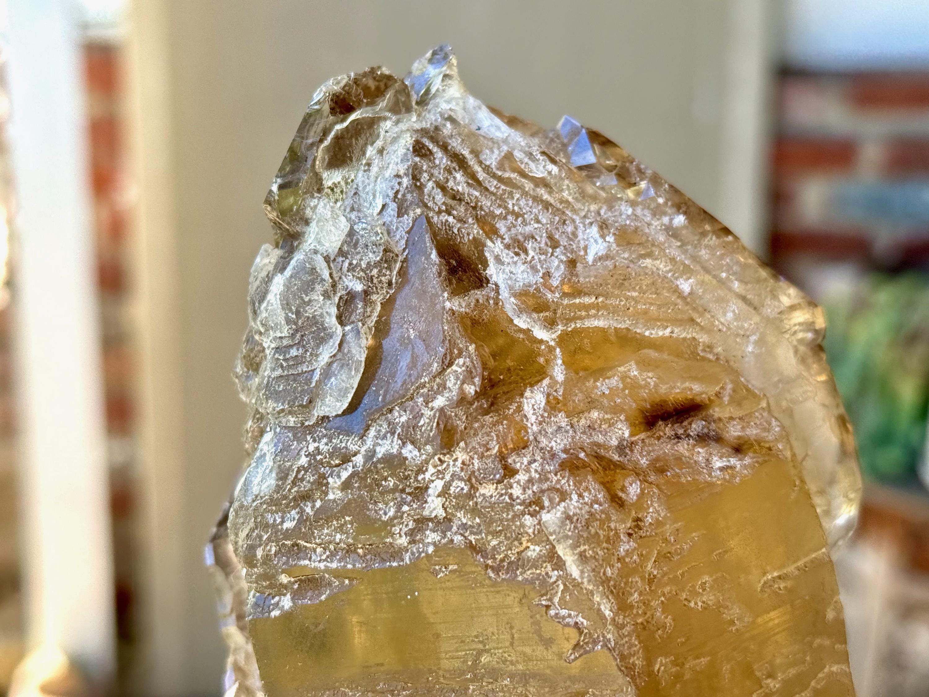 The depth of color is superb, as each layer possesses a different hue and level of clarity, with a deeply golden "core" and clearer overgrowth. When backlit, as in Photos 4-6, this piece lights up brilliantly.