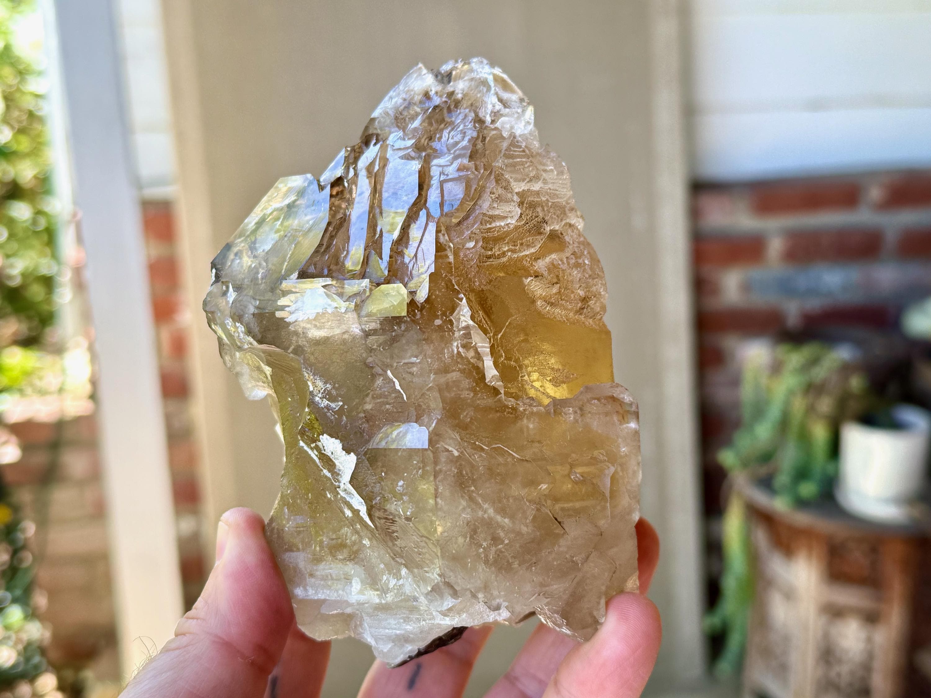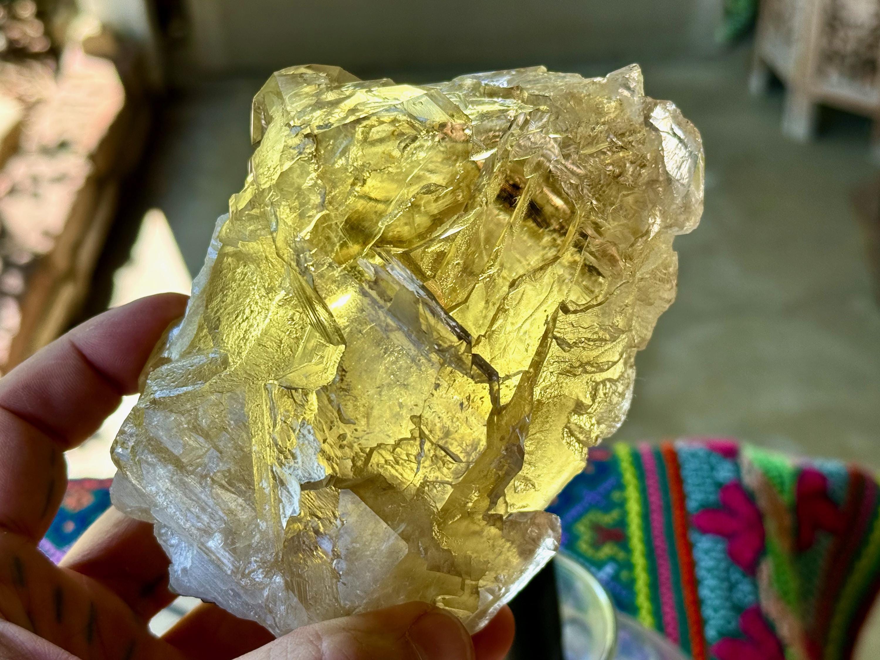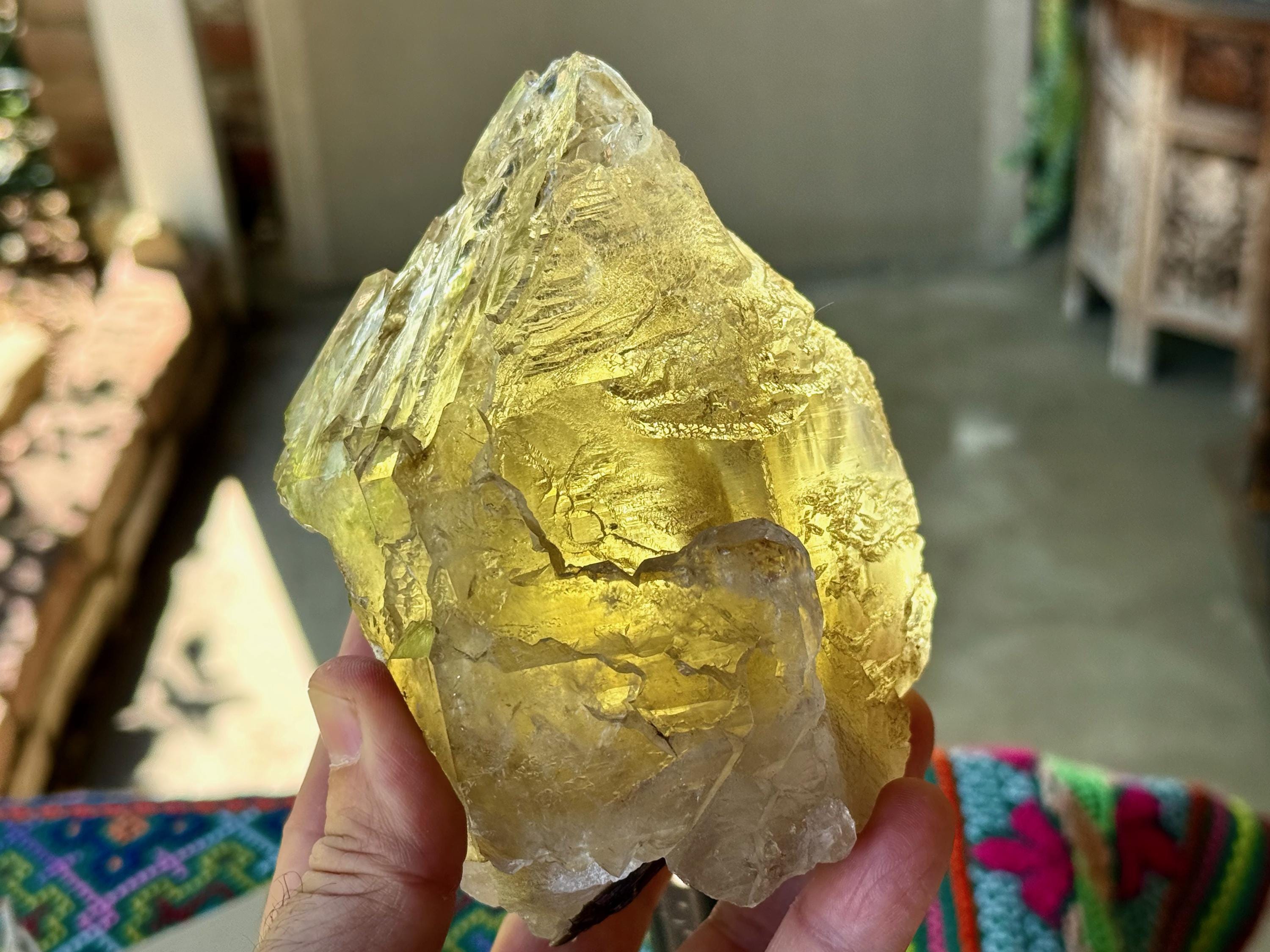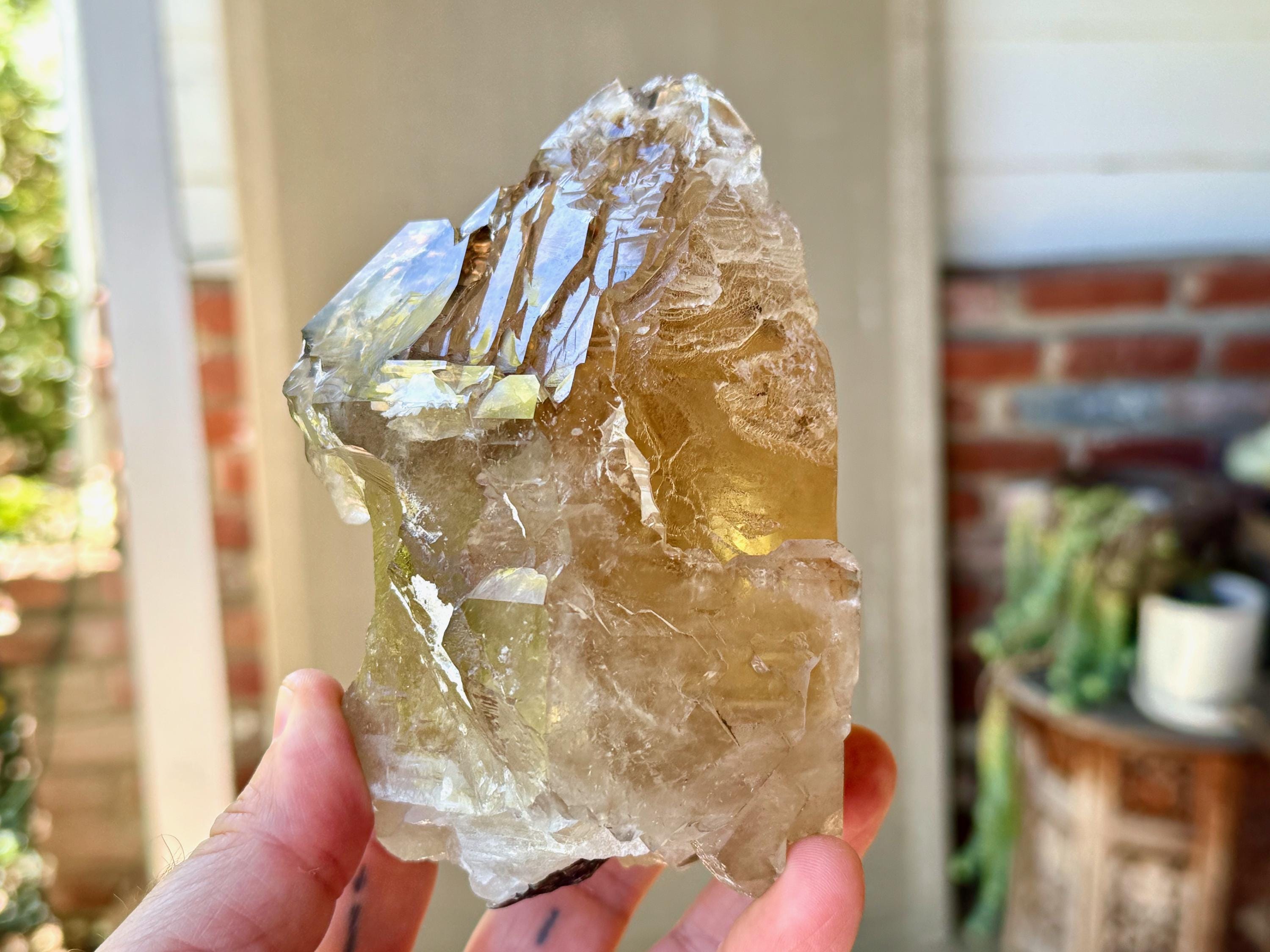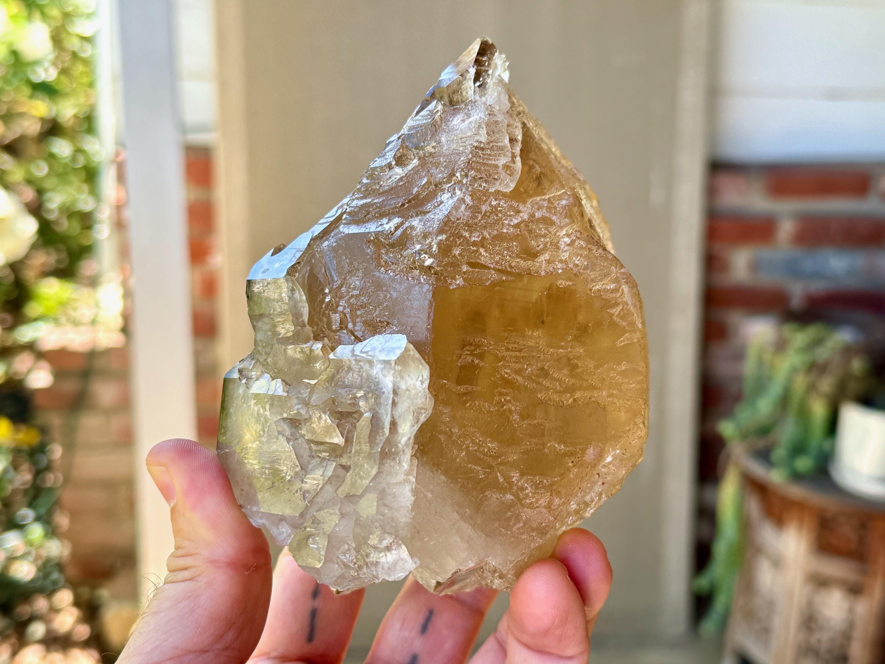 The depth of color is superb, as each layer possesses a different hue and level of clarity, with a deeply golden "core" and clearer overgrowth. When backlit, as in Photos 4-6, this piece lights up brilliantly.