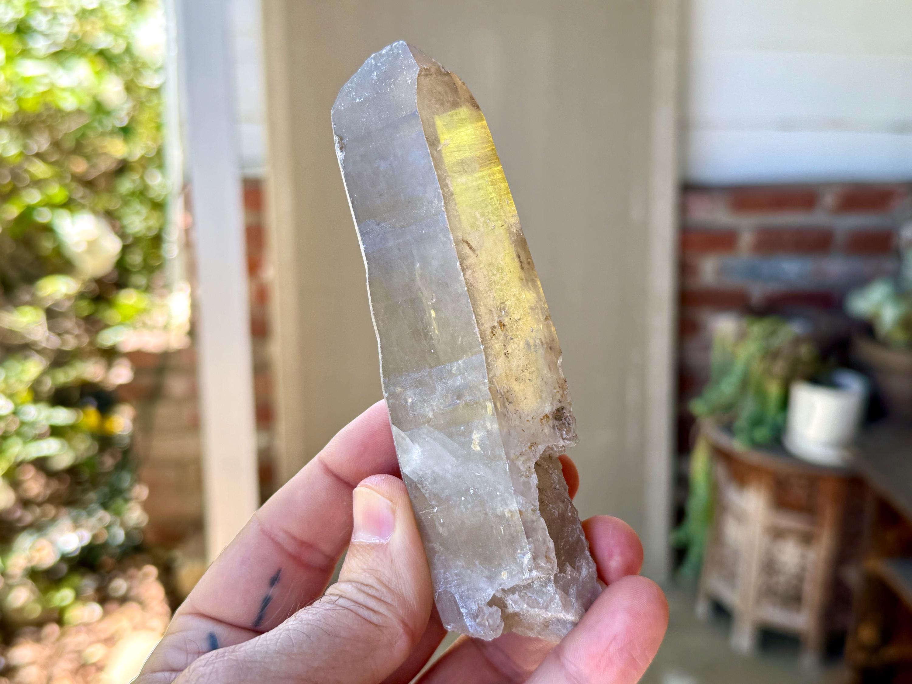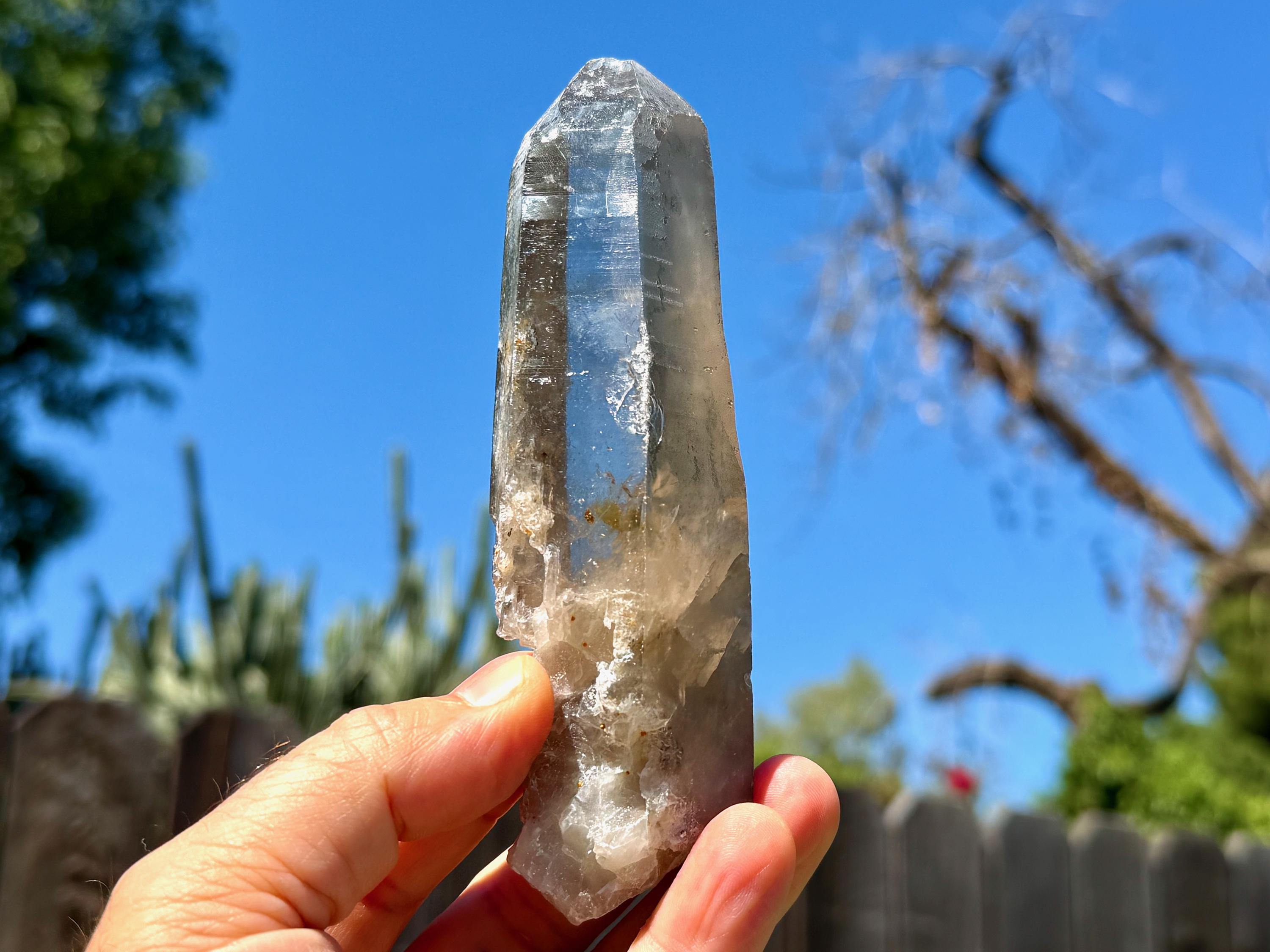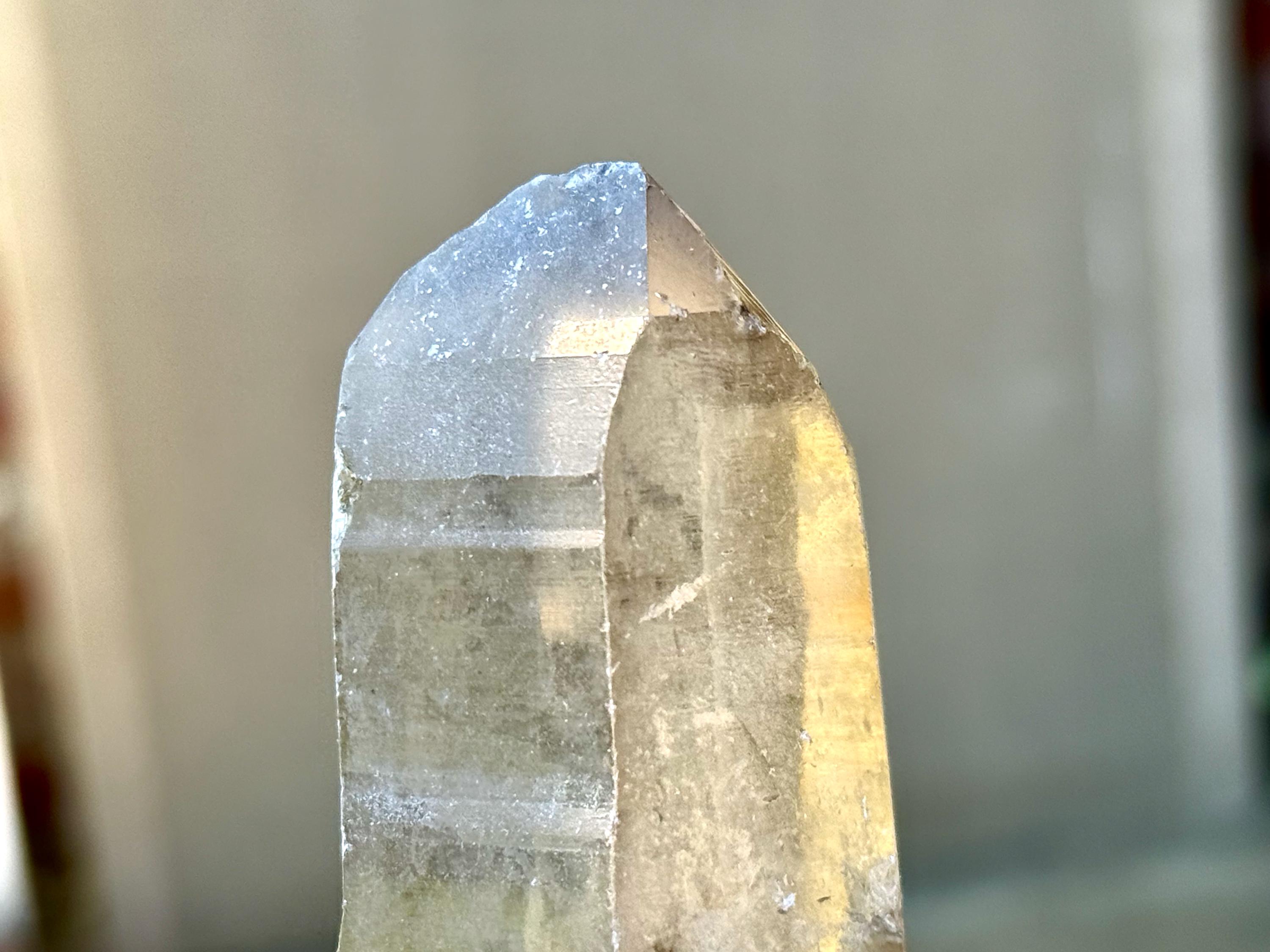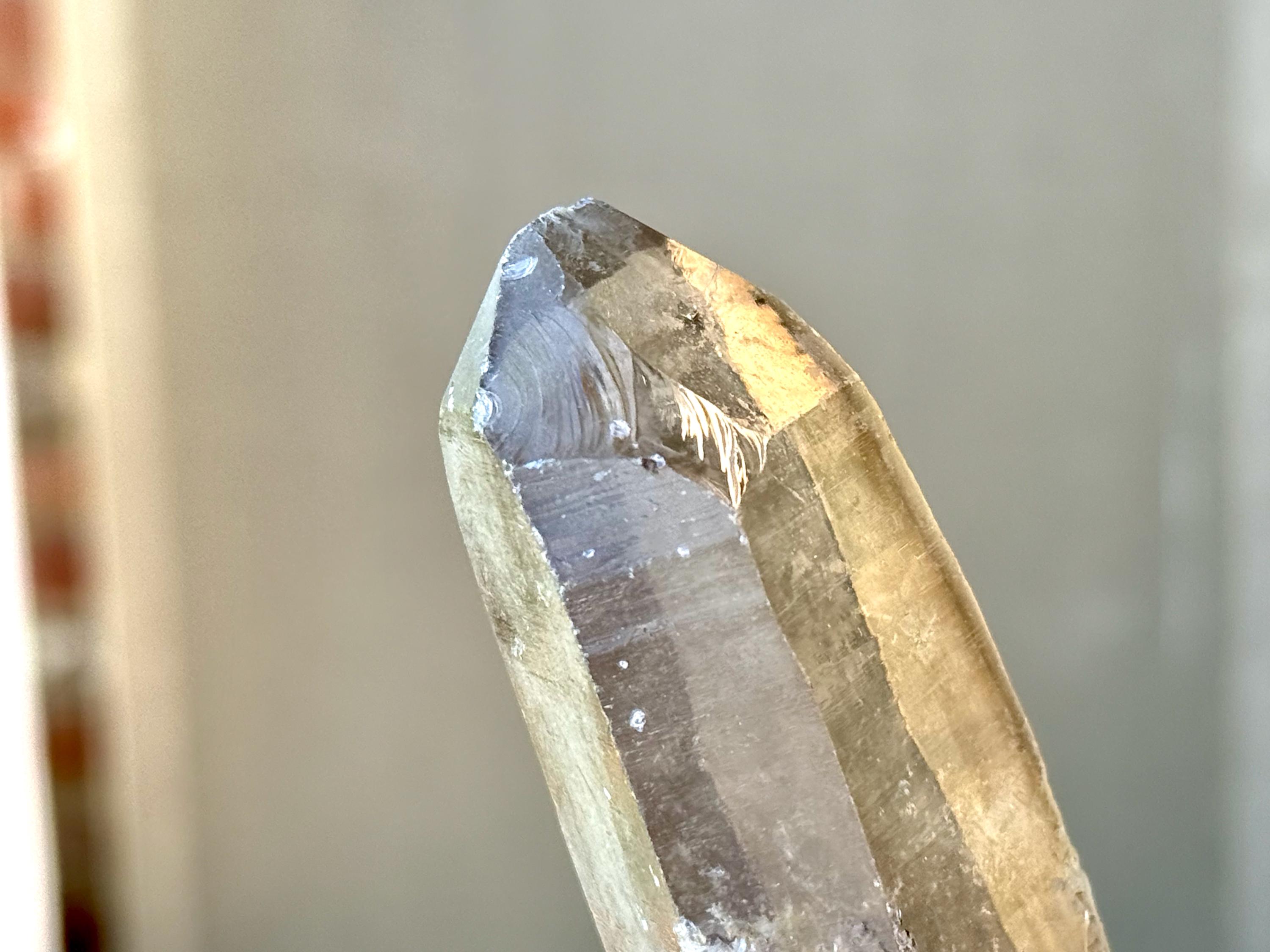 Water-clear clarity, brilliant luster and a mild smoky color to this handsome Sacred Scribe Lemurian with an elongated formation. This crystal possesses some *very* mild indications of traditional Lemurian striations on the front, back and left sides, primarily. When backlit, it lights up brilliantly (Photos 6-7).