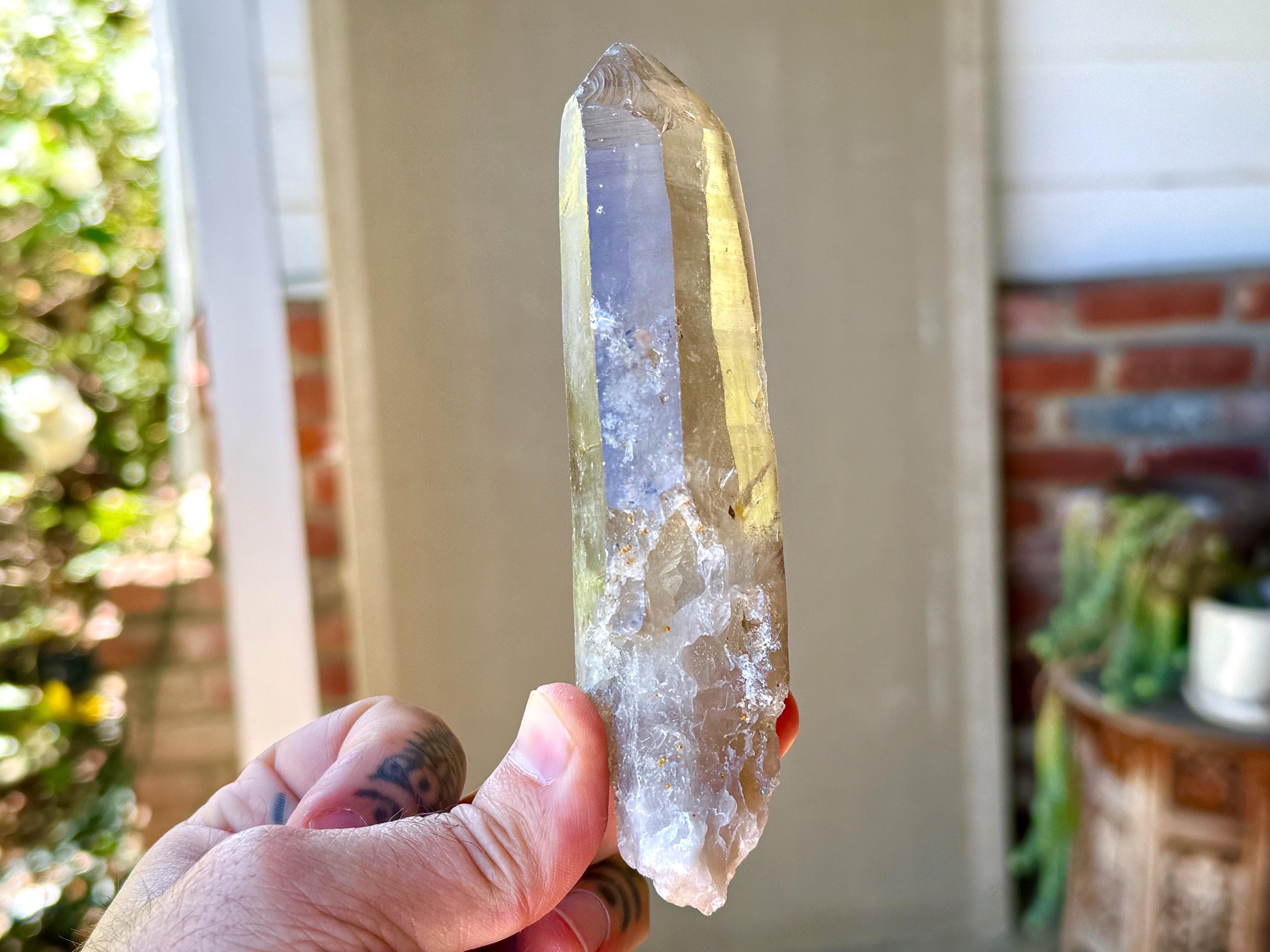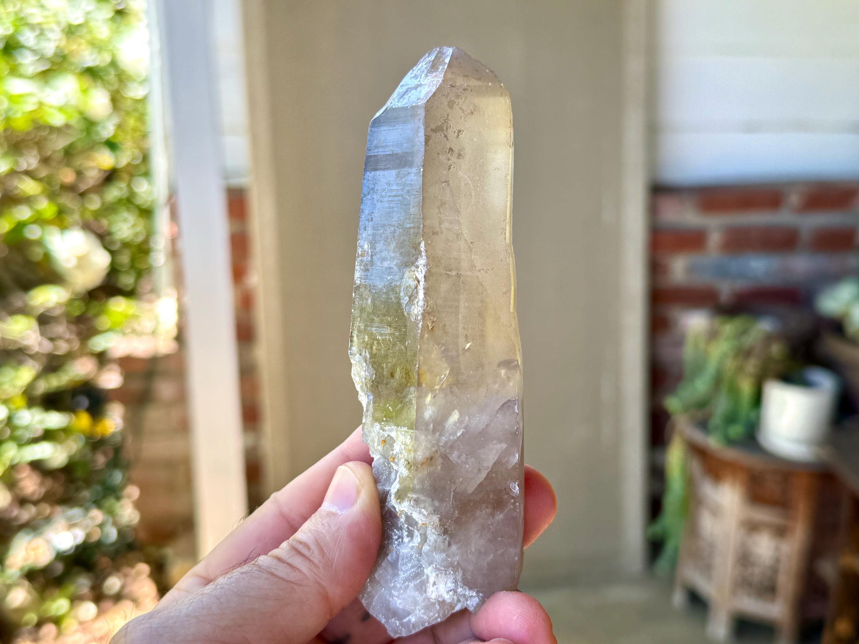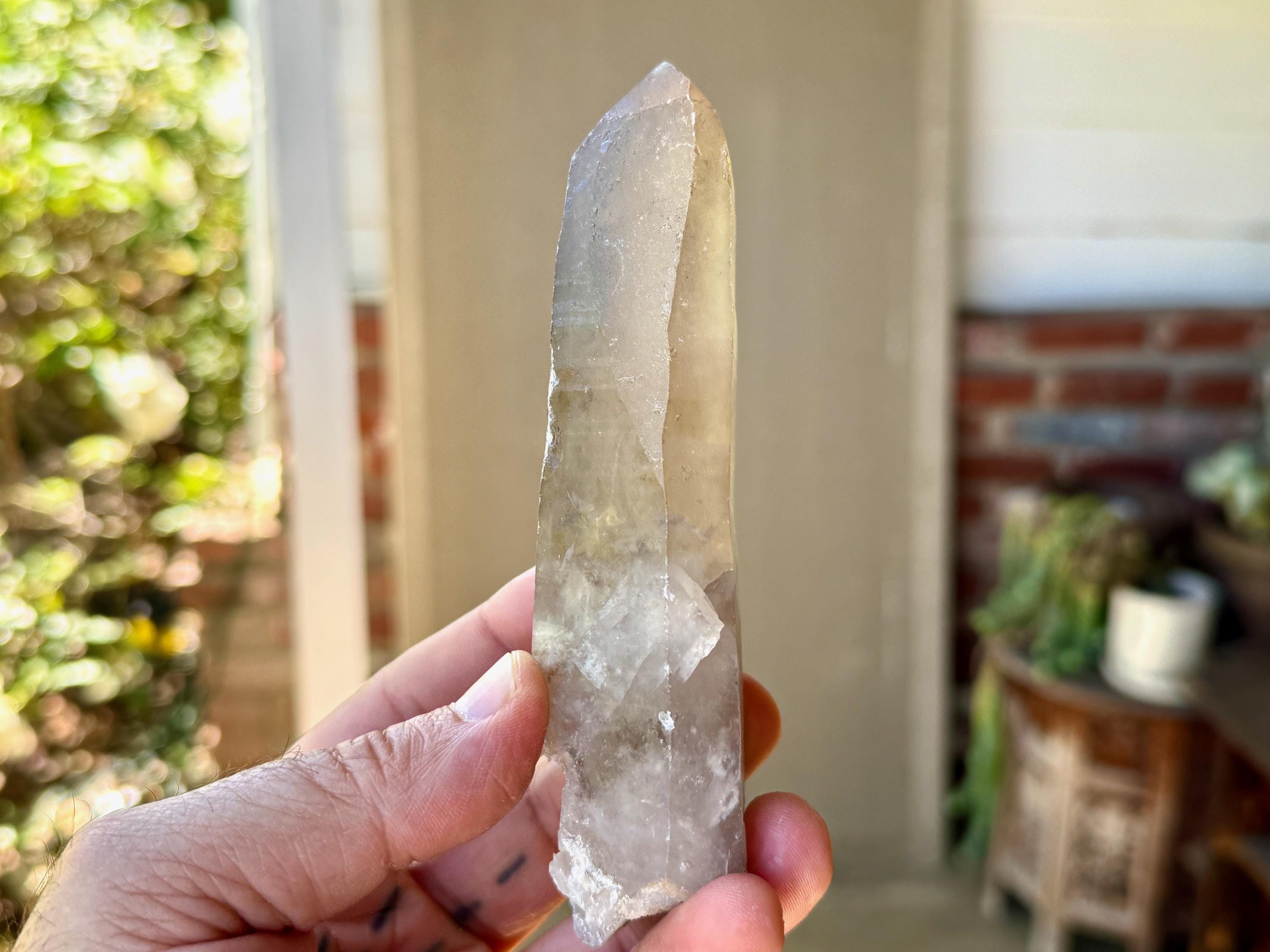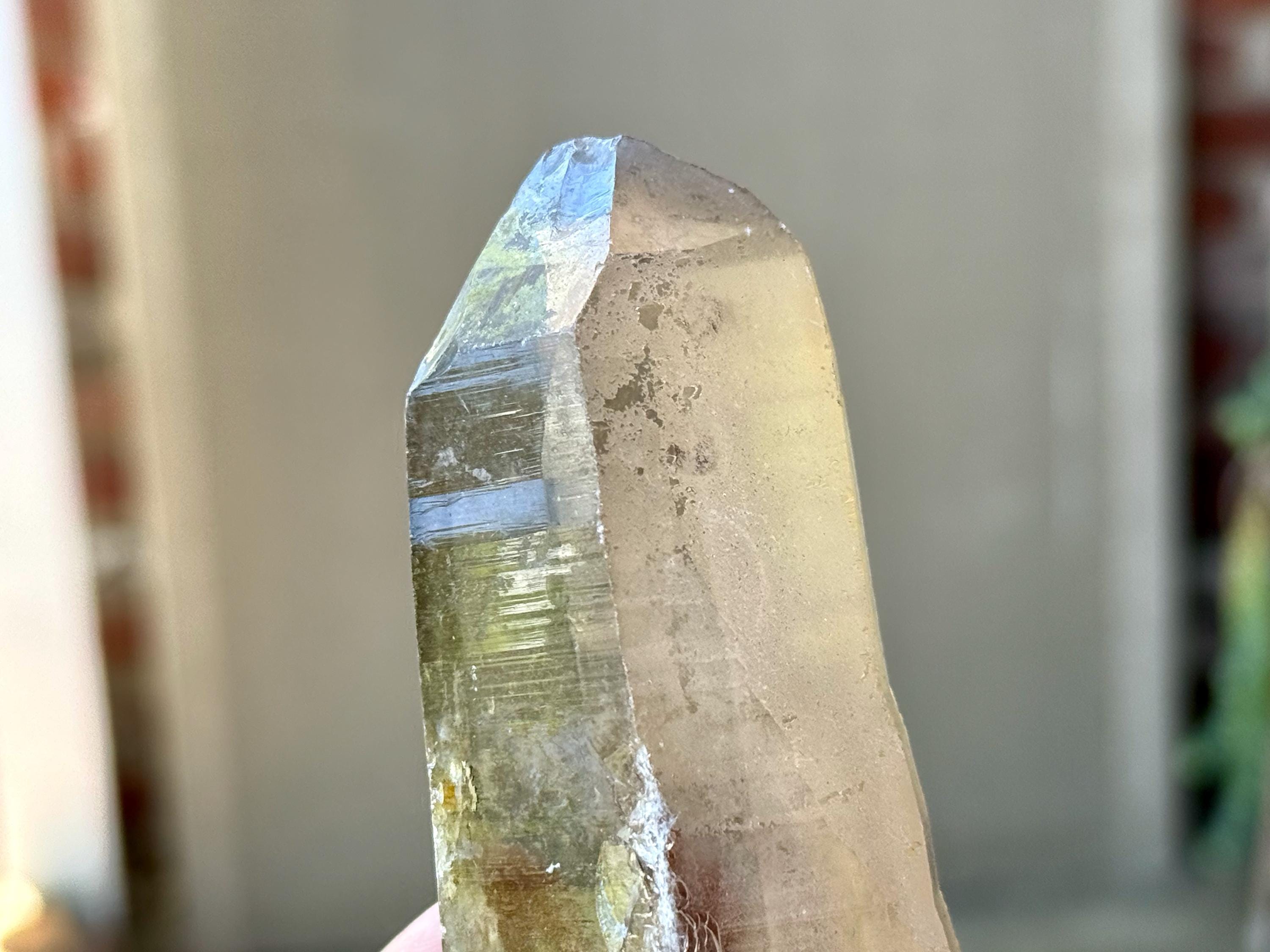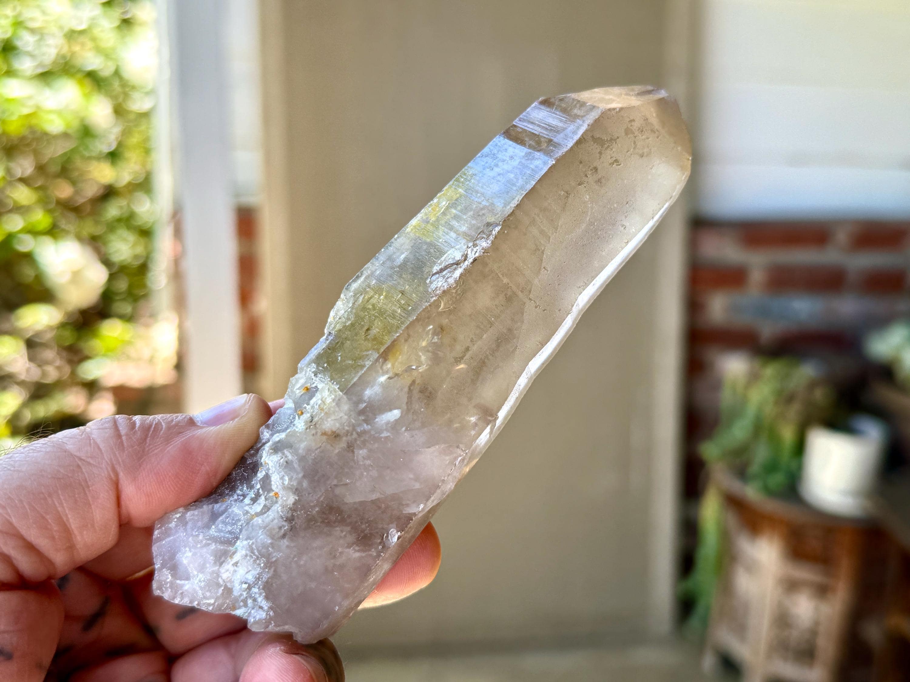 Water-clear clarity, brilliant luster and a mild smoky color to this handsome Sacred Scribe Lemurian with an elongated formation. This crystal possesses some *very* mild indications of traditional Lemurian striations on the front, back and left sides, primarily. When backlit, it lights up brilliantly (Photos 6-7).