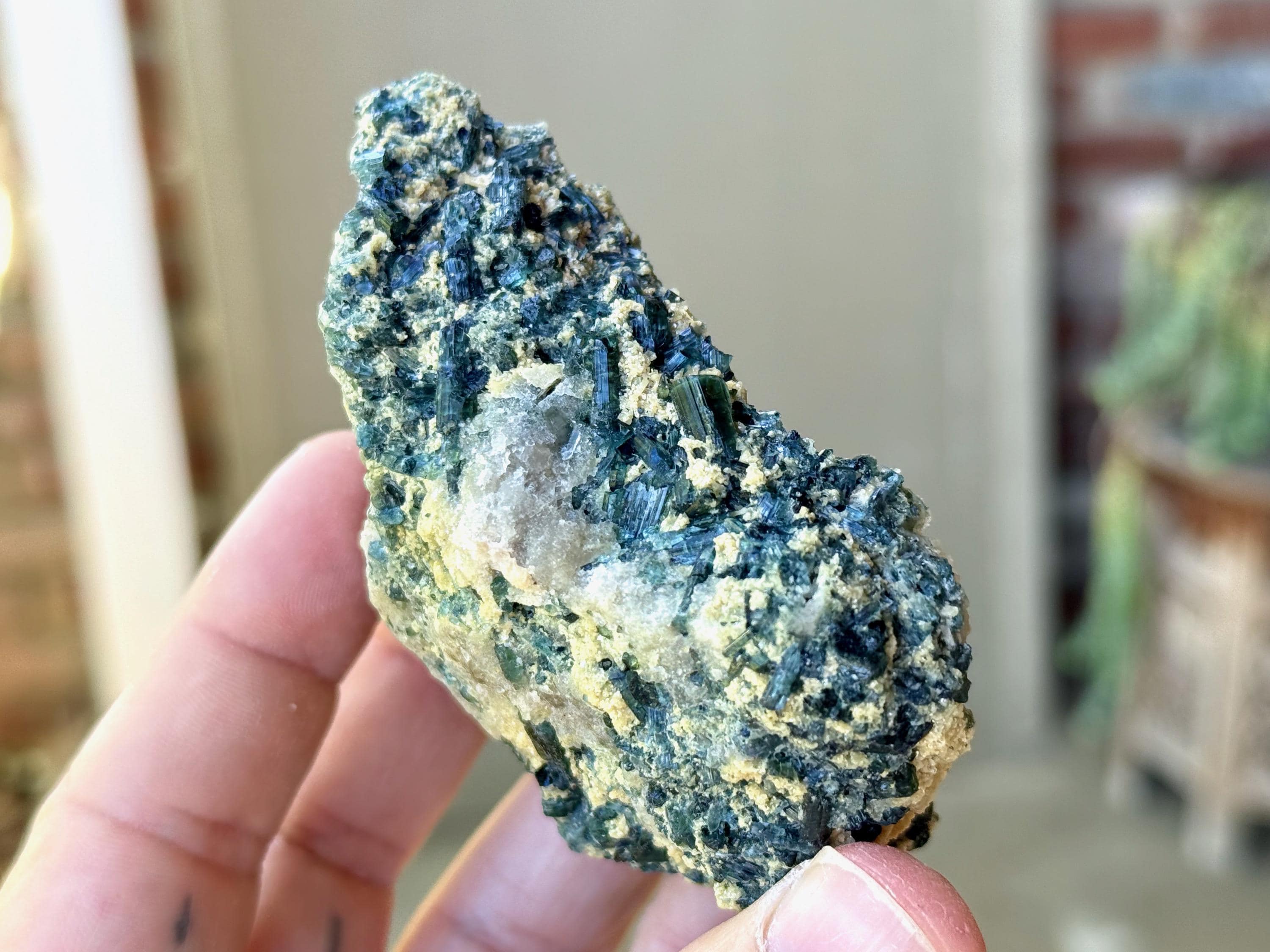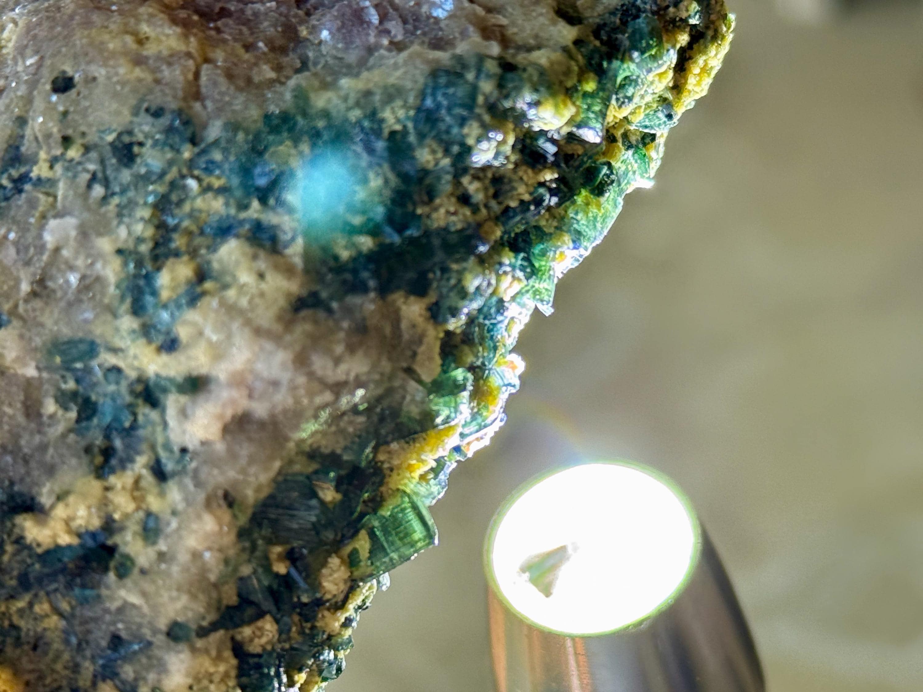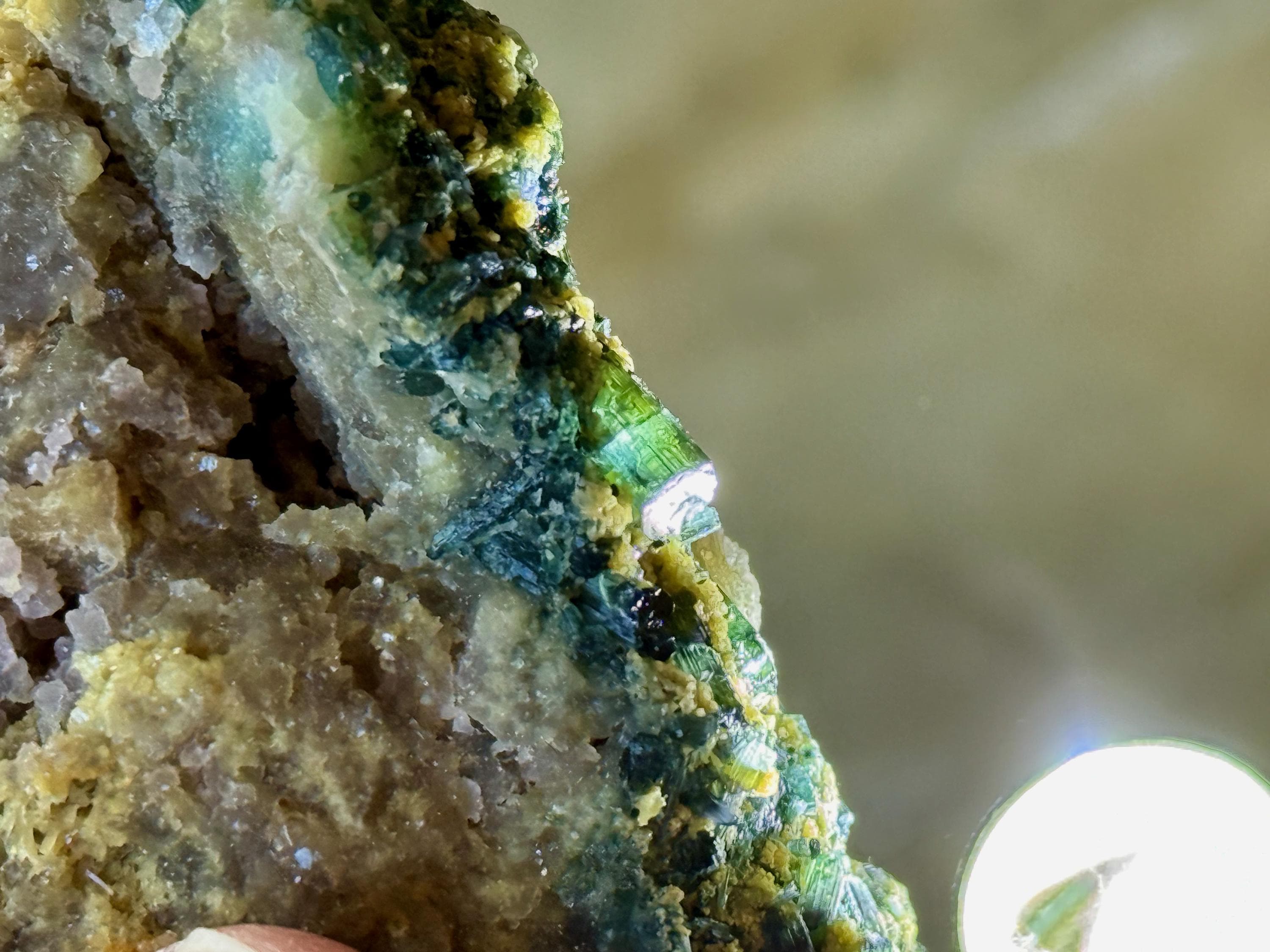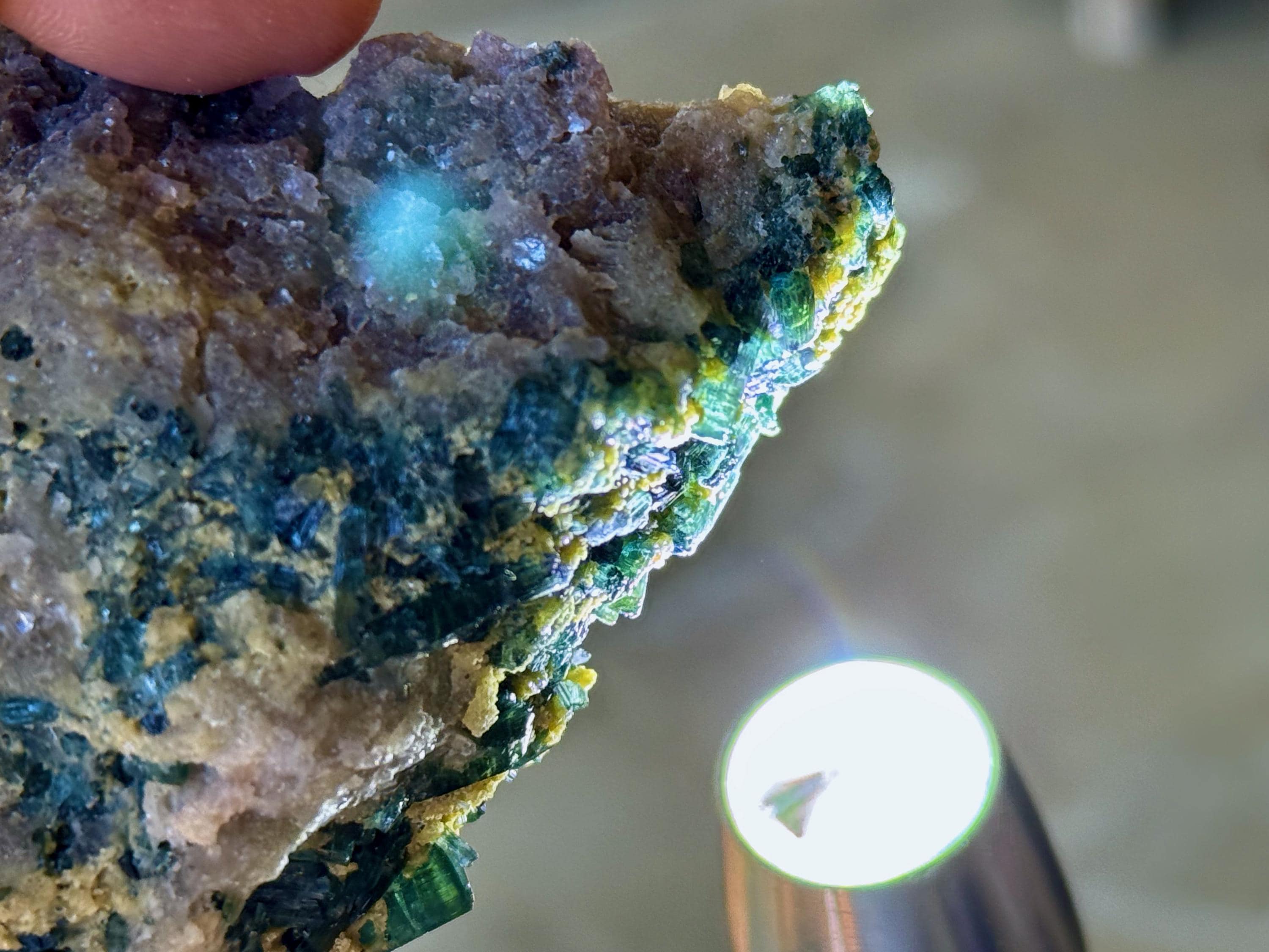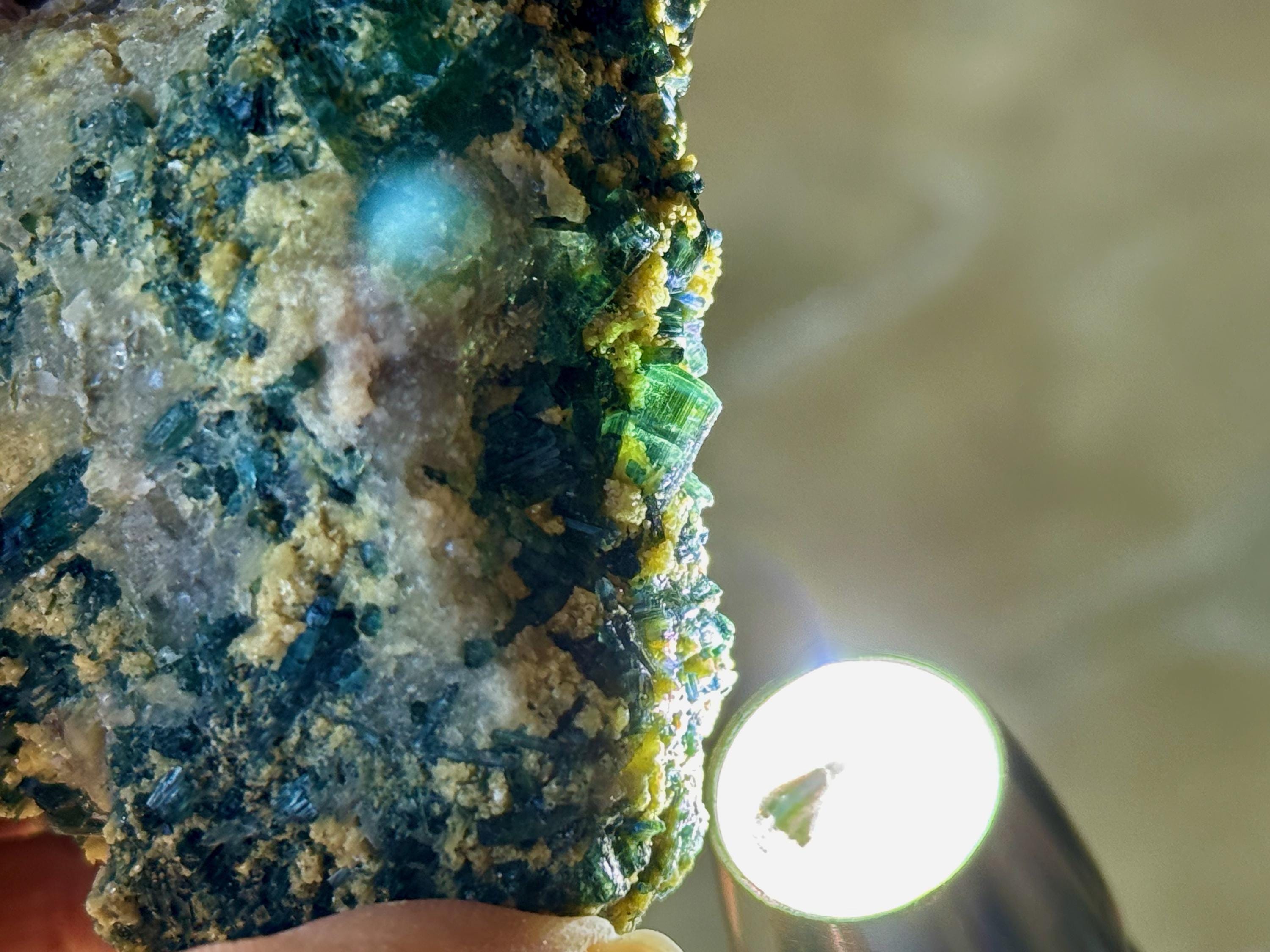 In natural light, we can get only a mild sense of the great color on this piece. But when we backlight the edges, the Tourmalines reveal themselves to be a gemmy, lustrous Blue-Green color. You'll have to get in pretty close with a jeweler's loupe to see up close, but some of these are truly bicolor with a separation of blue and green color. We've included some close-ups to show this off (Photos 3-6).