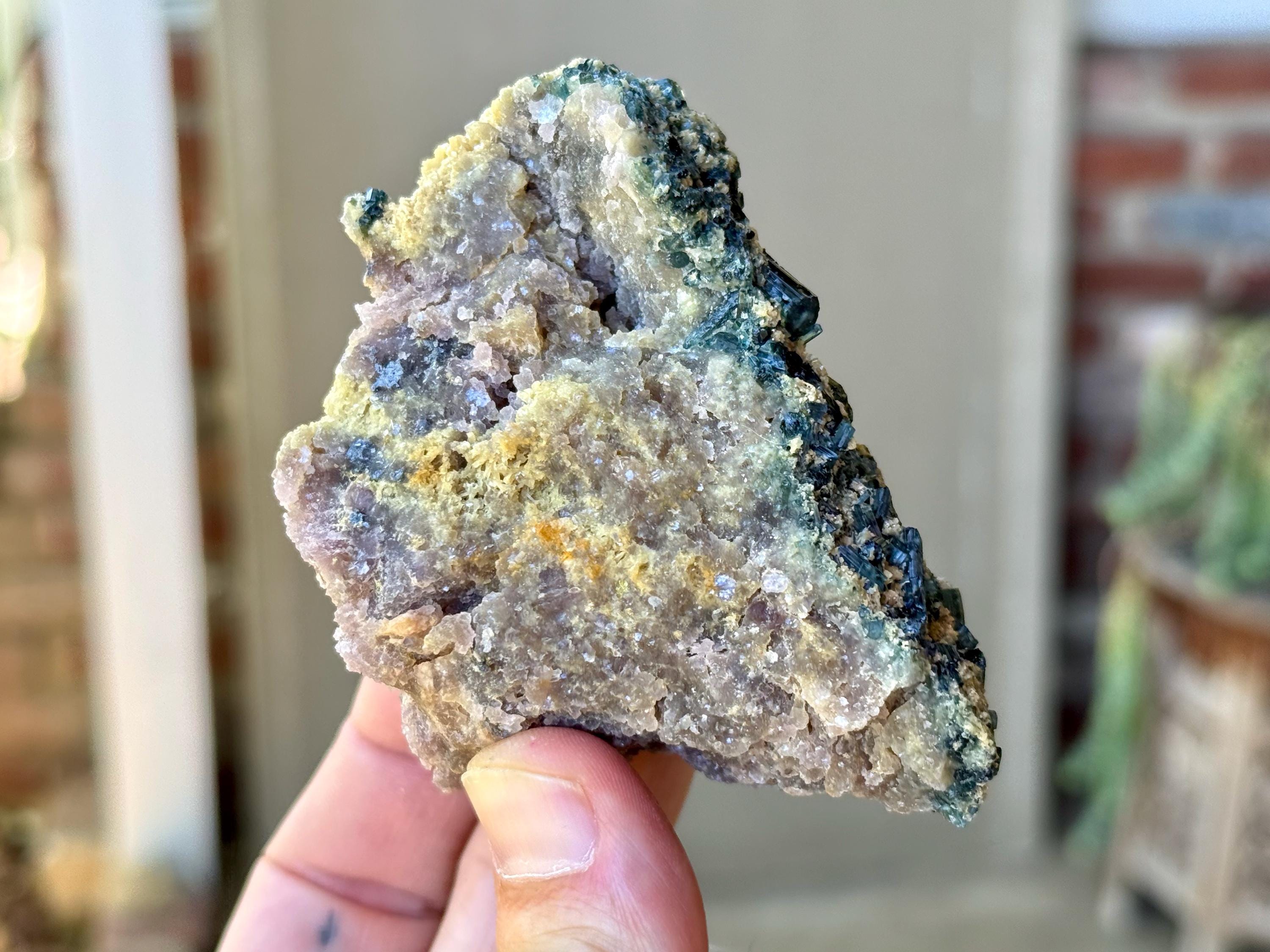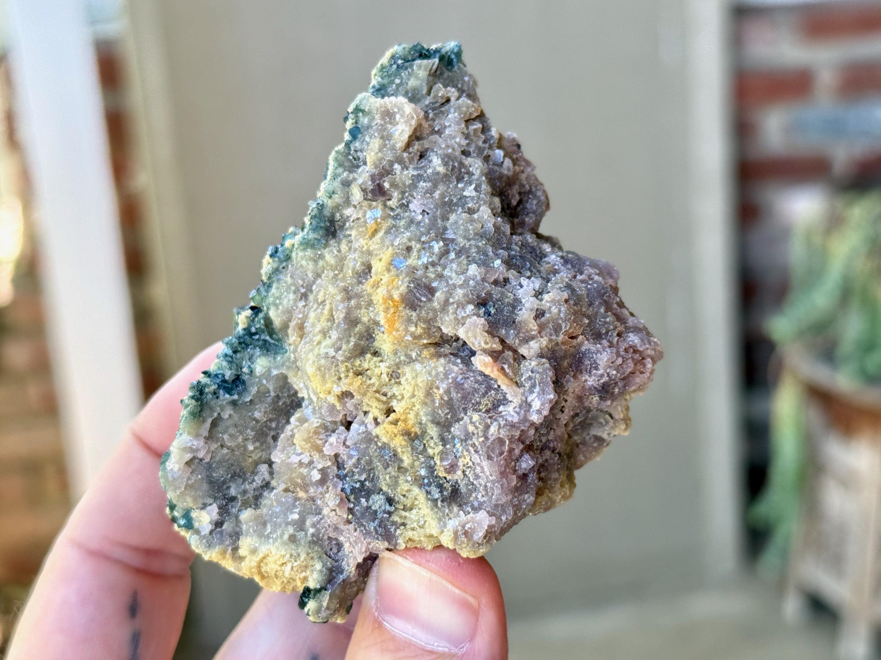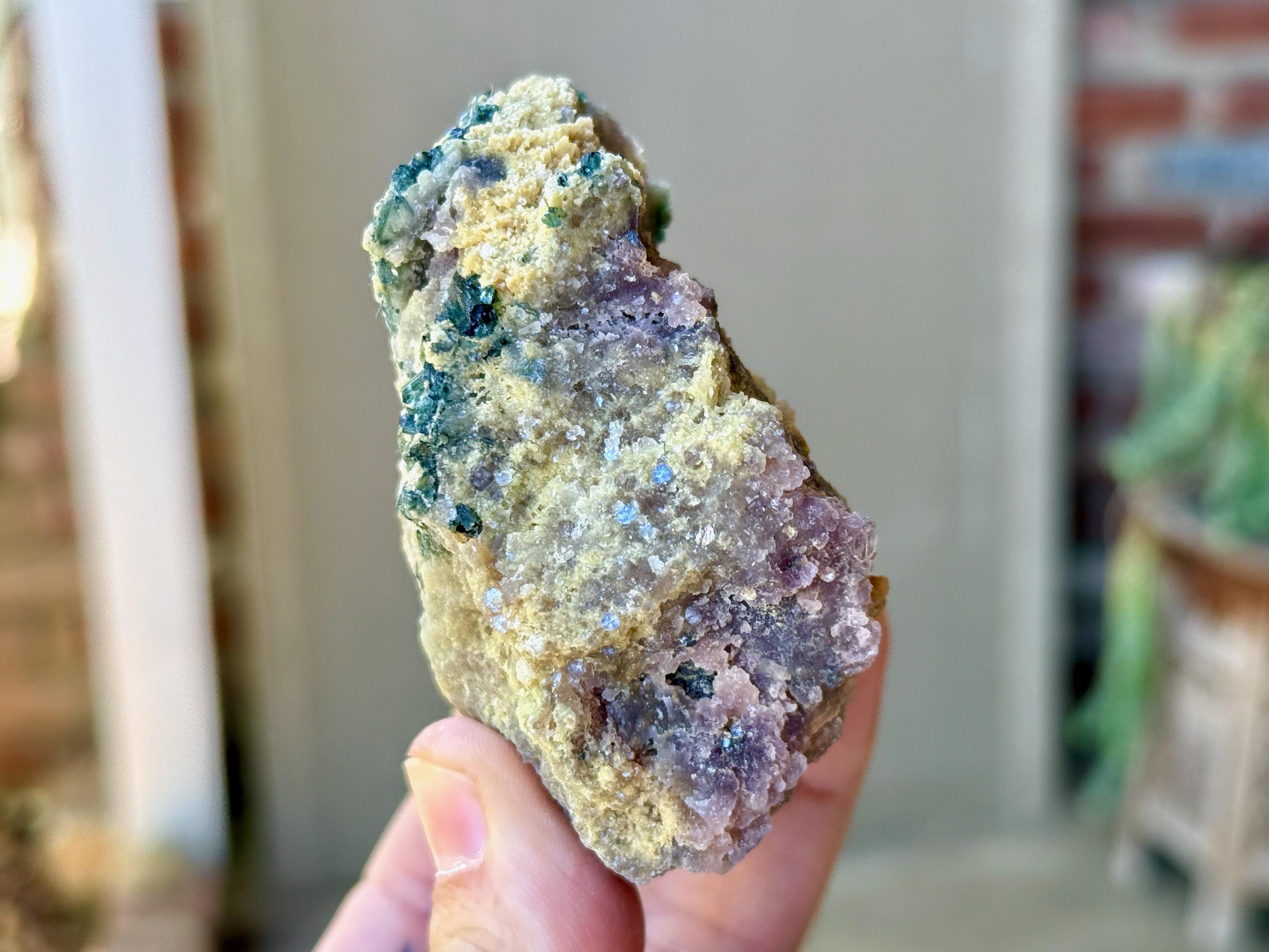 A beautiful combination of colors, textures and minerals in this Unicorn Stone featuring a purple Lepidolite matrix marbled with Golden Mica and Blue-Green Tourmalines embedded throughout!