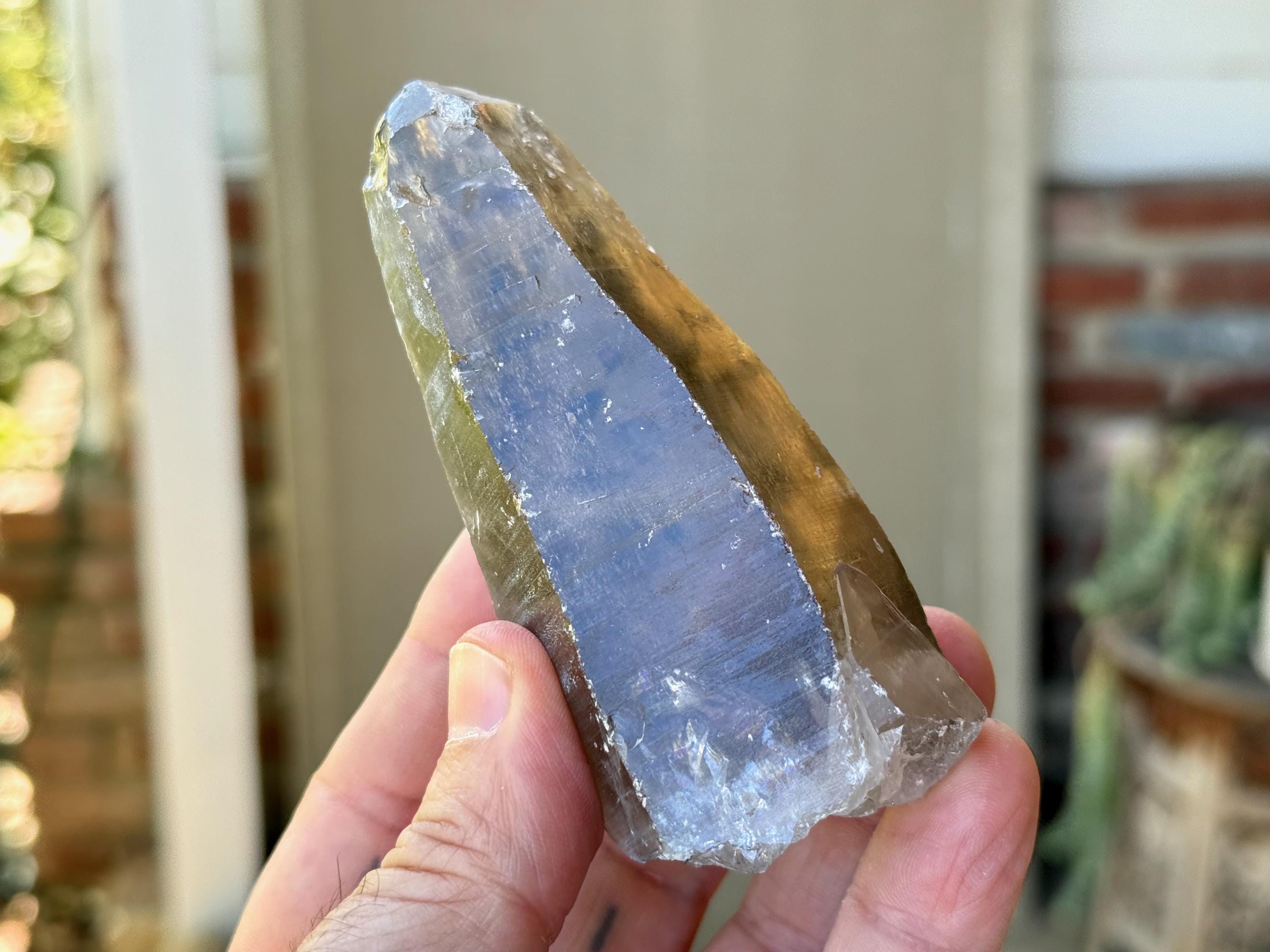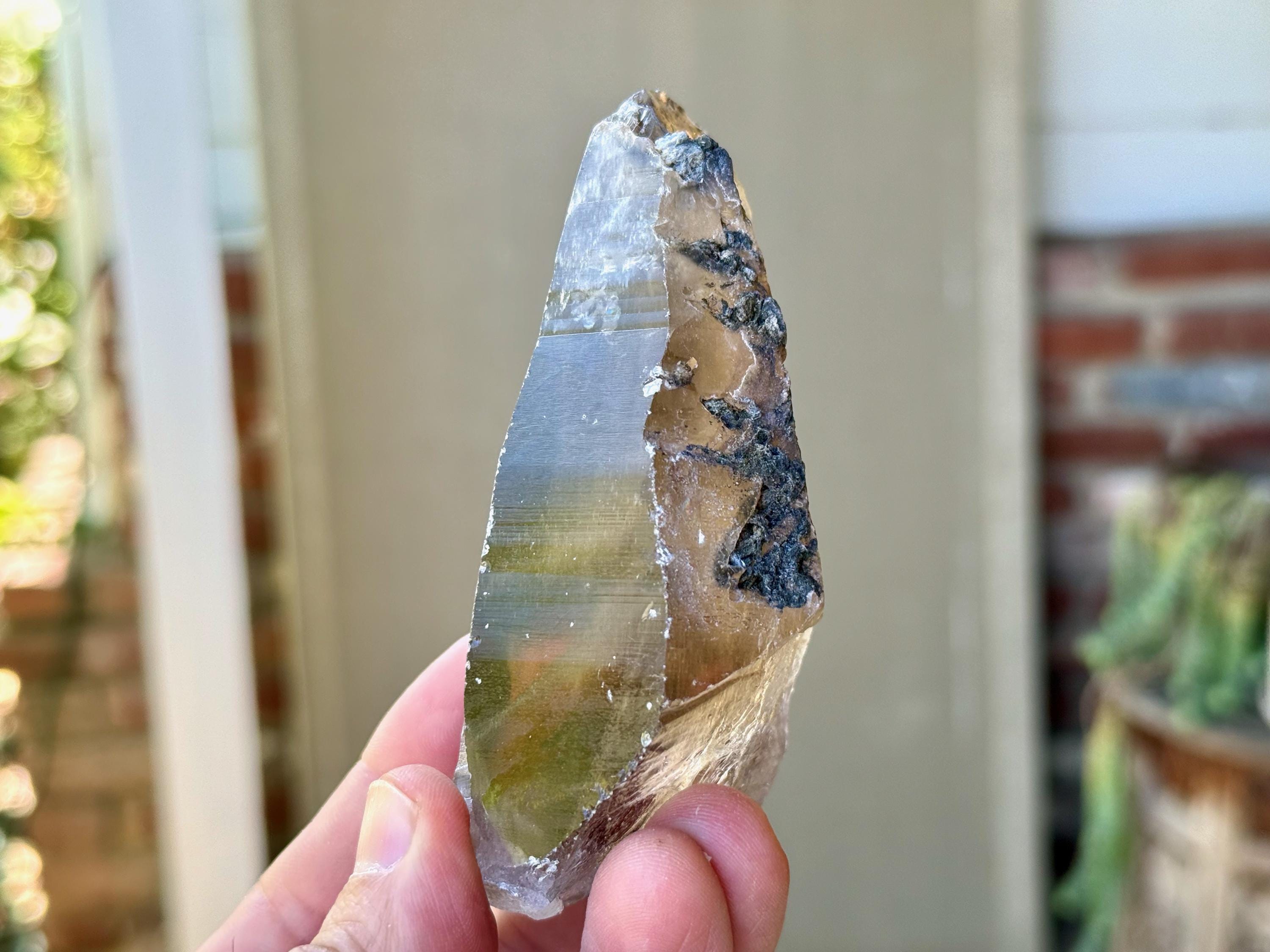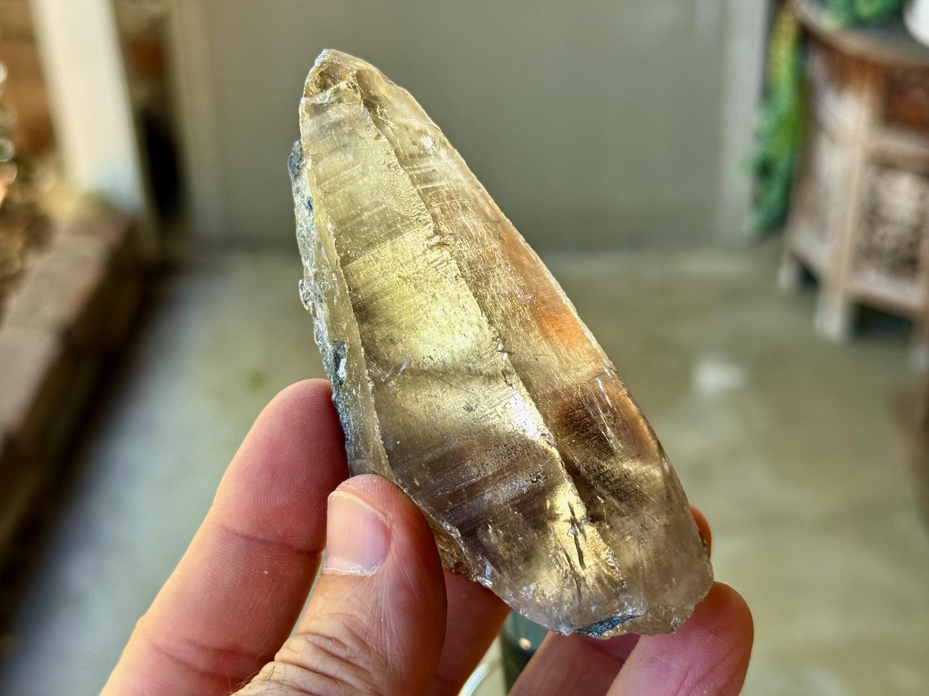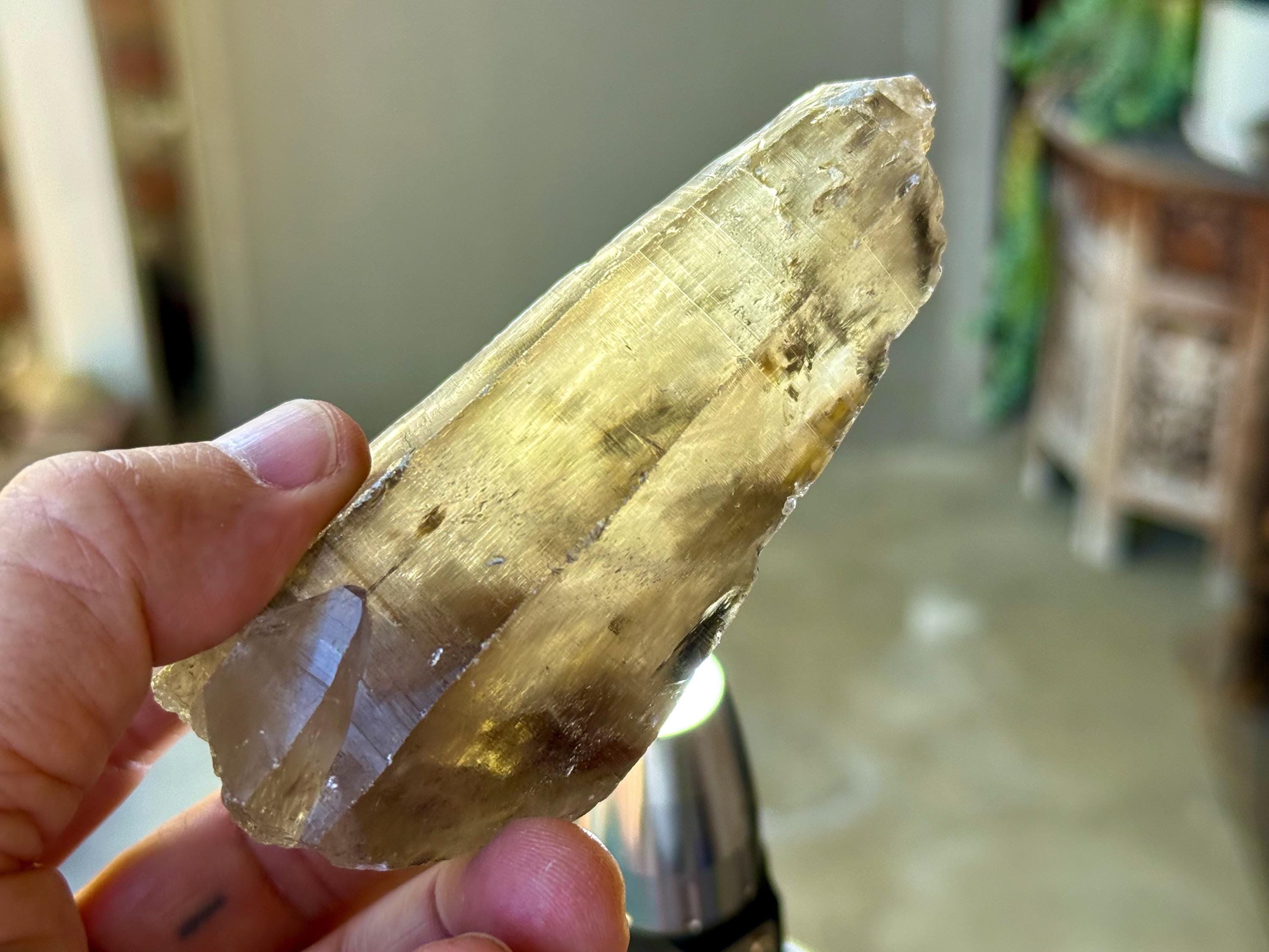 A handsome tapered formation to this Sacred Scribe Lemurian with a deep smoky hue and wonderful luster. This crystal exhibits finely etched Lemurian striations on its sides, and a bit of a black mineral inclusion running up the backside. When backlit, as in Photos 6-8, it lights up brilliantly.