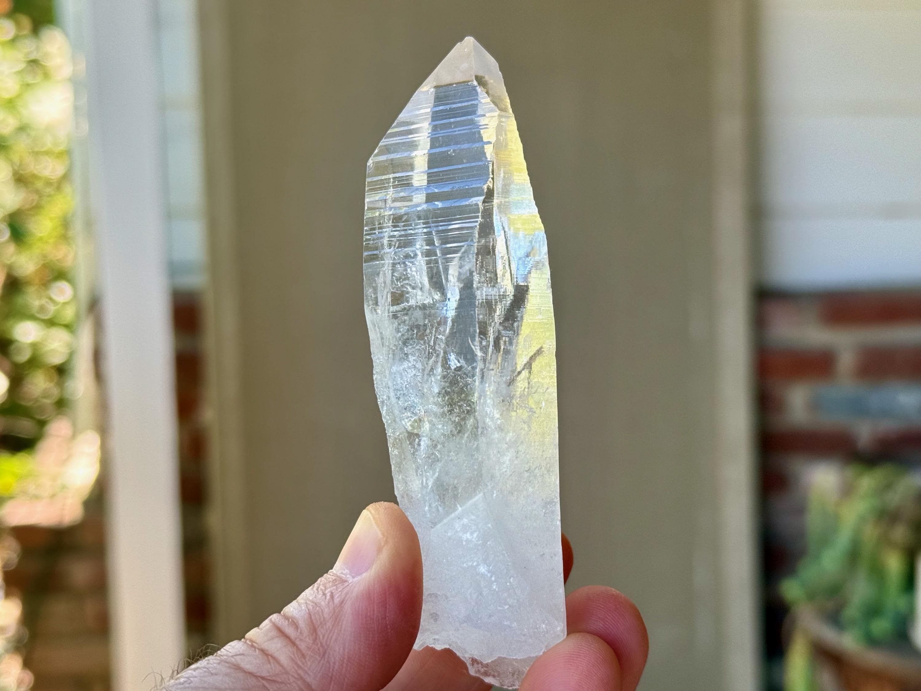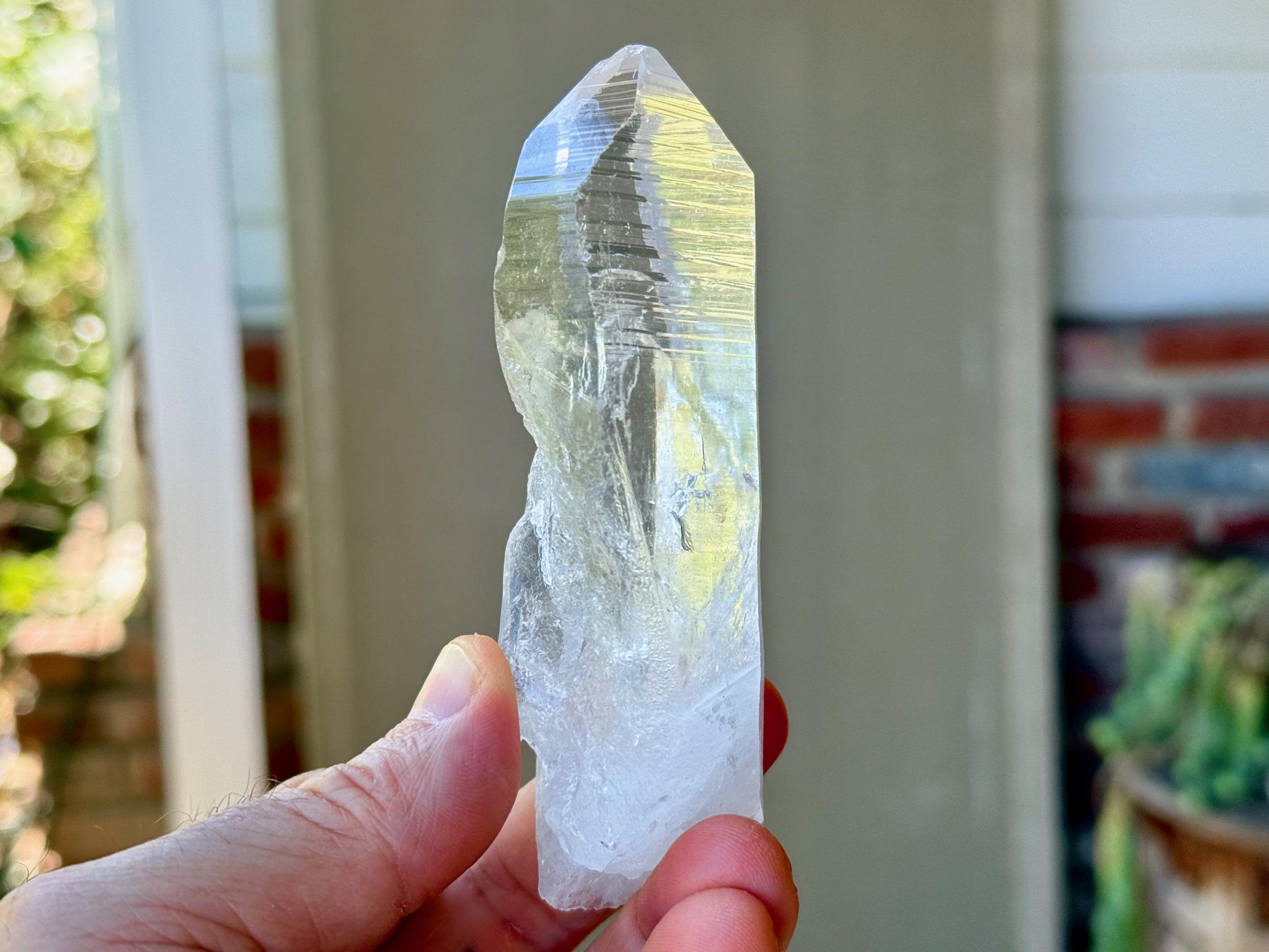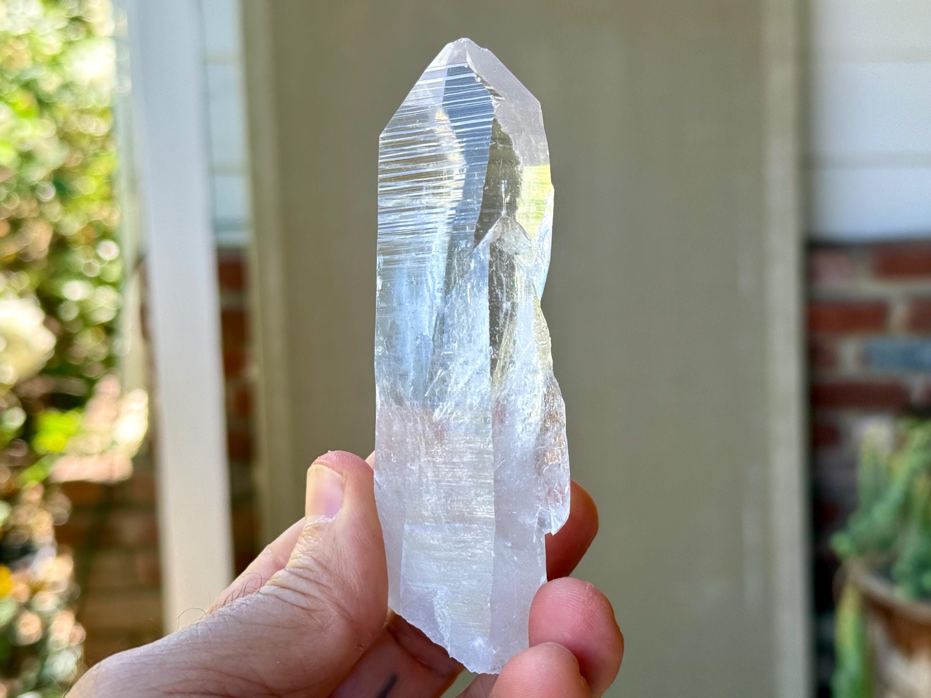 *Please note this crystal is clear and colorless. Any yellow hues seen in the photos are the result of natural sunlight and the surrounding areas reflecting off the crystal itself.