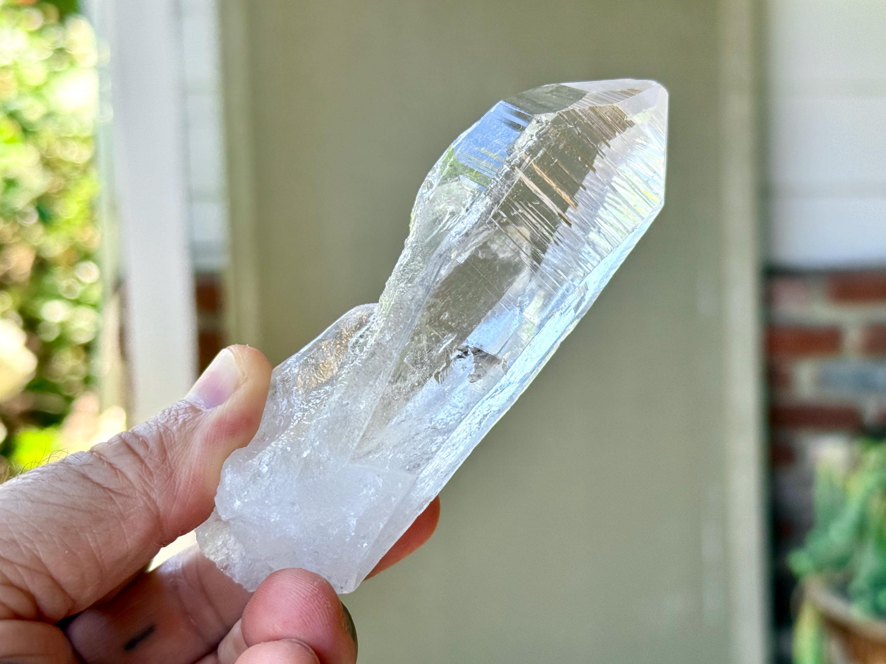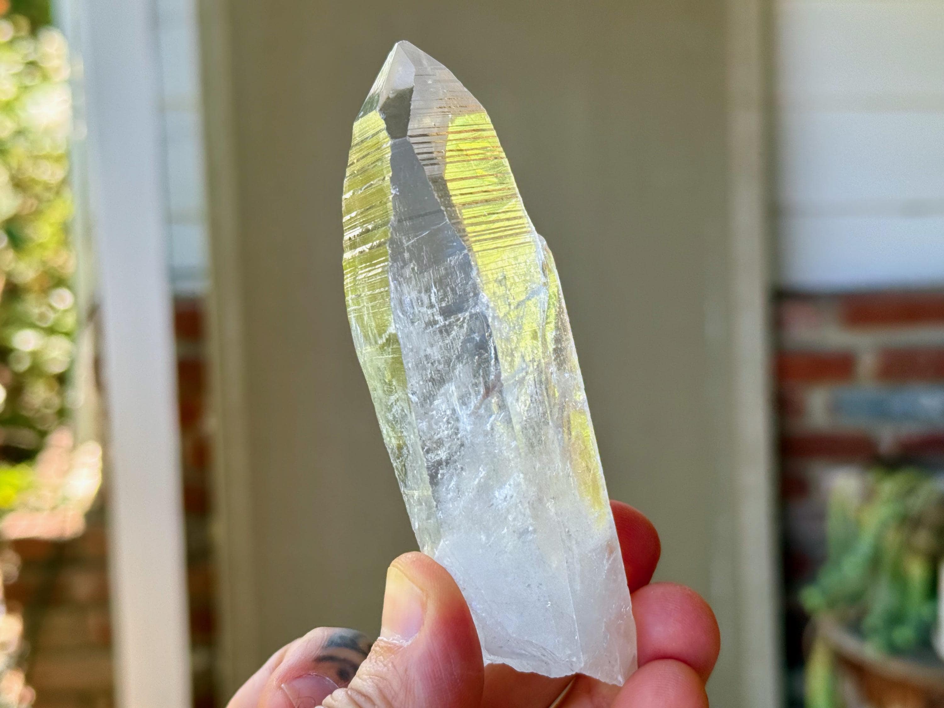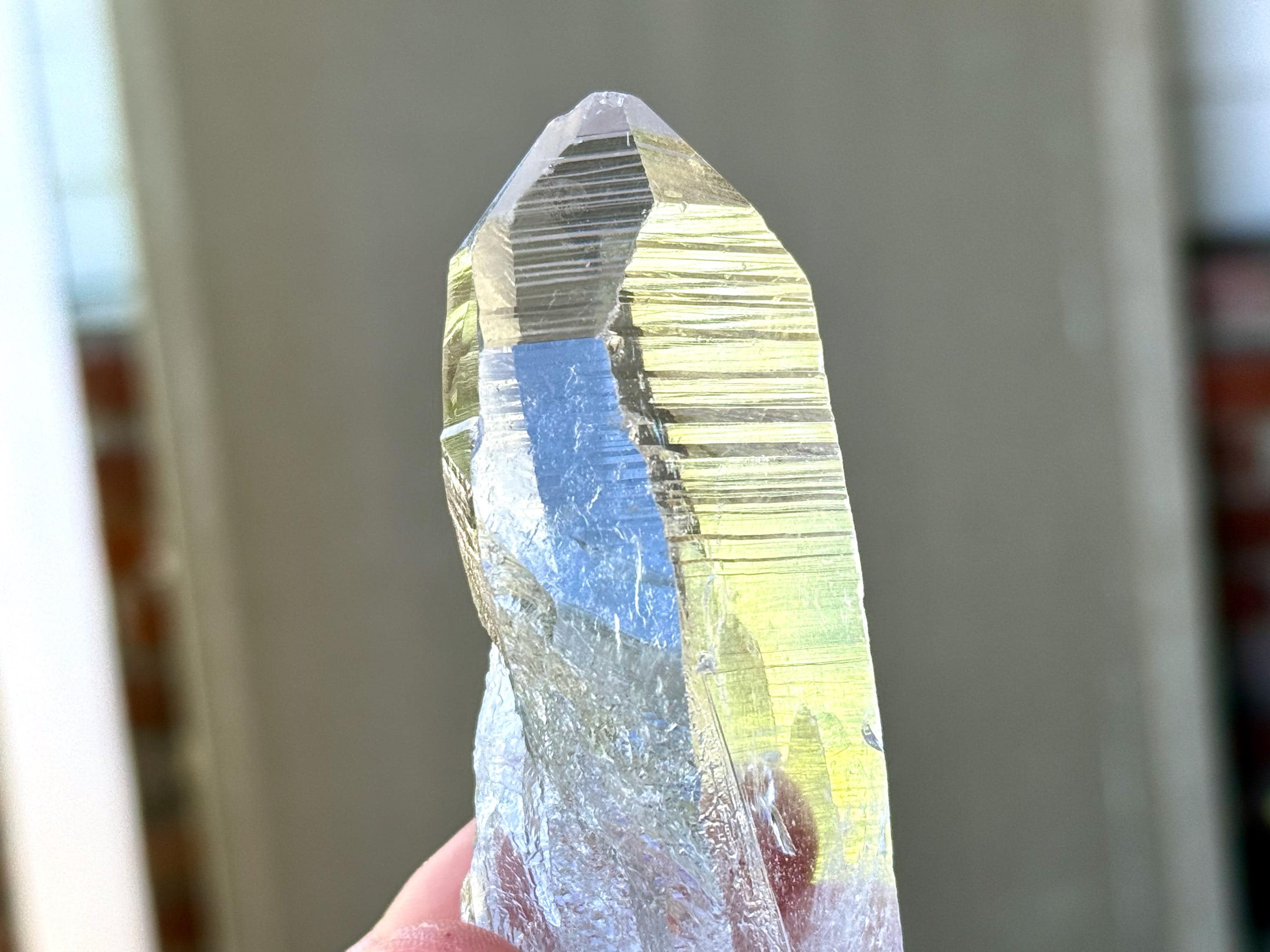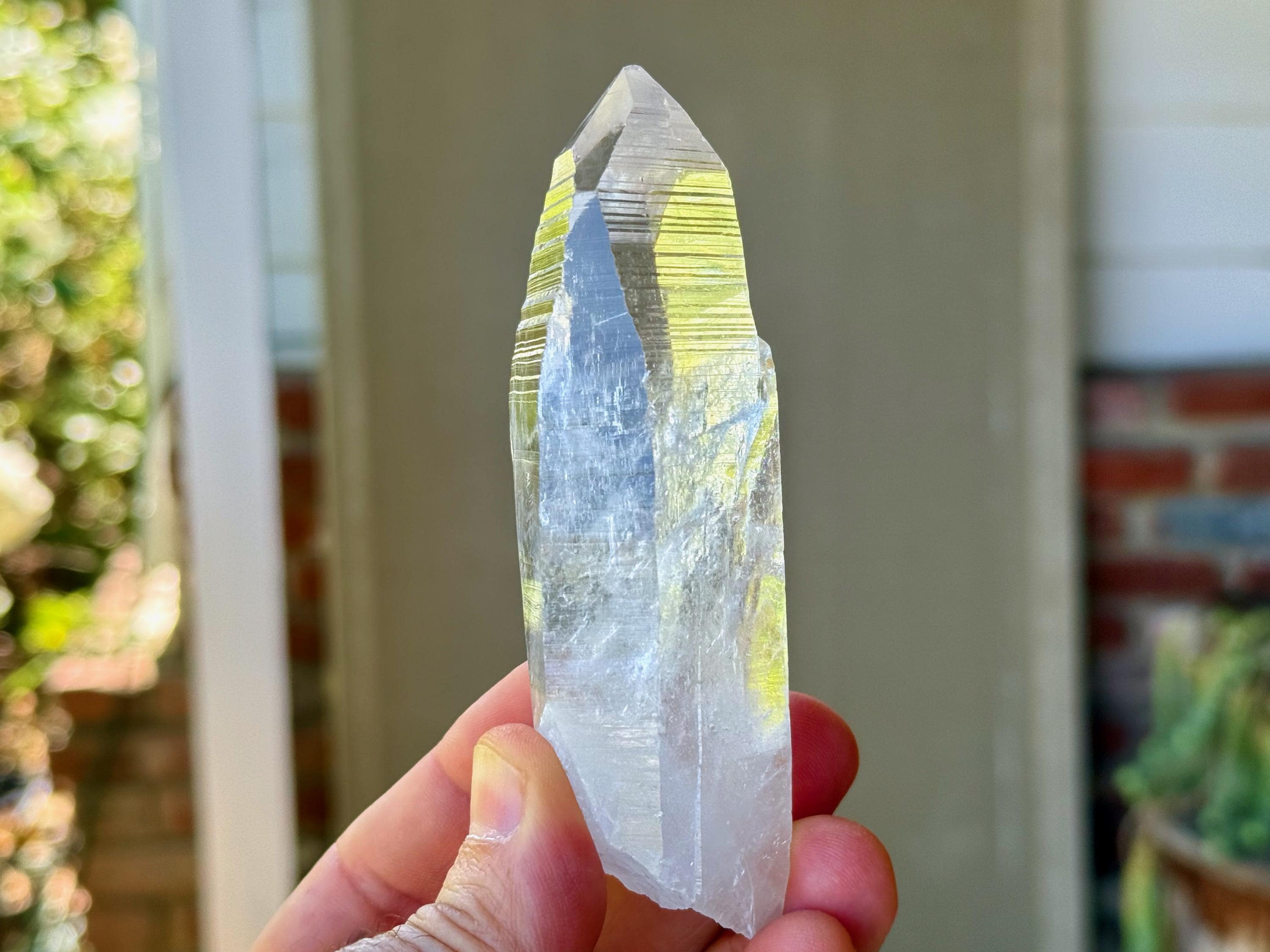 *Please note this crystal is clear and colorless. Any yellow hues seen in the photos are the result of natural sunlight and the surrounding areas reflecting off the crystal itself.