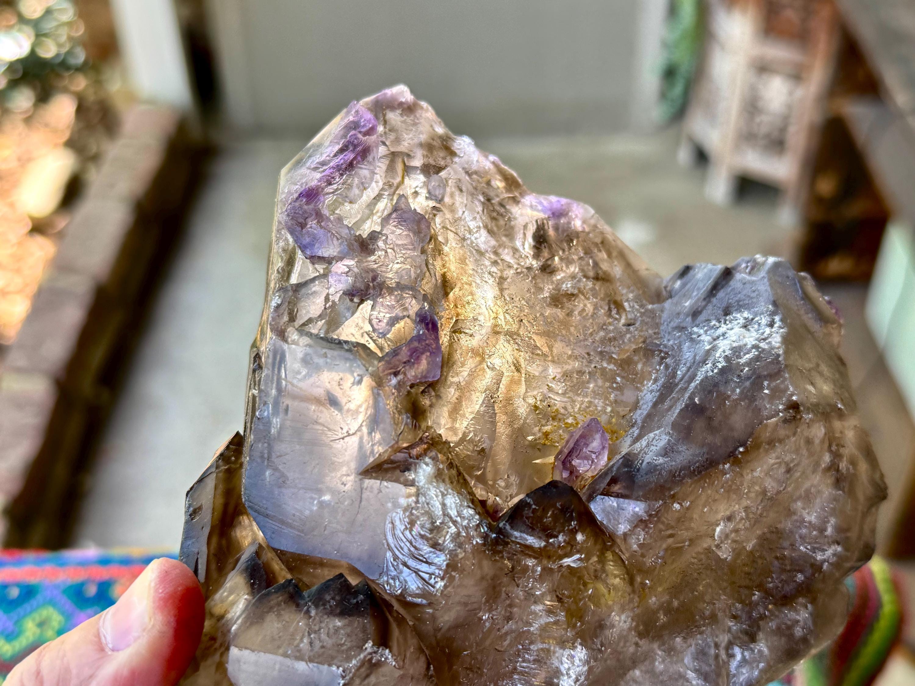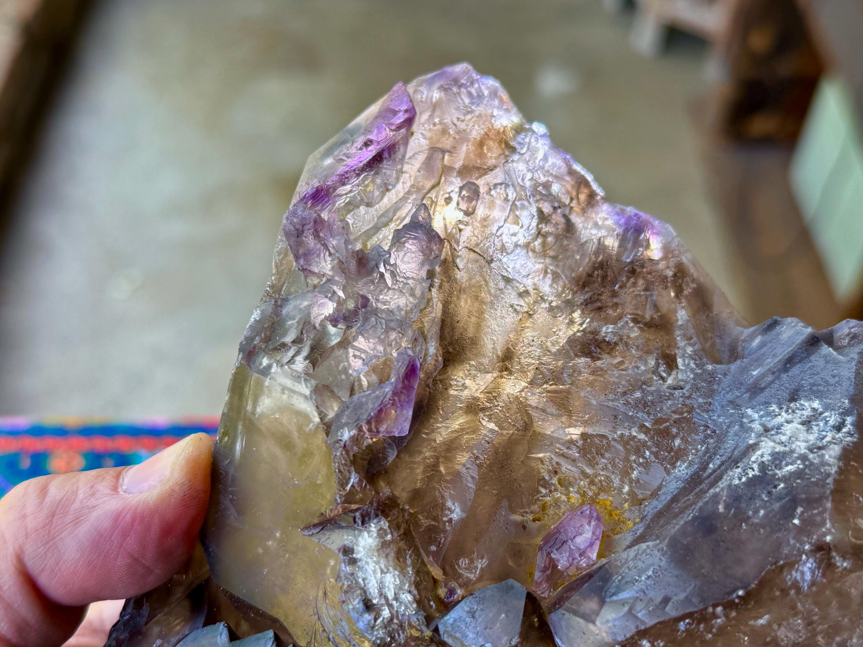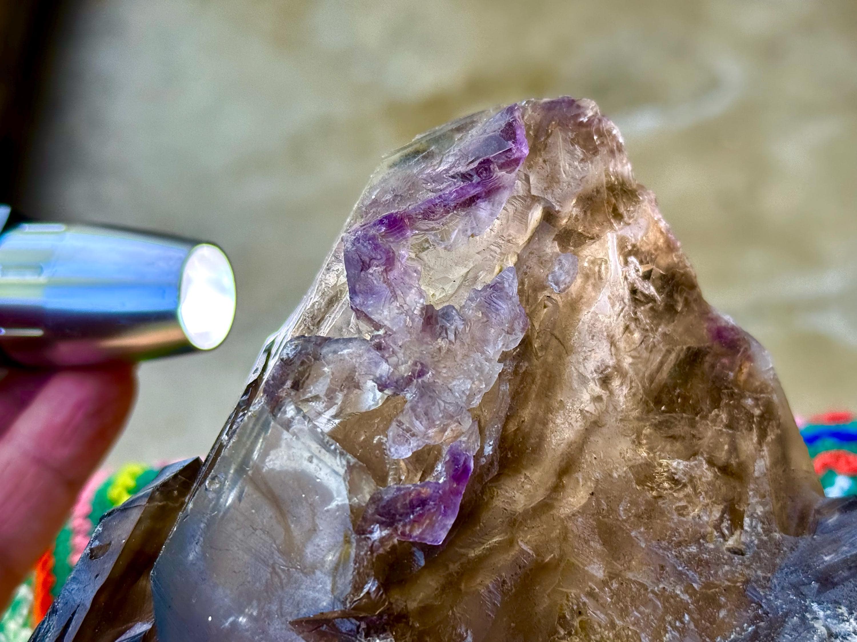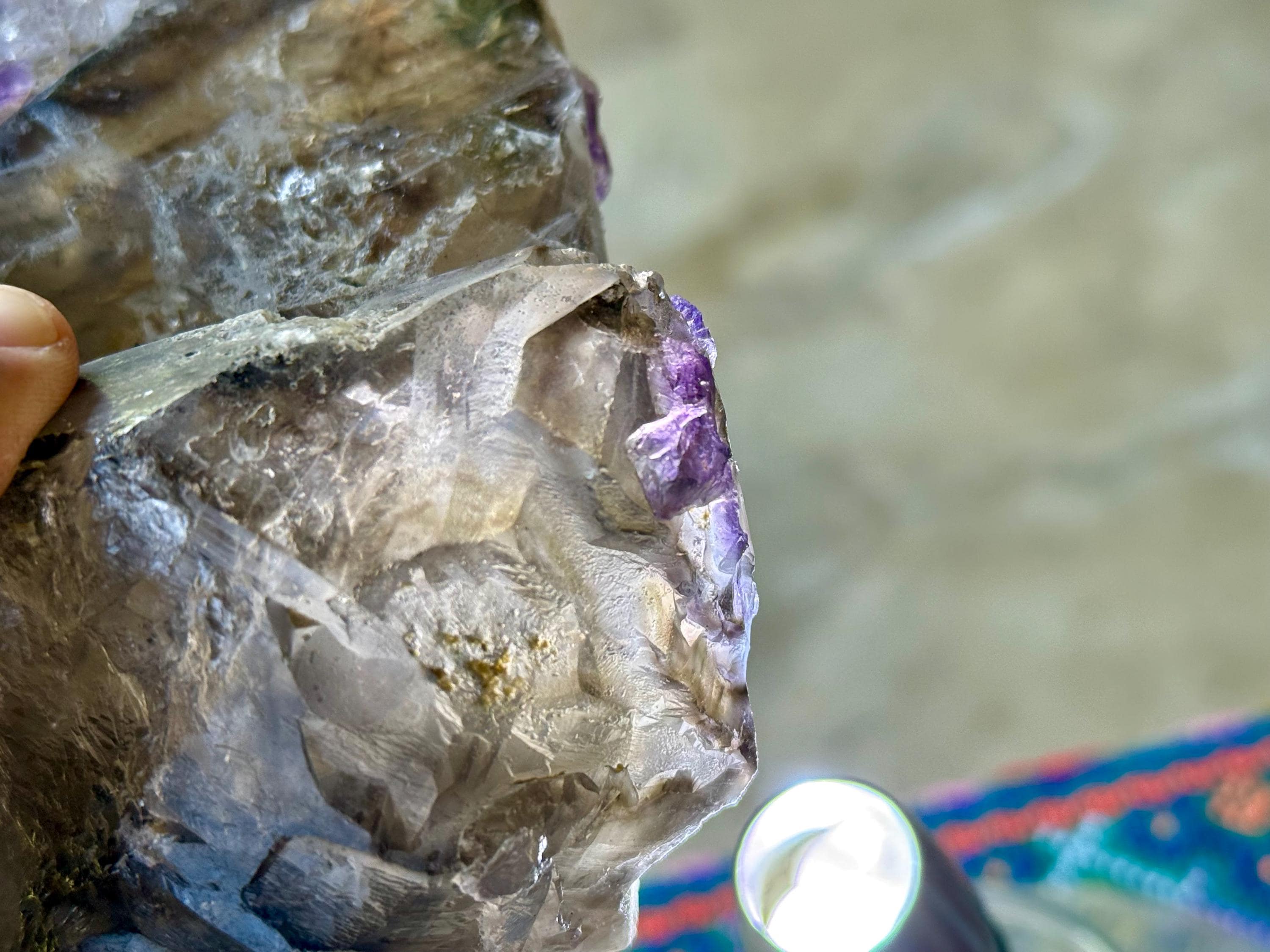 In natural light, we can make out some of the purple Amethyst inclusion throughout this piece, but when backlit, these inclusions come alive in a vibrant way! (Photos 4-9). There is quite a lot of Amethyst in this piece, giving it wonderful color and contrast.