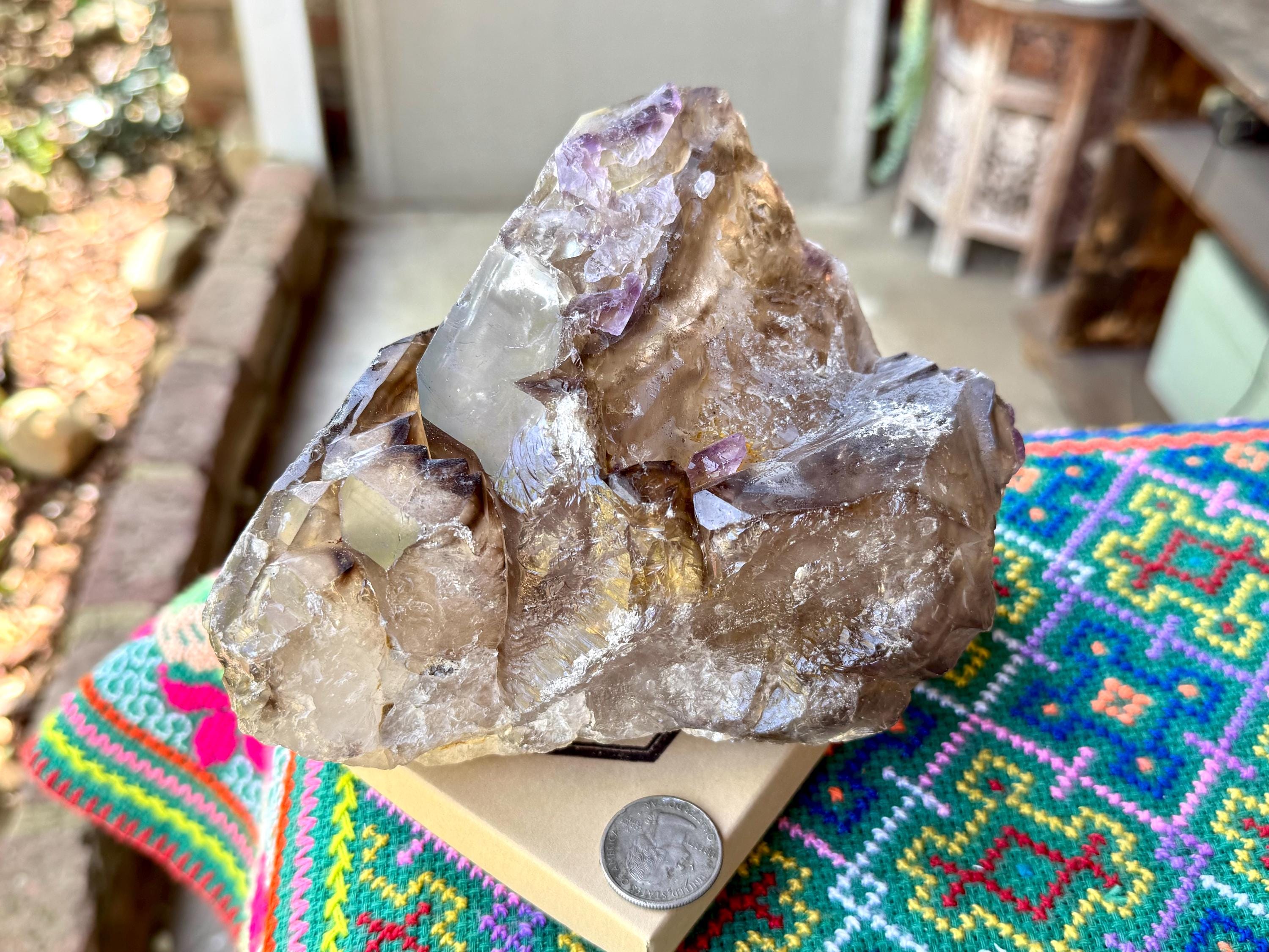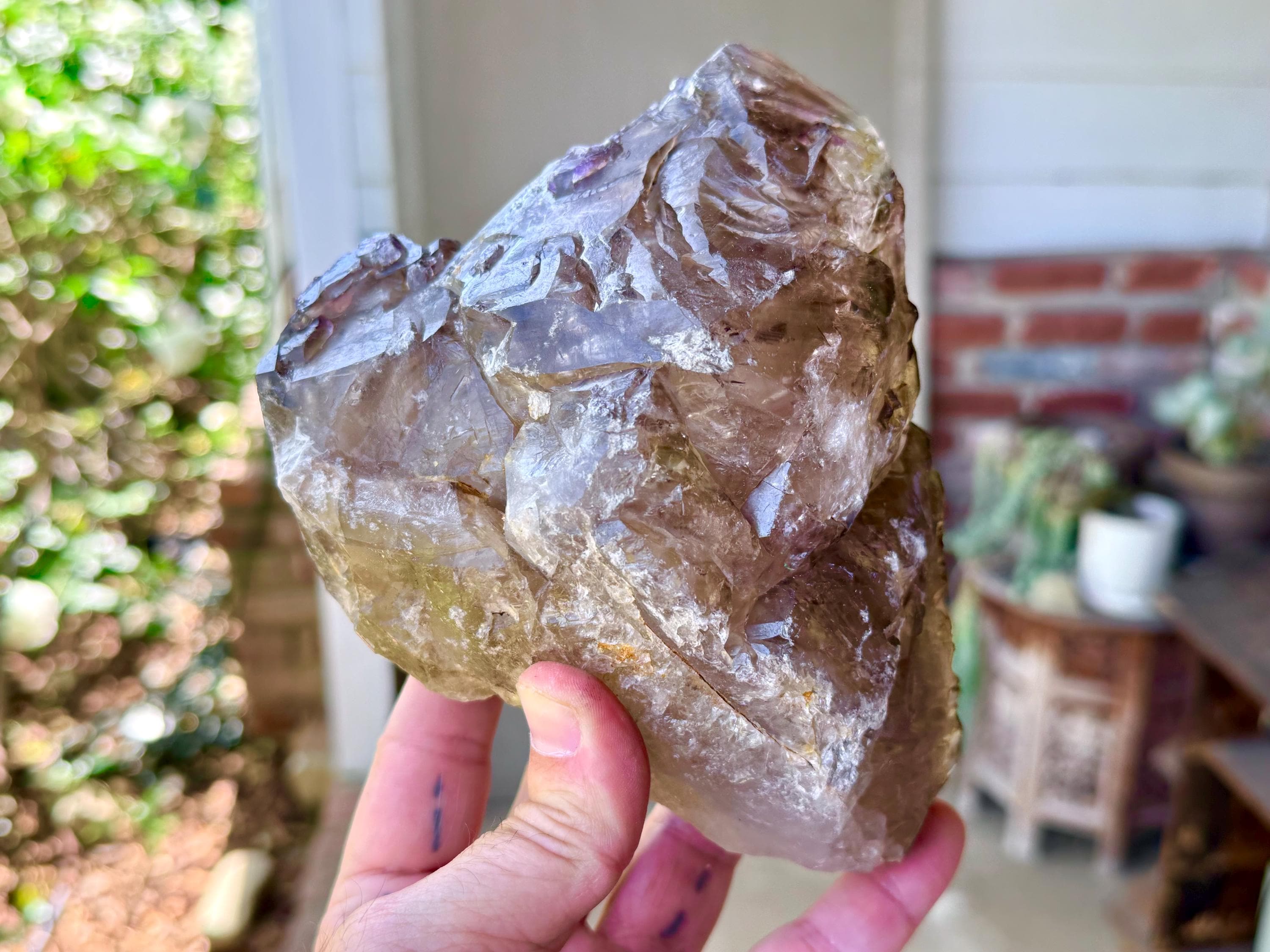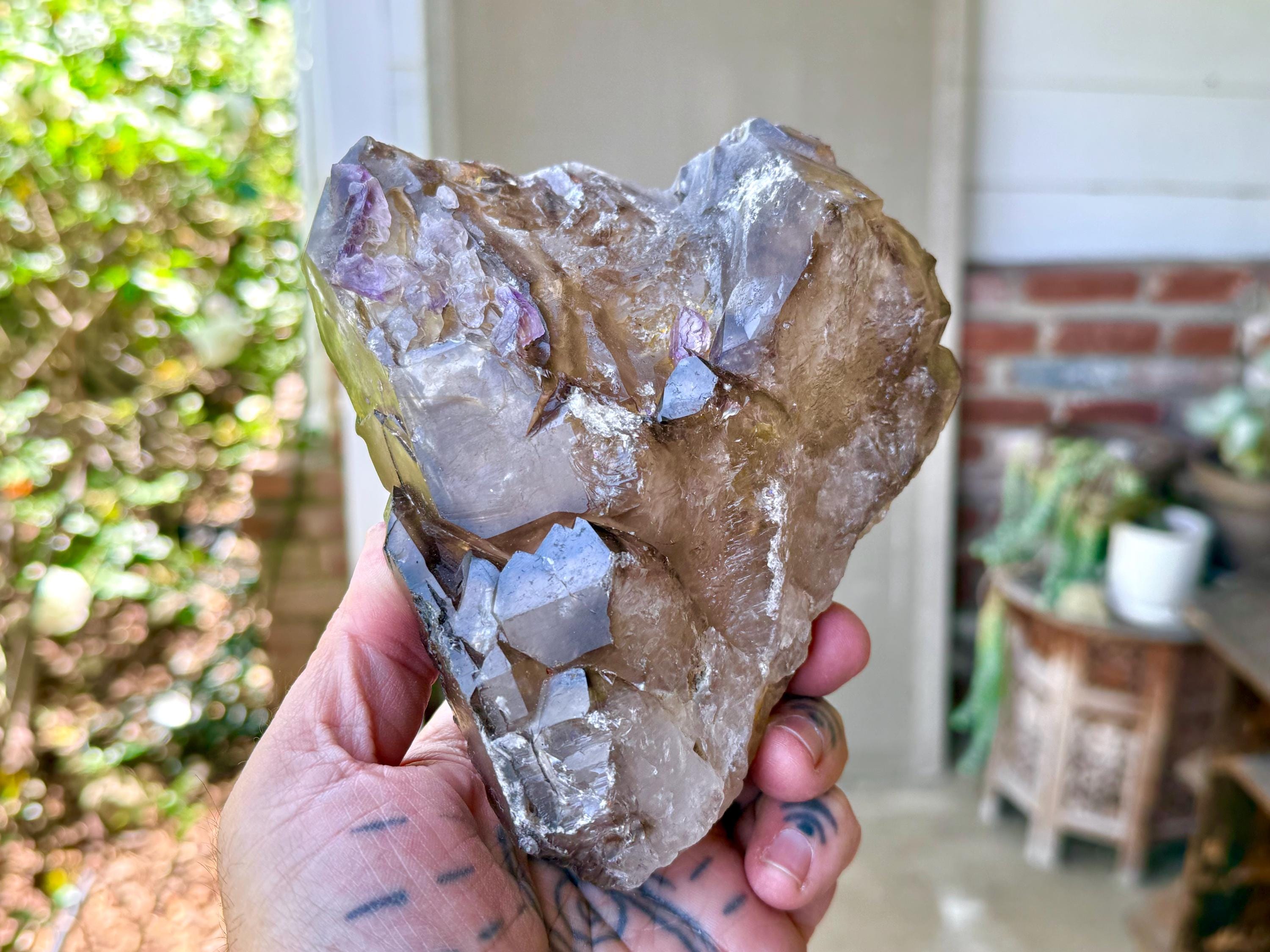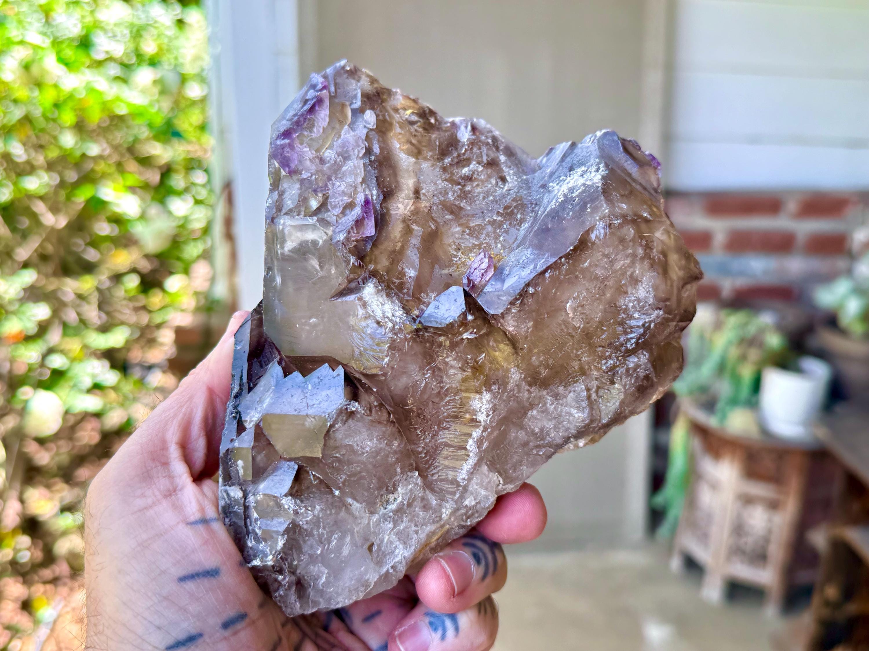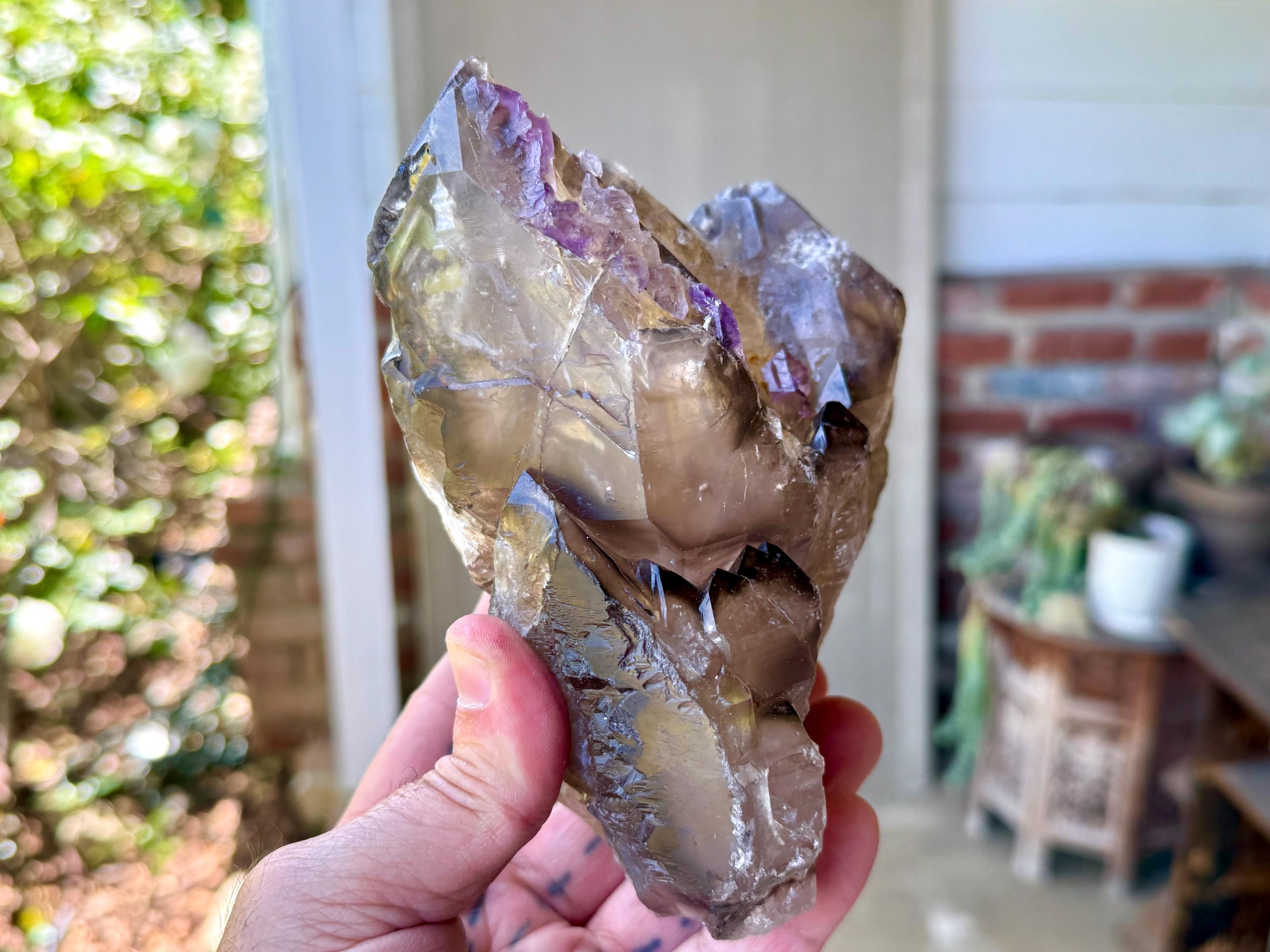 In natural light, we can make out some of the purple Amethyst inclusion throughout this piece, but when backlit, these inclusions come alive in a vibrant way! (Photos 4-9). There is quite a lot of Amethyst in this piece, giving it wonderful color and contrast.