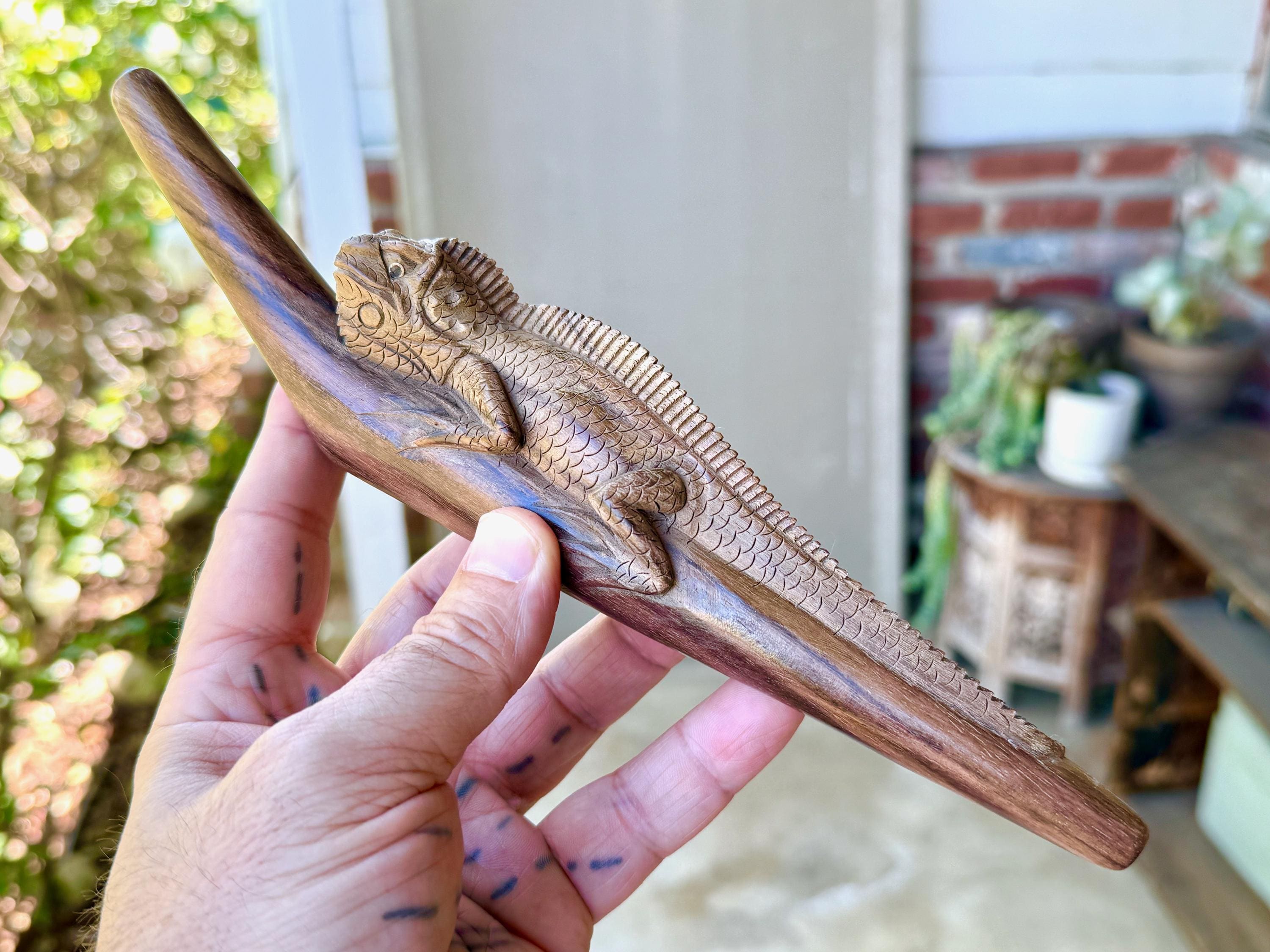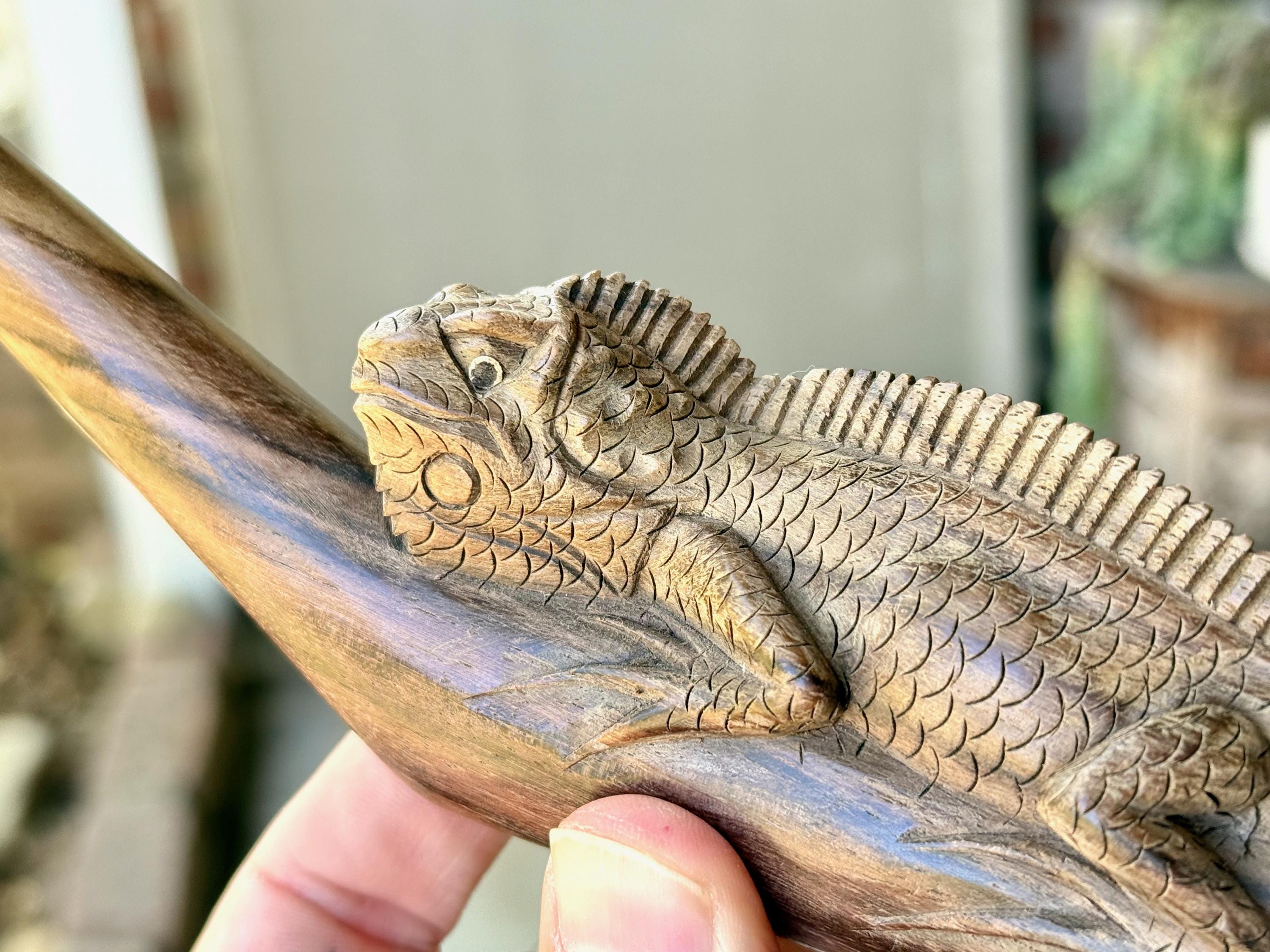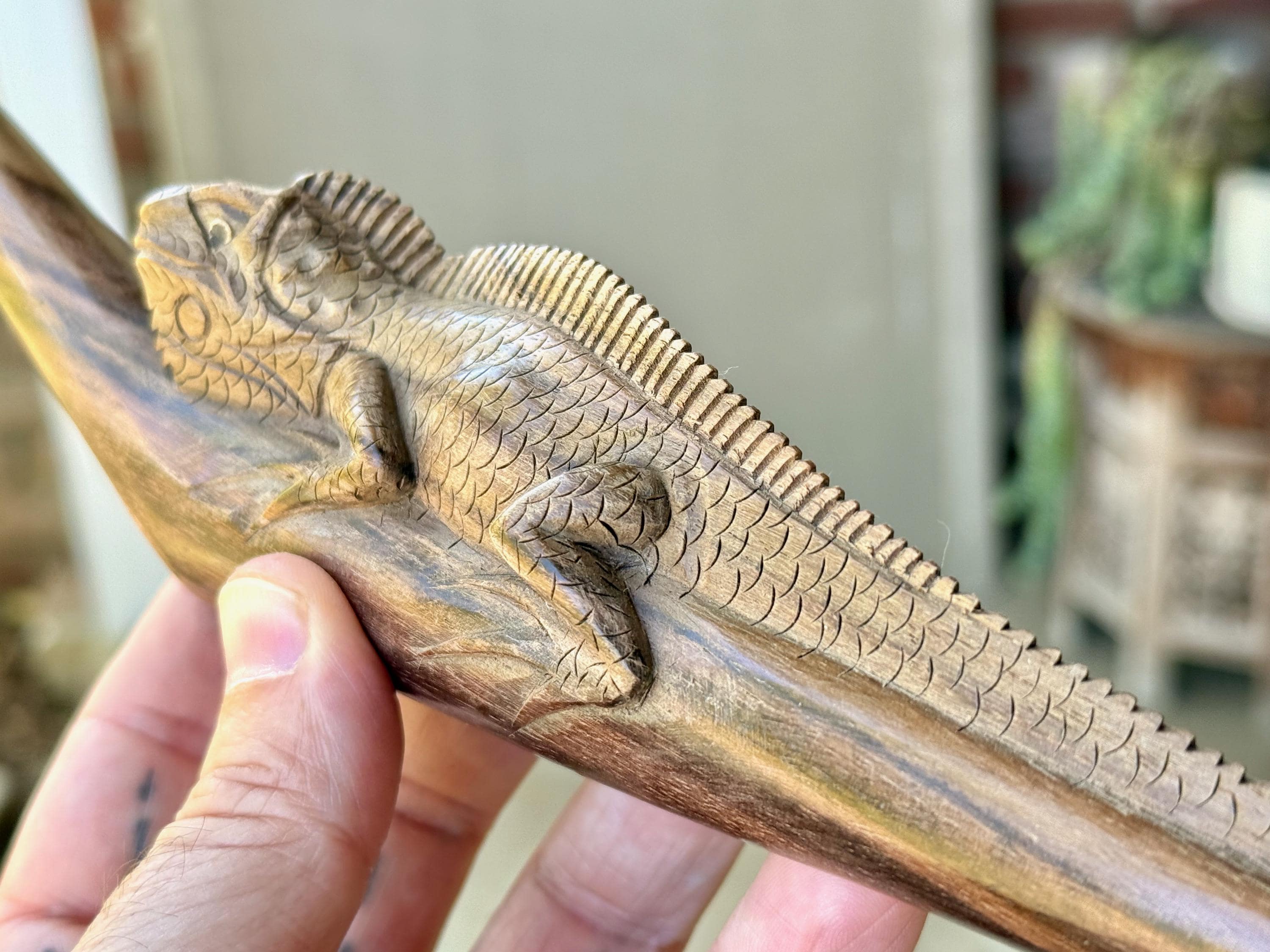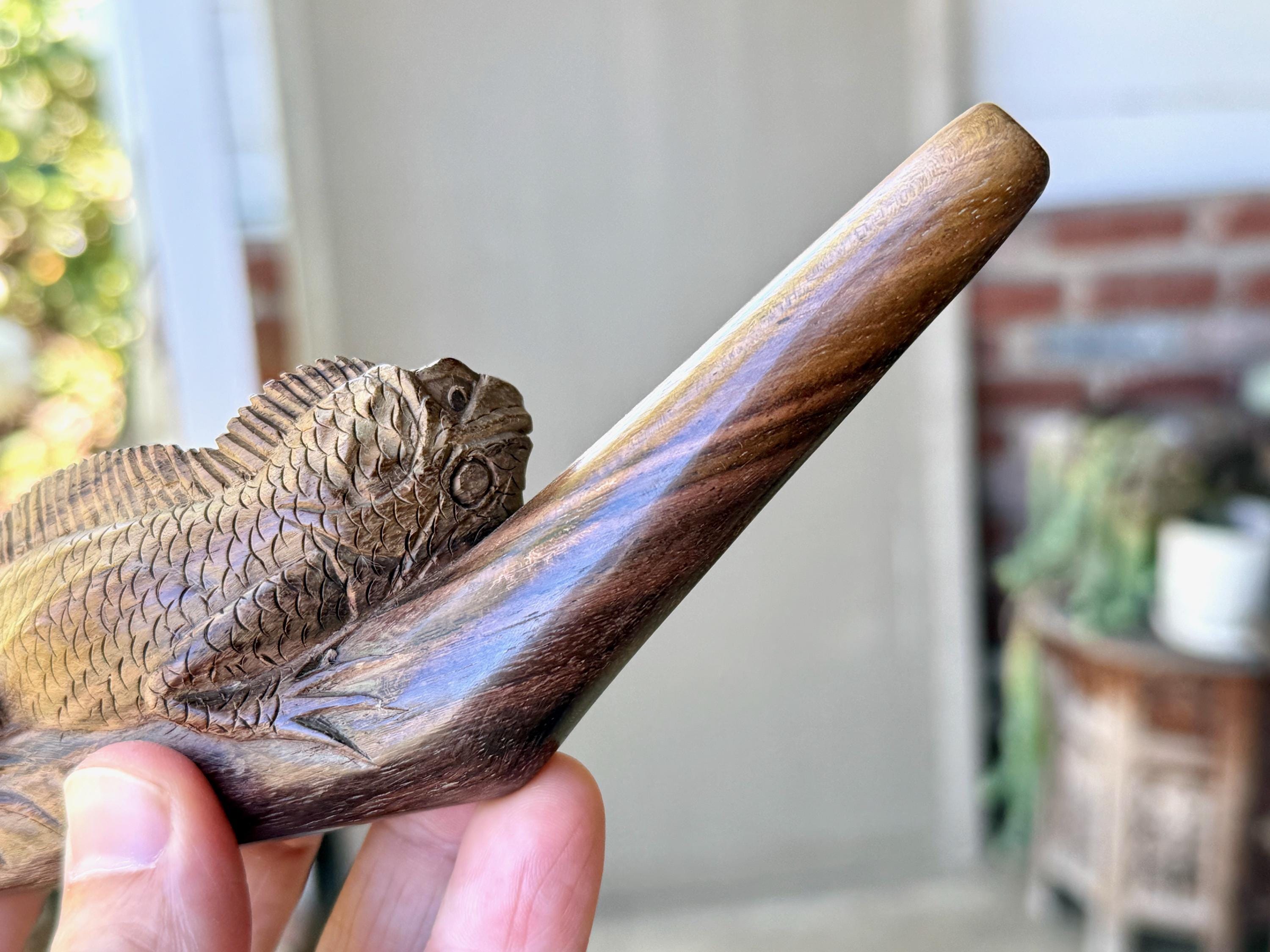 Exquisite attention to detail on this beautiful and elegant Iguana Tepi Pipe! Each scale is carved by hand! We also love the tone and grain of the tropical hardwood, it's beautiful. Great airflow and aesthetic beauty to this ceremonial pipe.