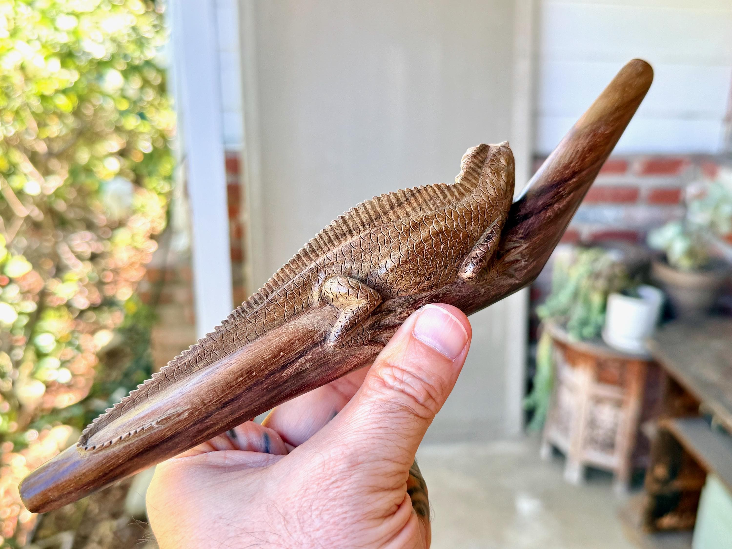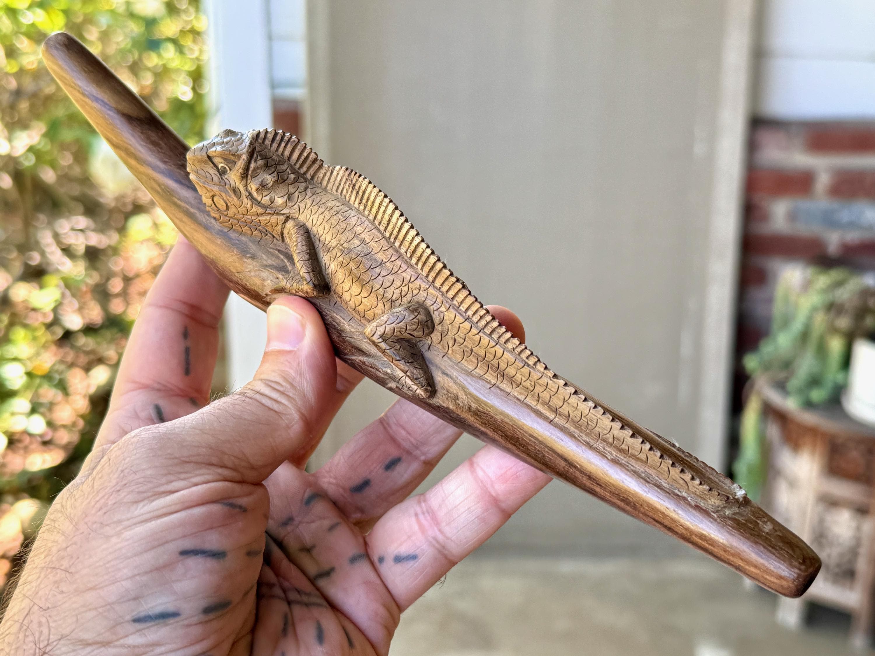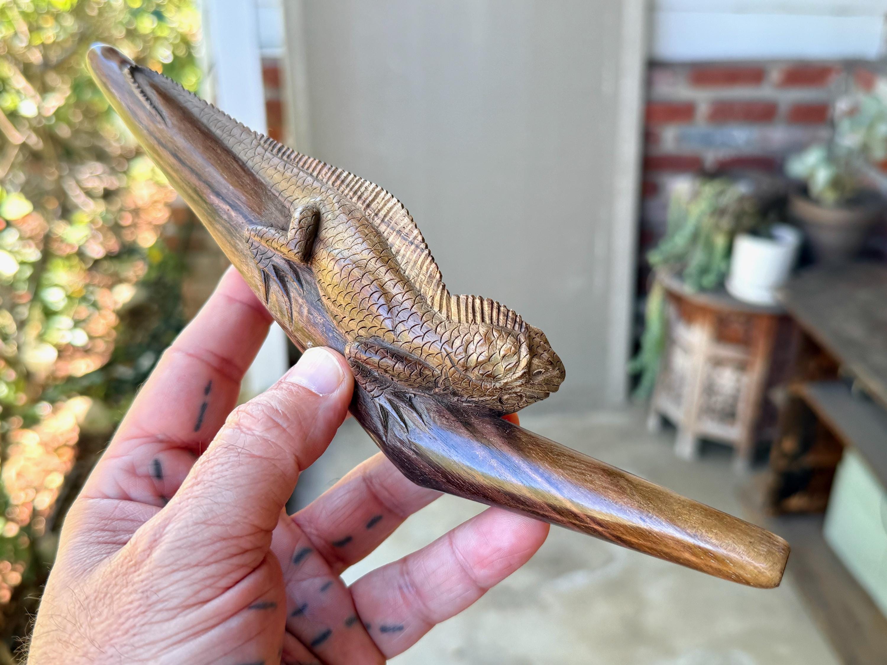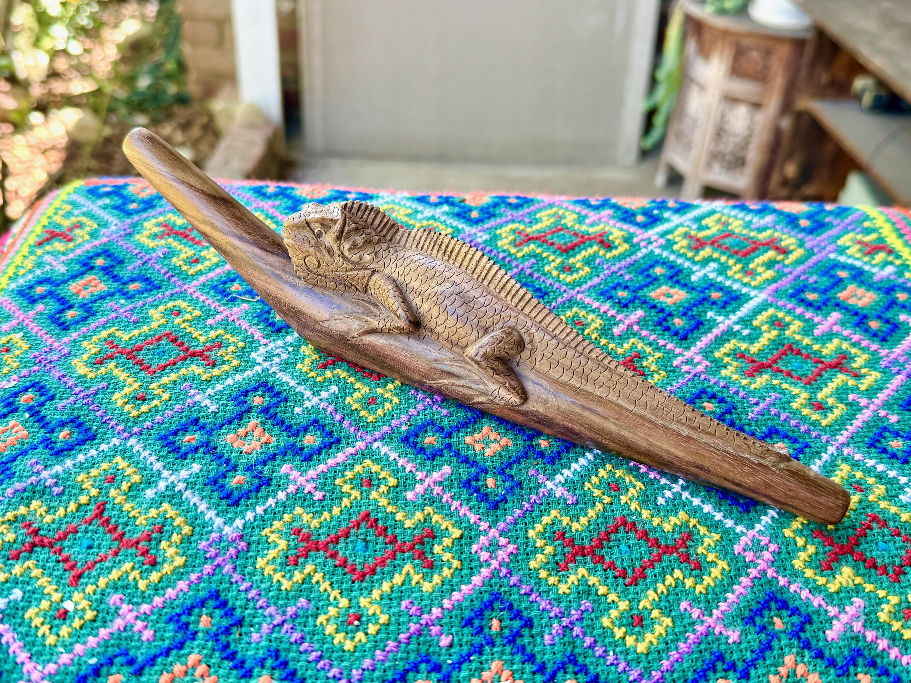This handsome Iguana Tepi Pipe — for administering hapé — was hand carved from native, tropical hardwood.