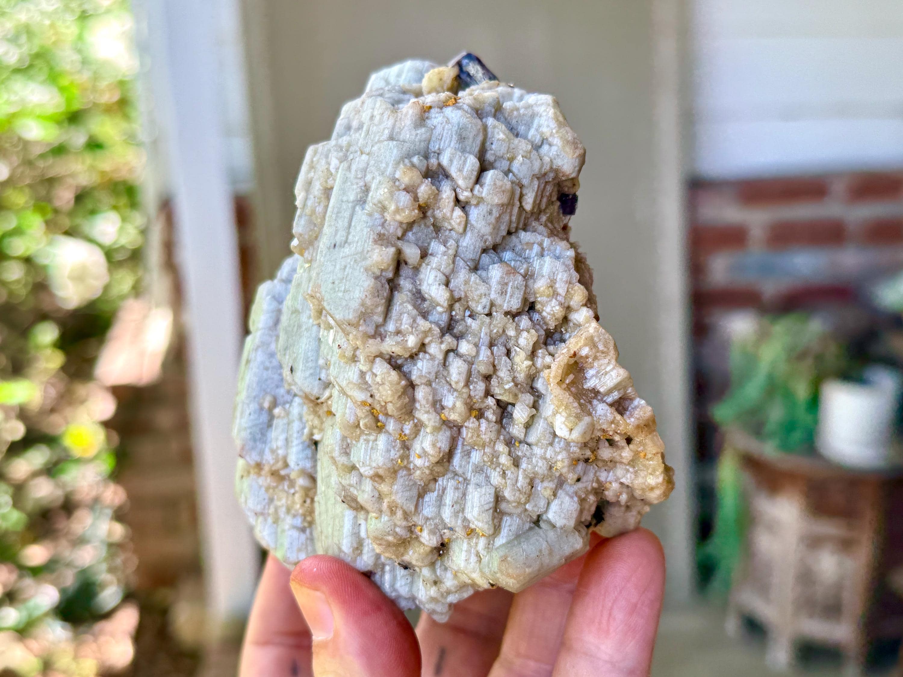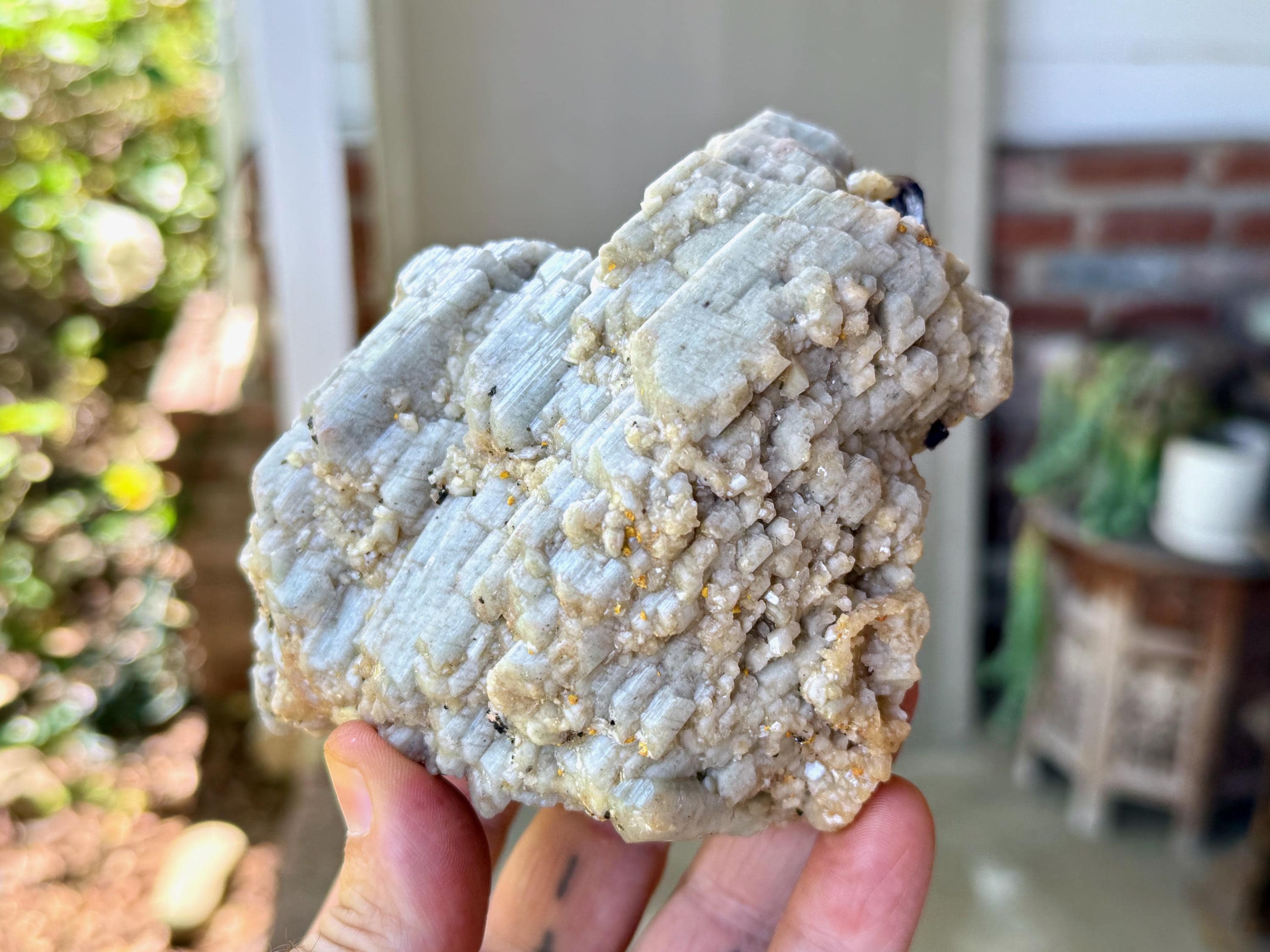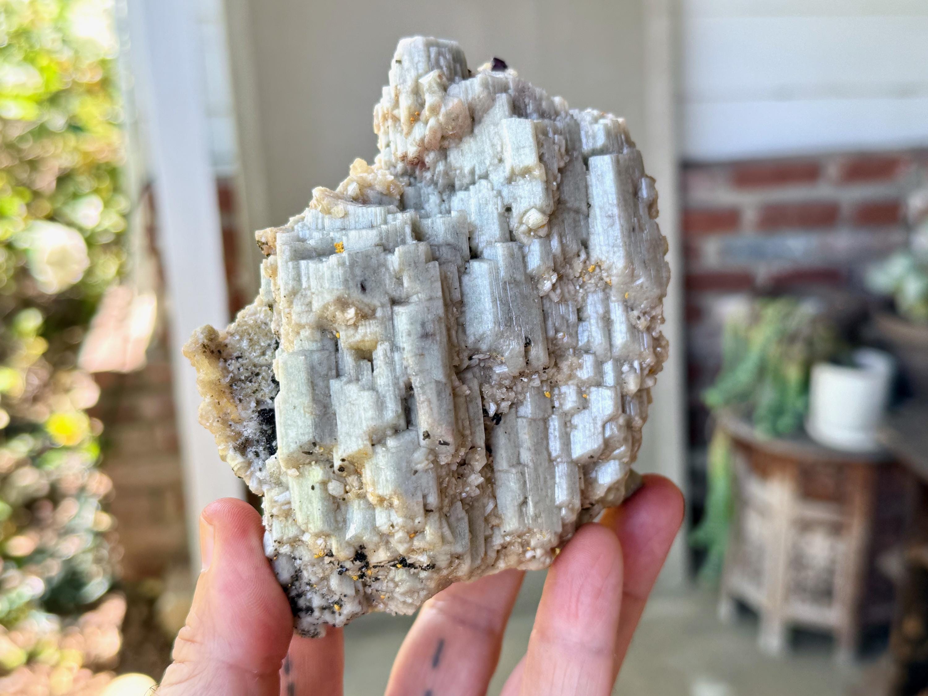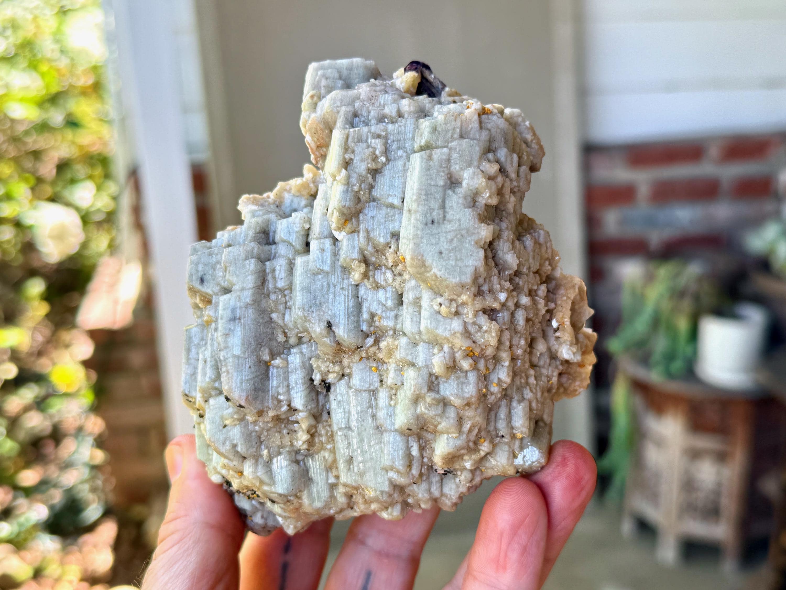 This piece has all the characteristics we seek in a display piece. The first thing that strikes us is the gorgeous formation of the Orthoclase itself, lustrous and pale blue-grey, and presenting in a gorgeous layered, cubic formation. Layered atop the gray Orthoclase in some areas (mostly on the backside) we see inclusions of Golden Mica.