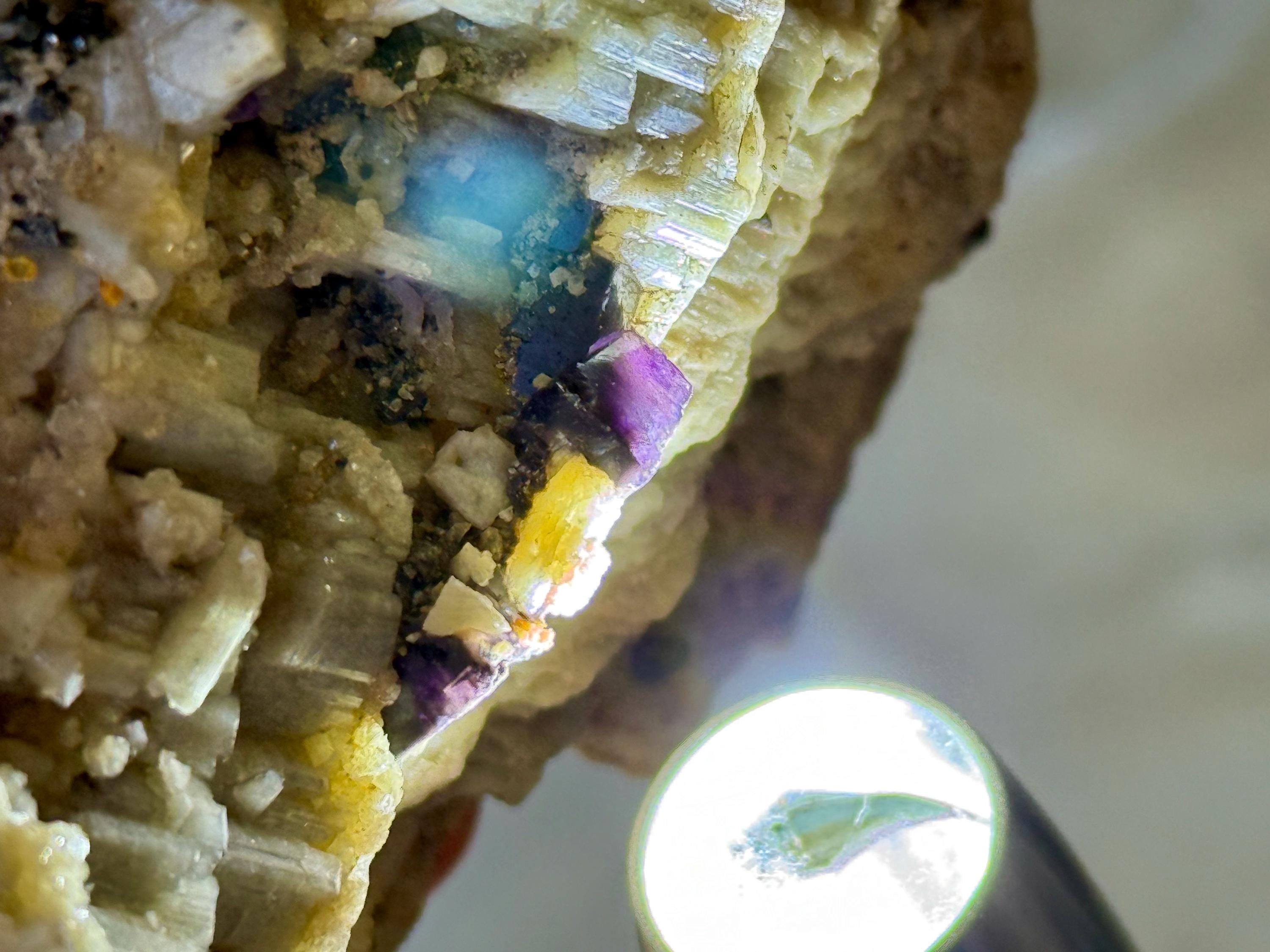 But perhaps the most unique and unusual inclusion we see here are "barnacles" of Purple Fluorite. These Purple Fluorite inclusions appear quite dark in normal light, but backlight a few and you'll see their gemmy color and translucency come to life (see Photos 4-5).