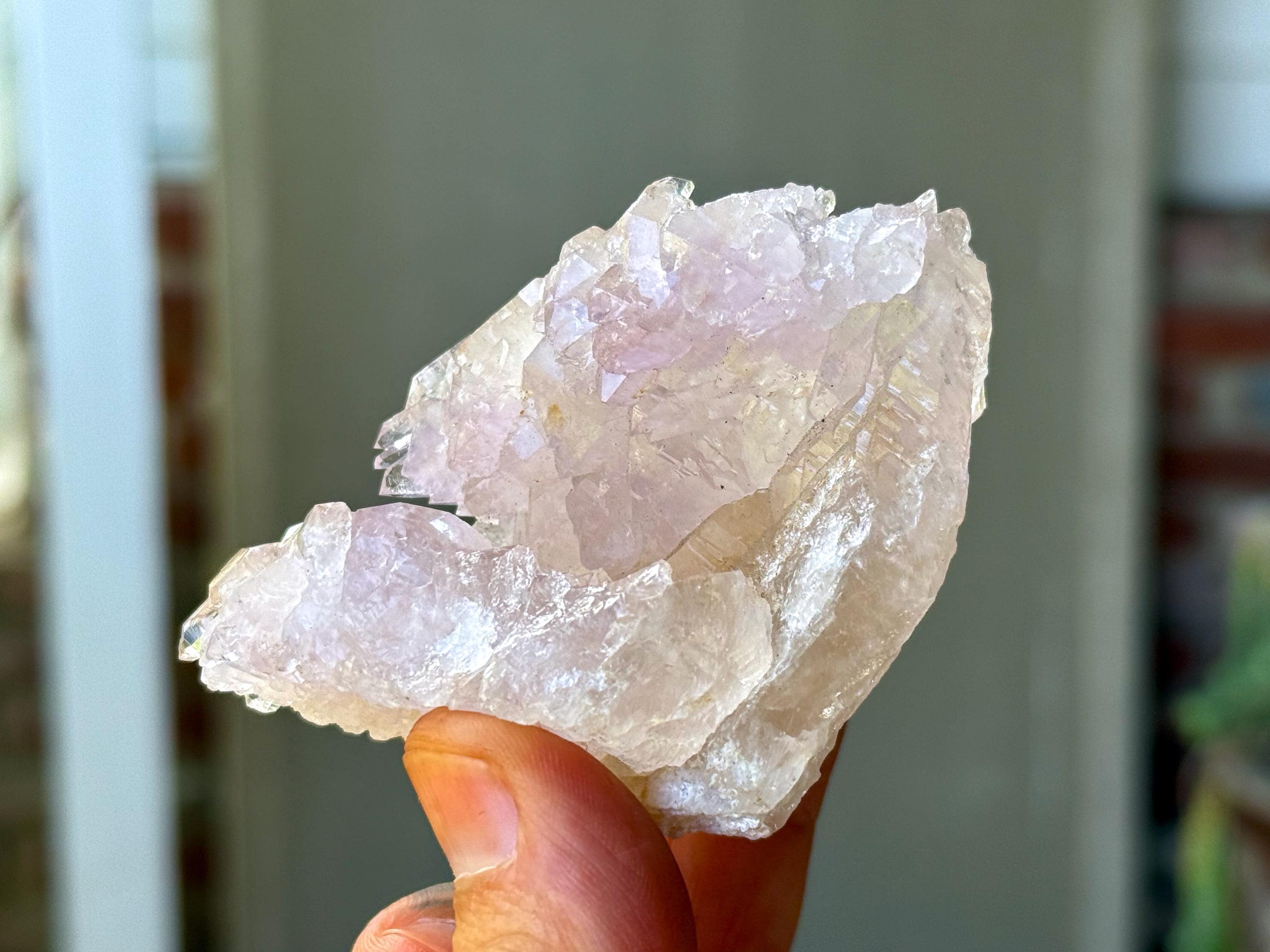 This is a very unique formation, as it is essentially two separate Canga Rose Quartz crystals grown together and actually facing each other with a crevice in the center. The color is mild pink and highly lustrous, with an array of small Elestial facets. When backlit, as in Photos 5-6, it passes light beautifully.