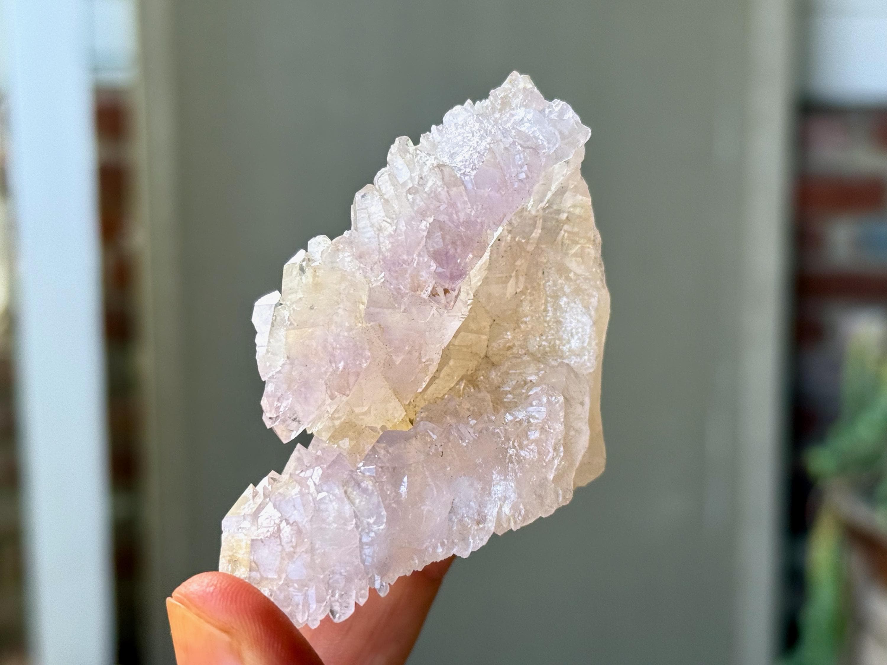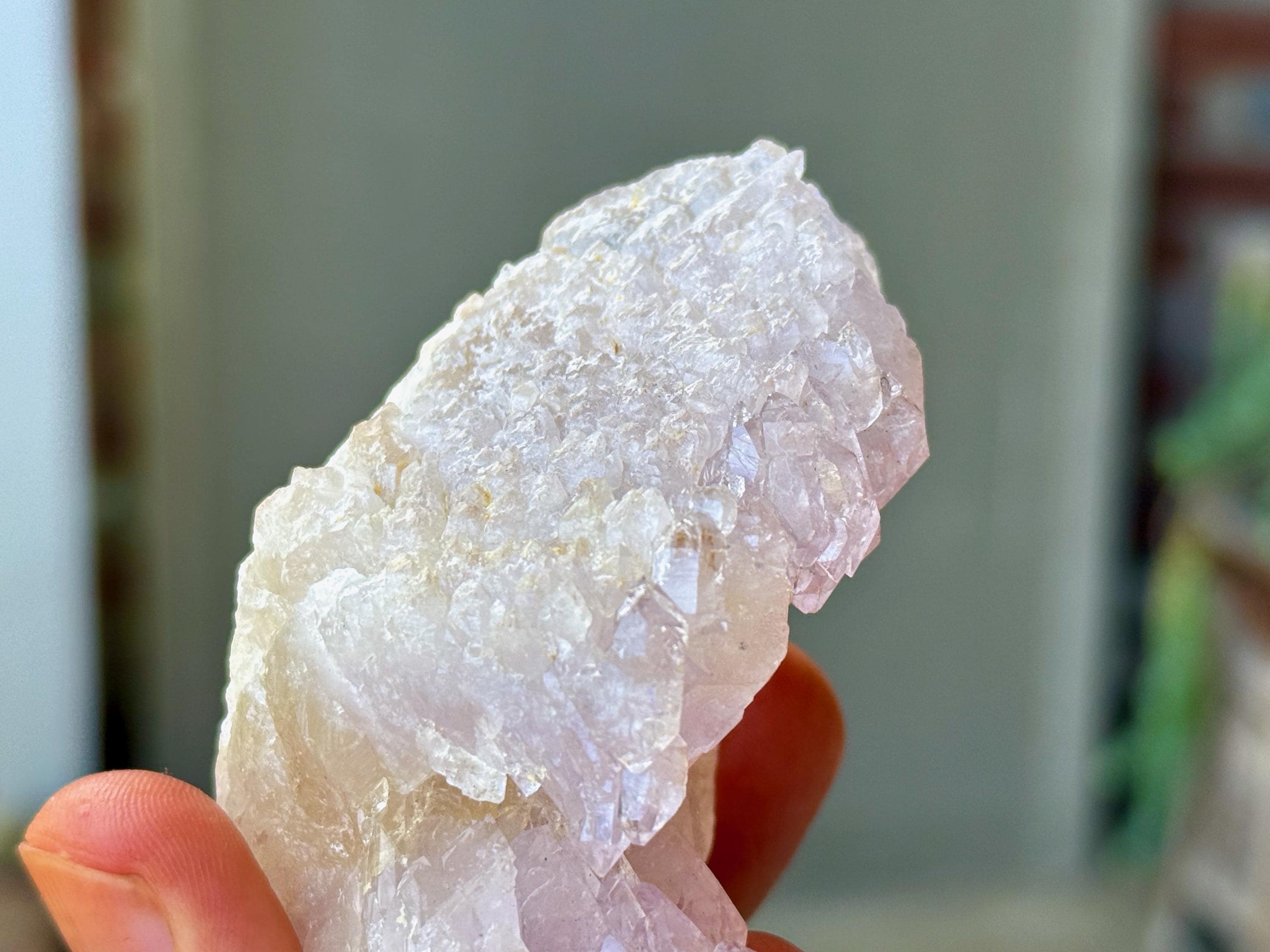 In the area where these crystals connect, we can see some mild golden hues from Citrine inclusion. Citrine and Rose Quartz is one of our favorite energetic combinations, and the mild golden tinges provide a nice contrast to the pale pink here.