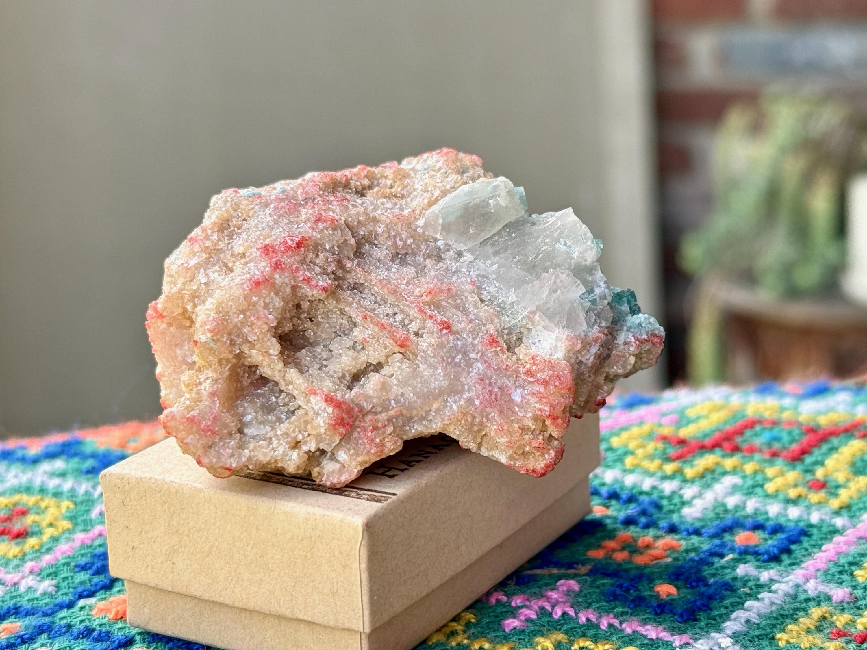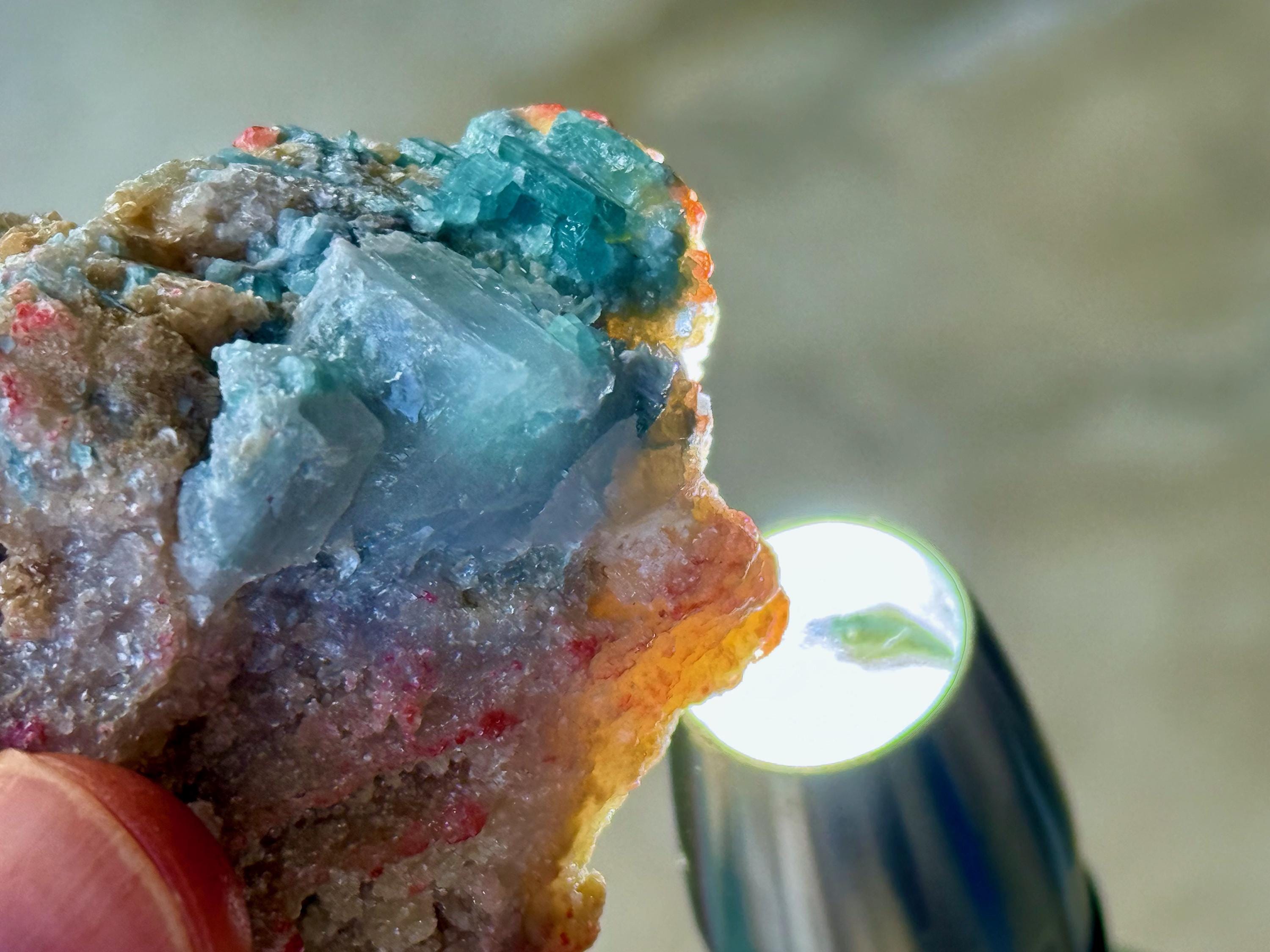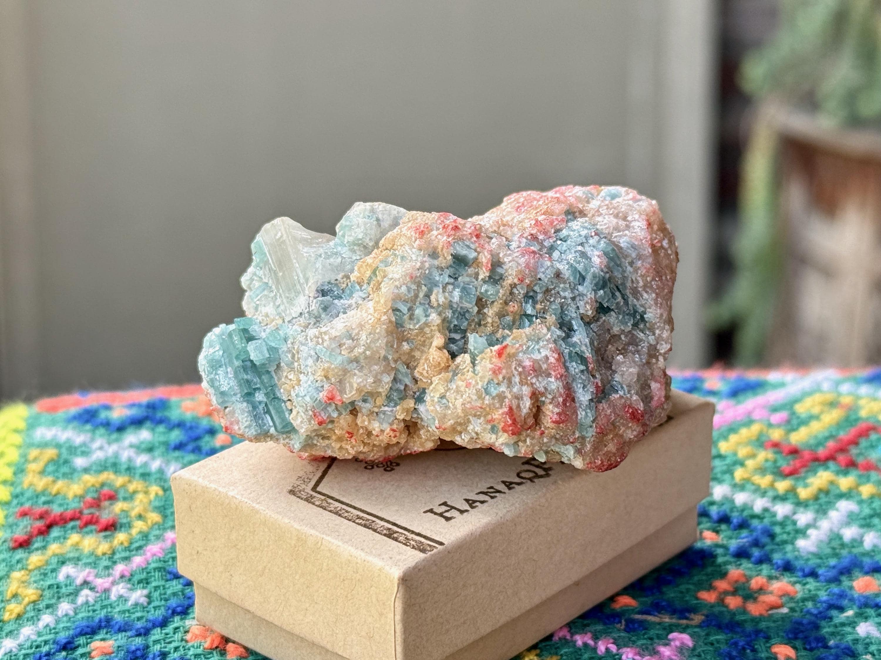 The crystals from this find include unique combinations of Quartz, Lepidolite, Albite, Cleavelandite and Feldspar, with vividly colored Tourmalines in lovely hues of green, pink, purple and blue. This combination of minerals is sometimes known as "Unicorn Stone."