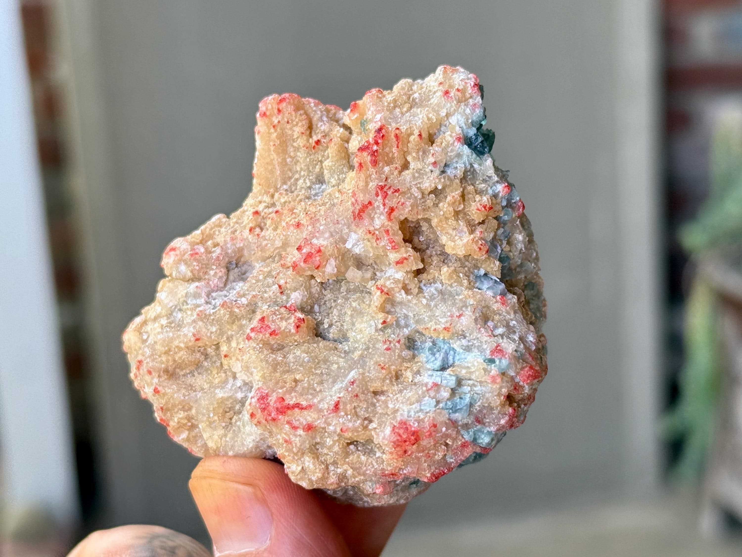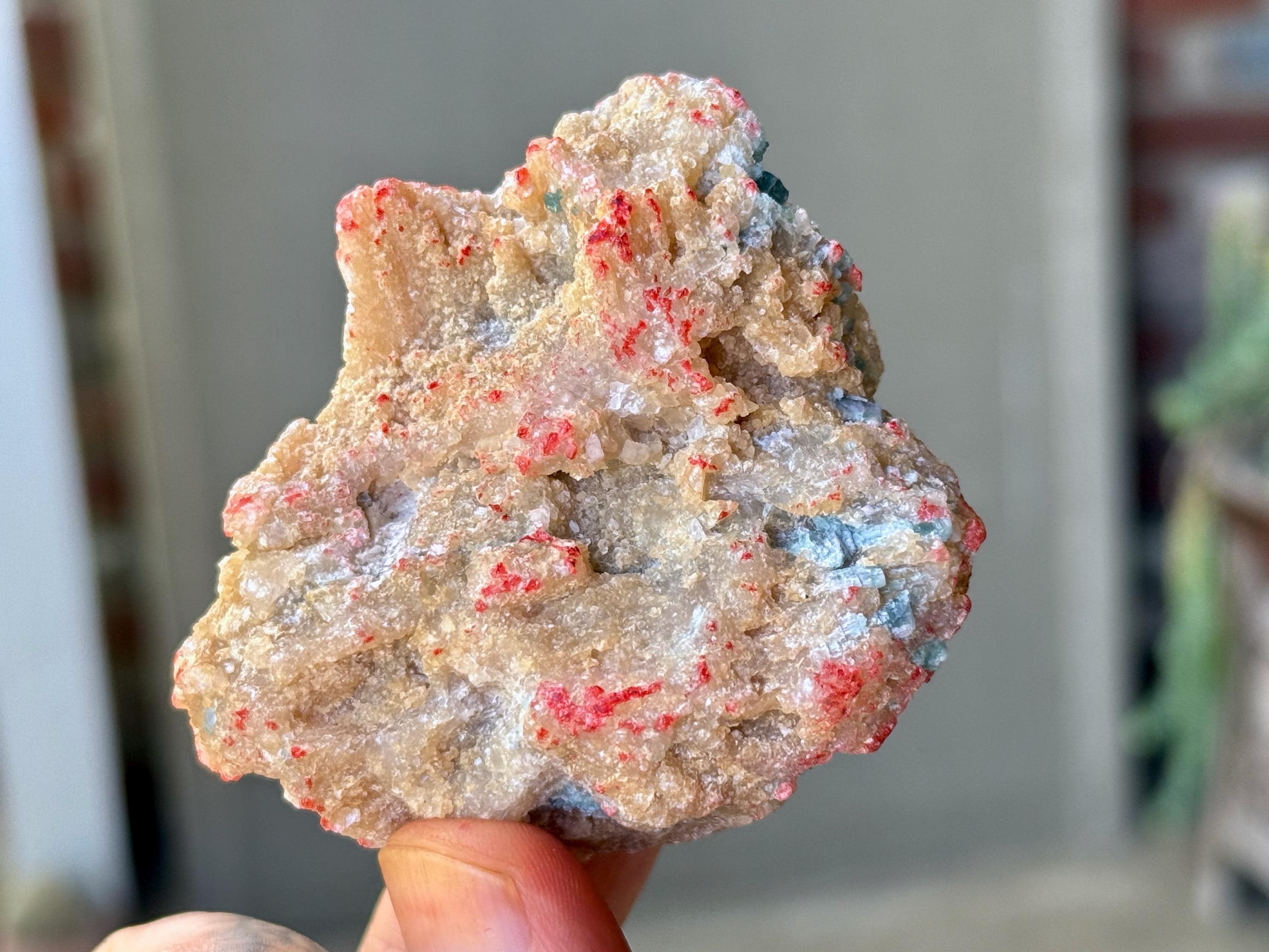 This vibrant Unicorn Stone with Blue Tourmaline & Golden Mica inclusions comes from a recent find in the area of São Jose do Safira, Minas Gerais, Brazil.
