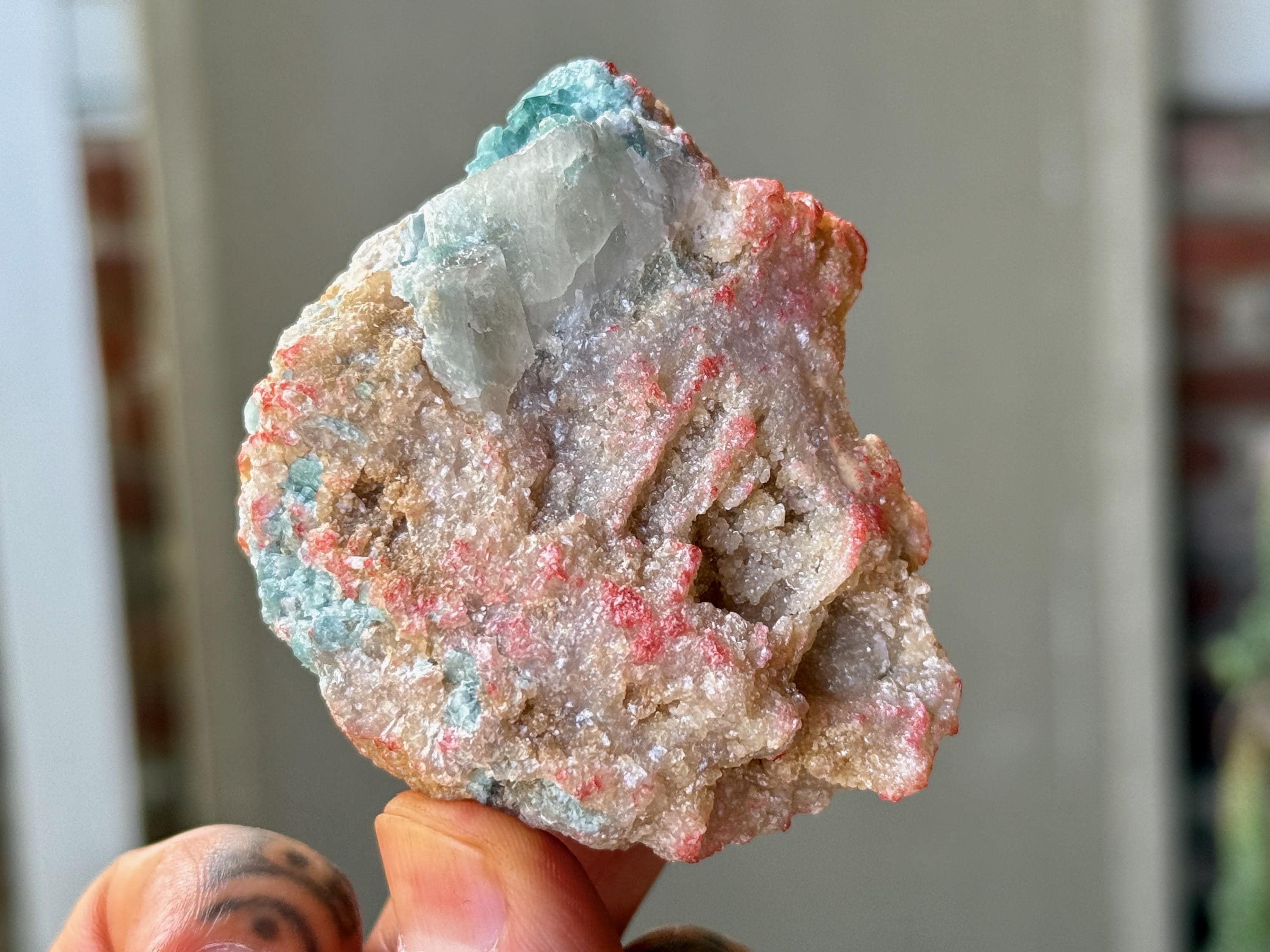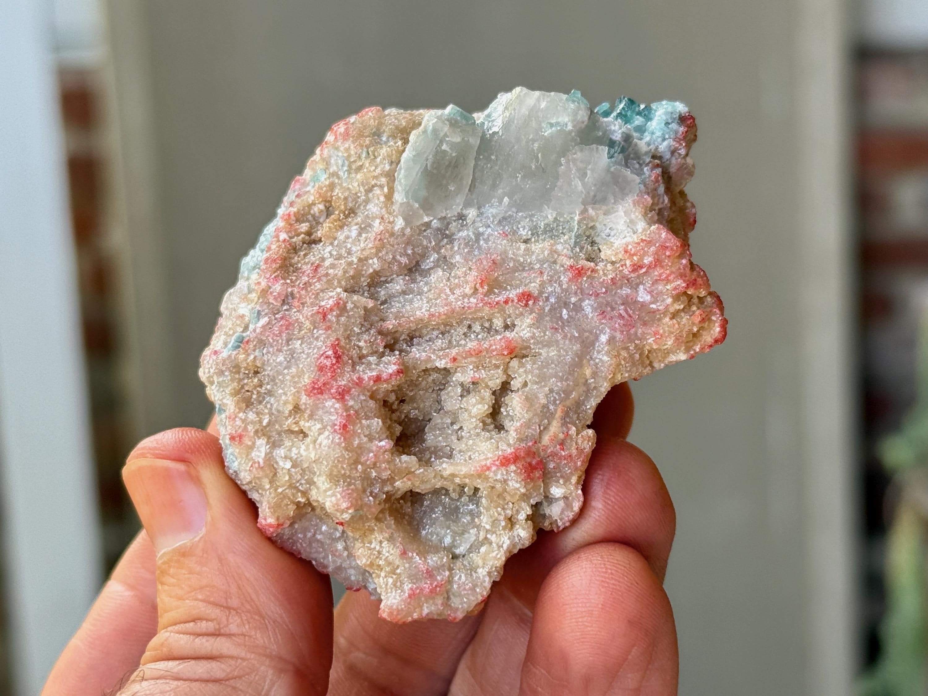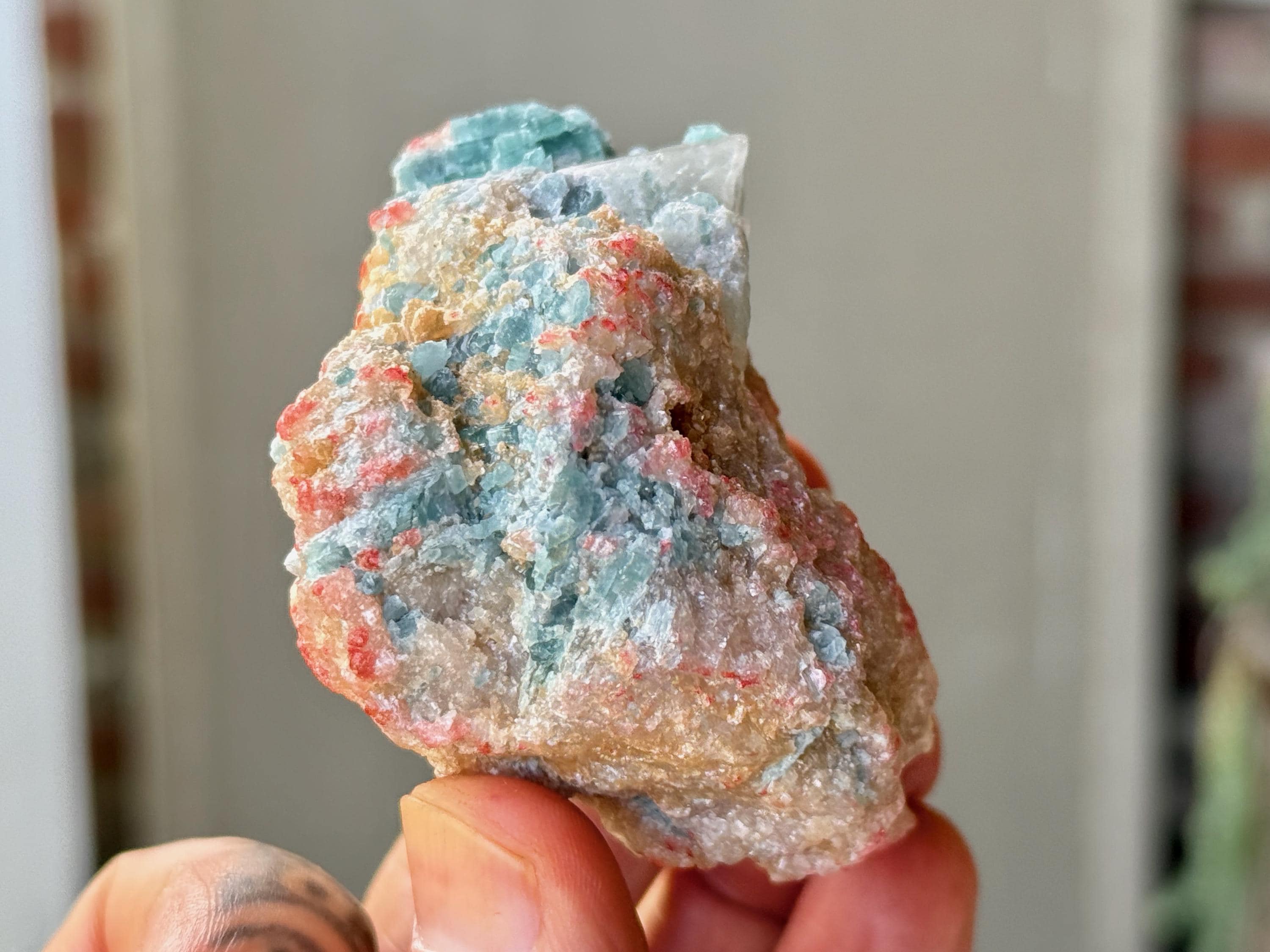 A super sweet combination of pale, "electric" Blue Tourmaline embedded in a matrix of Golden Mica, with some hints of pale pink as well (not sure what that inclusion is!). The color saturation on the Tourmaline is very much the same hue we see from the famous Paraiba Tourmalines, but this is from Minas Gerais.