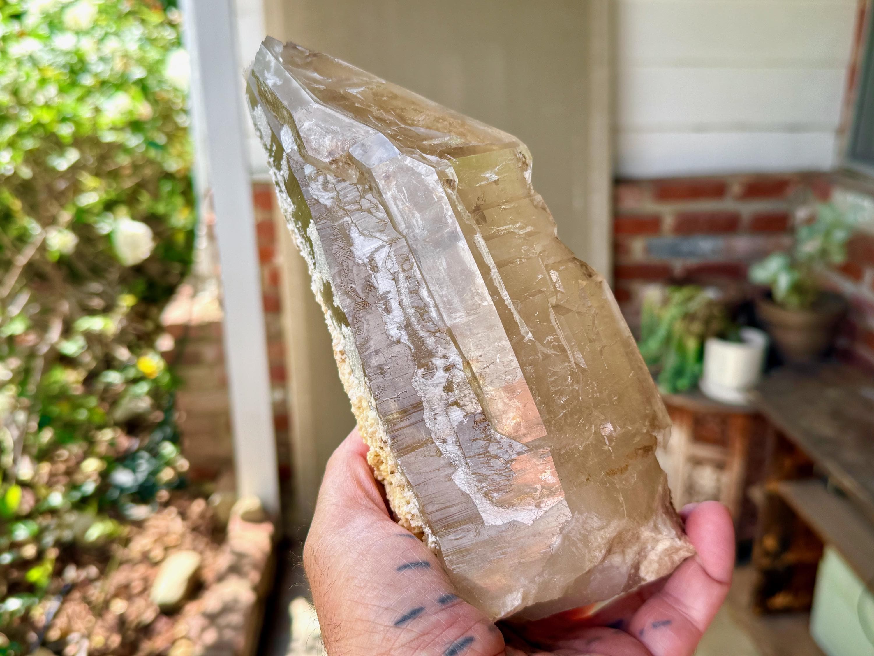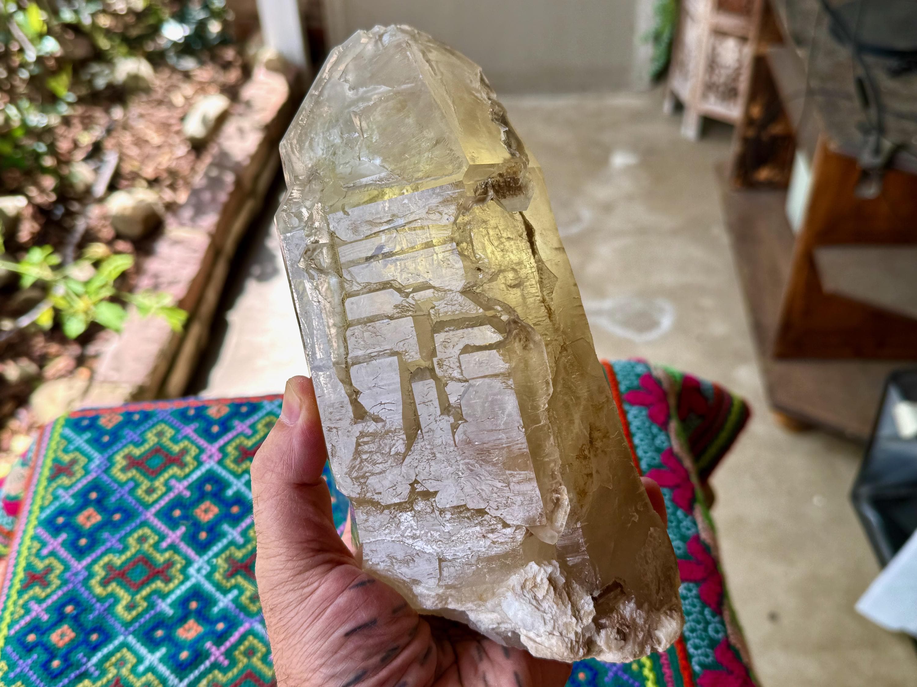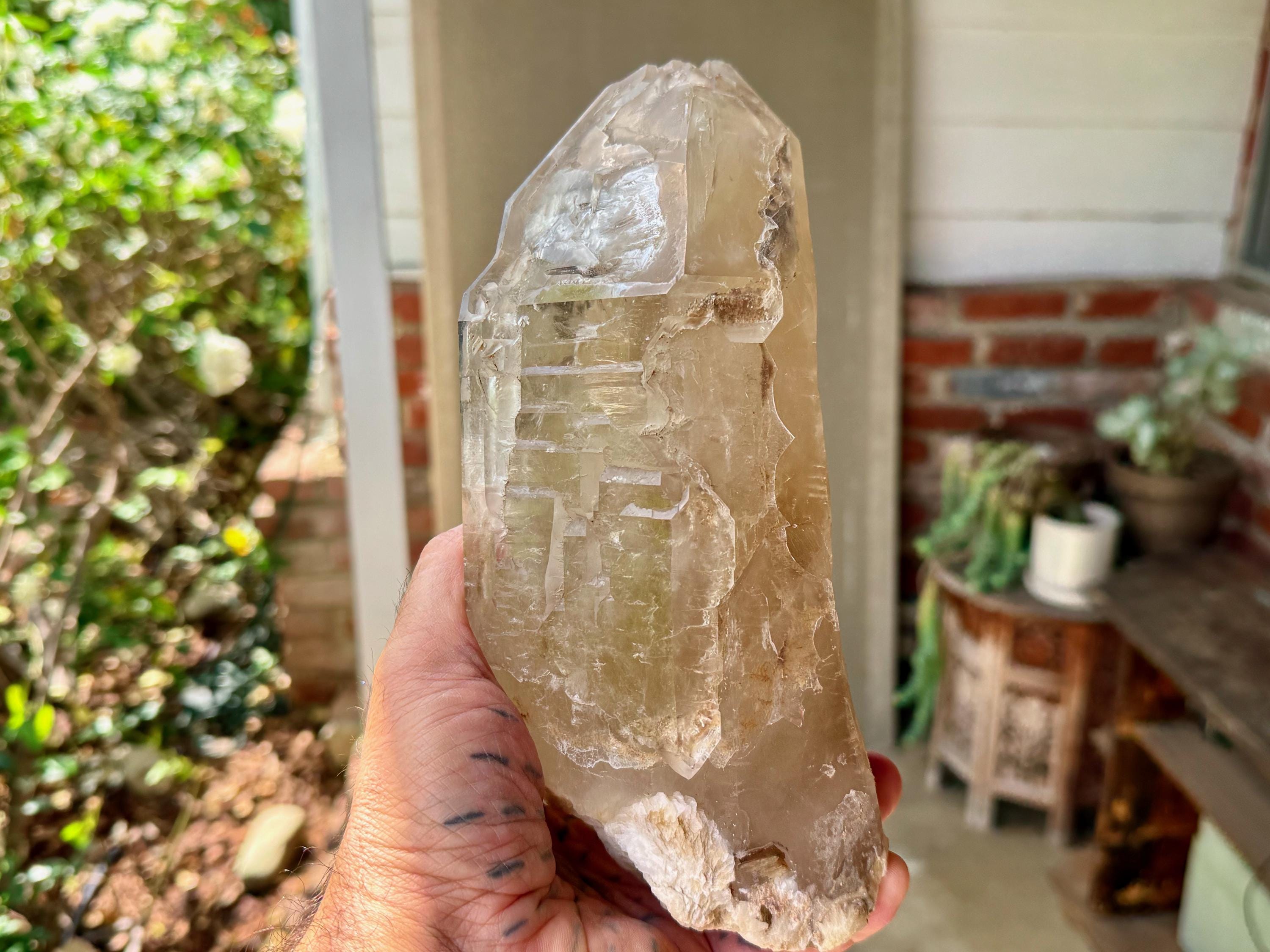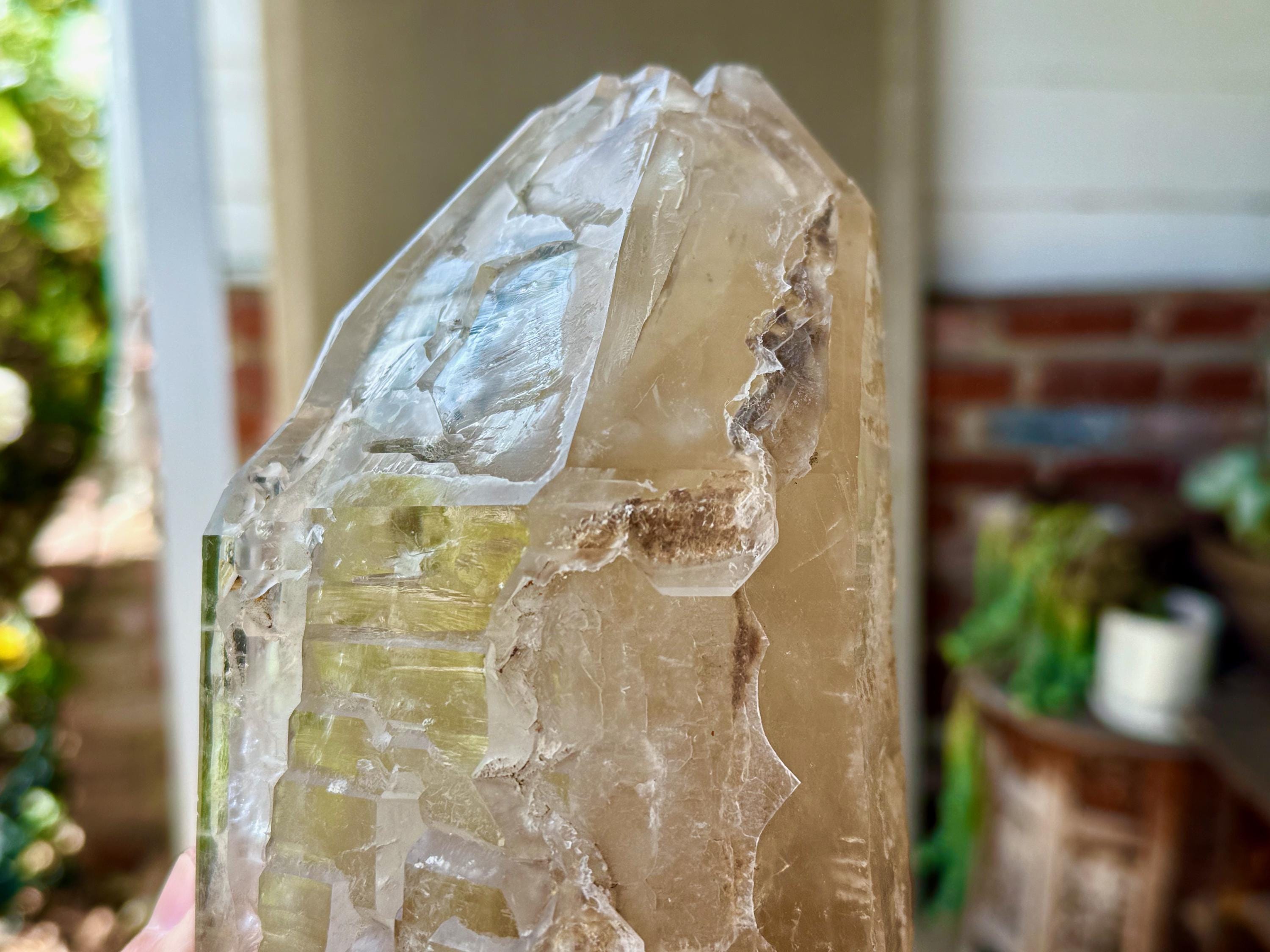 The crystal features a muted golden hue, as the "core" appears to be Citrine, while much of the overgrowth is clear quartz. When we backlight it, as in Photo 7, we can see that it passes light beautifully.