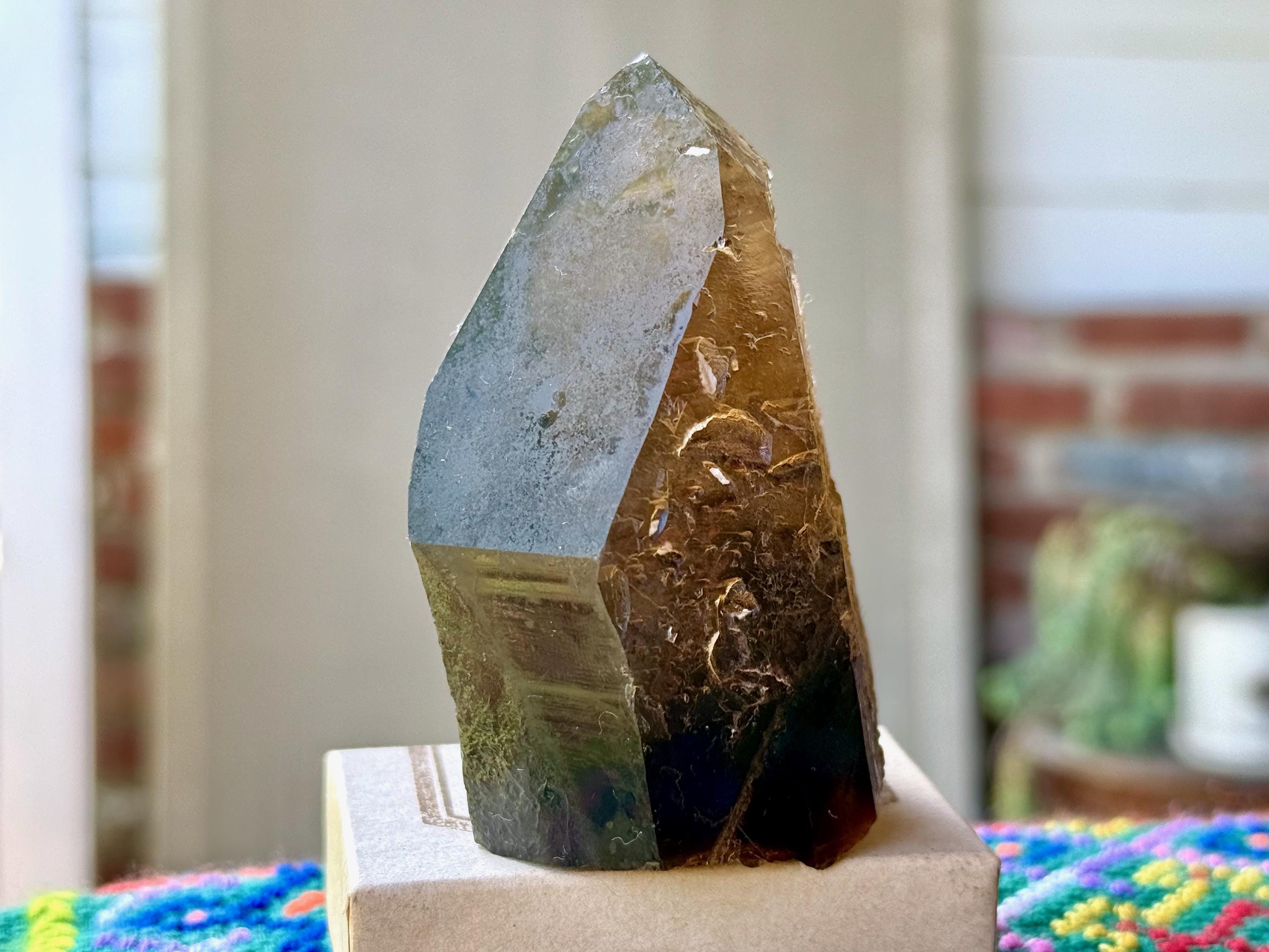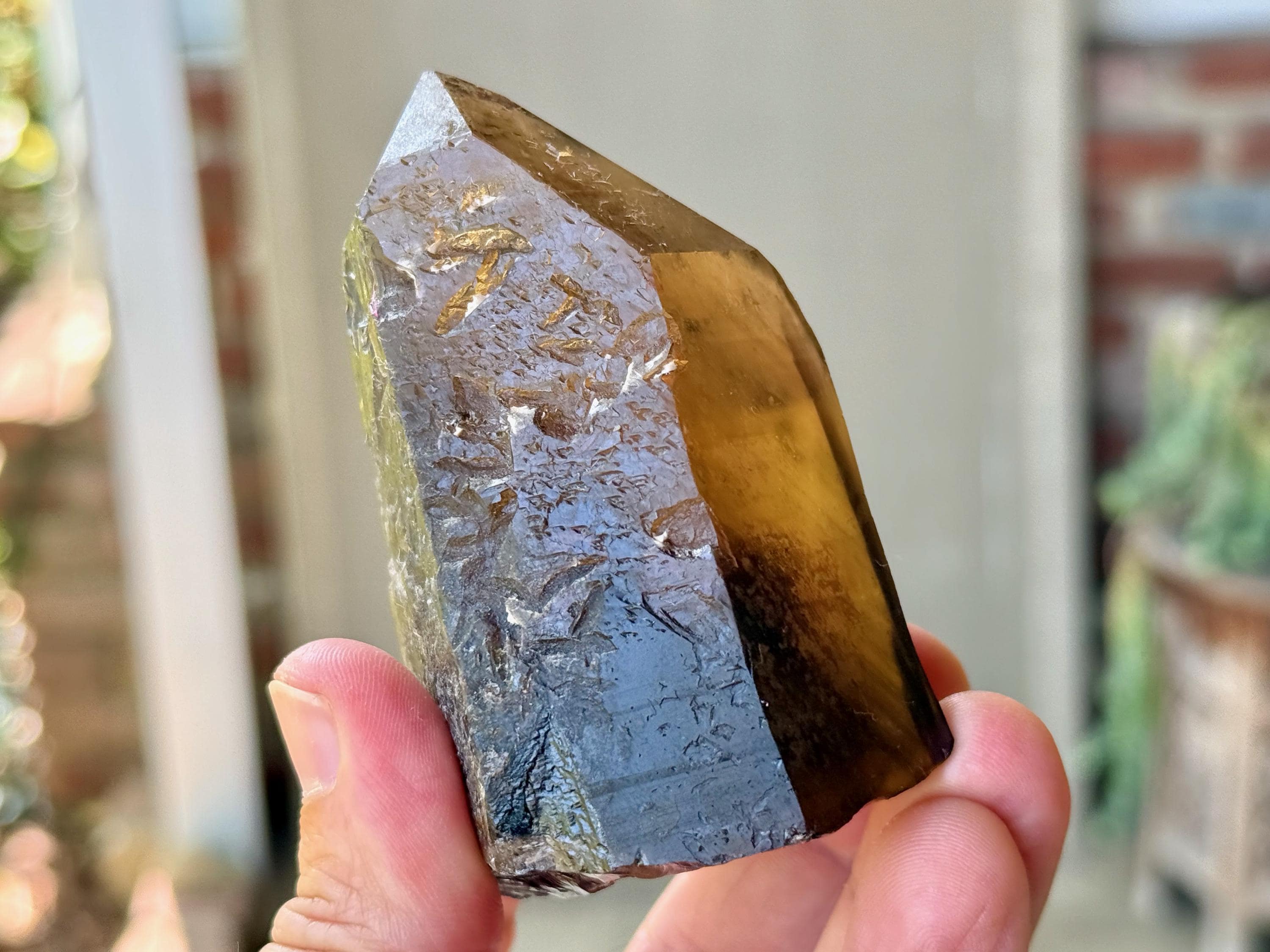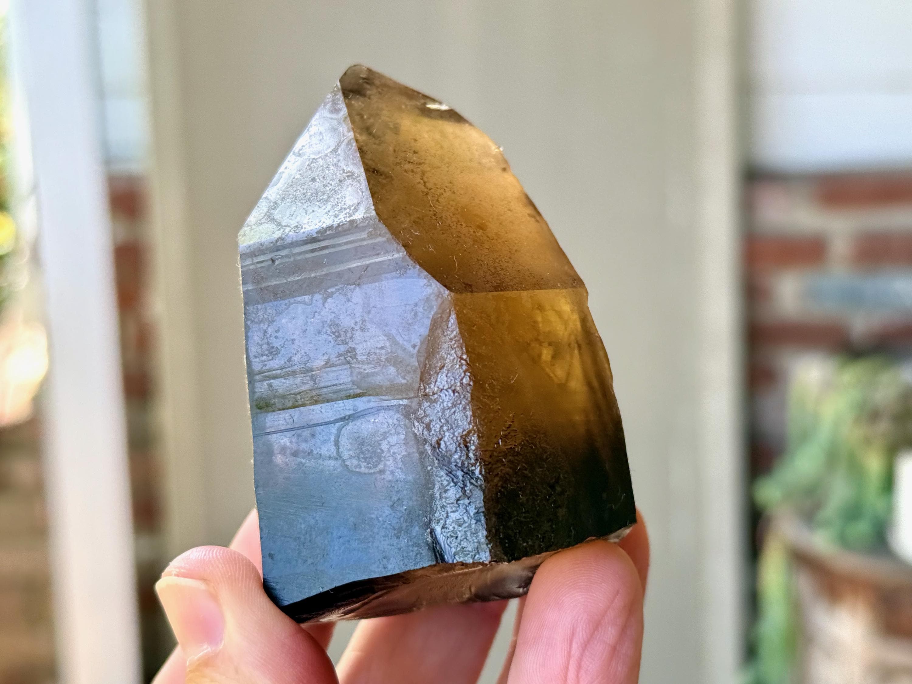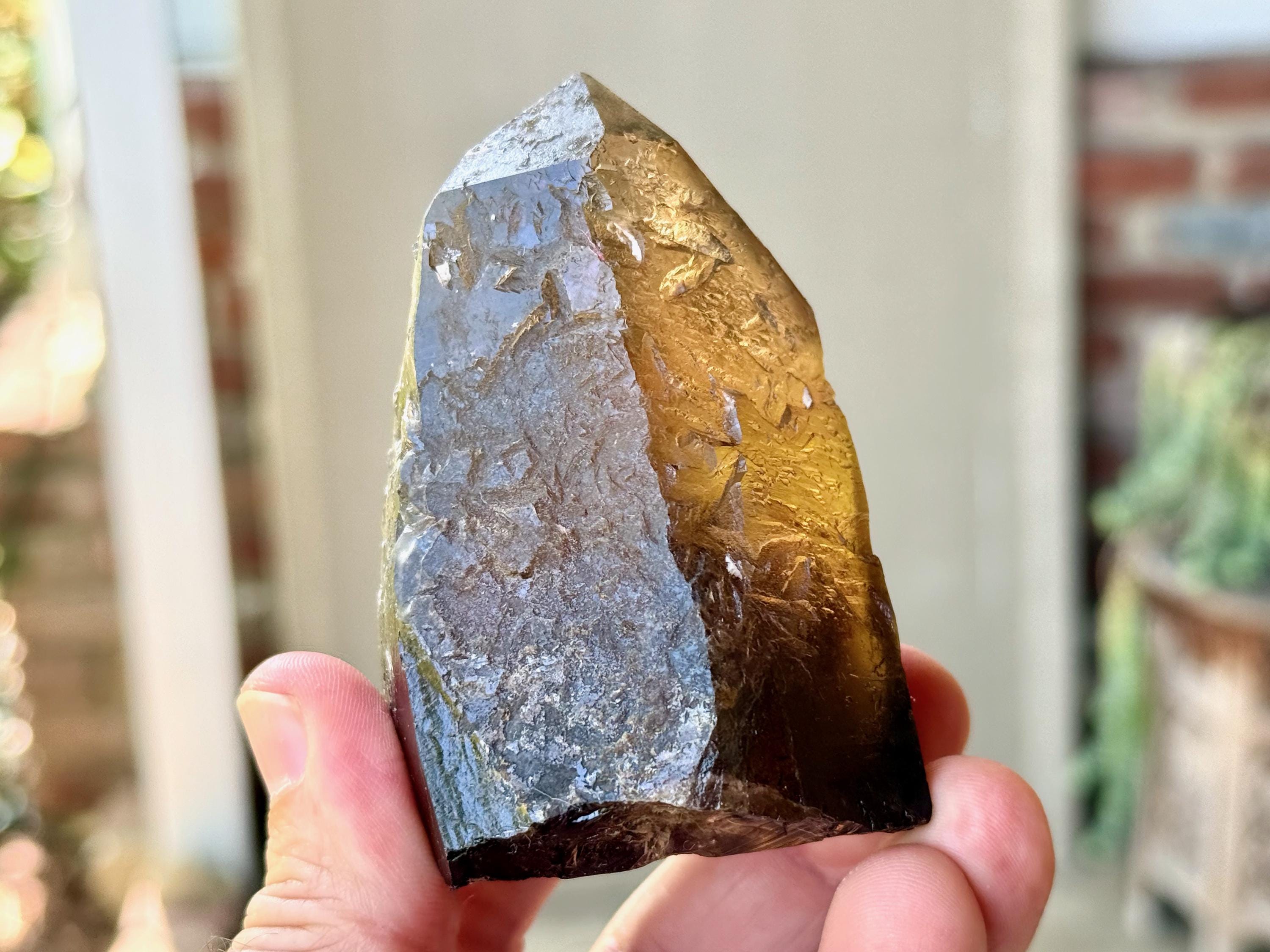 A broad and powerful formation to this Pele's Dream Lemurian with a deep, smoky black complexion. In natural light, we can just make out the mild, gradient hue on this piece, that becomes more clear and golden toward the top. But when backlit, as in Photos 3-5, the yellow-golden color truly comes to life!