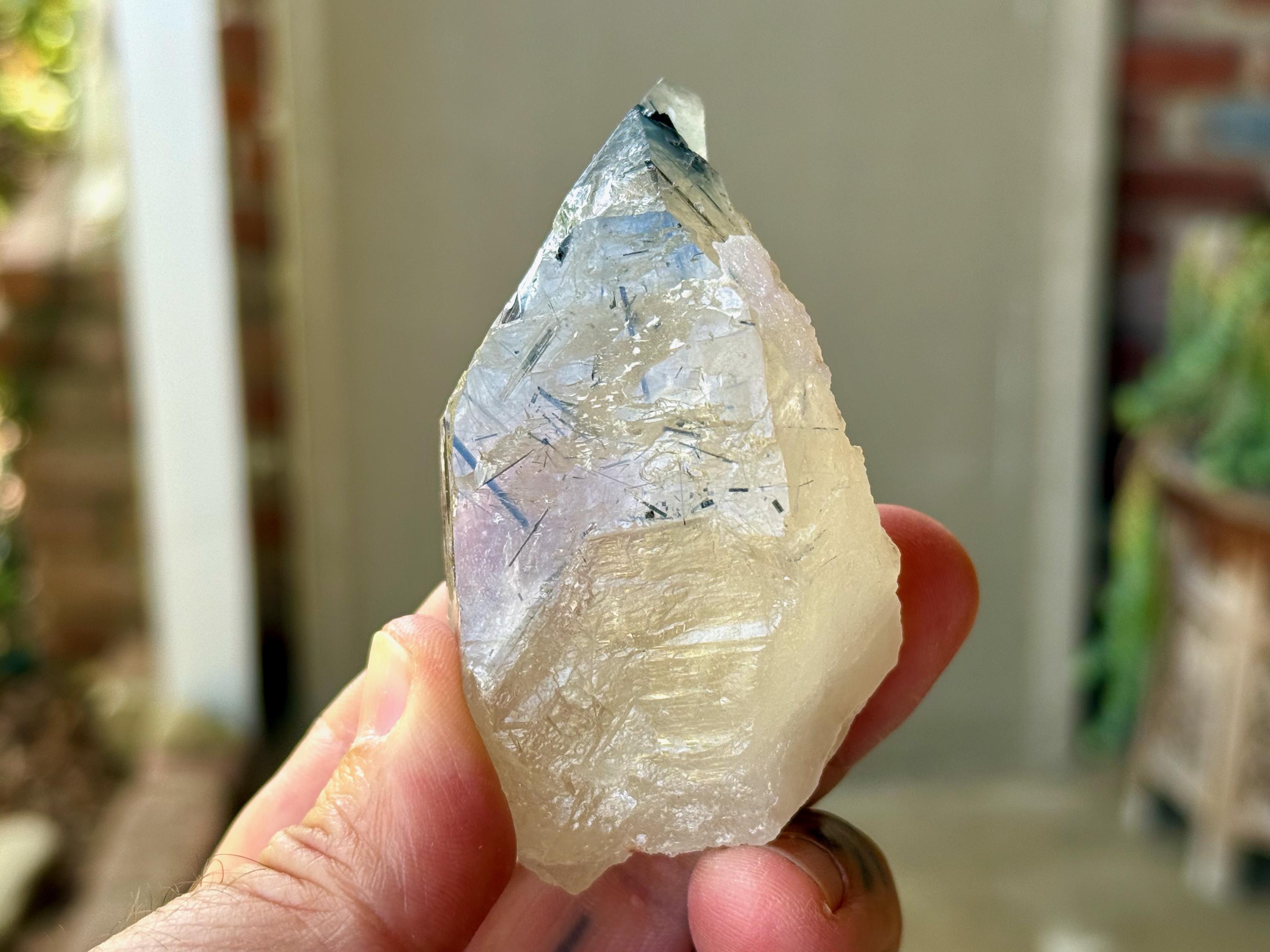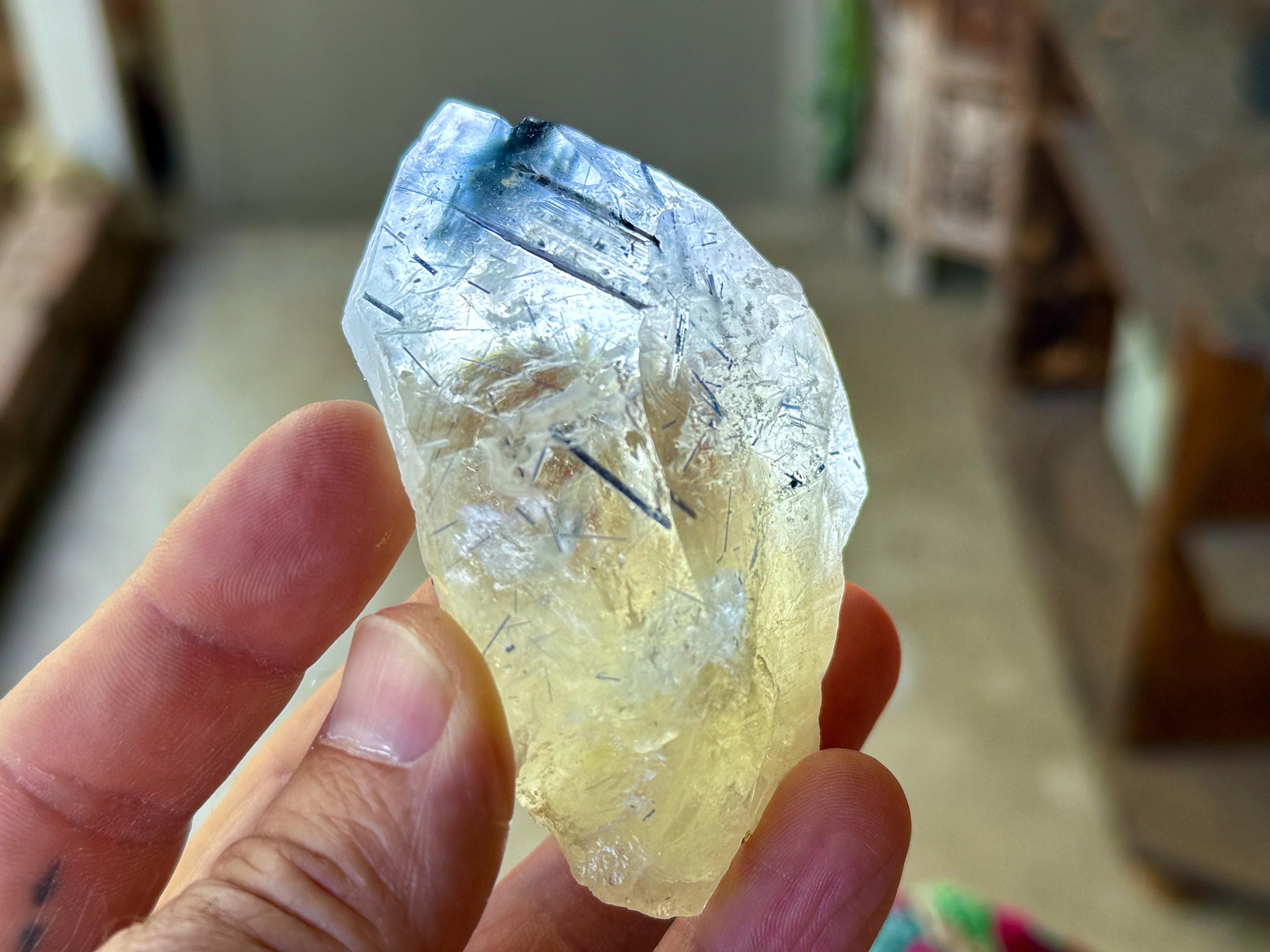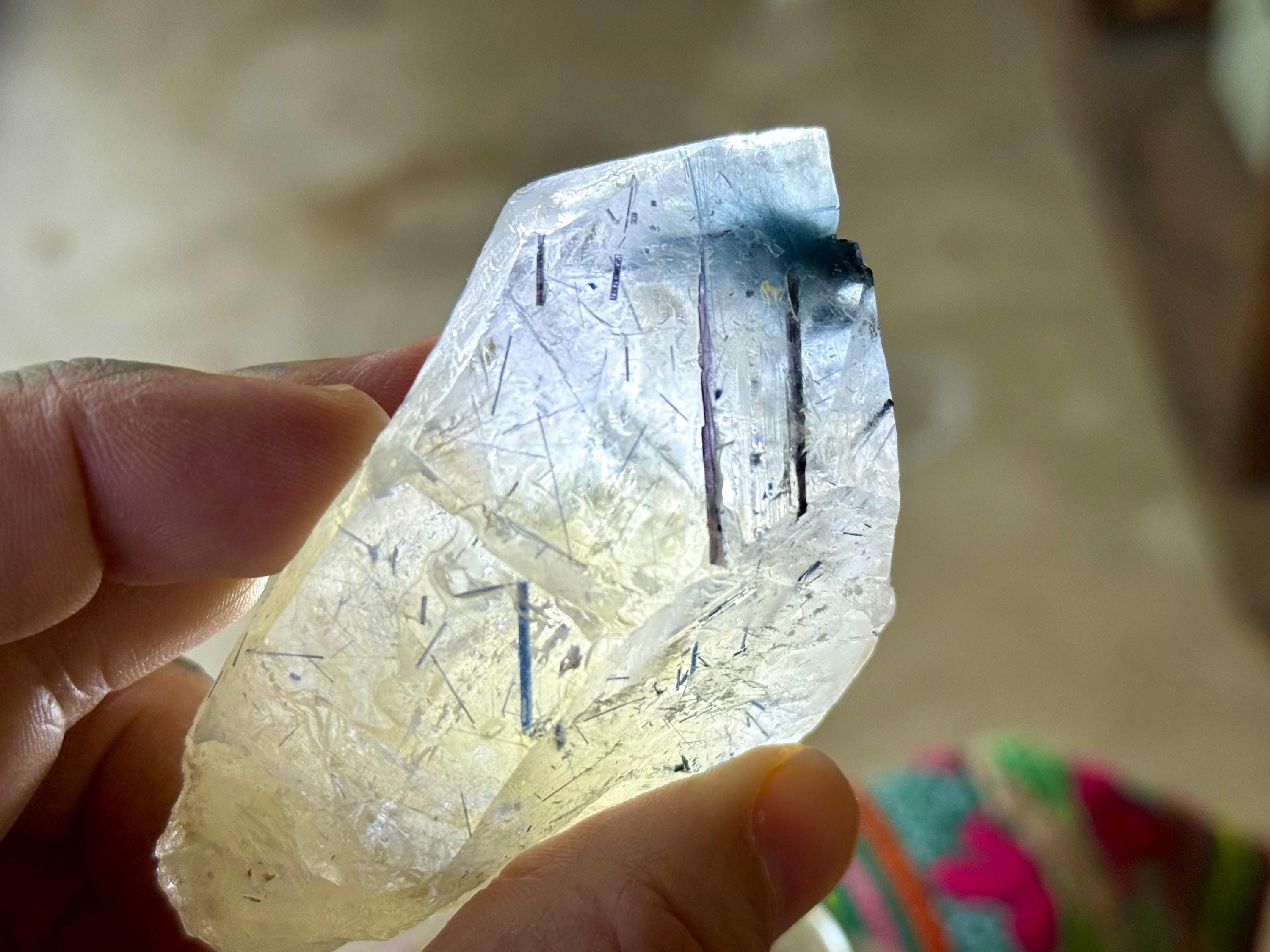 This crystal features a mild champagne golden hue and a broad formation. In the upper portion we see a multitude of Blue Tourmaline "needle" inclusions, that when backlit, reveal their color and translucency (Photos 3-6).