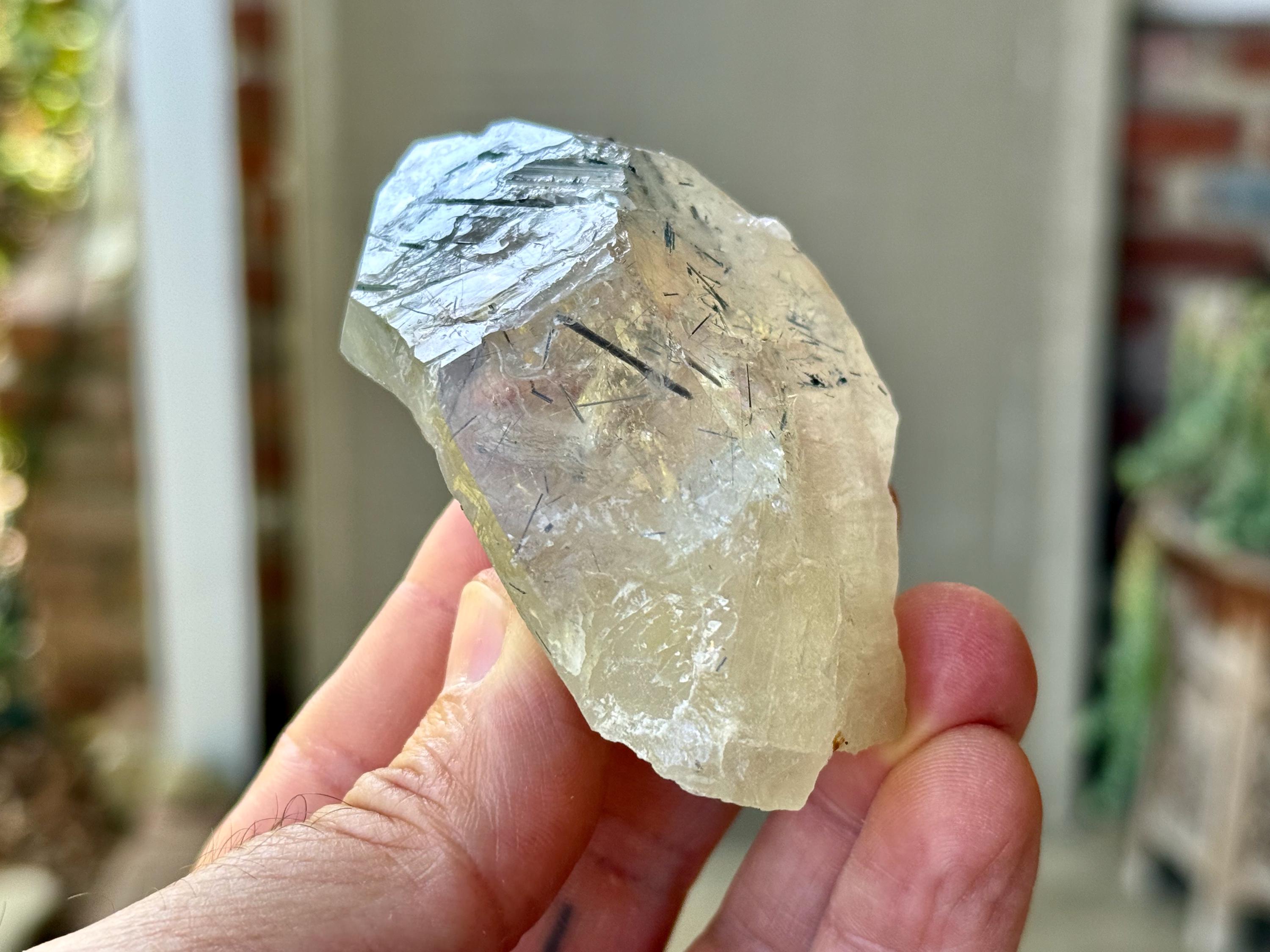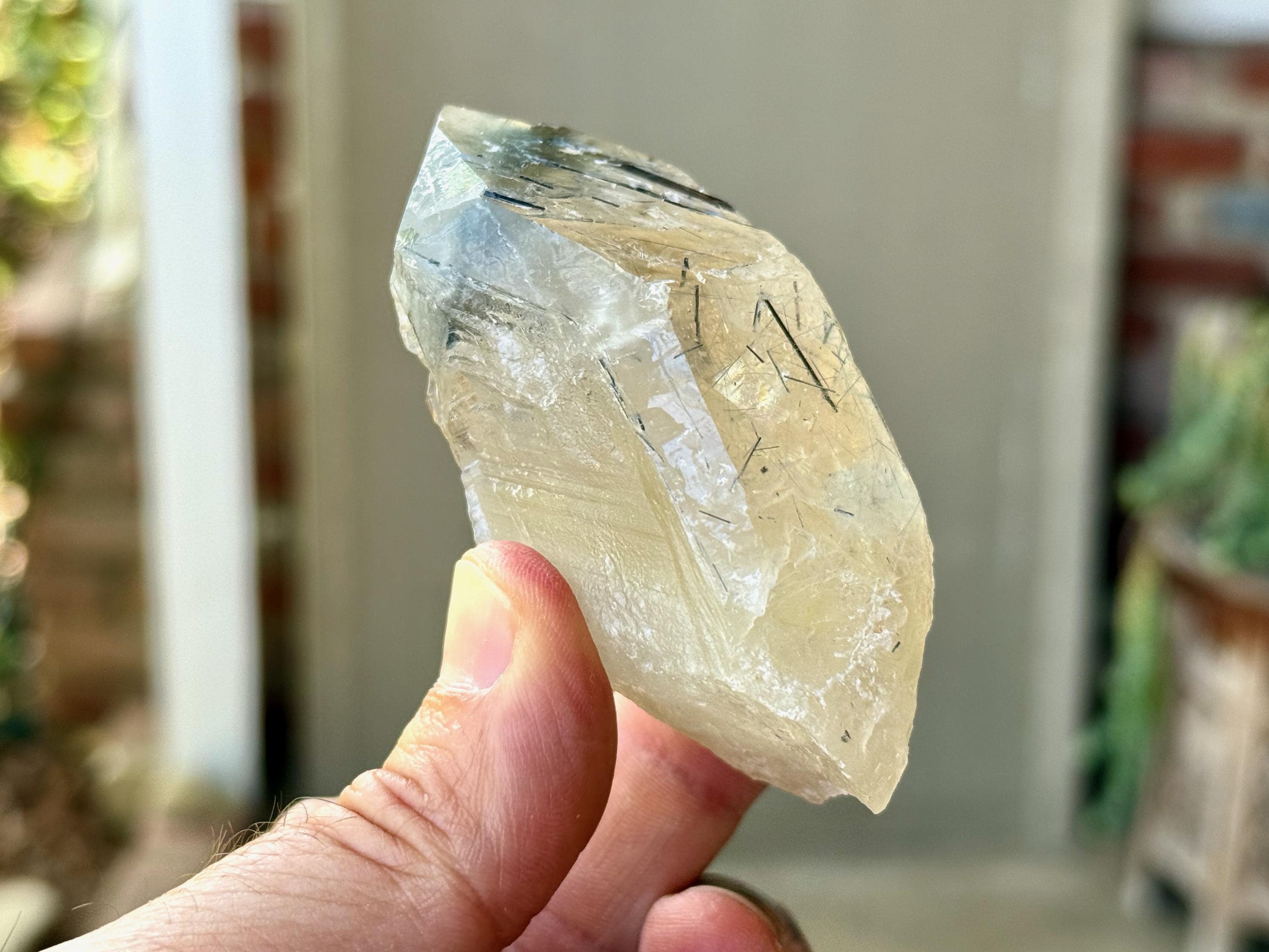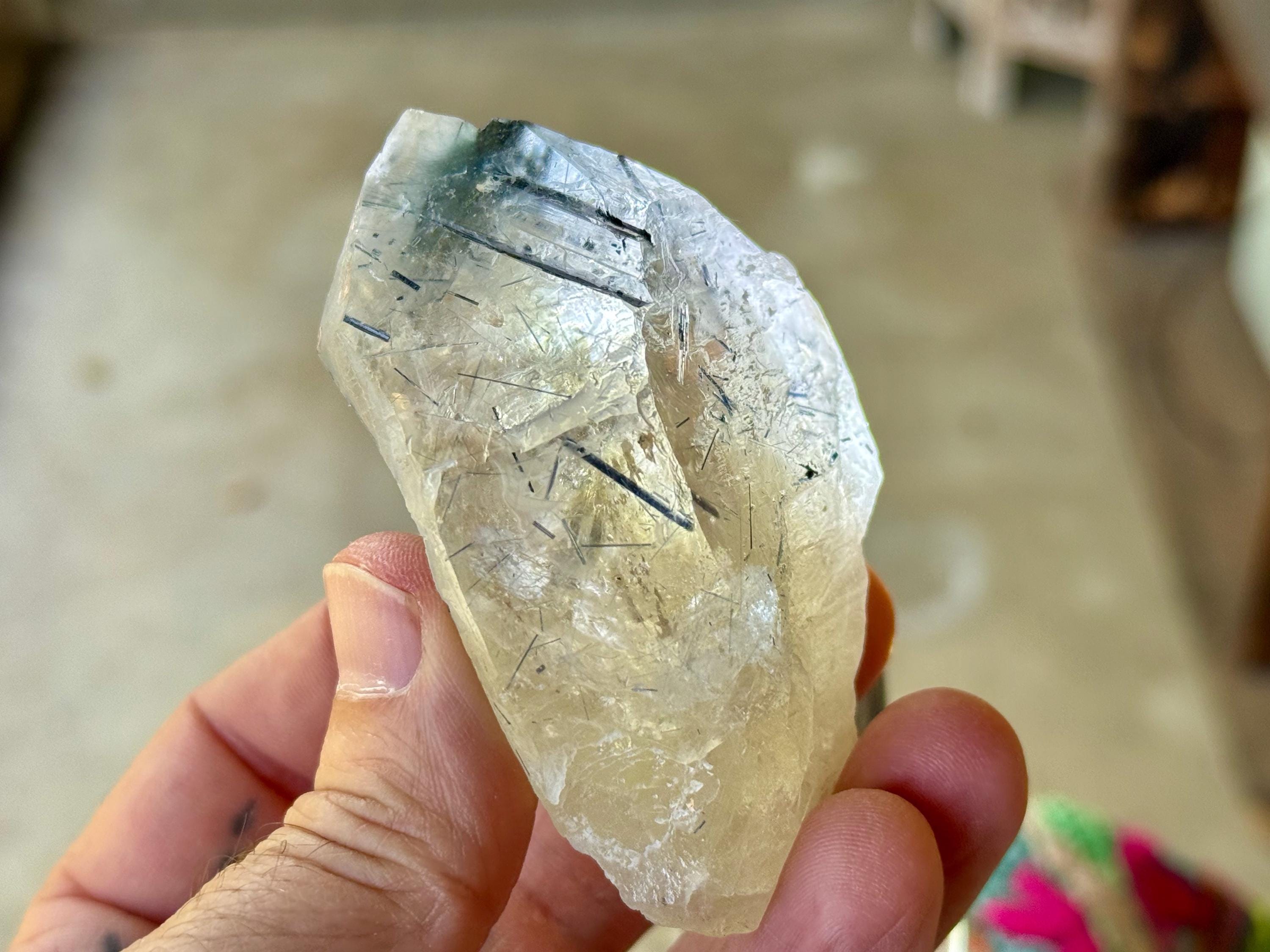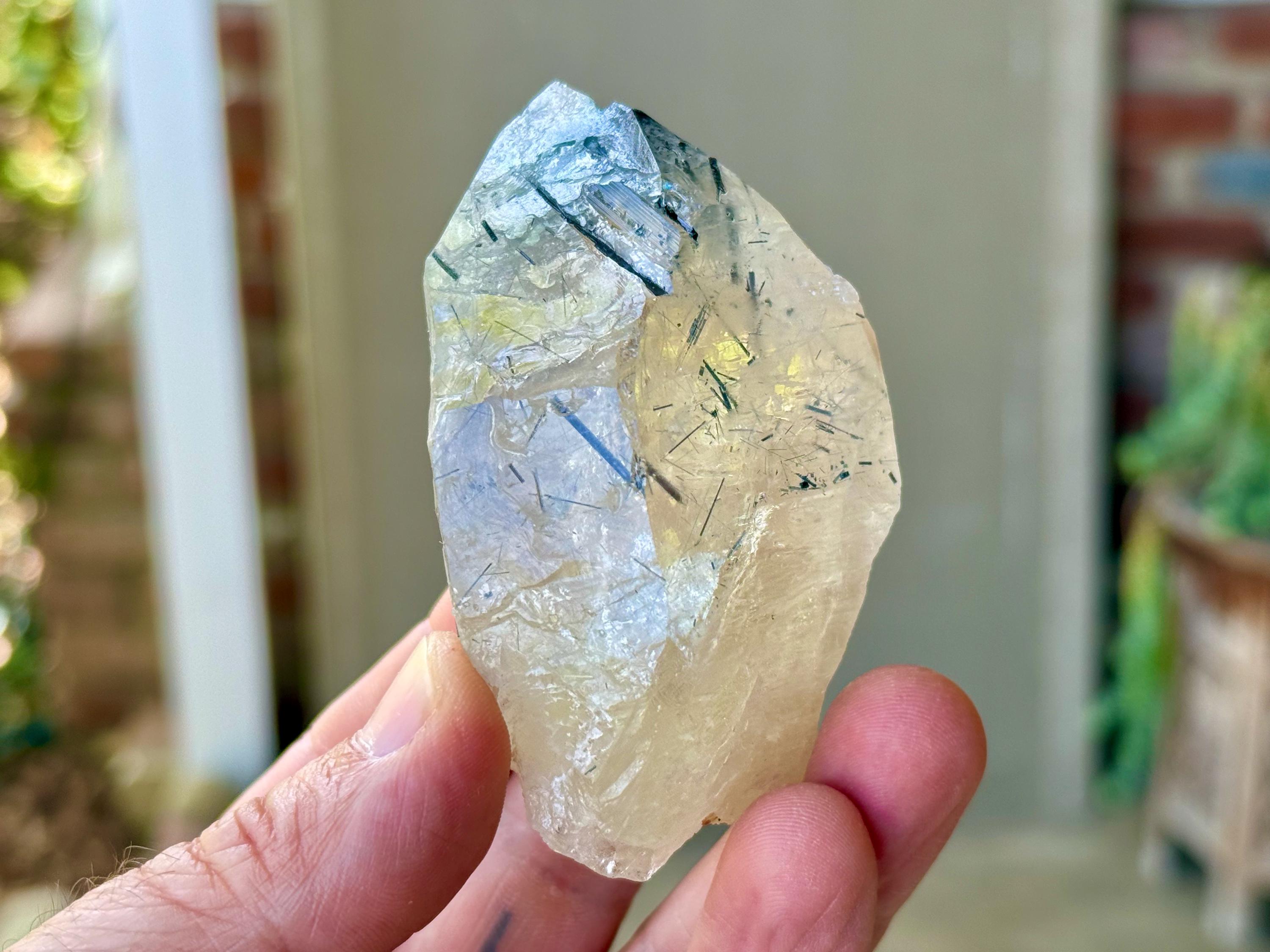 This crystal features a mild champagne golden hue and a broad formation. In the upper portion we see a multitude of Blue Tourmaline "needle" inclusions, that when backlit, reveal their color and translucency (Photos 3-6).