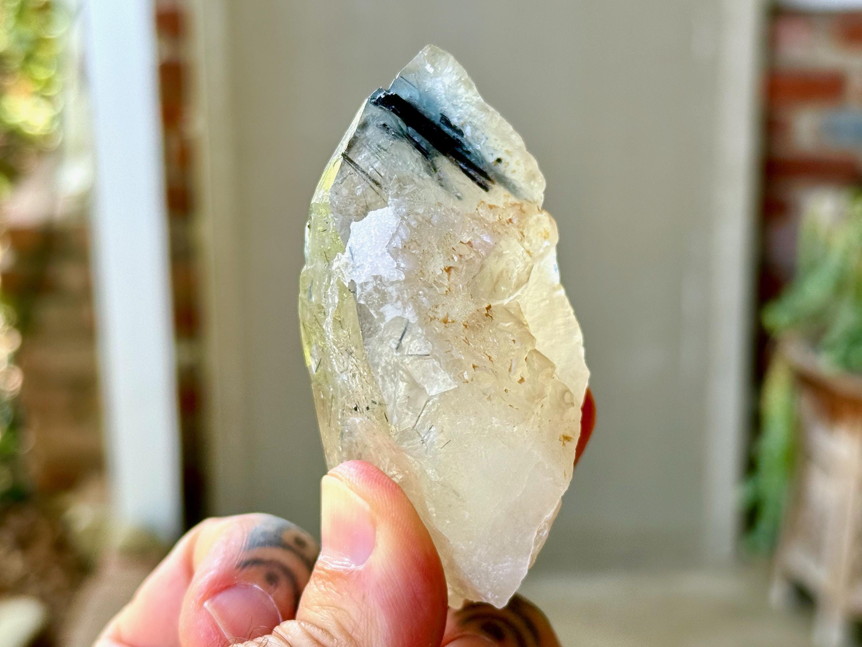 In some photos, you may notice the Tourmaline has a purple tinge, and this is due to the mild presence of Canga Rose Quartz within. We can also see this as a white frost on parts of the exterior that is *just* slightly tinged with pink.