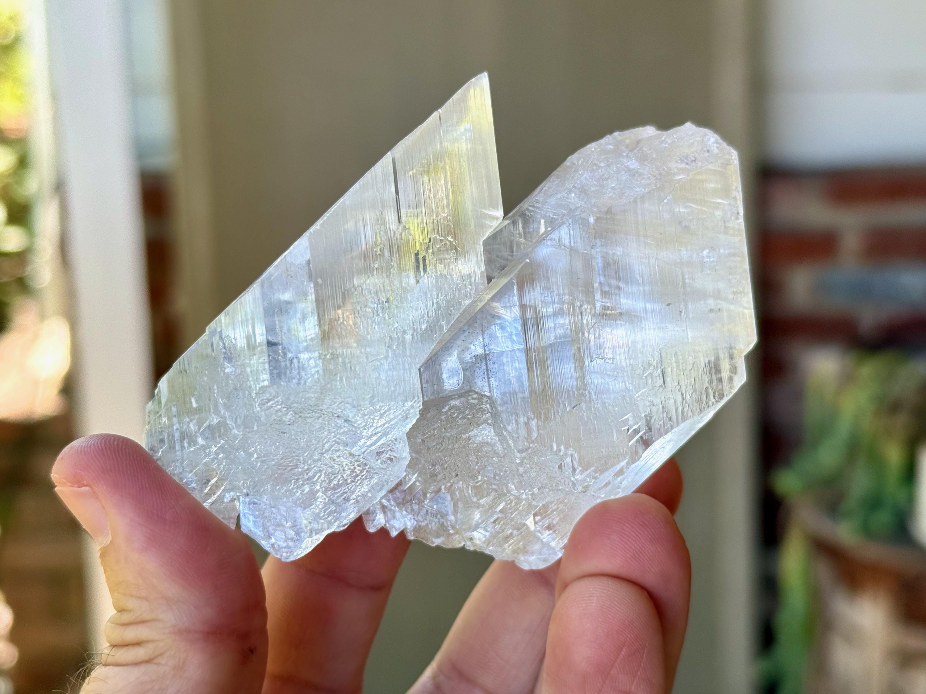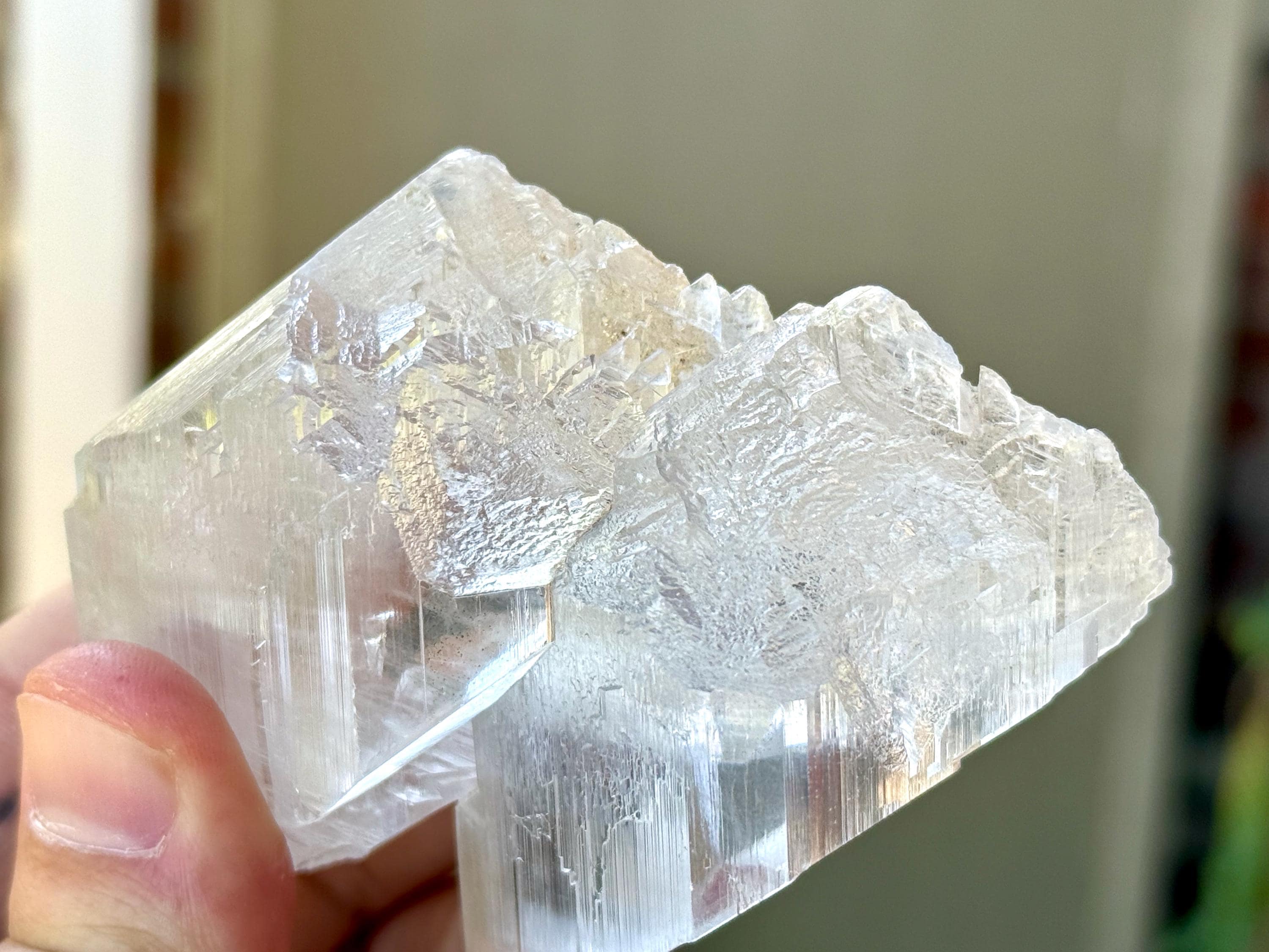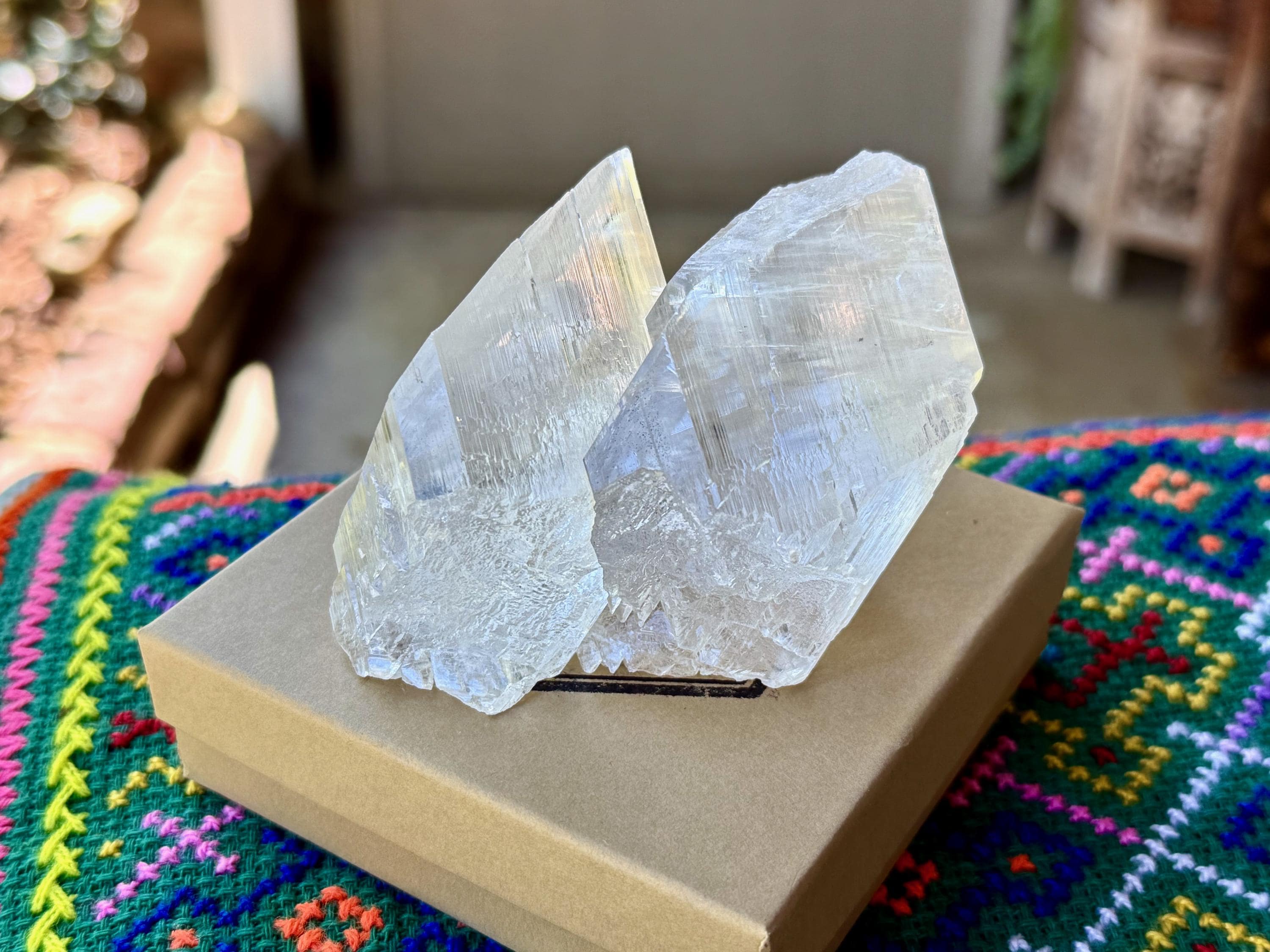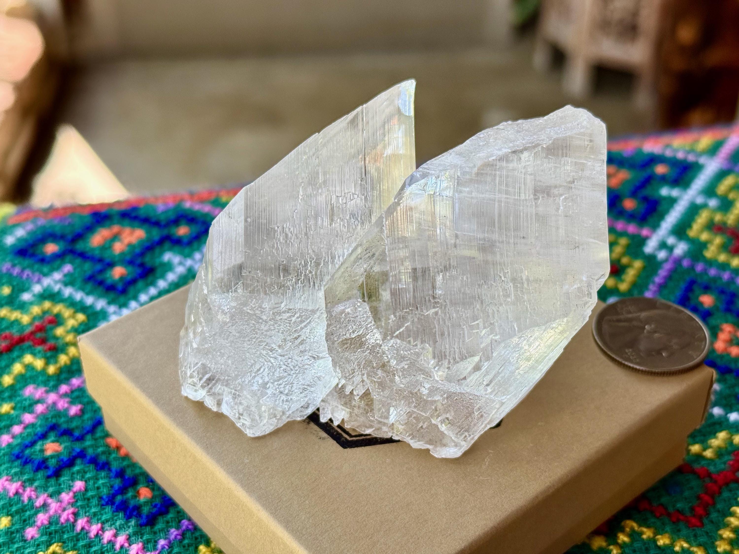 Water clear clarity and brilliant luster to this exquisite Naica Selenite in a Tantric Twin formation. This crystal is a superfine example of the quality we've come to appreciate from the Naica Mine, with a stable crystalline formation and beautiful vertical grooves.